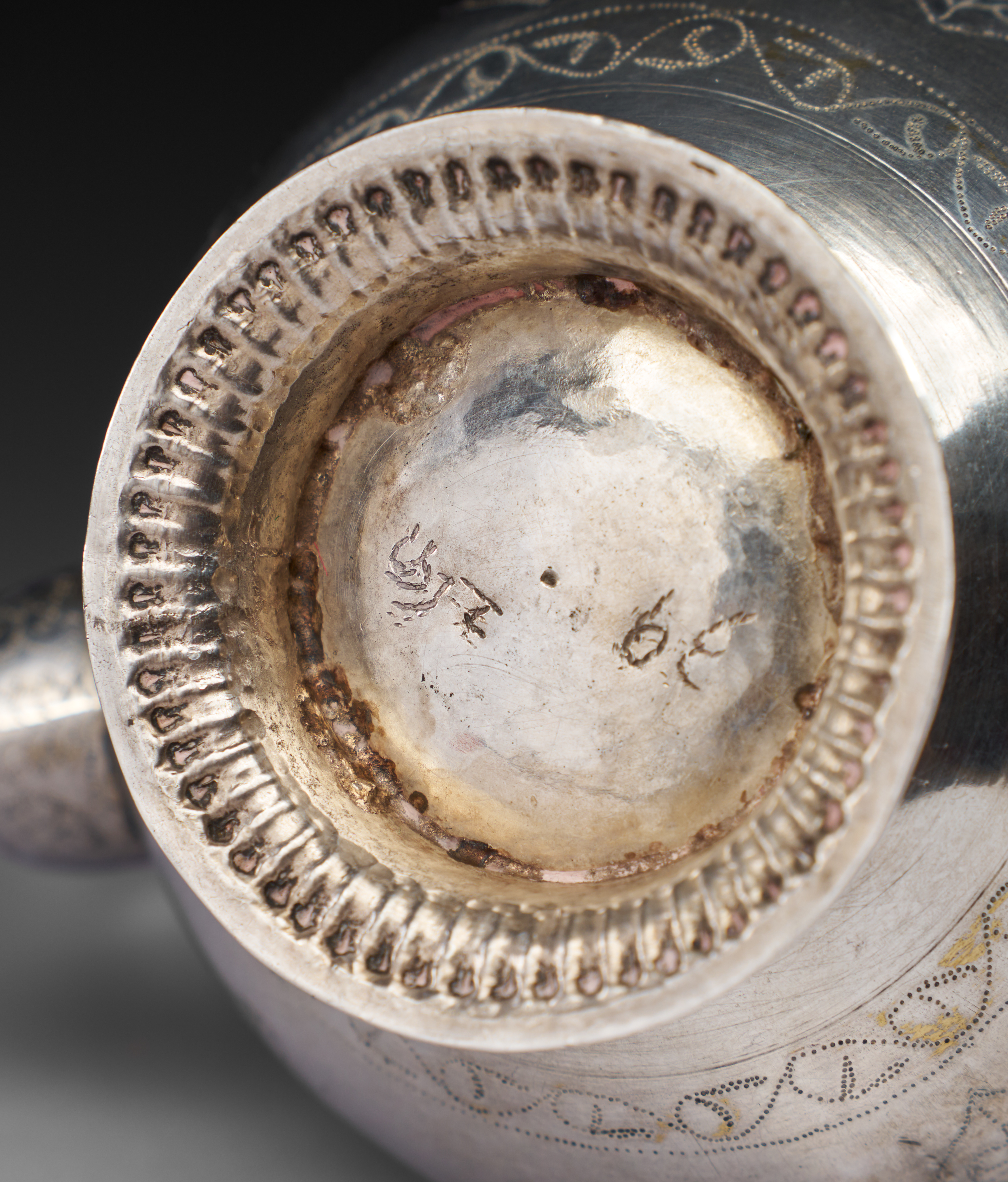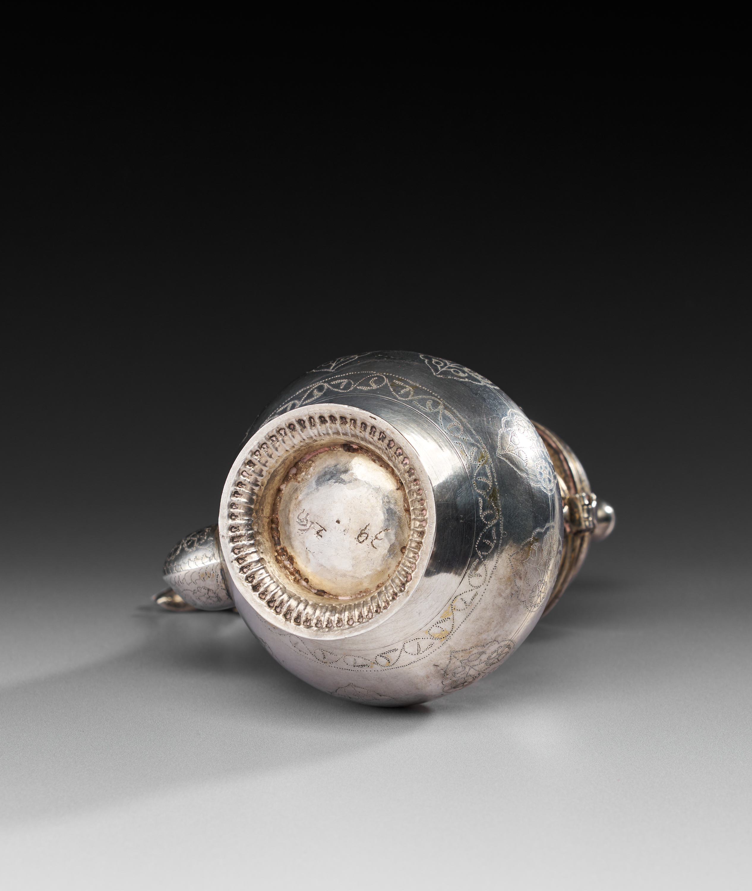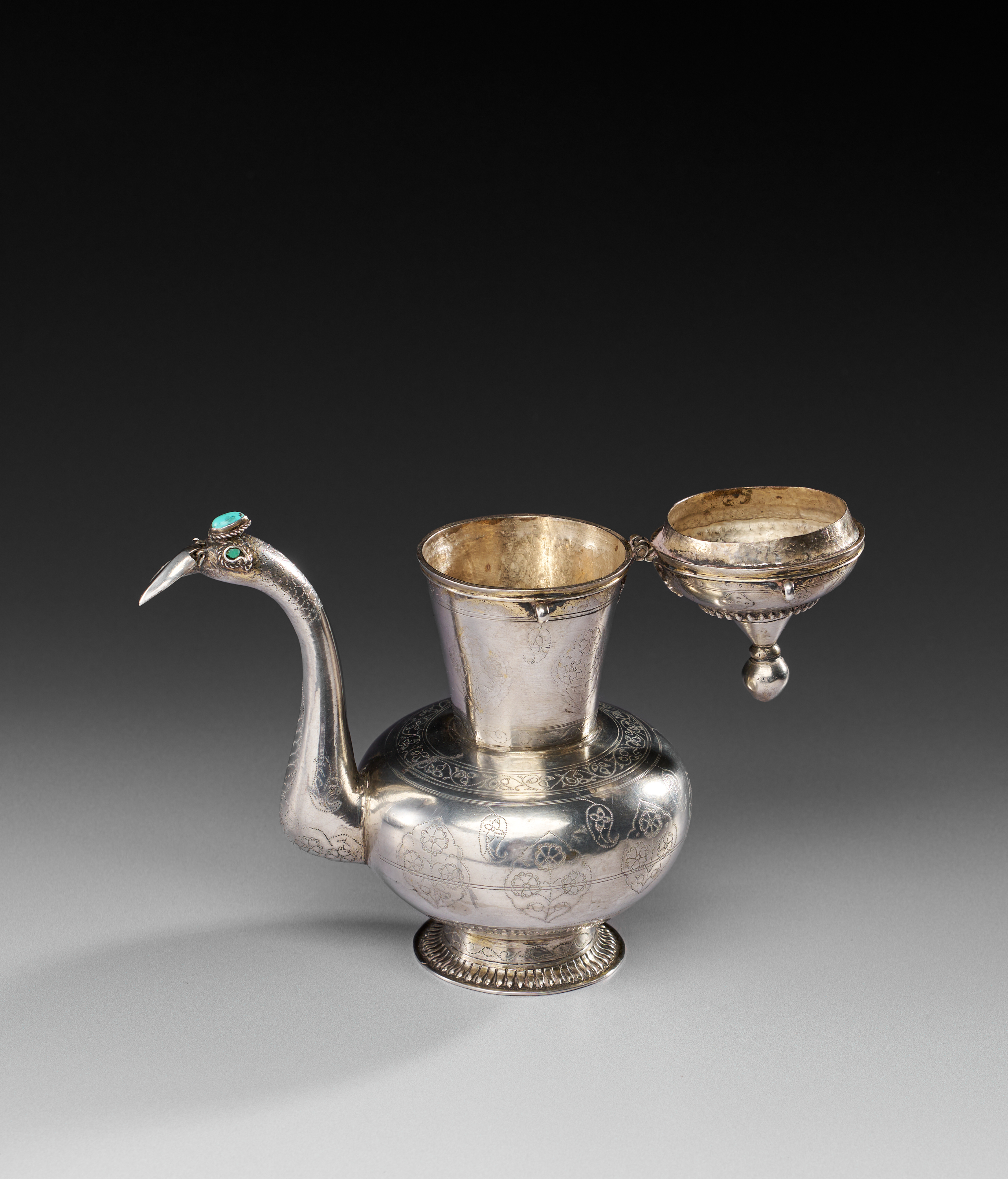 Of bulbous form on a spreading foot, rising to a tall flaring neck with domed hinged cover, the spout modelled as a bird’s head. The eyes and crown of the spout are set with turquoise cabochons, lending a striking accent to the silver surface. The body is engraved with delicate arabesques and floral motifs within medallions, the lid decorated en suite with petal and rosette borders.