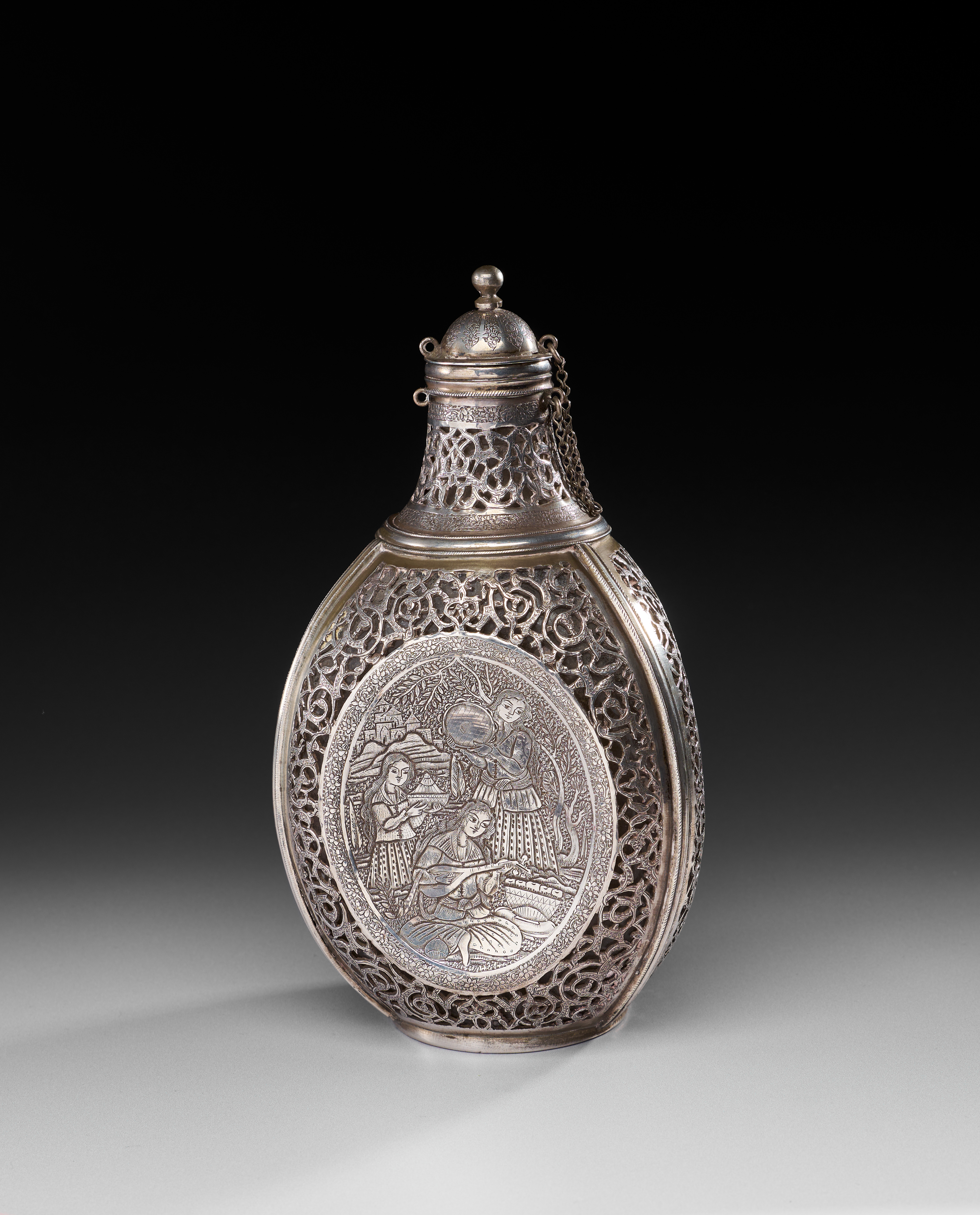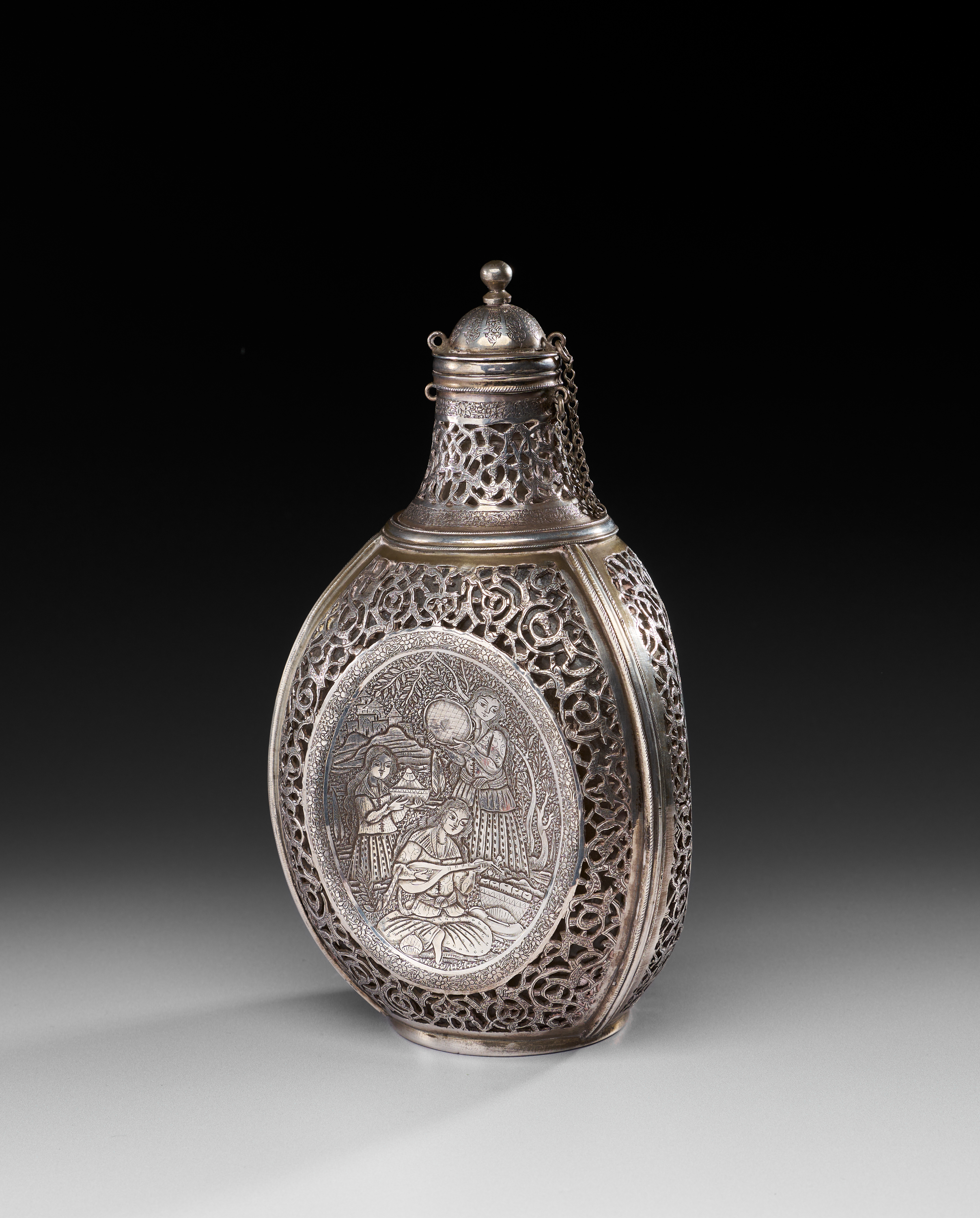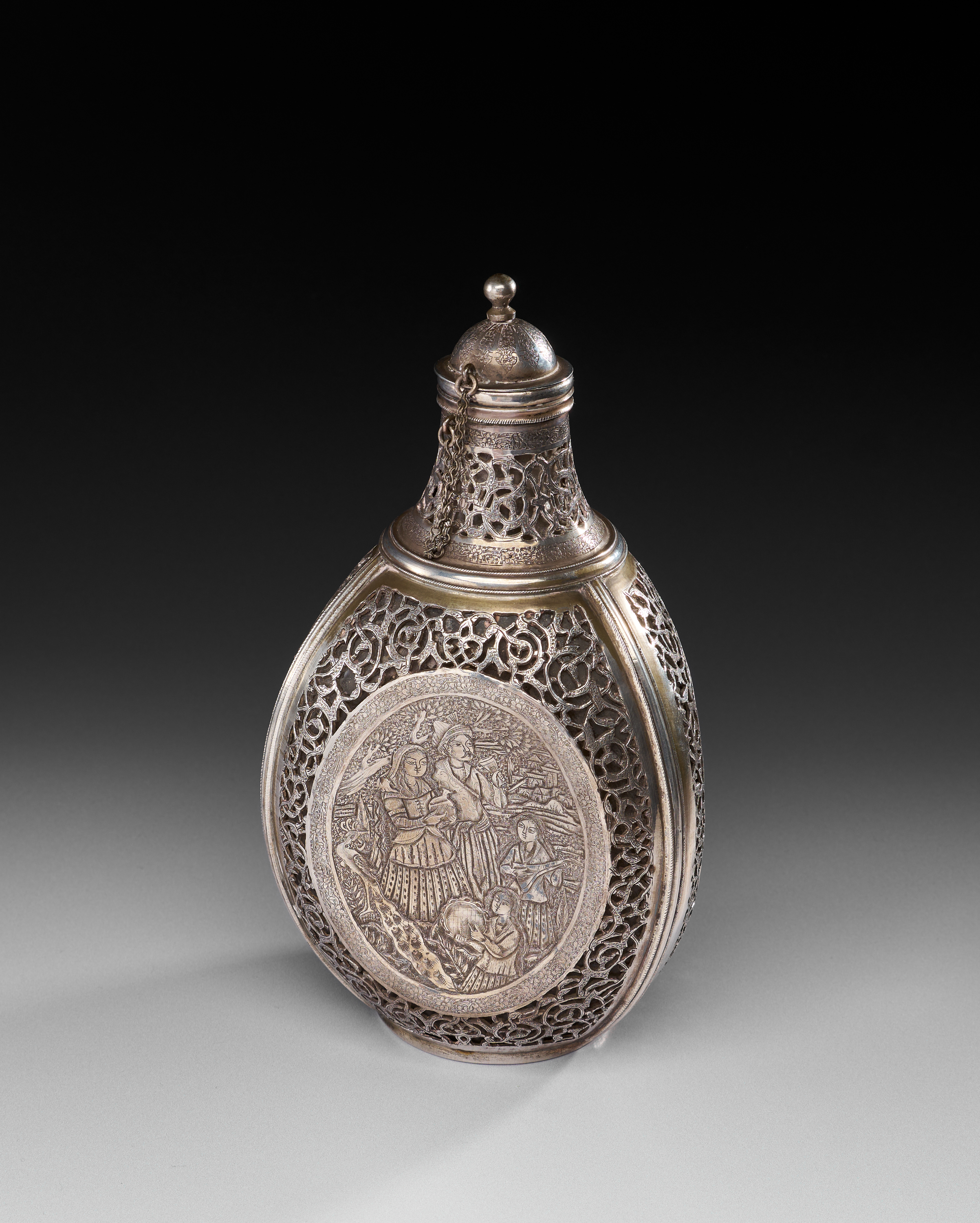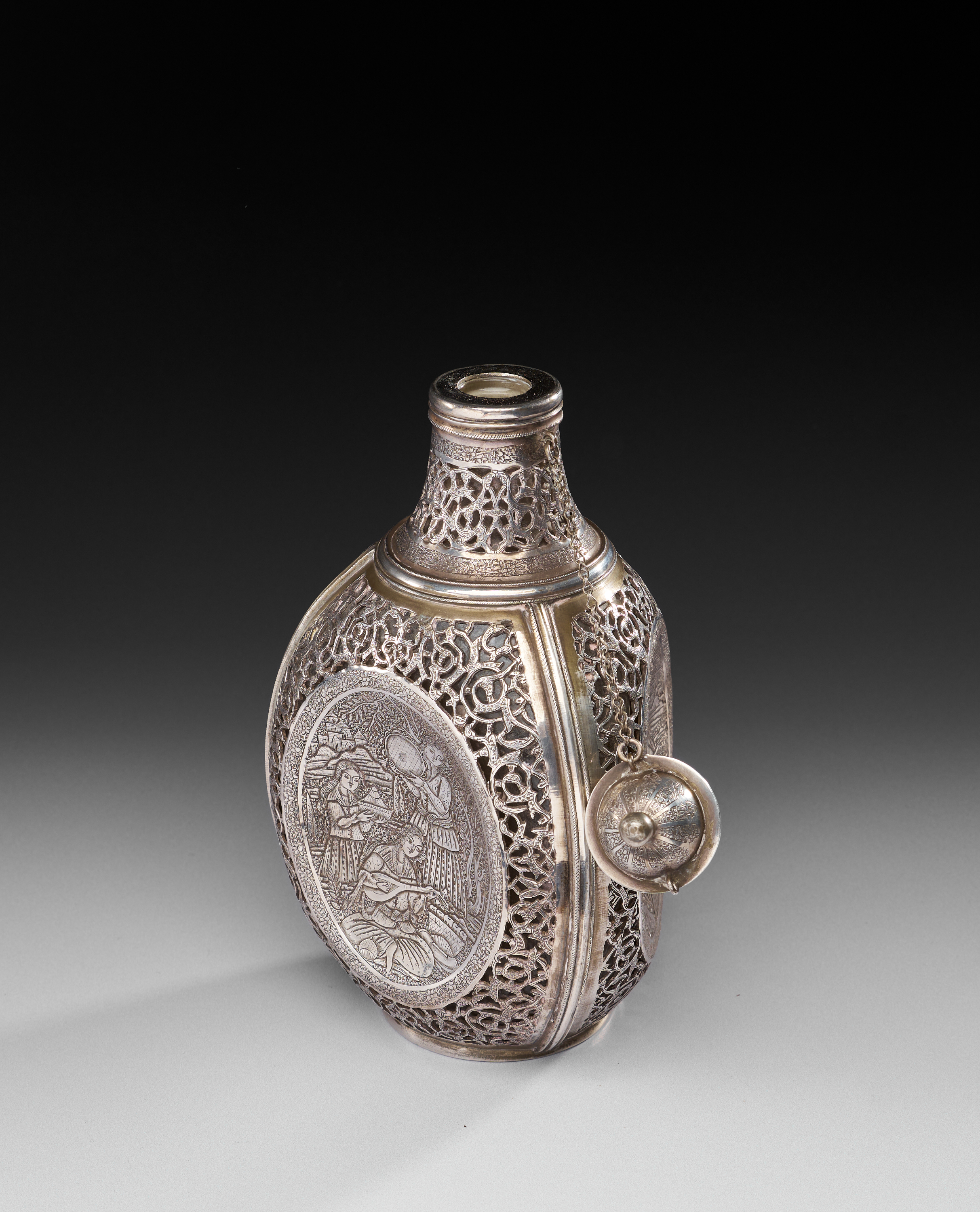 Of flattened pear-shaped form with a short cylindrical neck and domed hinged cover, the glass body is mounted in finely worked openwork silver. The broad oval reserves on each face are engraved with figural scenes of musicians and attendants set within landscapes, framed by pierced arabesque scrolls. The neck mount is richly decorated with further openwork and foliate engraving, surmounted by a domed cap with attached chain.