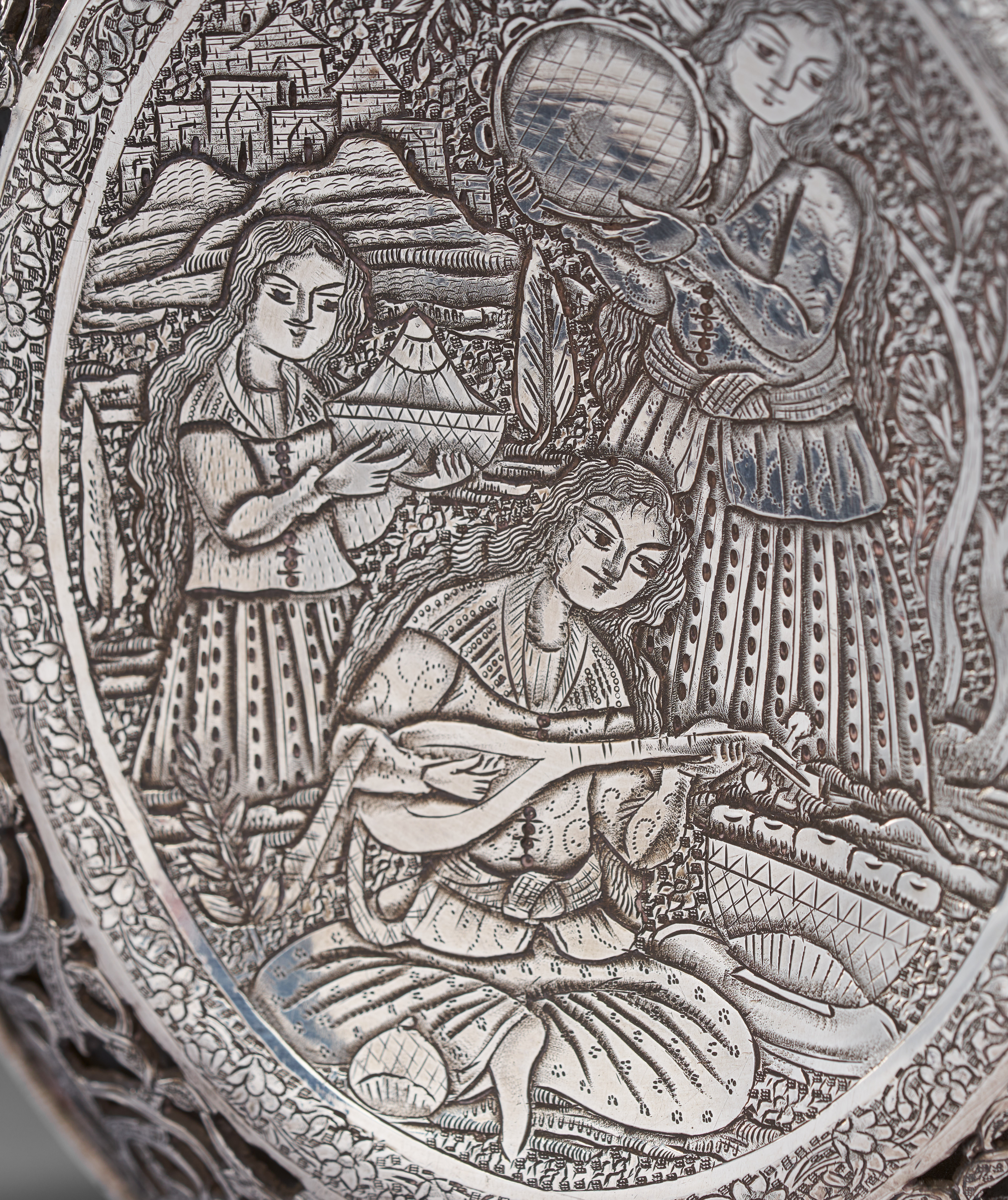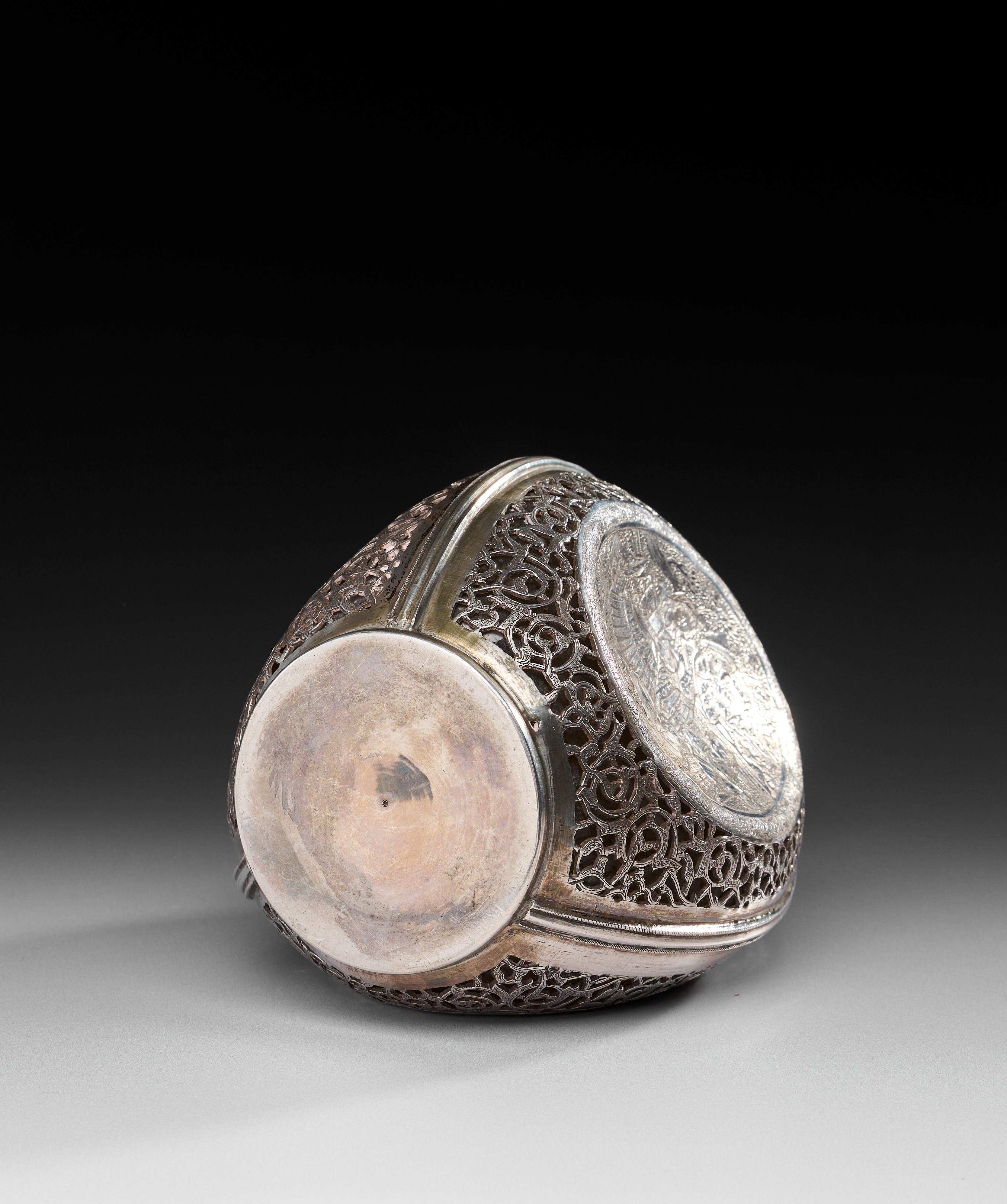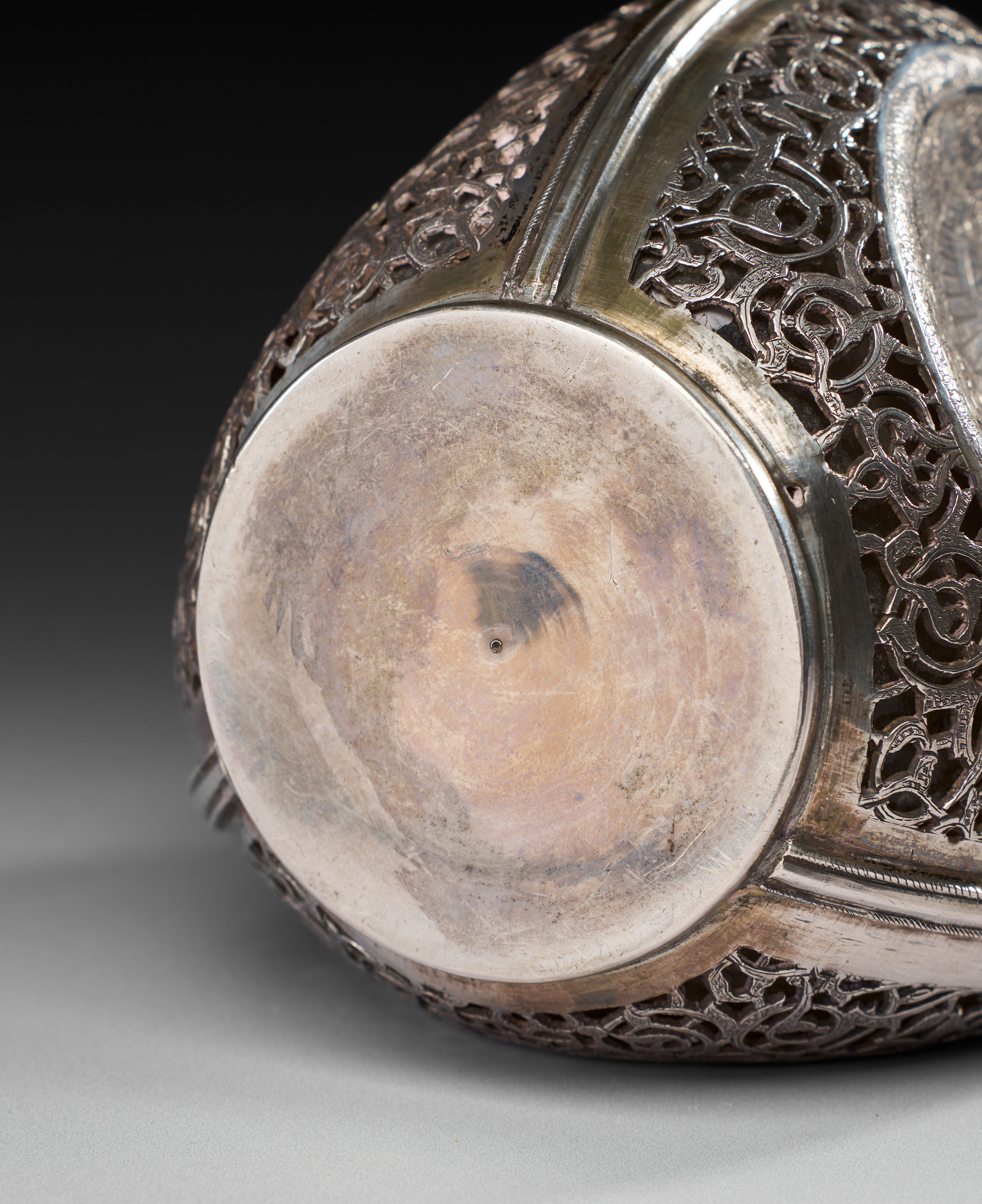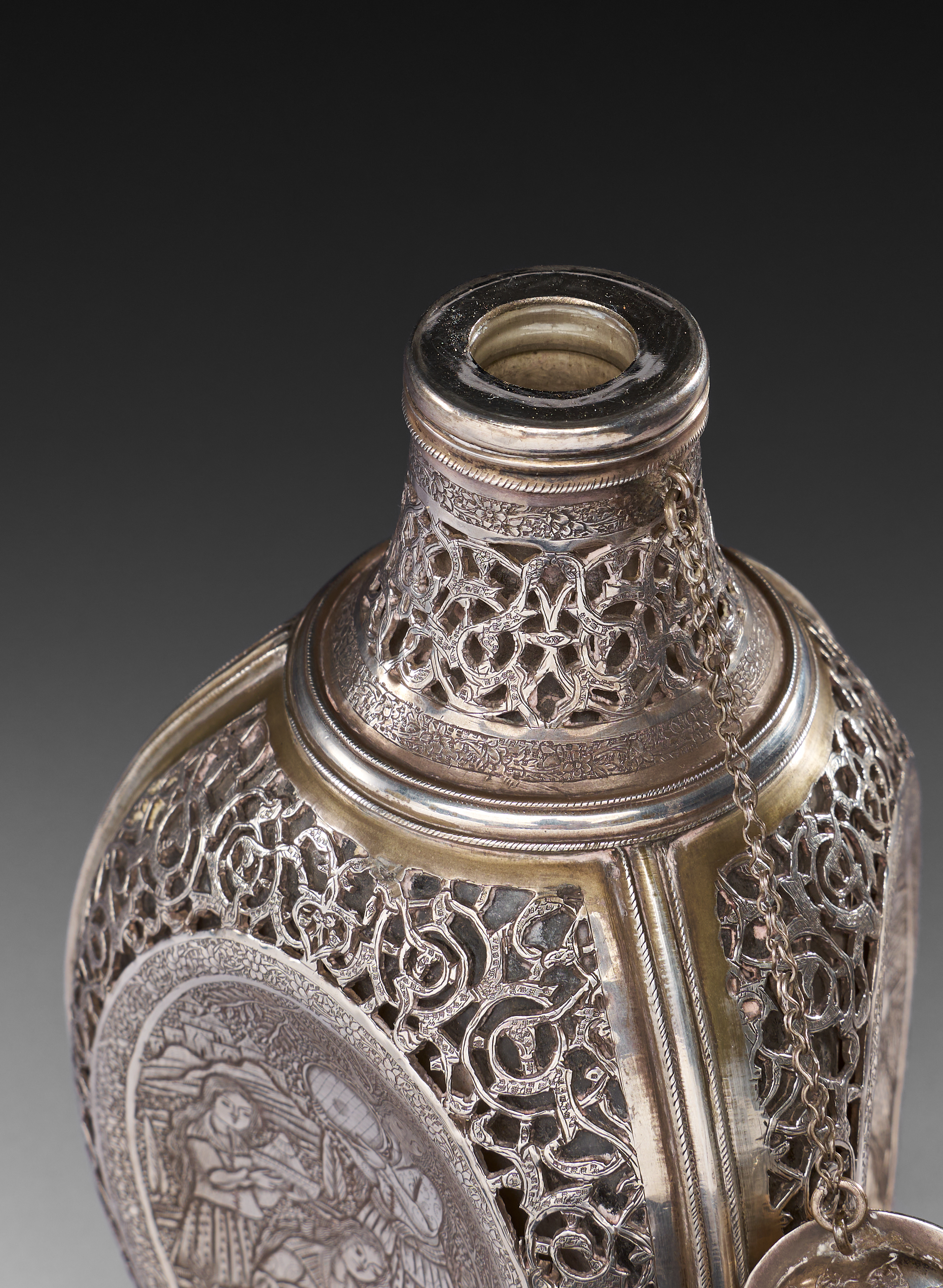 Of flattened pear-shaped form with a short cylindrical neck and domed hinged cover, the glass body is mounted in finely worked openwork silver. The broad oval reserves on each face are engraved with figural scenes of musicians and attendants set within landscapes, framed by pierced arabesque scrolls. The neck mount is richly decorated with further openwork and foliate engraving, surmounted by a domed cap with attached chain.