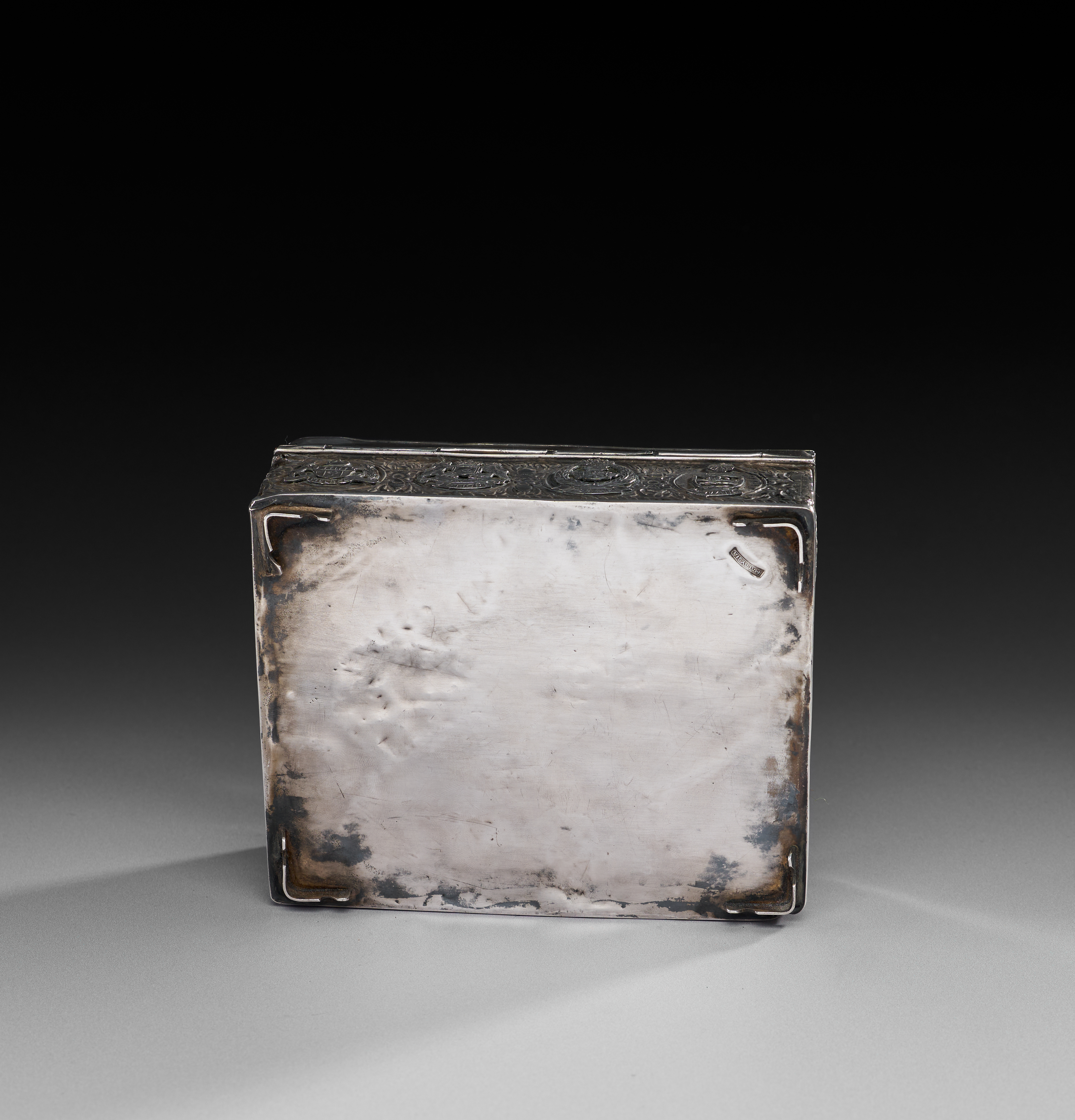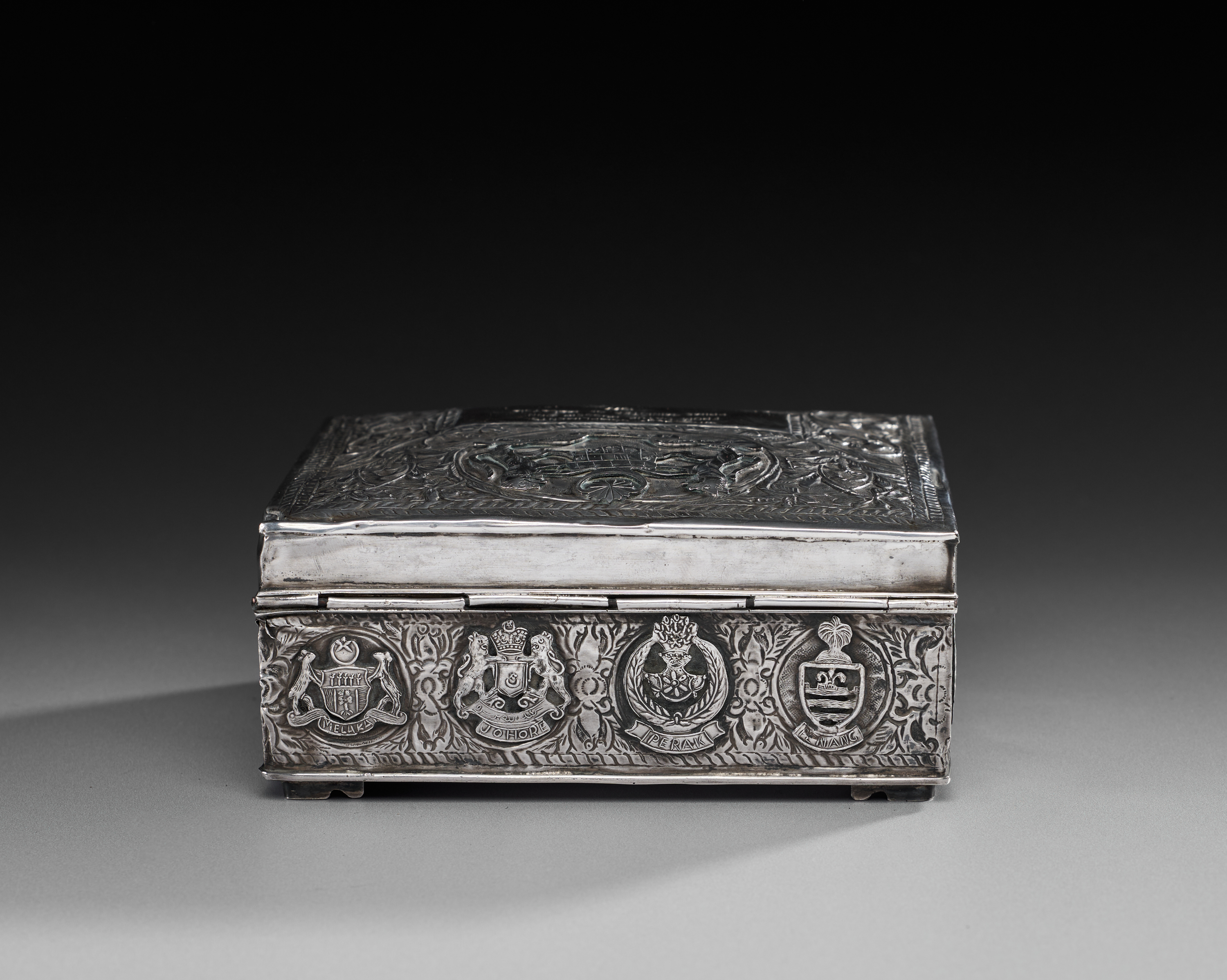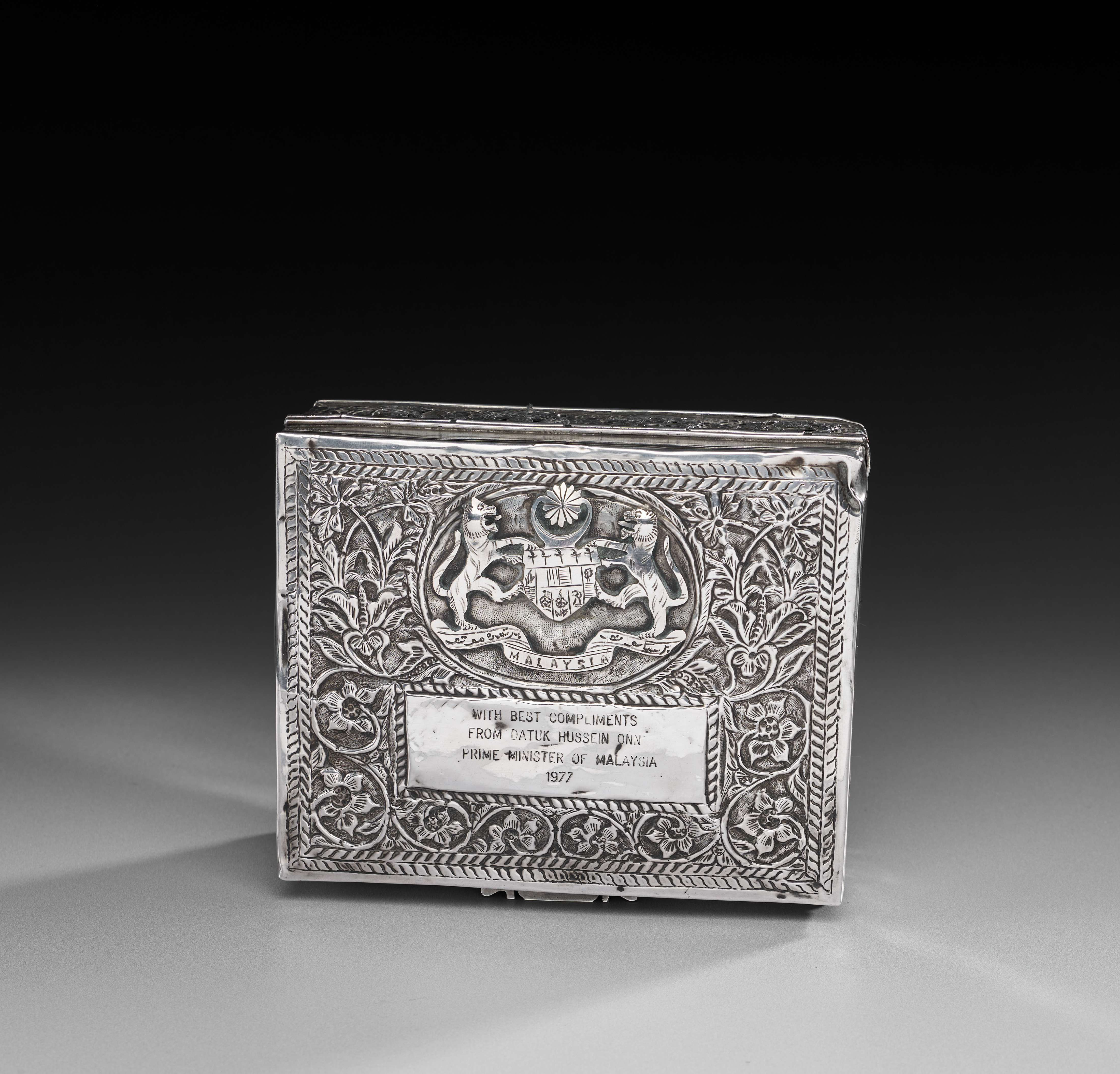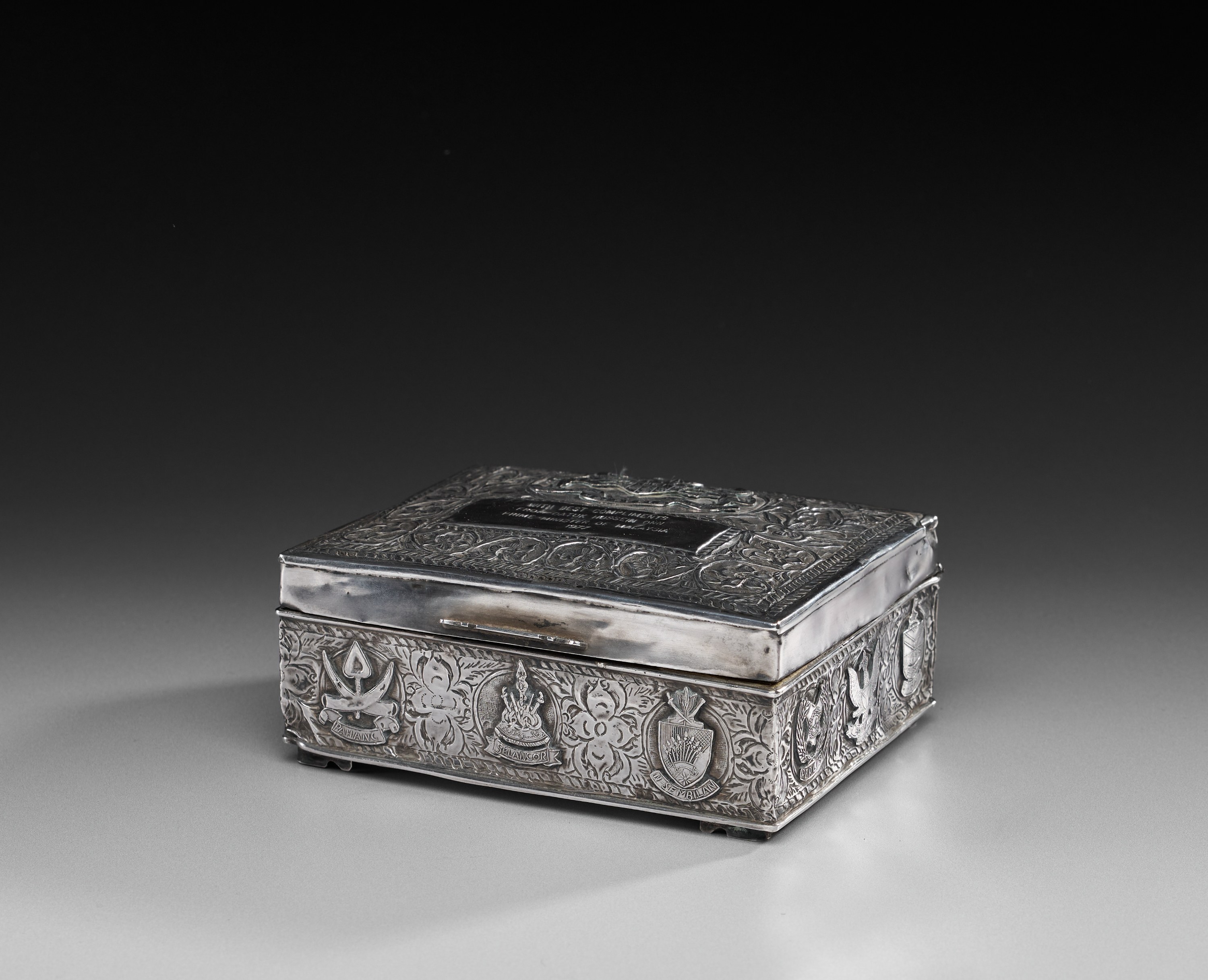 Rectangular in form and raised on four small feet, the box is worked in repoussé and chased sterling silver. The sides are decorated with panels of scrolling foliage enclosing the emblems of the Malaysian states, each identified by name. The hinged lid is framed with vegetal motifs and bears the Malaysian coat of arms in high relief above a presentation plaque inscribed: “With best compliments from Datuk Hussein Onn, Prime Minister of Malaysia, 1977.” The base is stamped MALAYSIA.