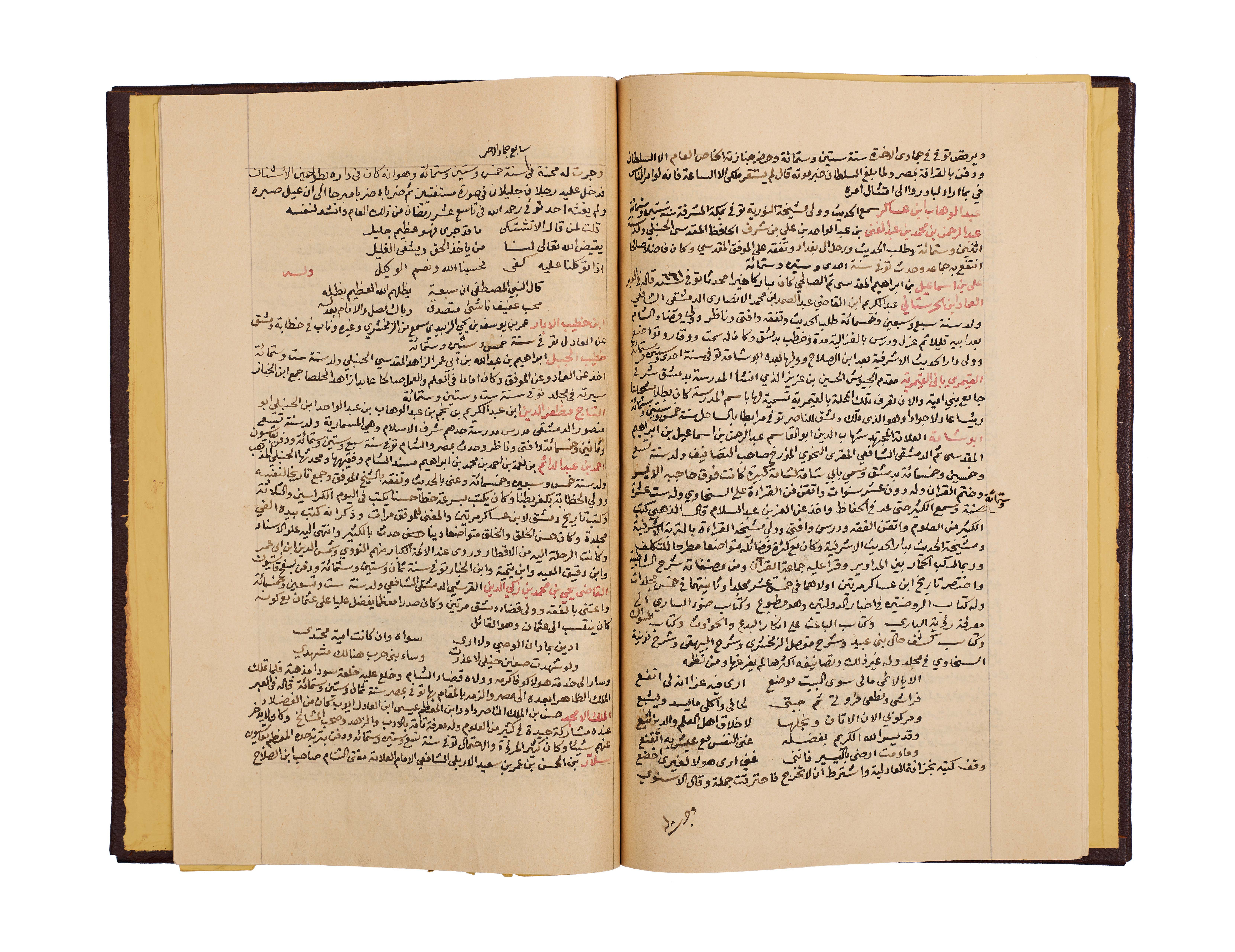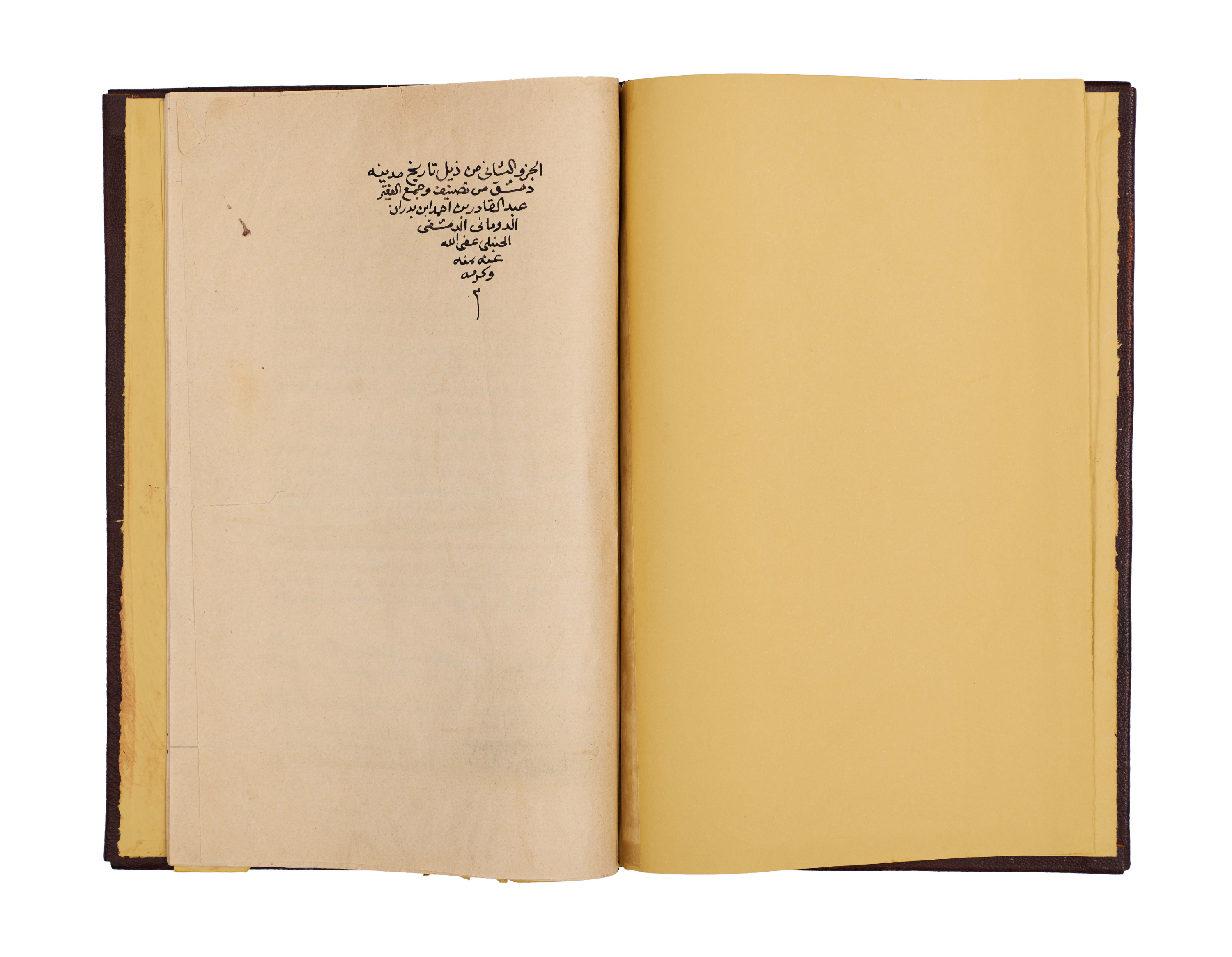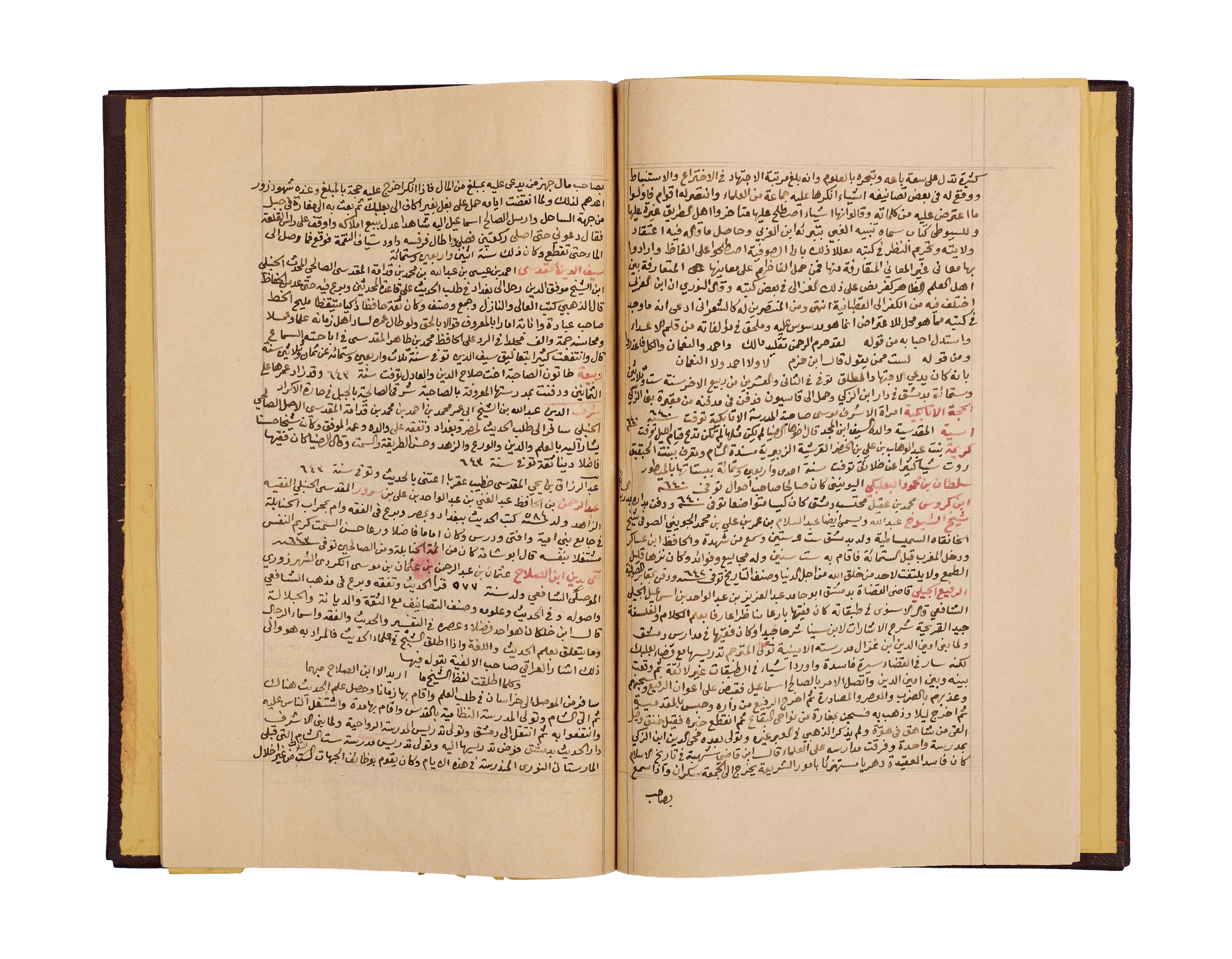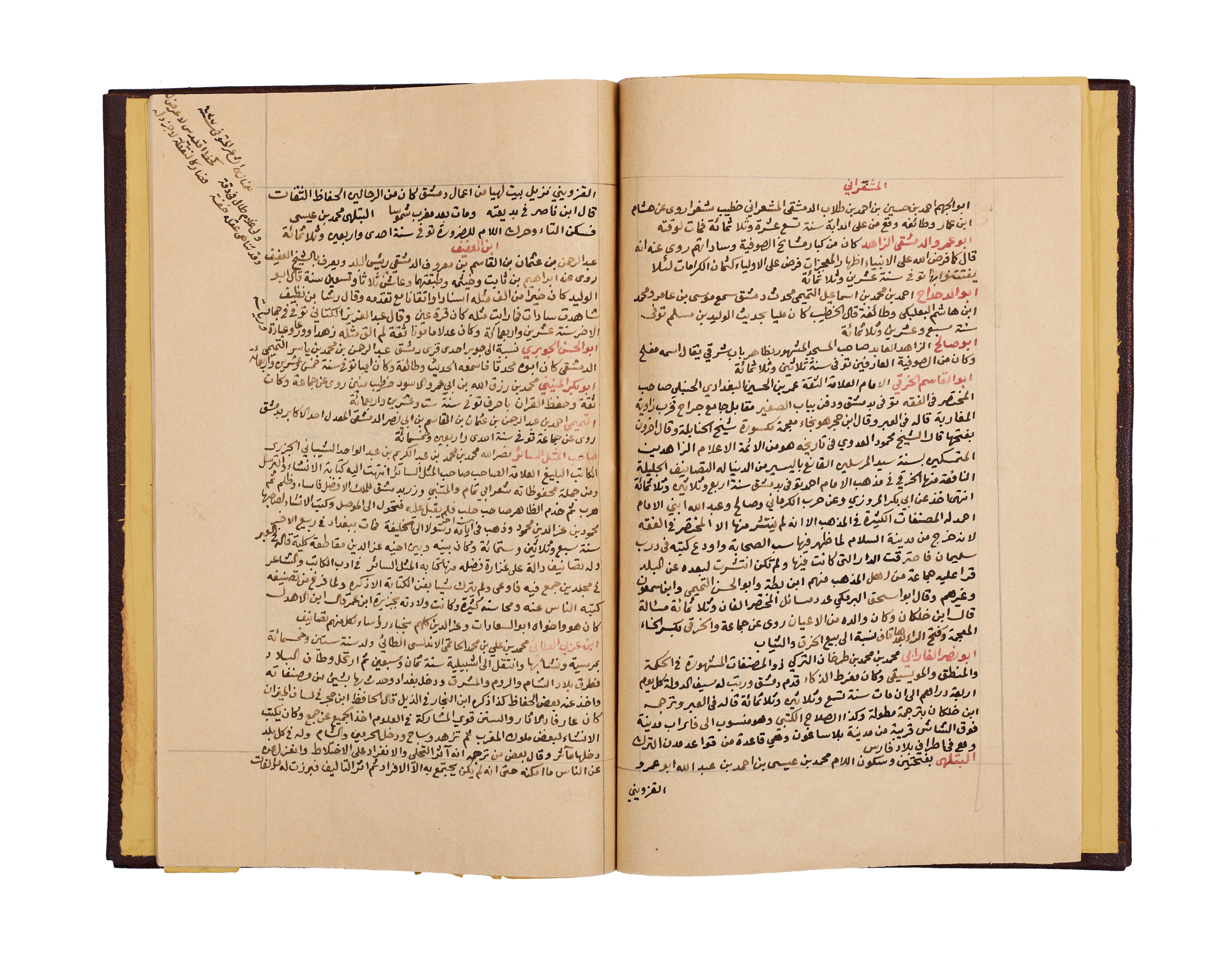 This important manuscript is the second volume of the monumental History of Damascus, compiled and richly annotated by the noble Sheikh Abdulqadir bin Ahmad bin Badran al-Maqdisi al-Dimashqi. Written in clear black script with key sections and names rubricated in red, the text is densely laid out across the folios, with marginal notes providing scholarly commentary and cross-references.