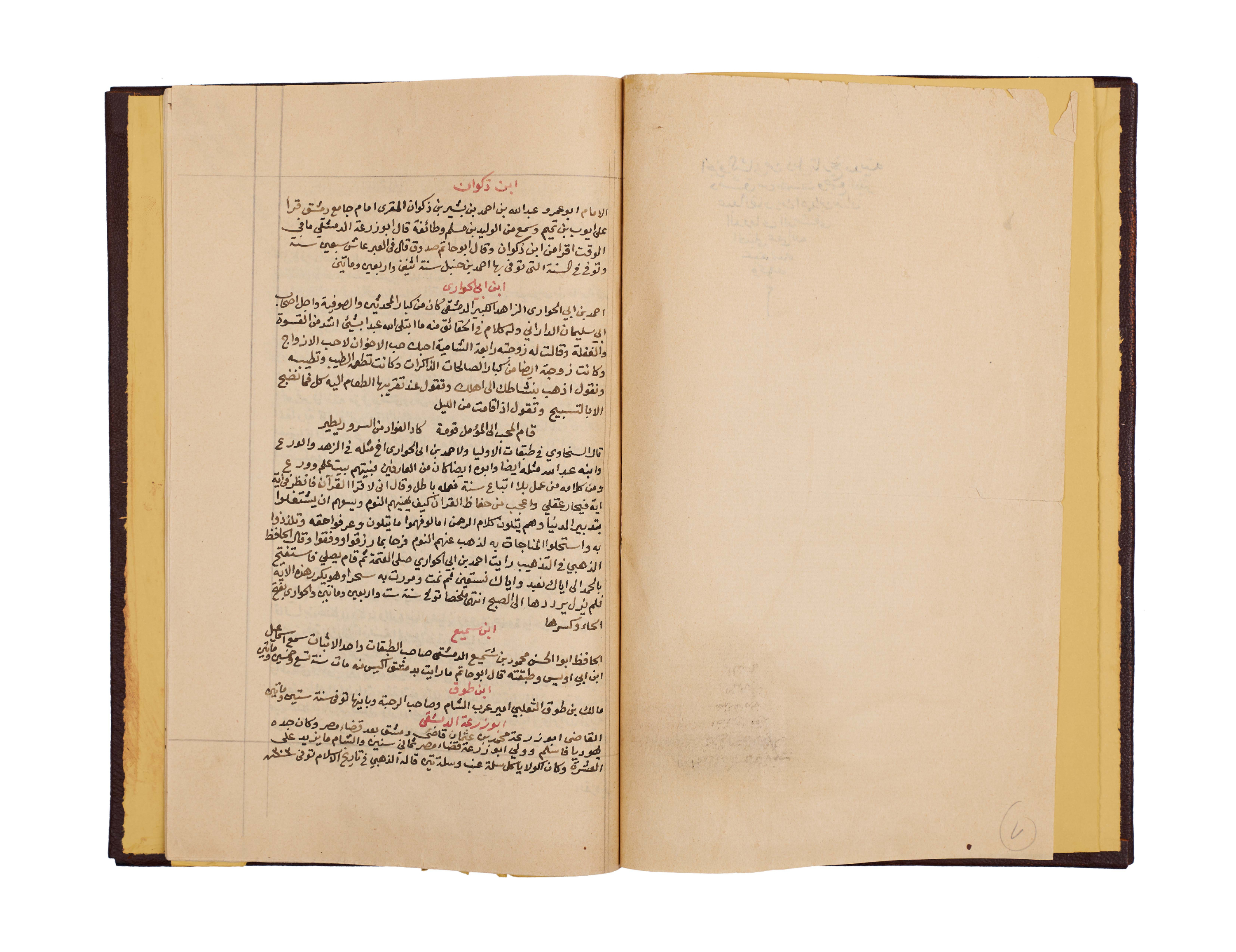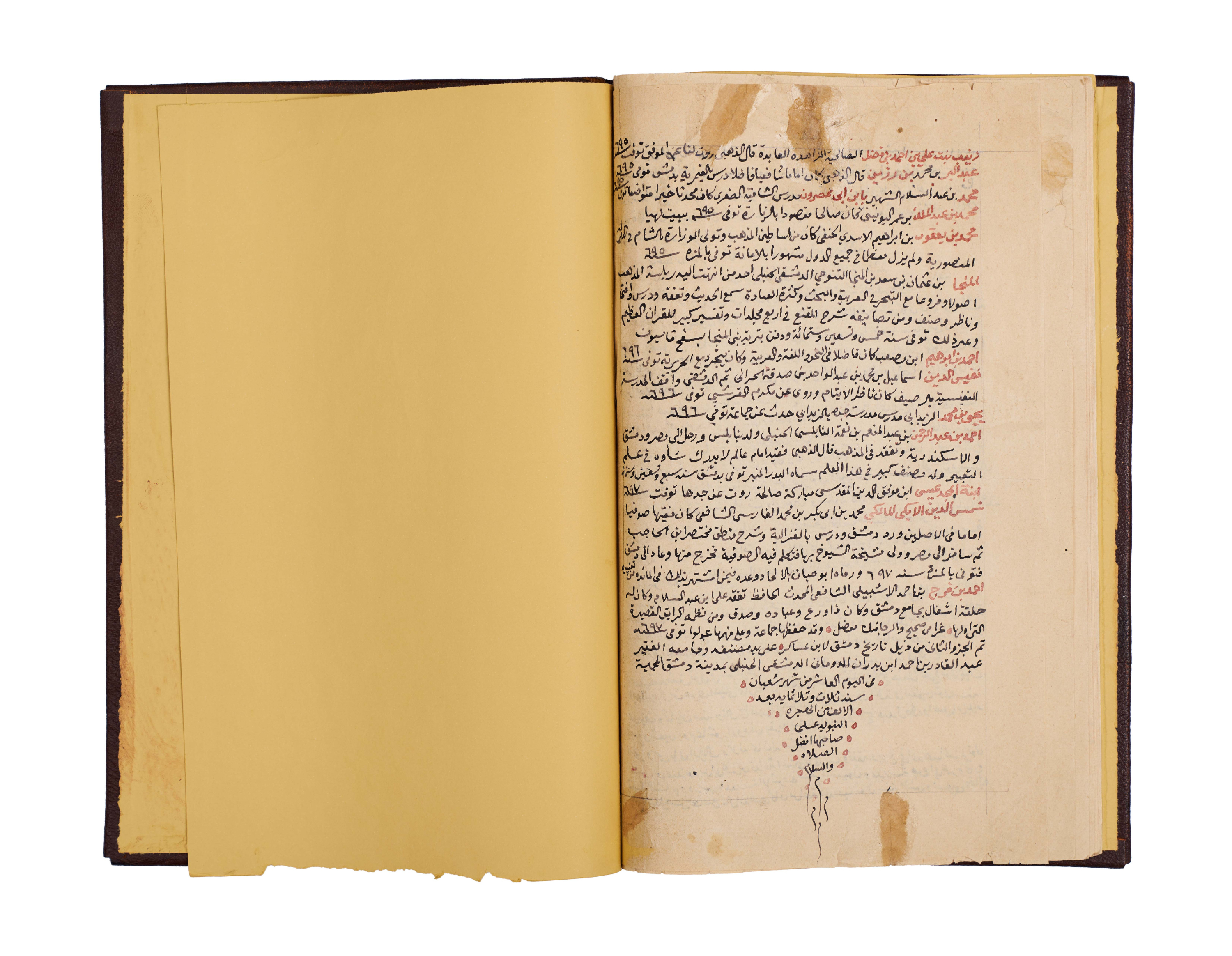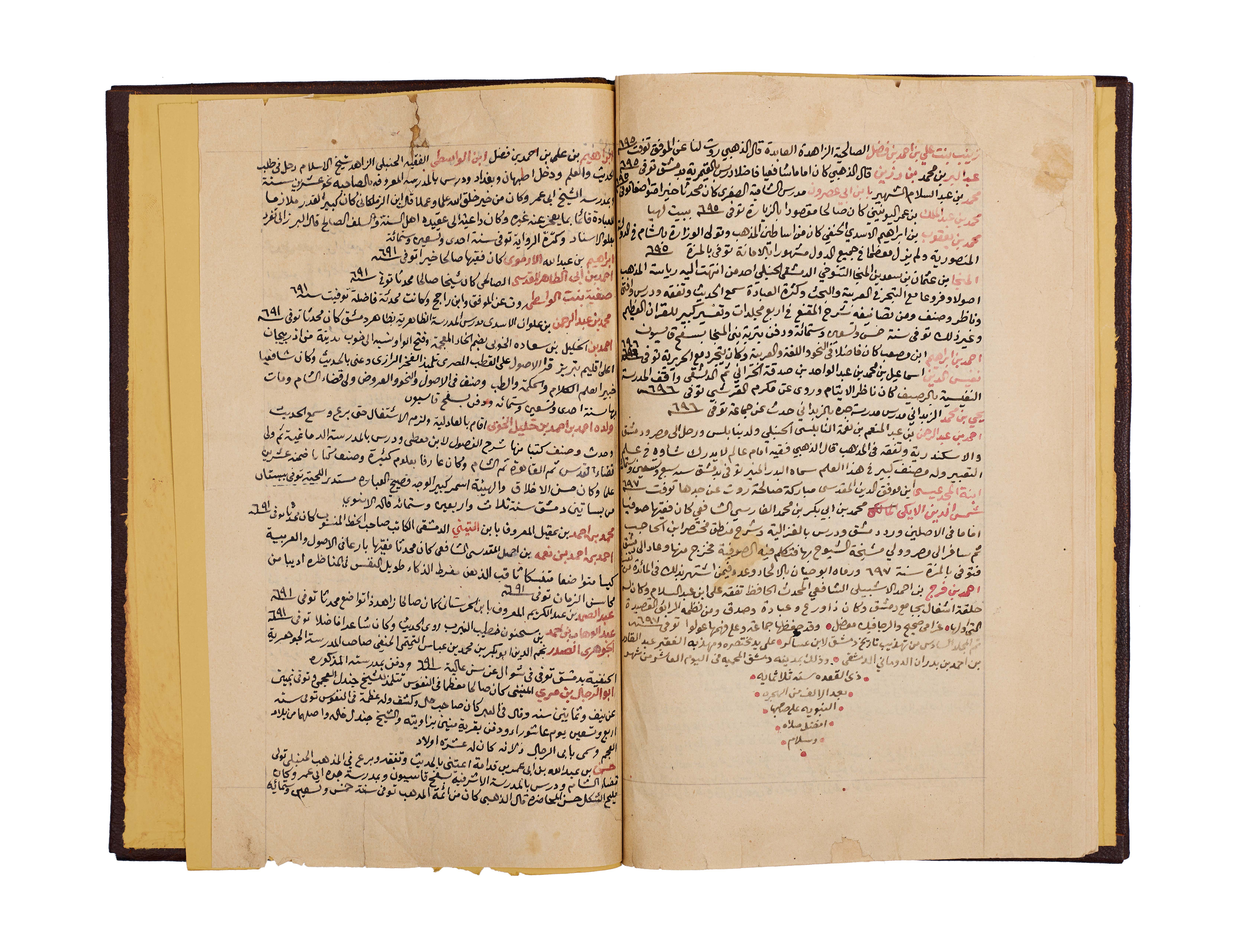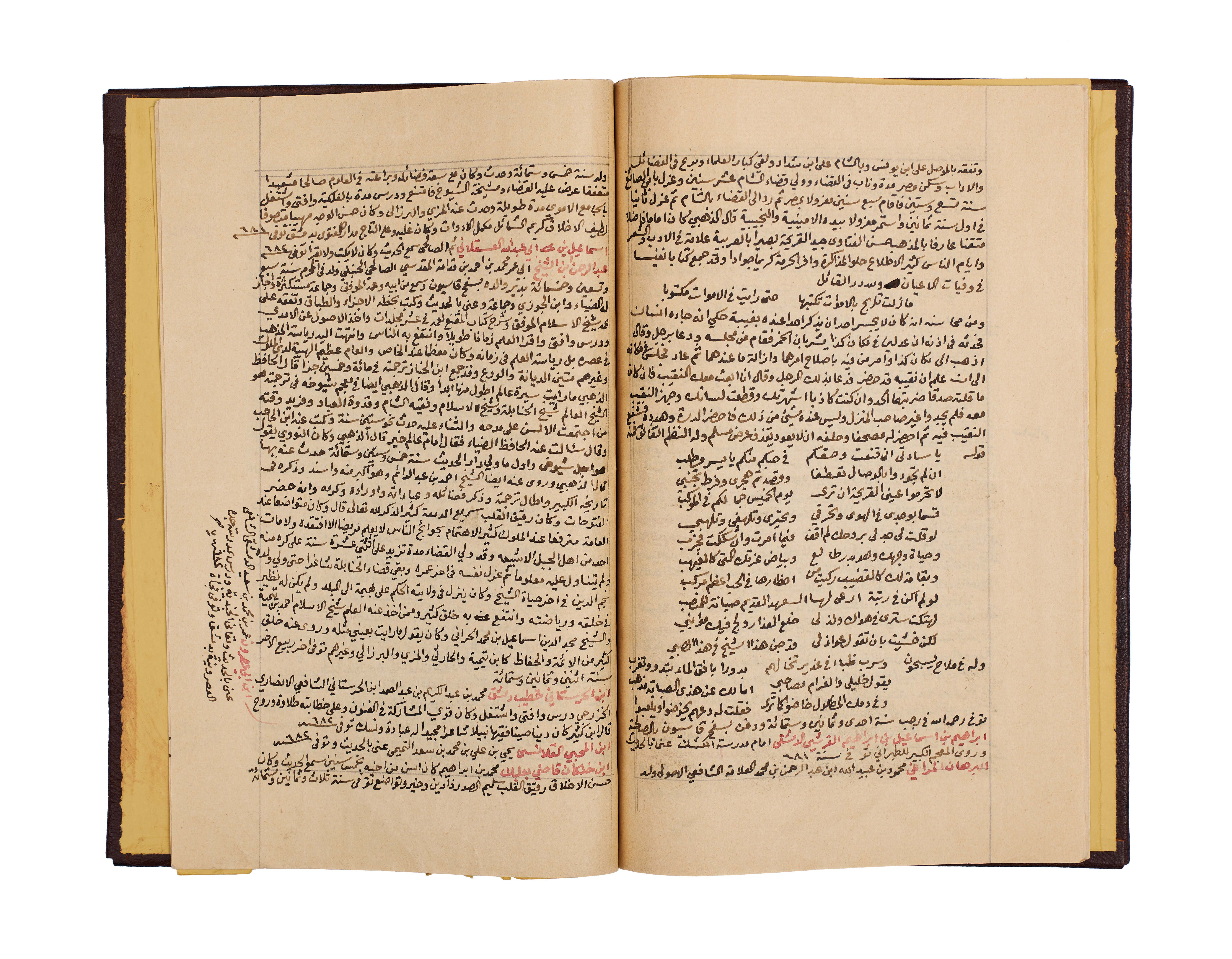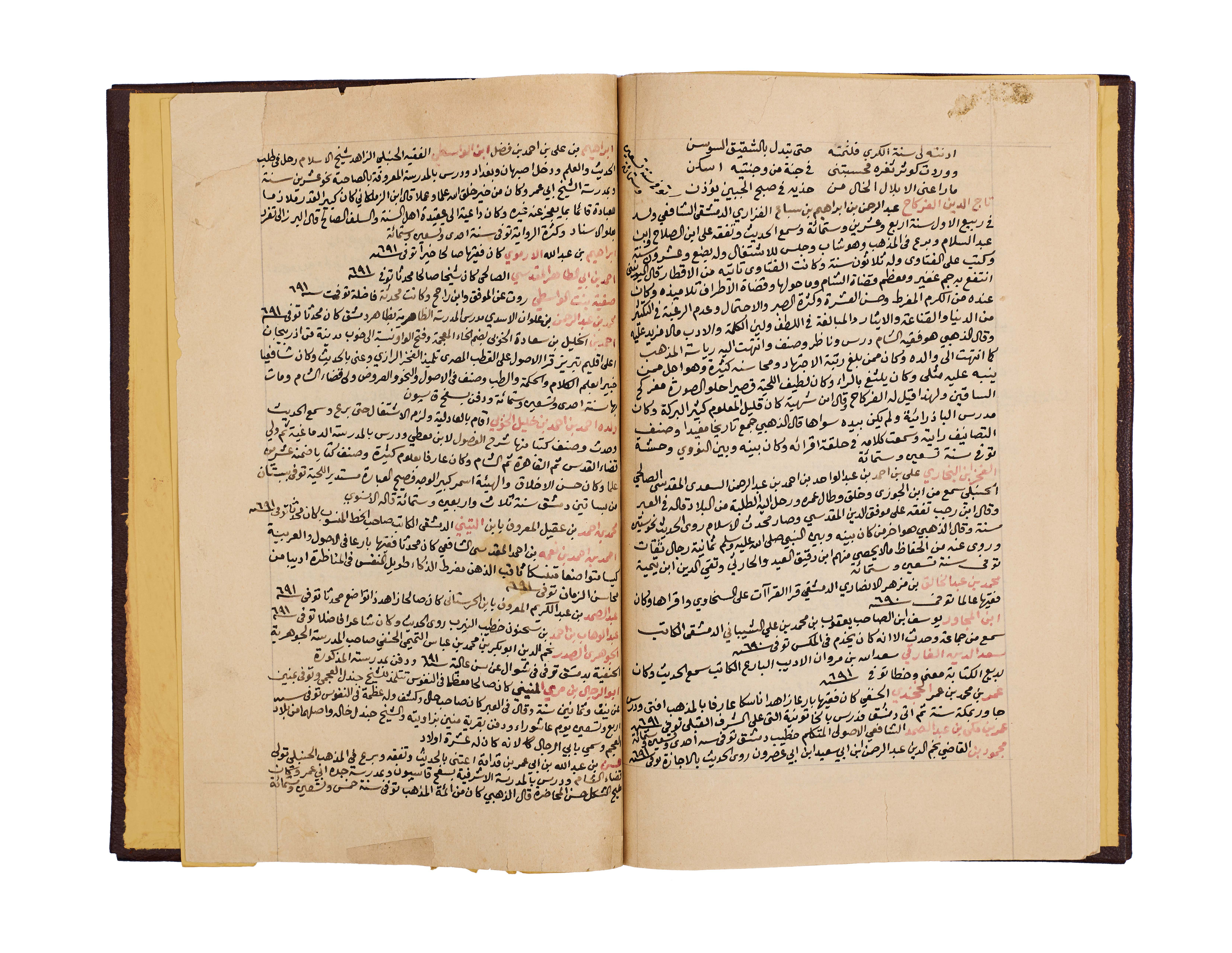 This important manuscript is the second volume of the monumental History of Damascus, compiled and richly annotated by the noble Sheikh Abdulqadir bin Ahmad bin Badran al-Maqdisi al-Dimashqi. Written in clear black script with key sections and names rubricated in red, the text is densely laid out across the folios, with marginal notes providing scholarly commentary and cross-references.