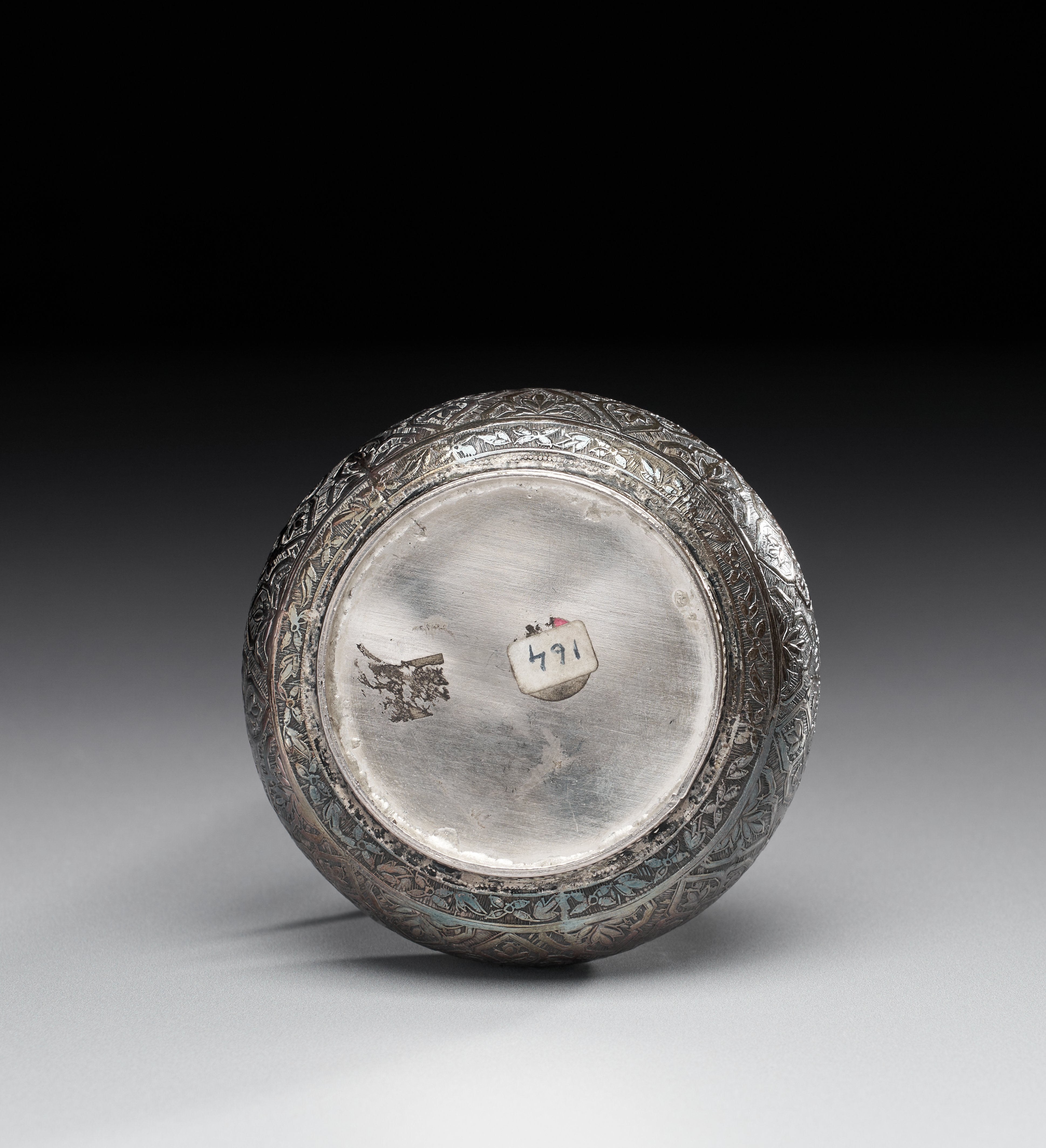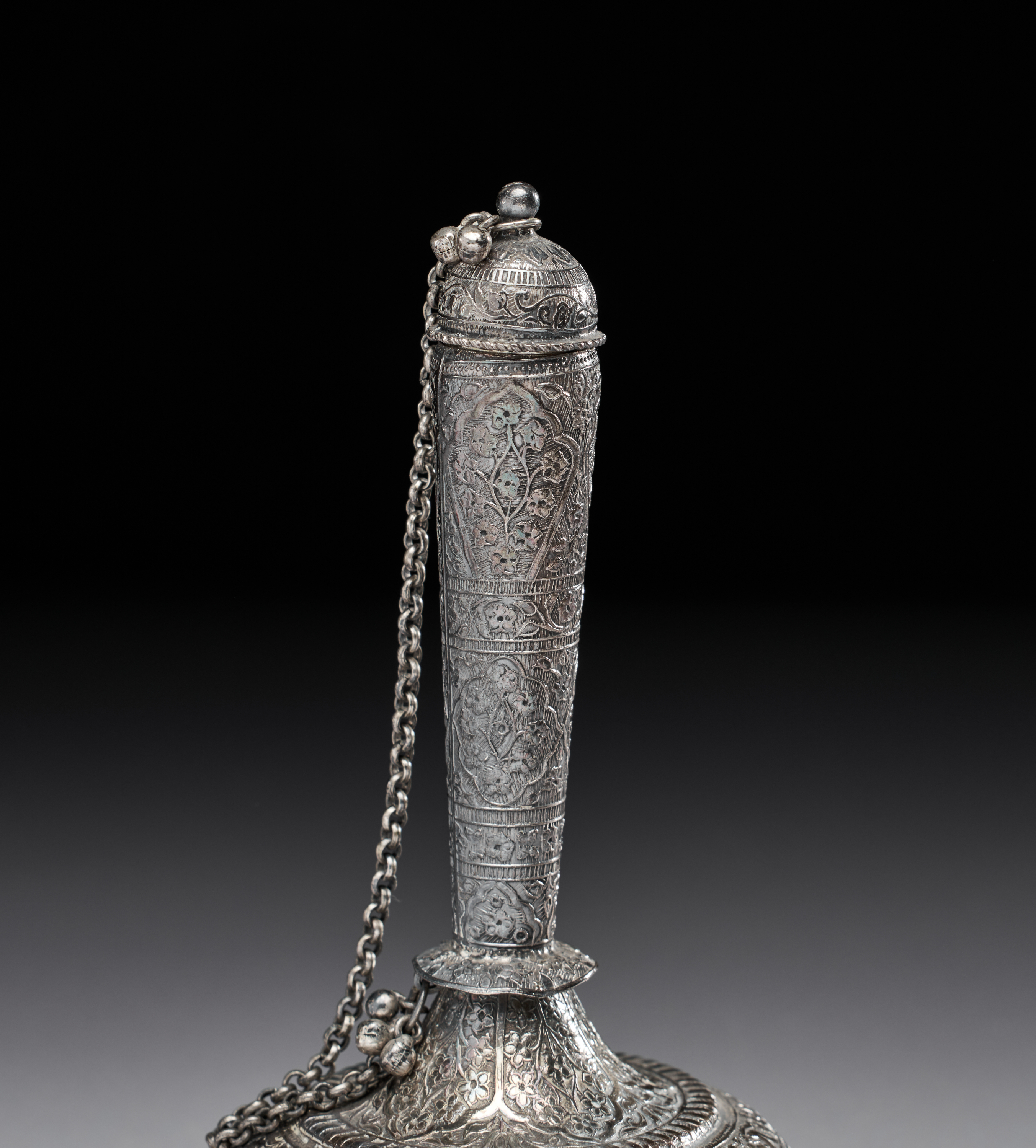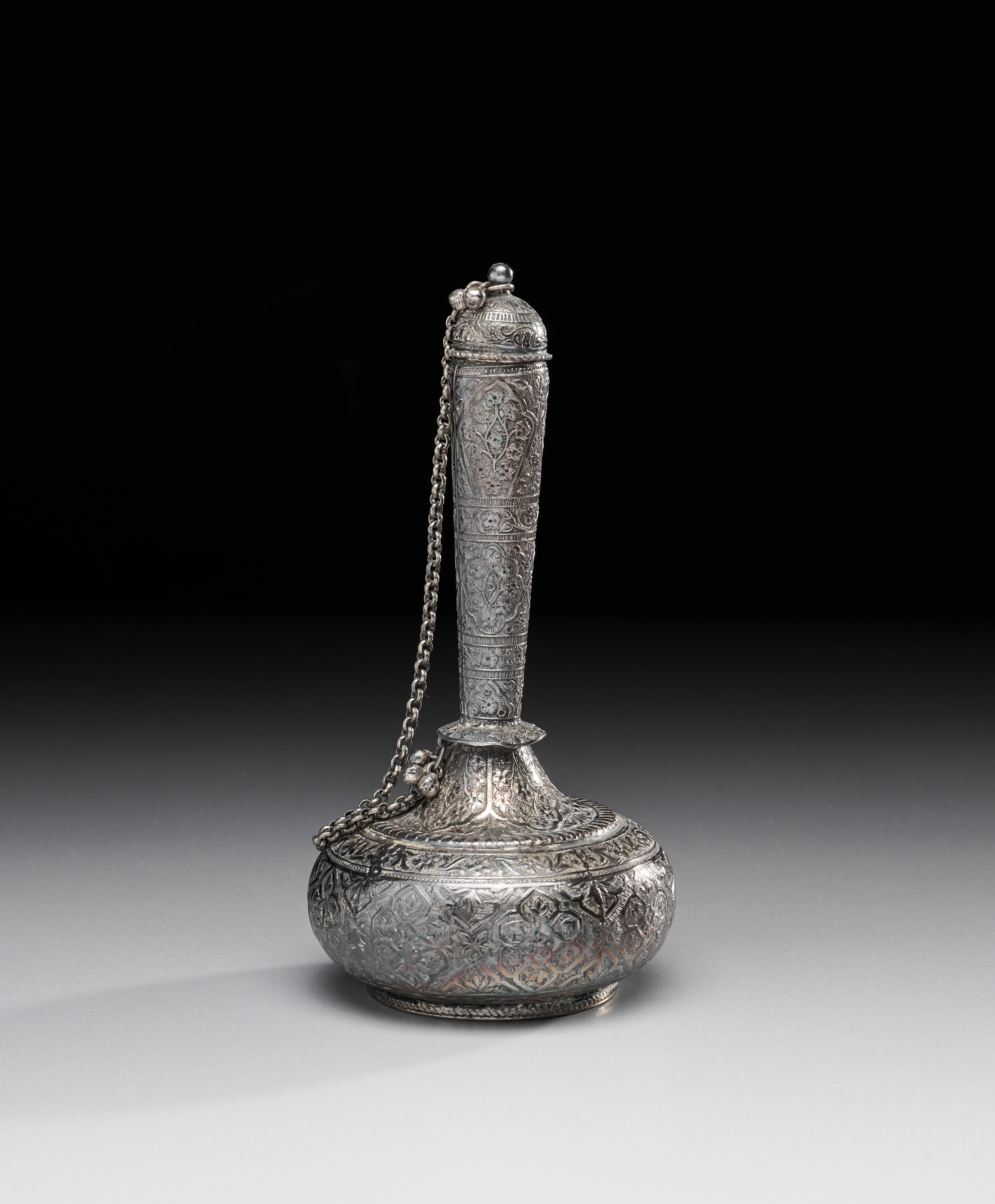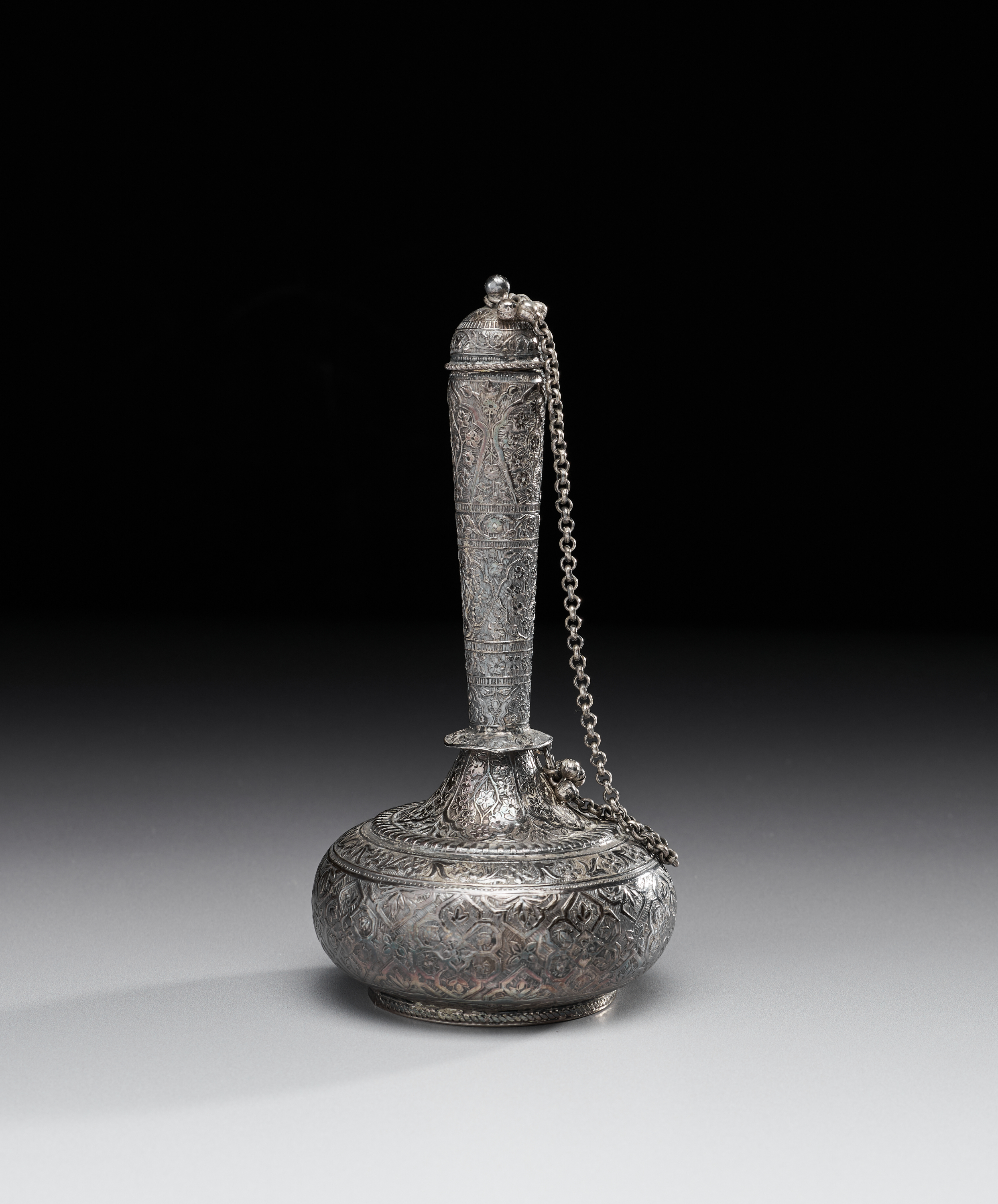 AN ENGRAVED INDIAN SILVER BOTTLE (SURAHI), 20TH CENTURY