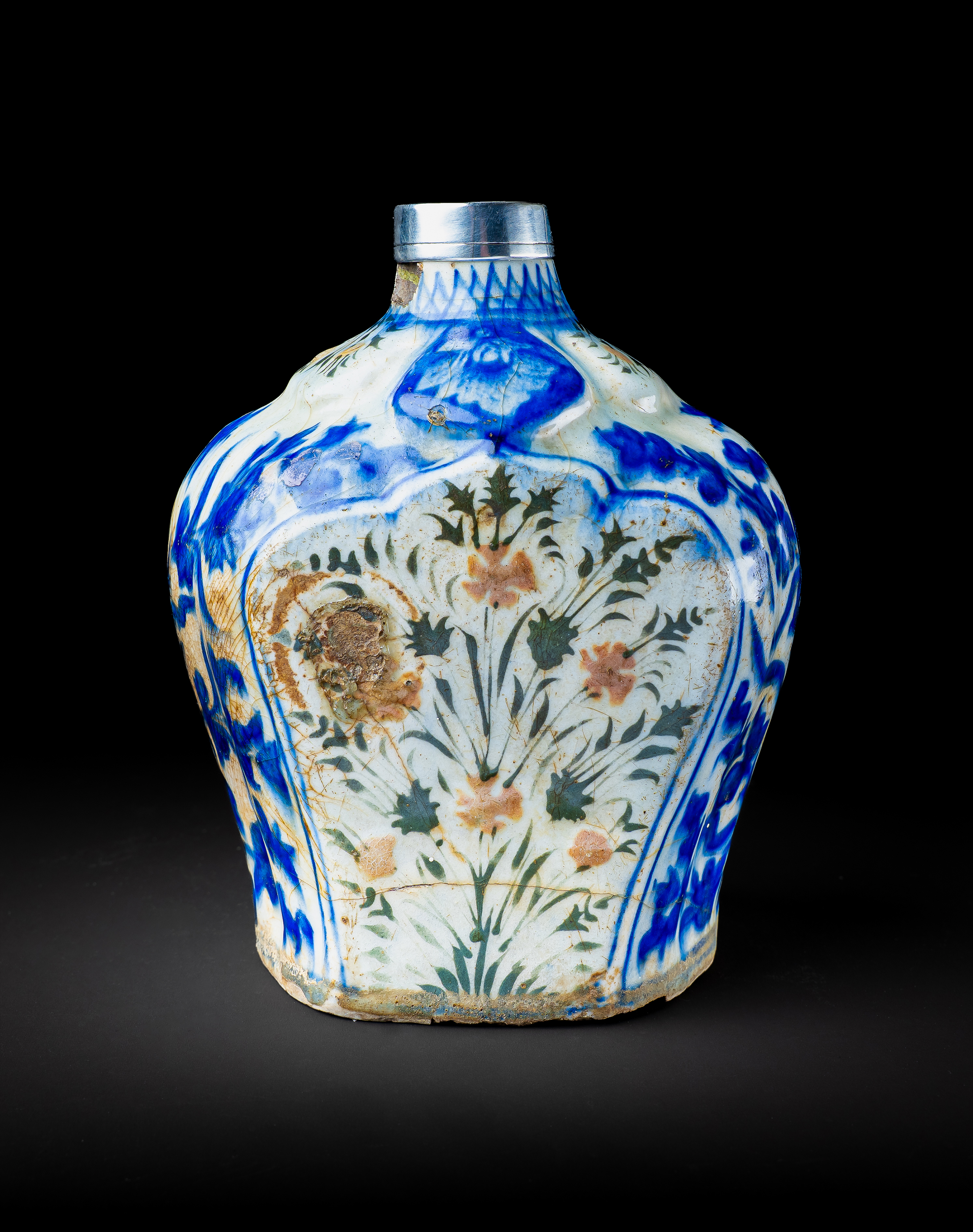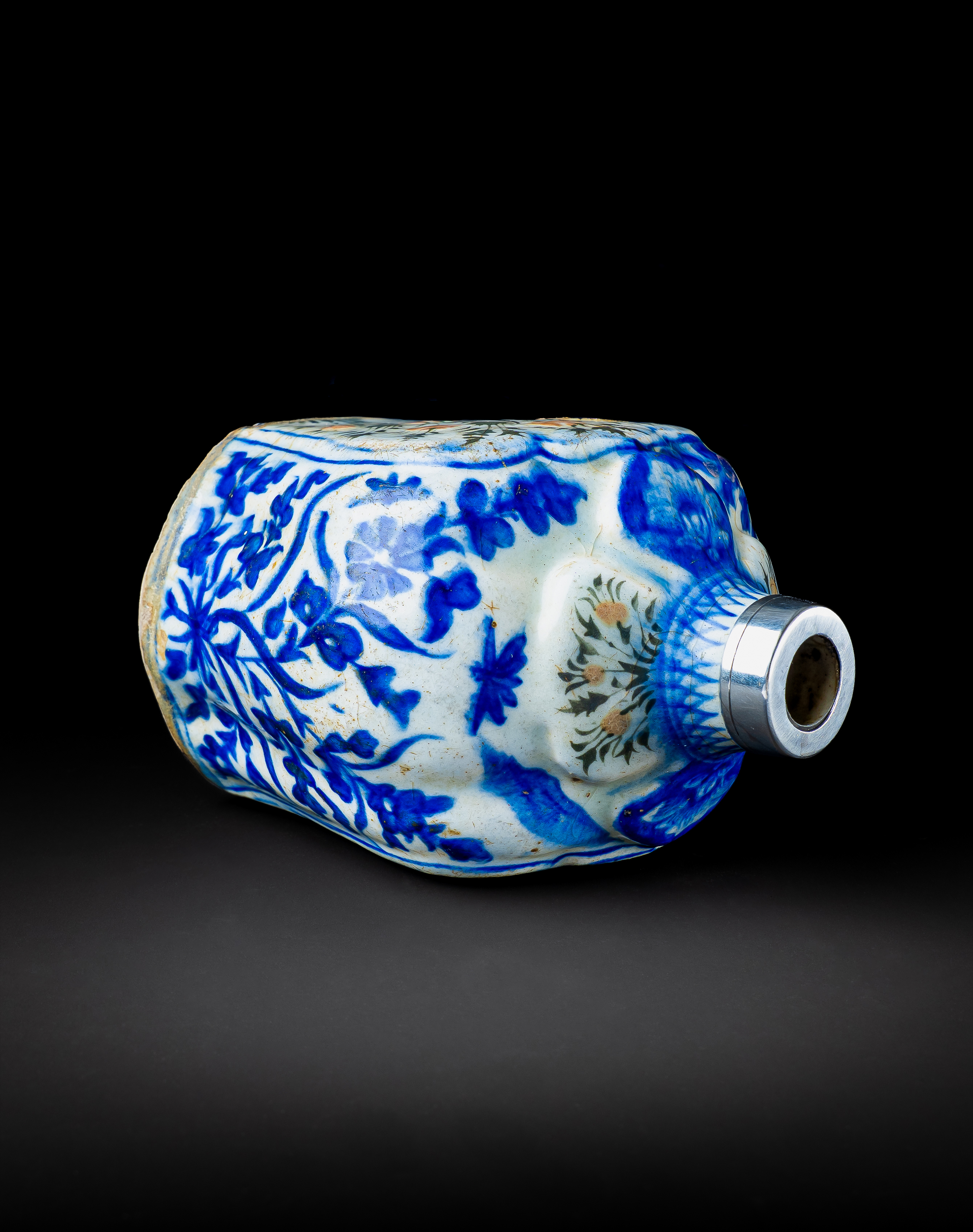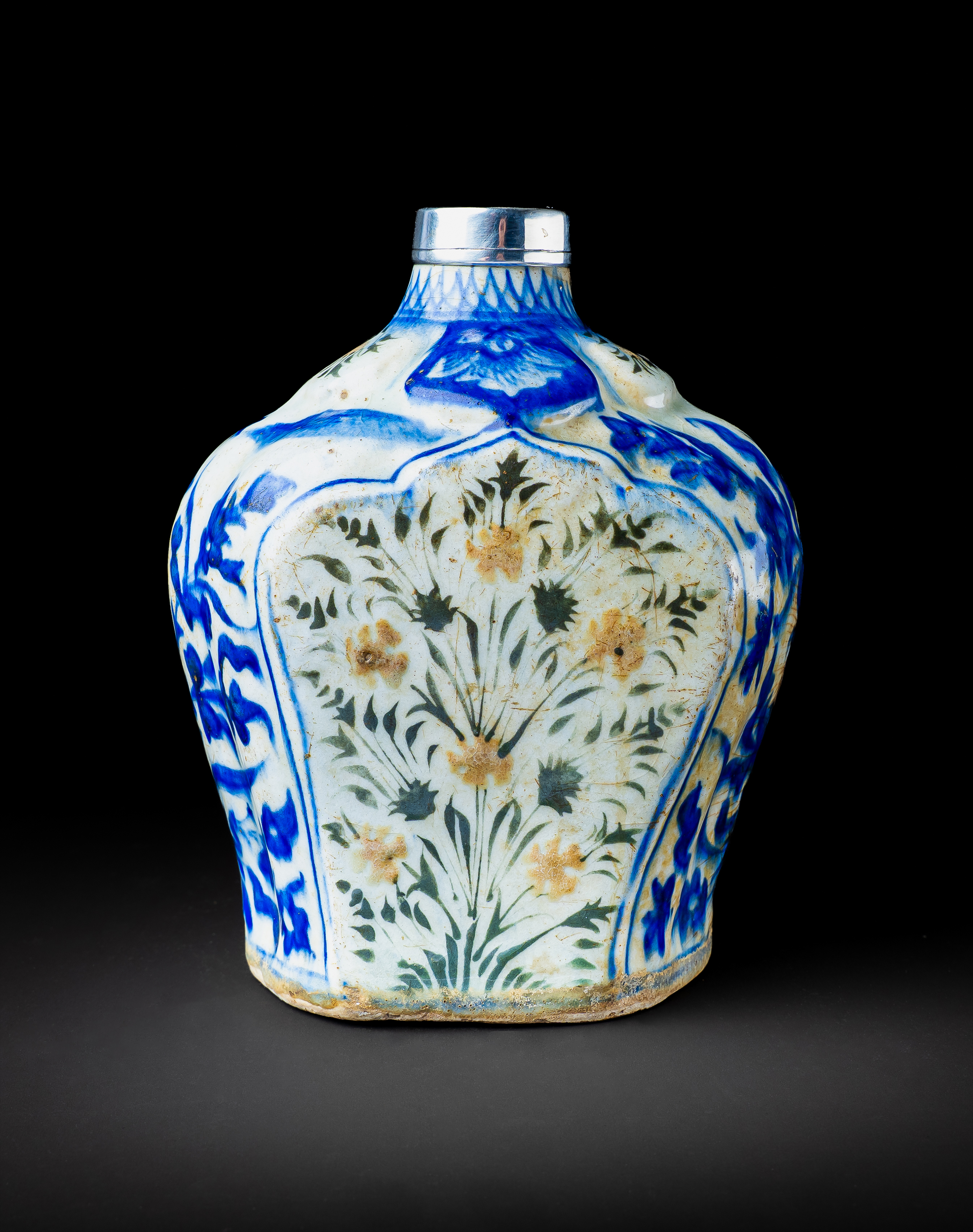 Of compressed globular form with a short cylindrical neck mounted with a later silver collar, the body is painted in underglaze cobalt blue, green, and manganese with floral sprays within cusped panels, alternating with bold arabesque designs. The decoration is set against a white ground, producing a vibrant contrast typical of Safavid ceramics from Kirman. The panels display naturalistic flowers in yellow and green, framed by deep cobalt blue foliate scrolls and arabesques.