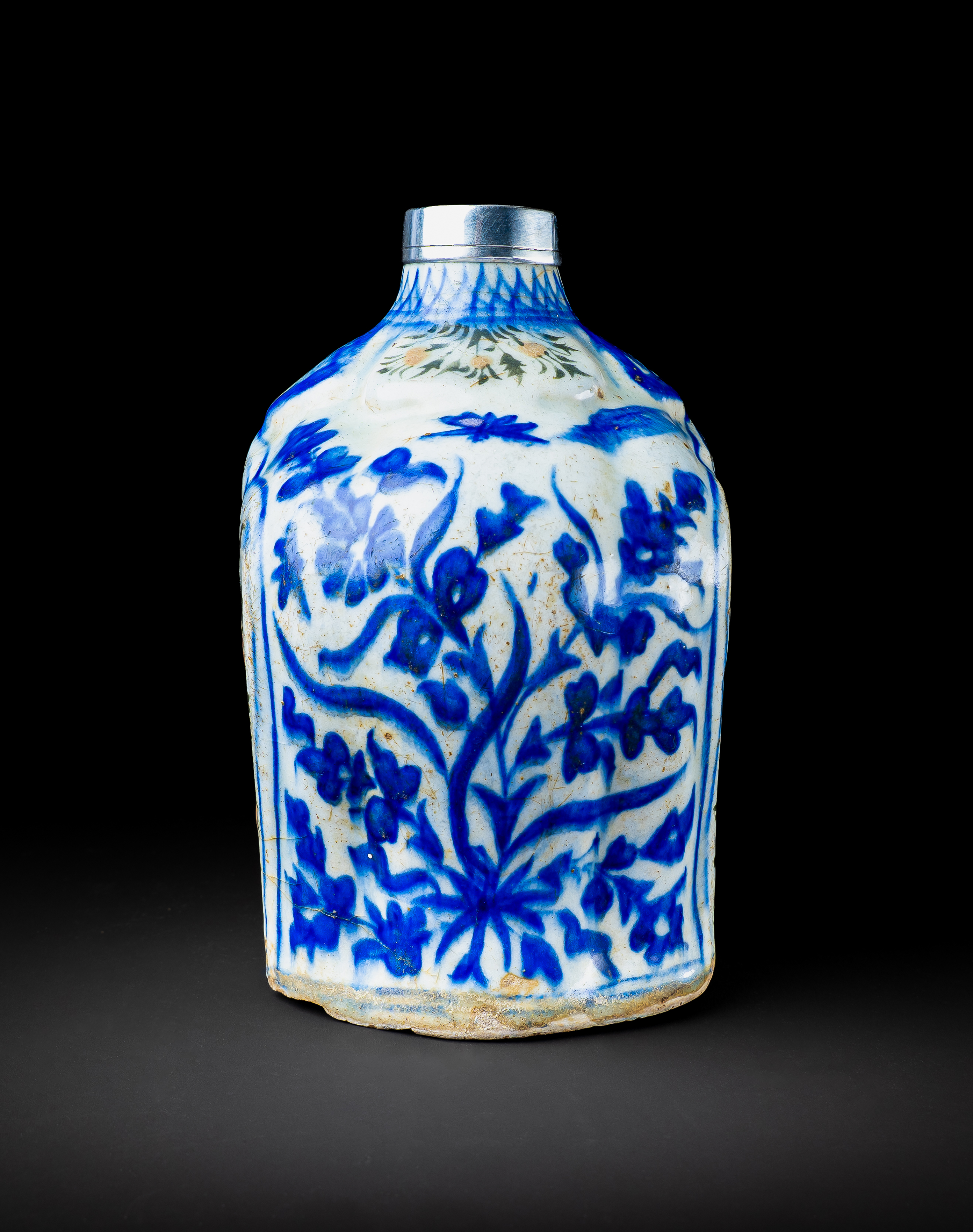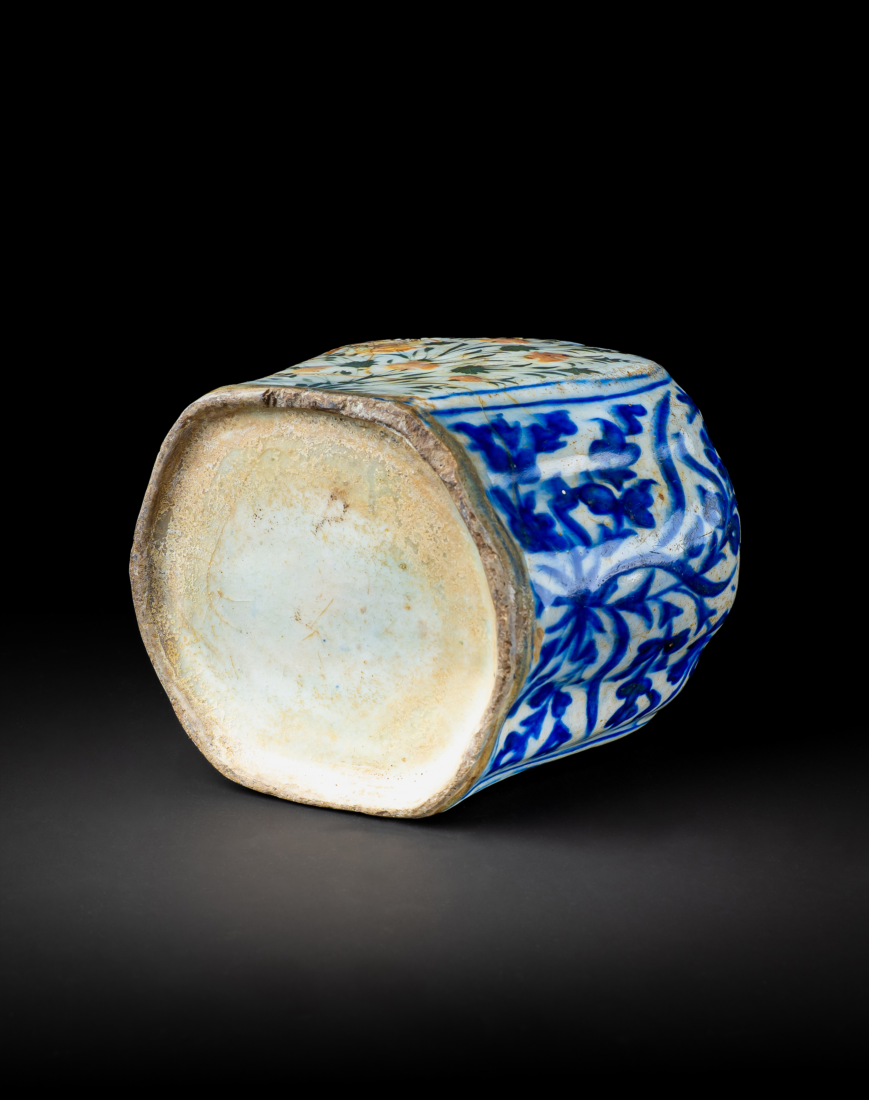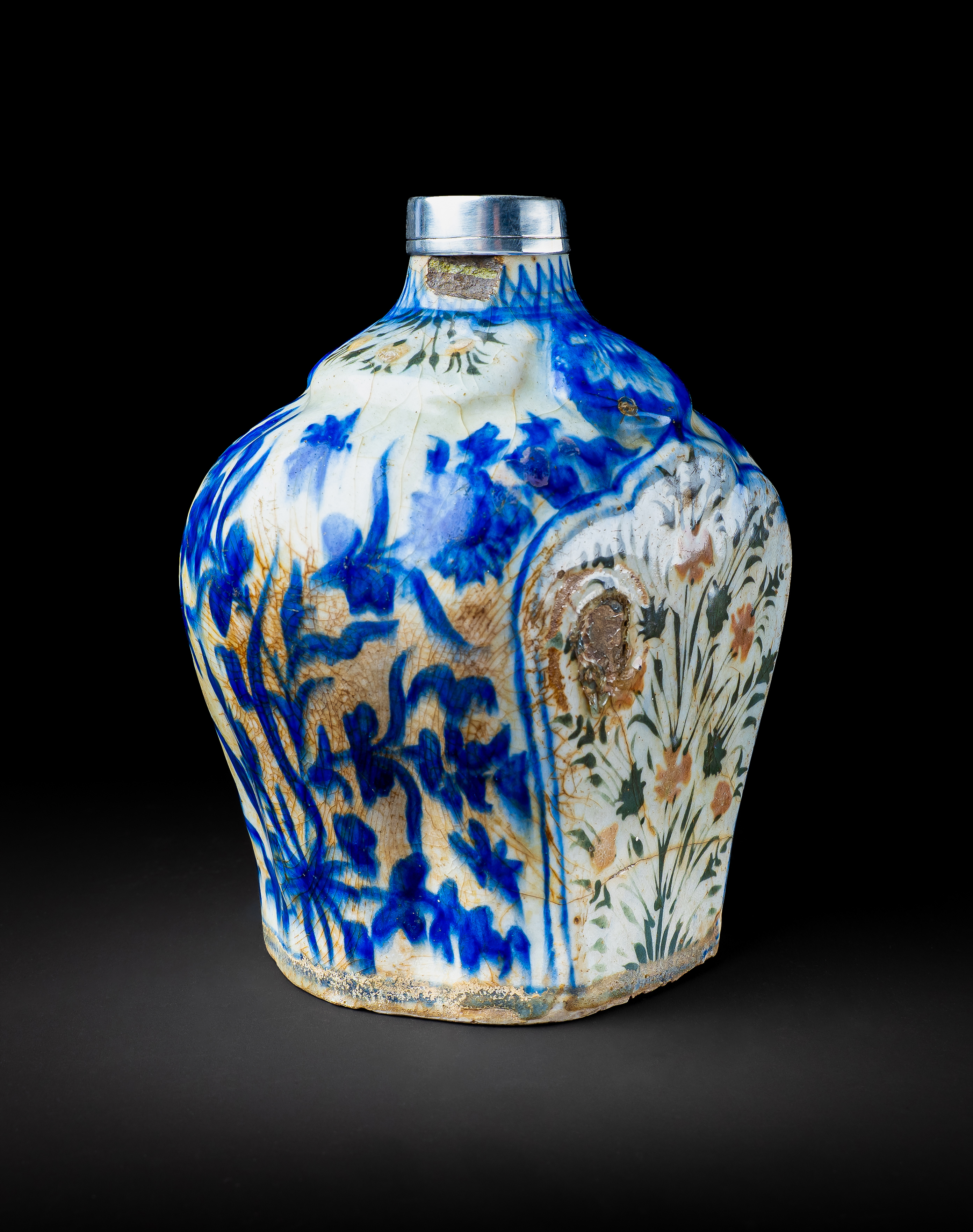 Of compressed globular form with a short cylindrical neck mounted with a later silver collar, the body is painted in underglaze cobalt blue, green, and manganese with floral sprays within cusped panels, alternating with bold arabesque designs. The decoration is set against a white ground, producing a vibrant contrast typical of Safavid ceramics from Kirman. The panels display naturalistic flowers in yellow and green, framed by deep cobalt blue foliate scrolls and arabesques.