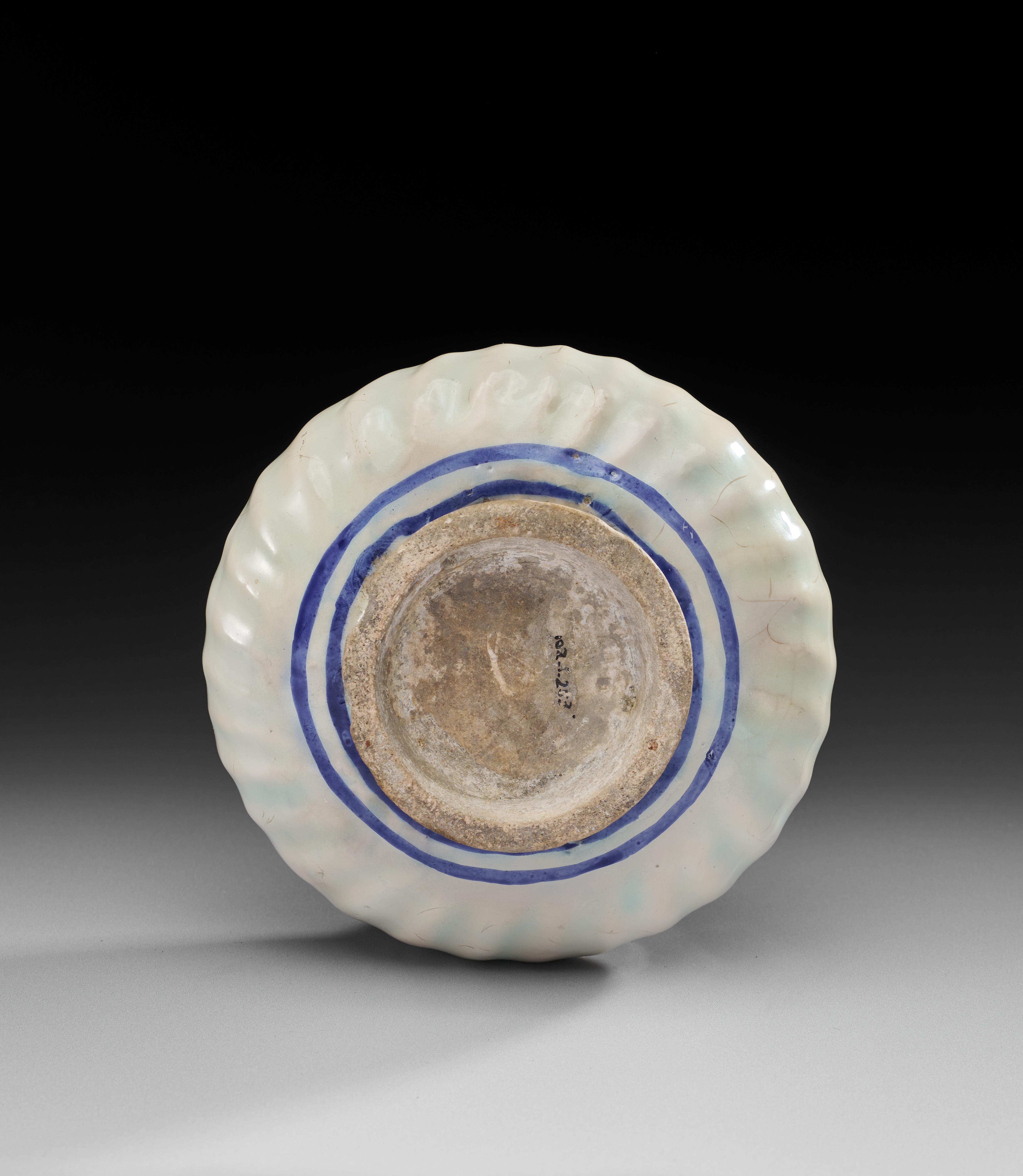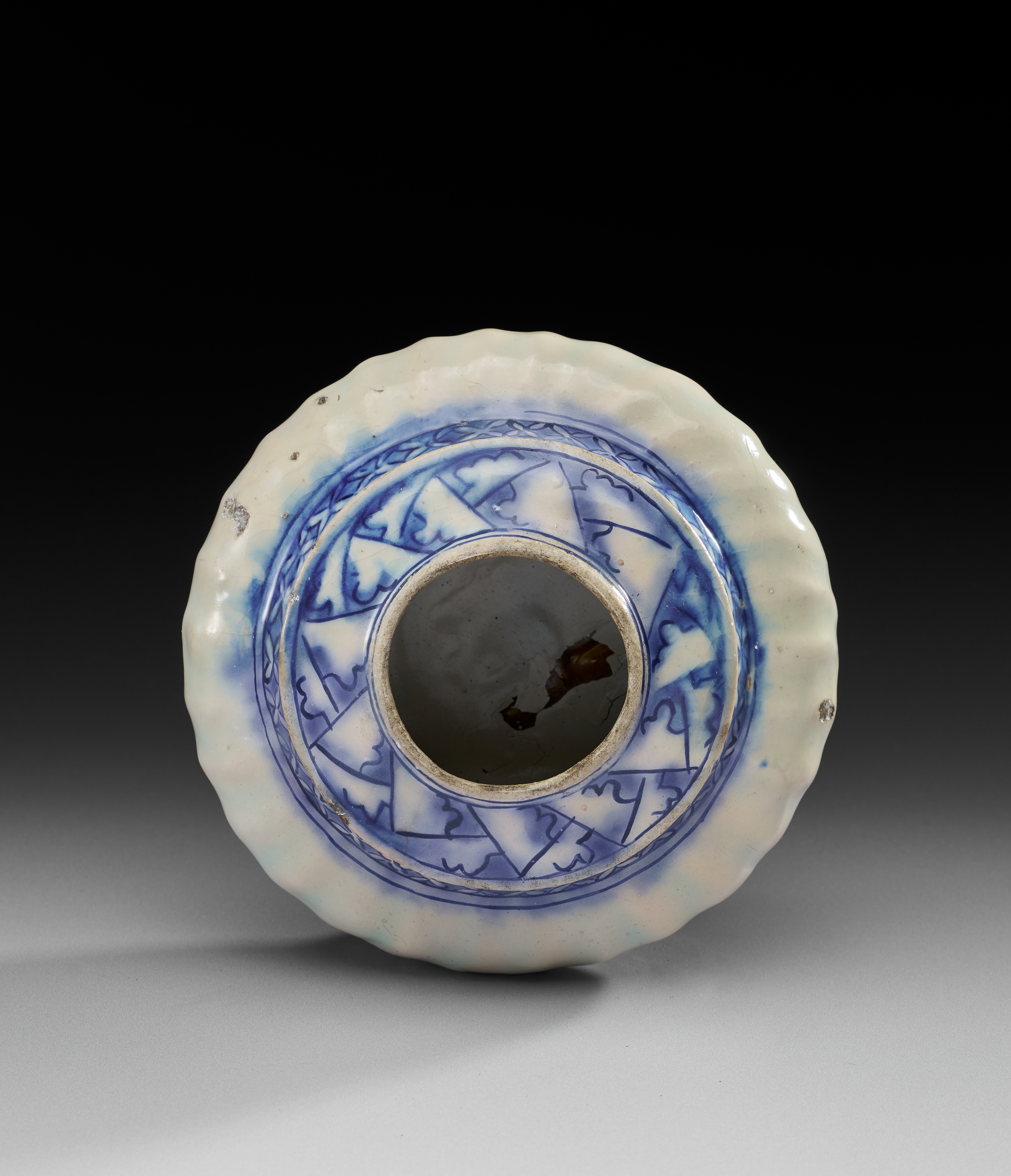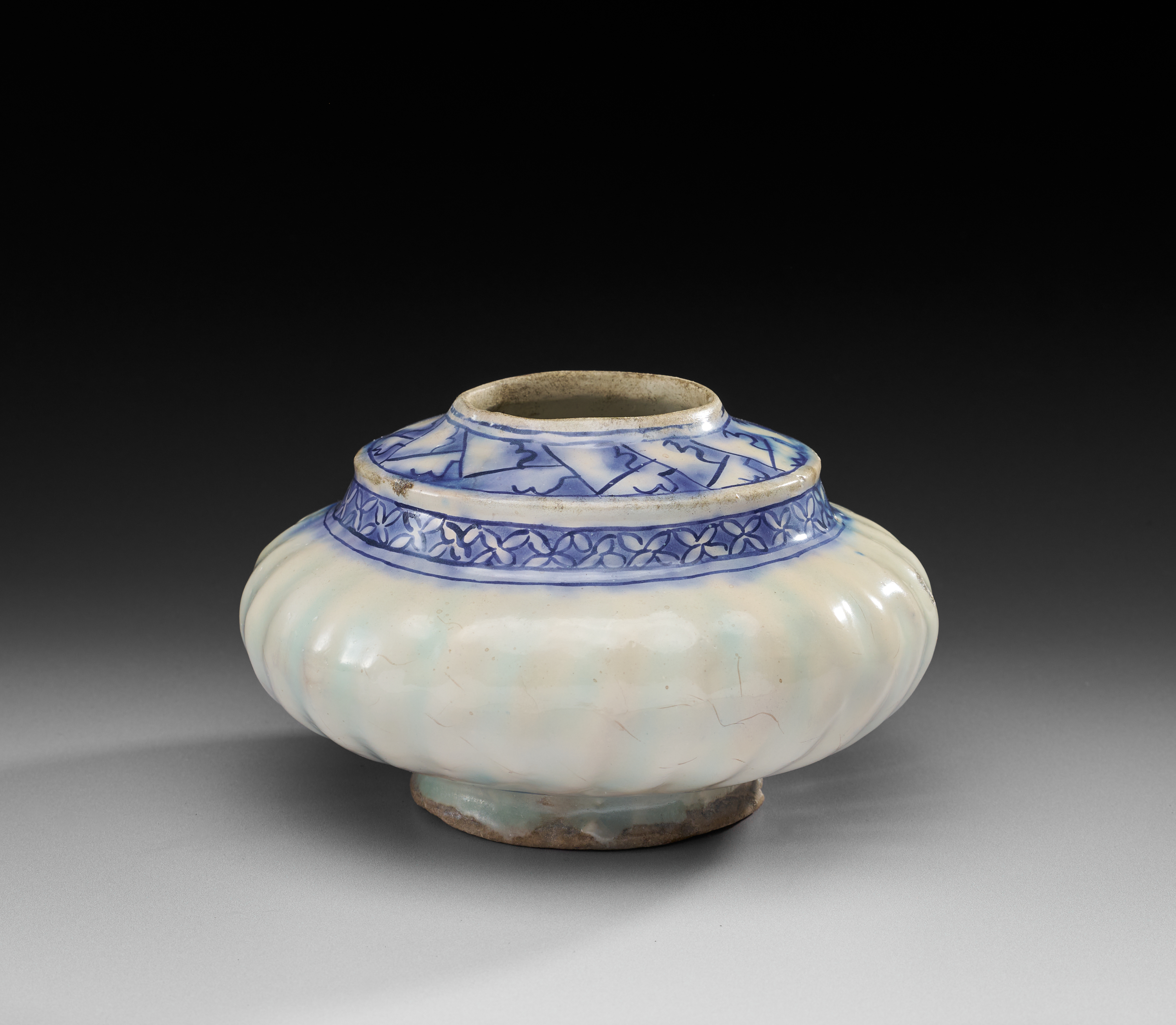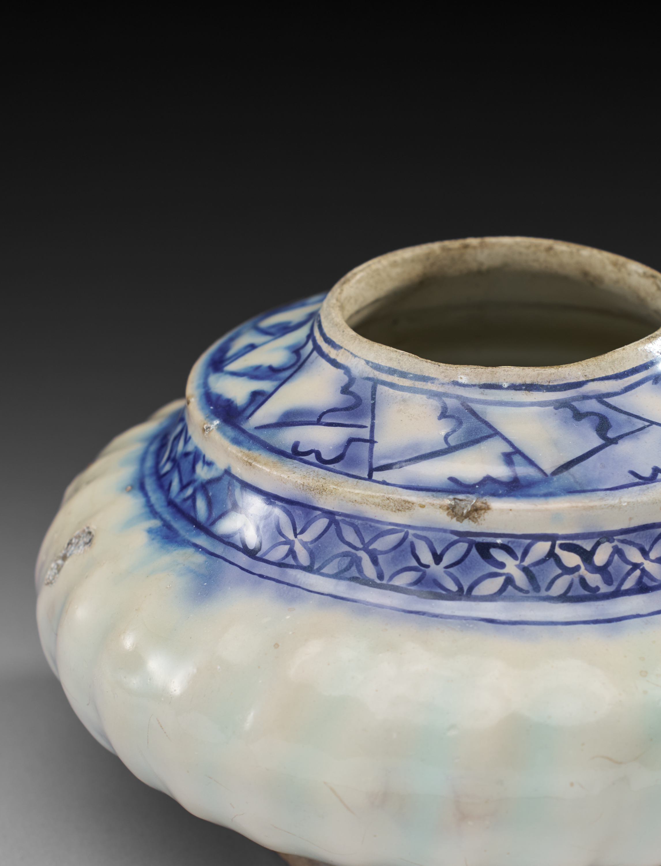 A SAFAVID GLAZED BLUE AND WHITE POTTERY SQUATTED VASE, PERSIA, 17TH CENTURY