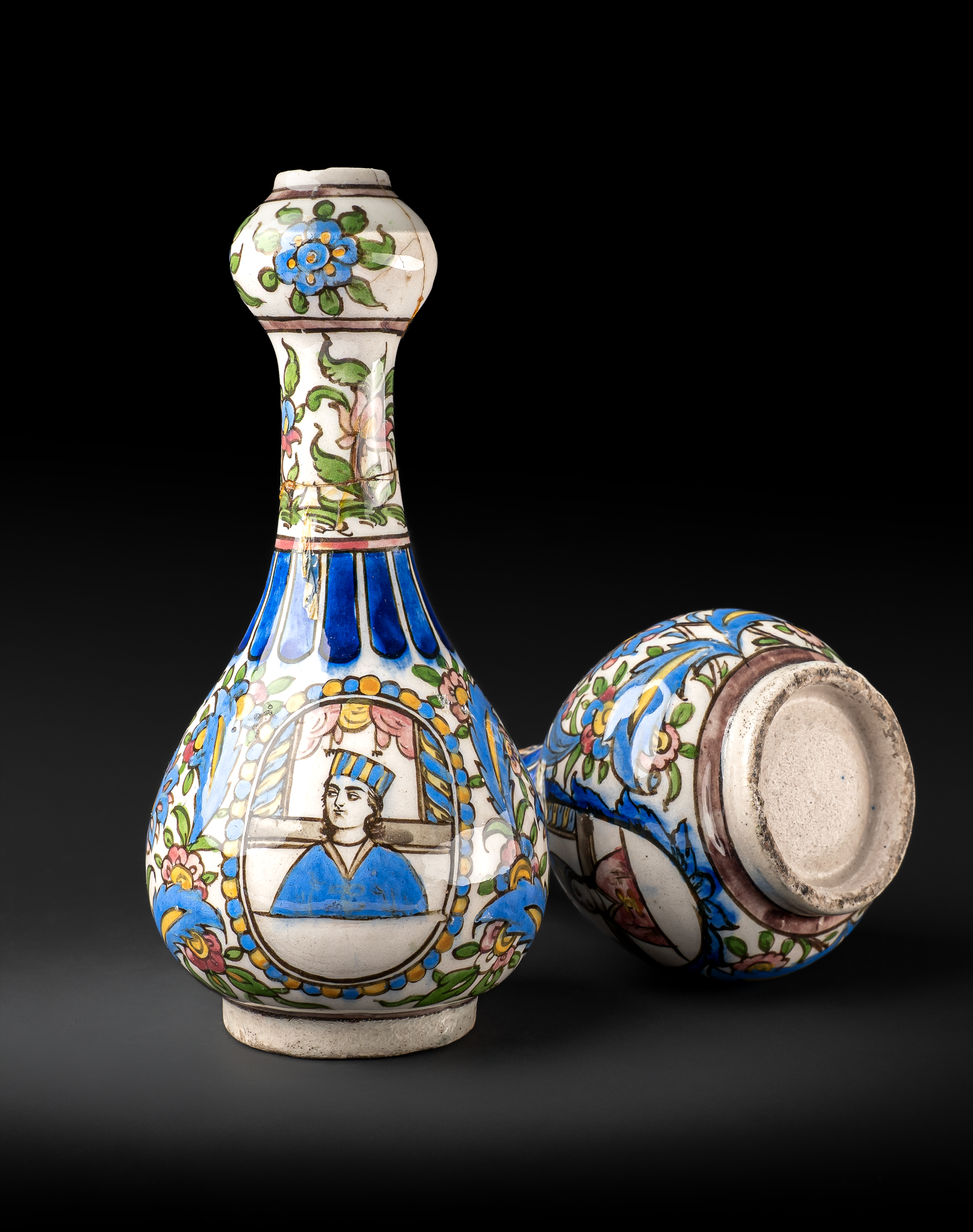 Of baluster form with tapering necks and rounded knops, painted in polychrome enamels beneath a clear glaze. The bodies alternate between oval portrait medallions of courtly figures and panels of floral sprays, framed by bold cobalt-blue scrolls. The necks are decorated with blossoms and foliage. Typical of Tehran production in the Qajar period.