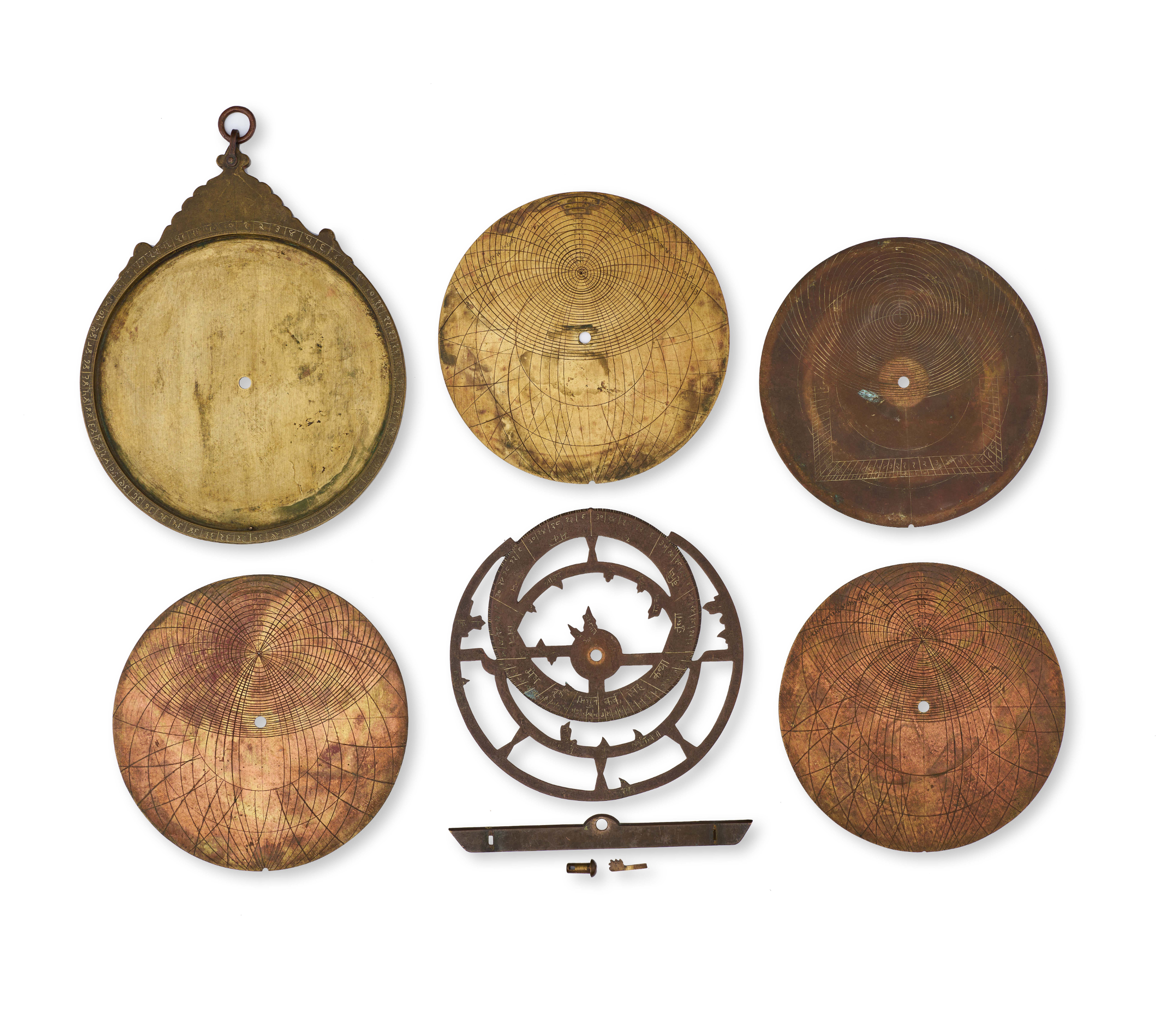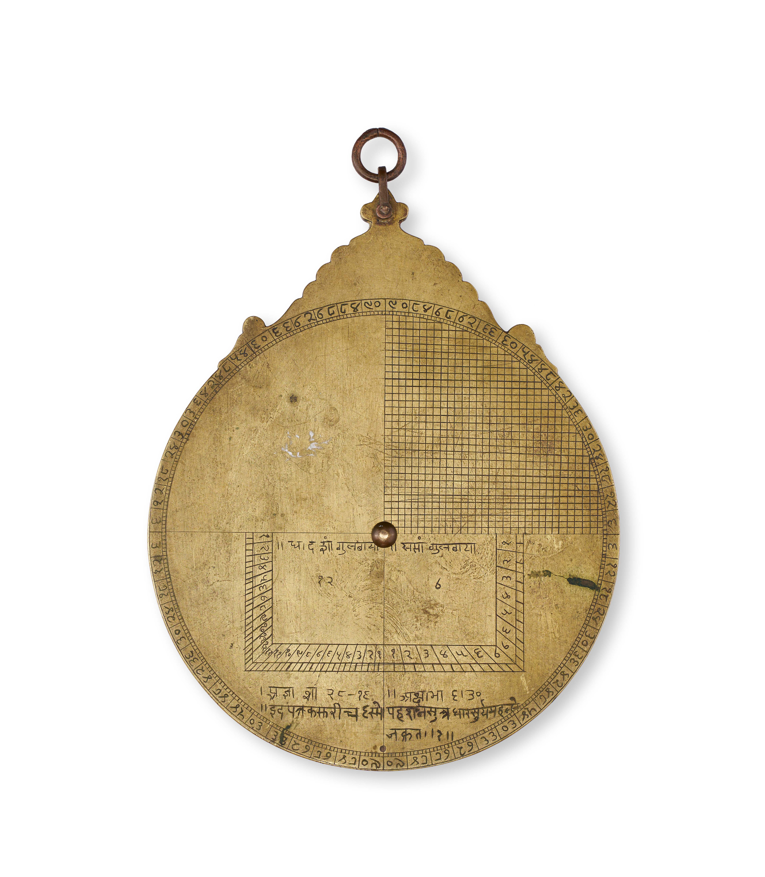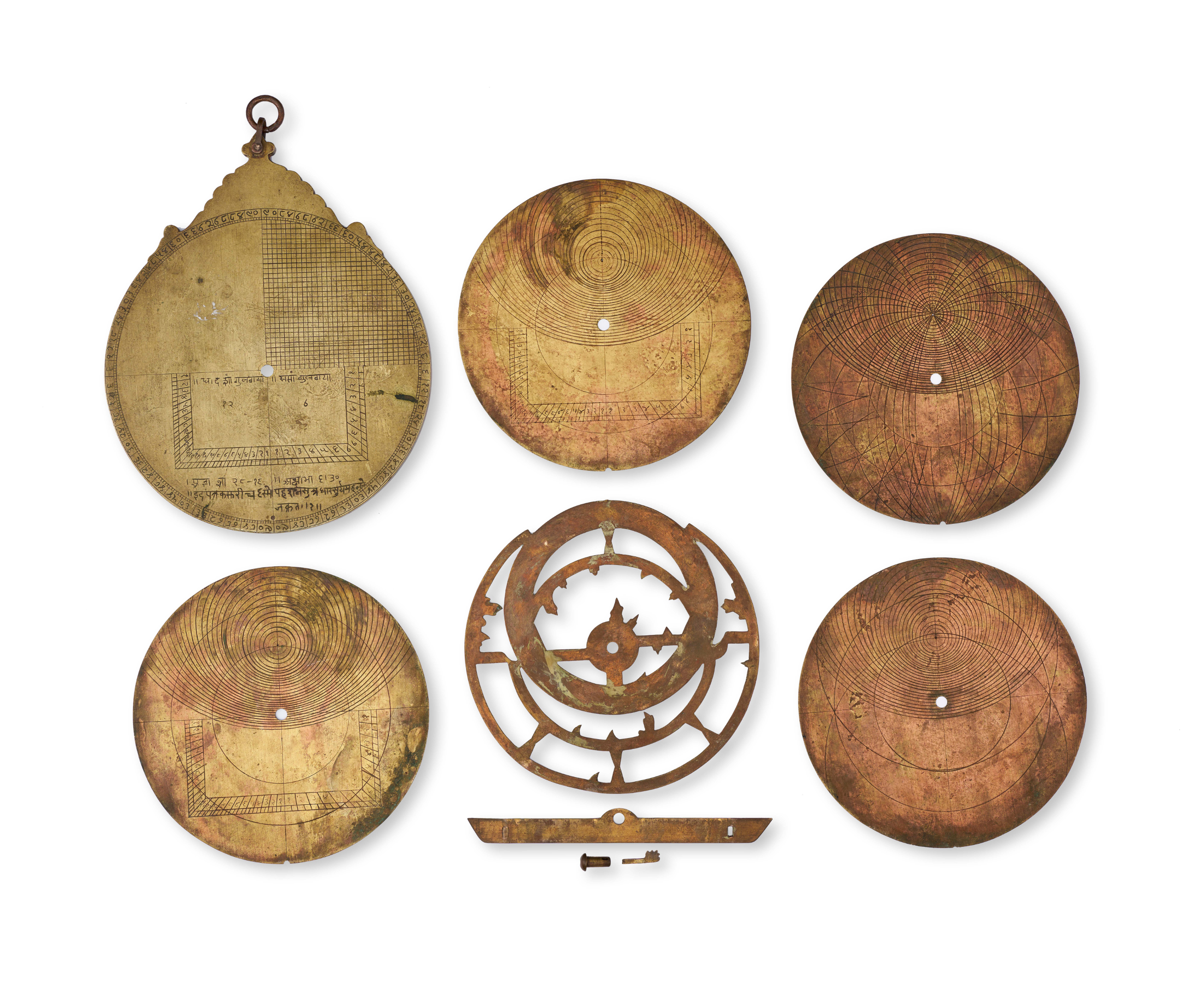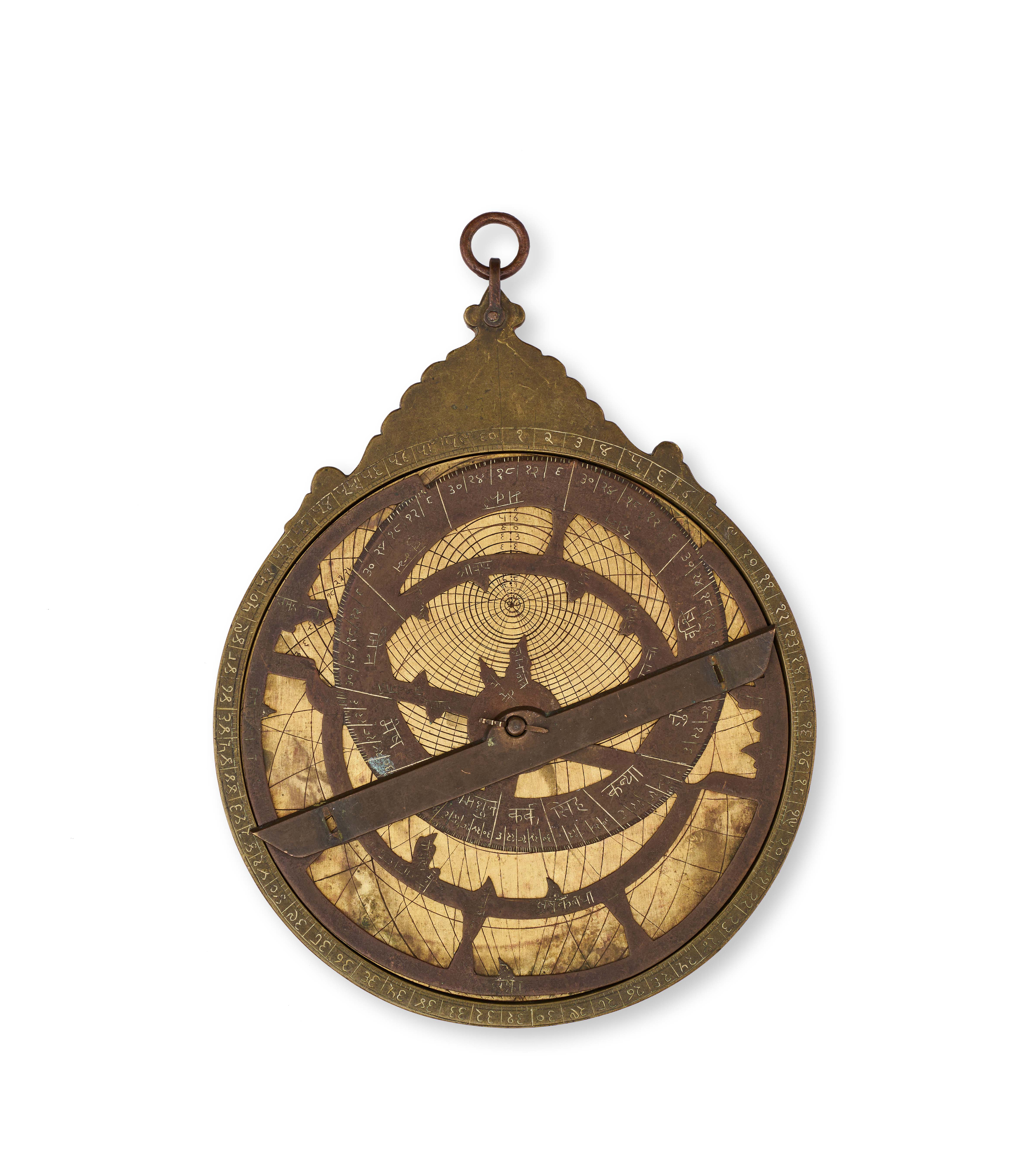A finely engraved with concentric astronomical scales and inscriptions in Devanagari script. The instrument comprises a mater with ornate throne and suspension ring, several engraved tympans for different latitudes, a delicately cut rete with star pointers, and a rule and alidade. The reverse bears further grids, inscriptions, and numerals, including yantra-like diagrams, illustrating the blending of Islamic scientific tradition with Hindu astronomical practice in South India.