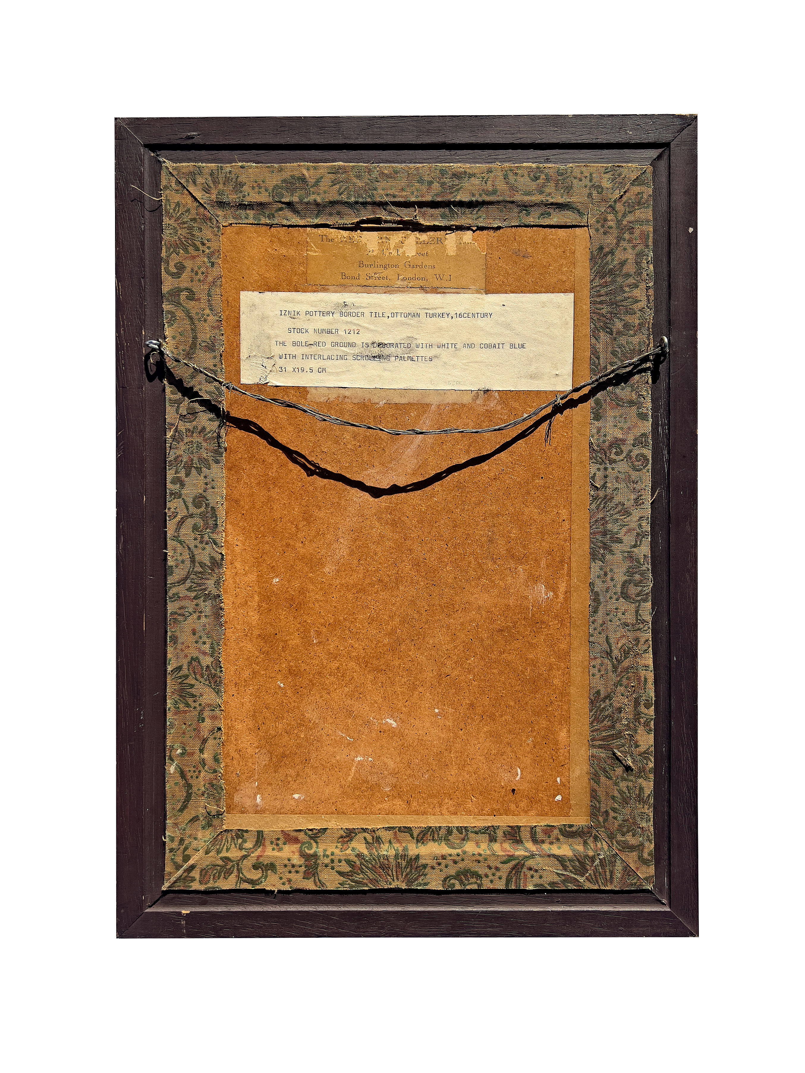 Finely decorated in the characteristic palette of bole-red, cobalt blue, and white. The tile features an interlacing pattern of scrolling palmettes, a hallmark of Ottoman ceramic design, set against a deep orange/red ground that provides striking contrast to the delicate floral and arabesque forms. The glaze retains a glossy finish, enhancing the vibrancy of the colours. The piece is presented within a later dark wooden frame. The reverse of the frame bears an old gallery label, identifying it as an Iznik pottery border tile, Ottoman Turkey, 16th century, with the stock number 1212. The label further describes the decoration: “The bole-red ground is decorated with white and cobalt blue with interlacing scrolling palmettes.” The dimensions are recorded as 31 x 19.5 cm.