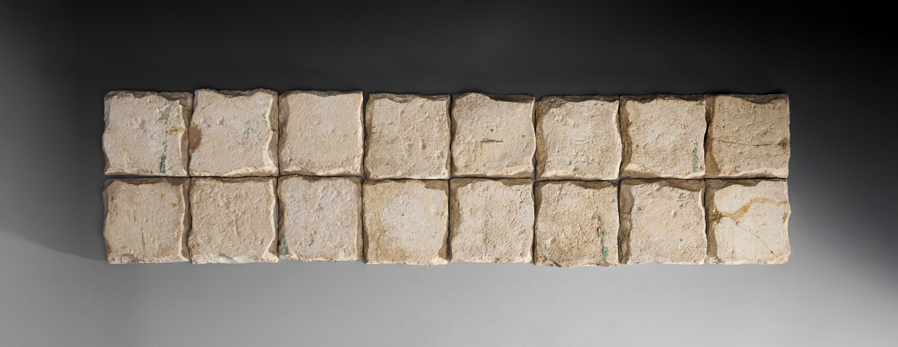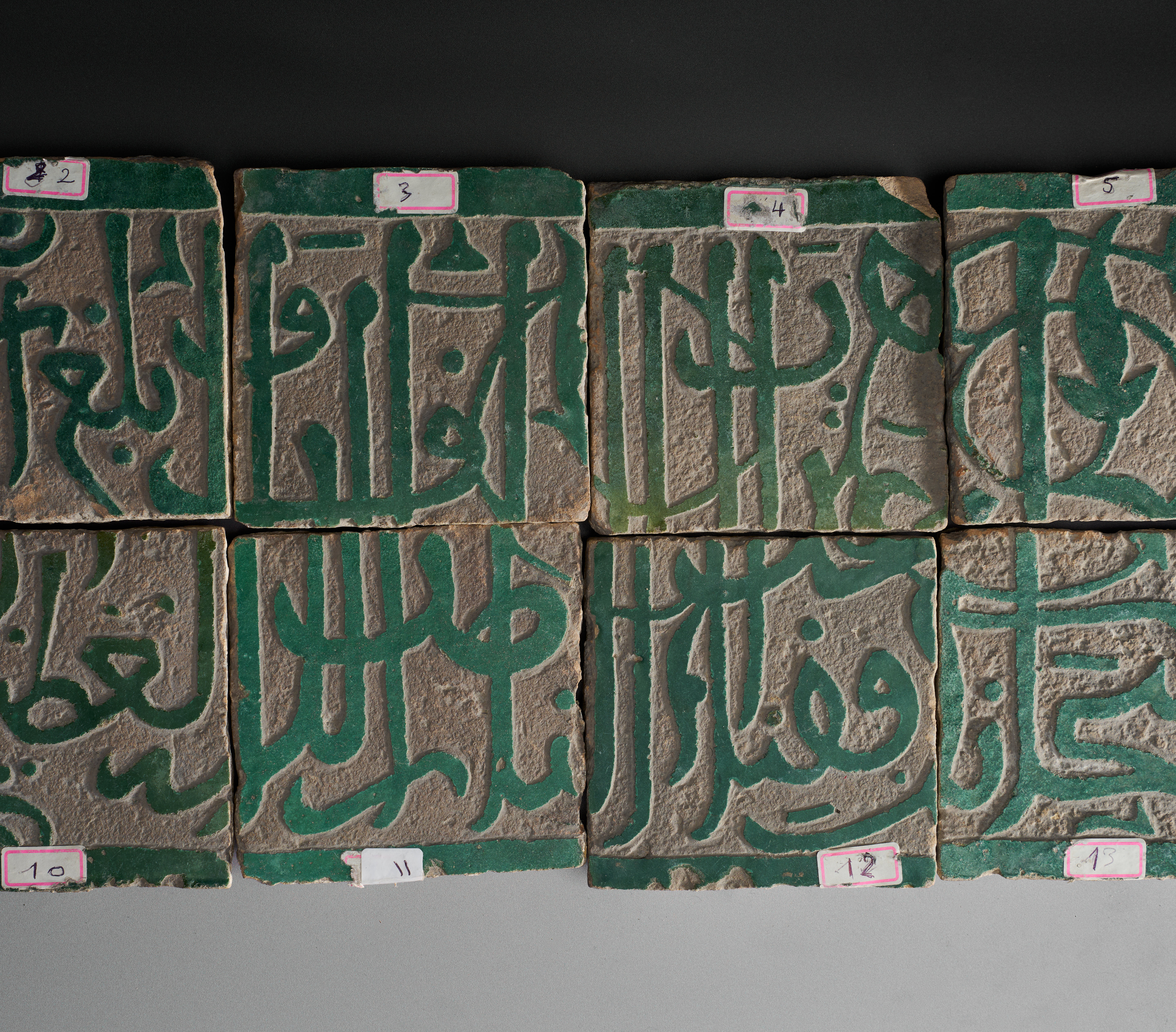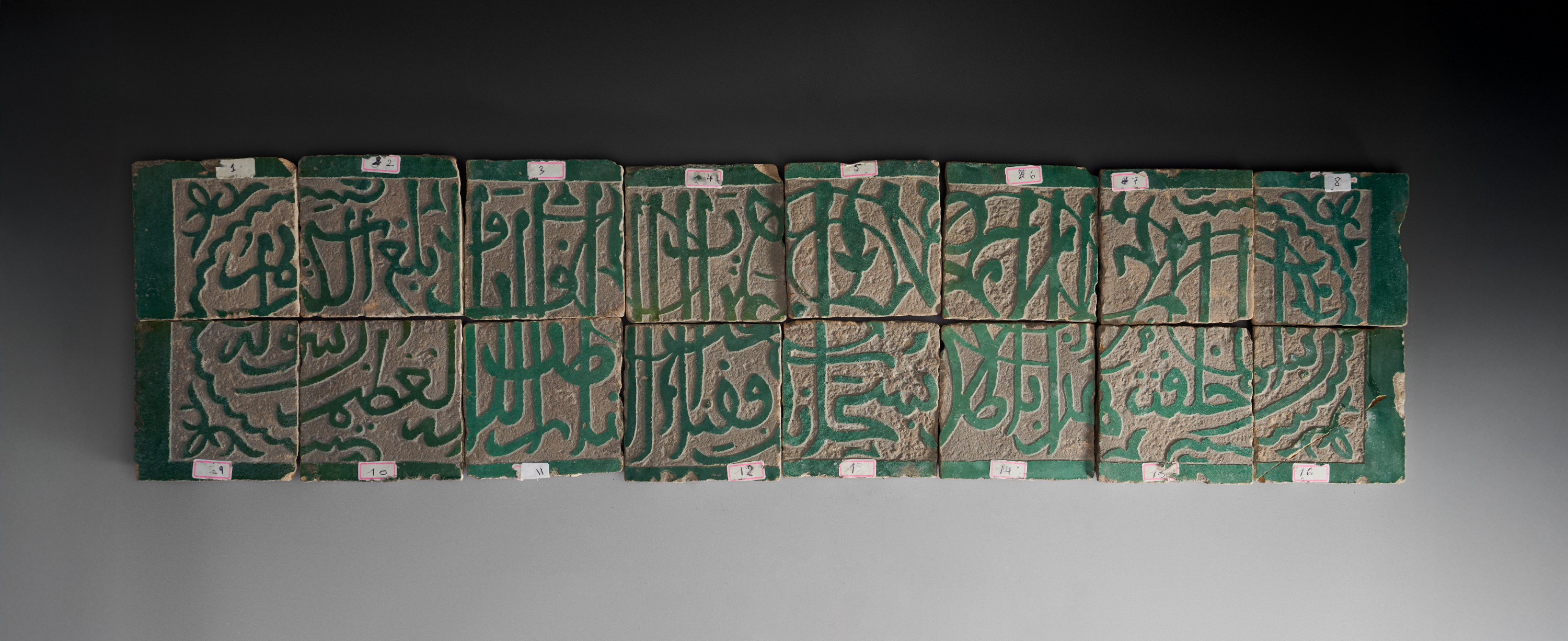 Composed of sixteen square tiles forming a continuous frieze, the panel is decorated in bold relief with flowing Arabic calligraphy in thuluth script, set against a green-glazed ground. The inscription, executed in raised slip and covered in a pale cream glaze, is interlaced with vegetal flourishes, creating a rhythmic interplay of text and ornament. The reverse of the tiles is plain, with traces of kiln firing.