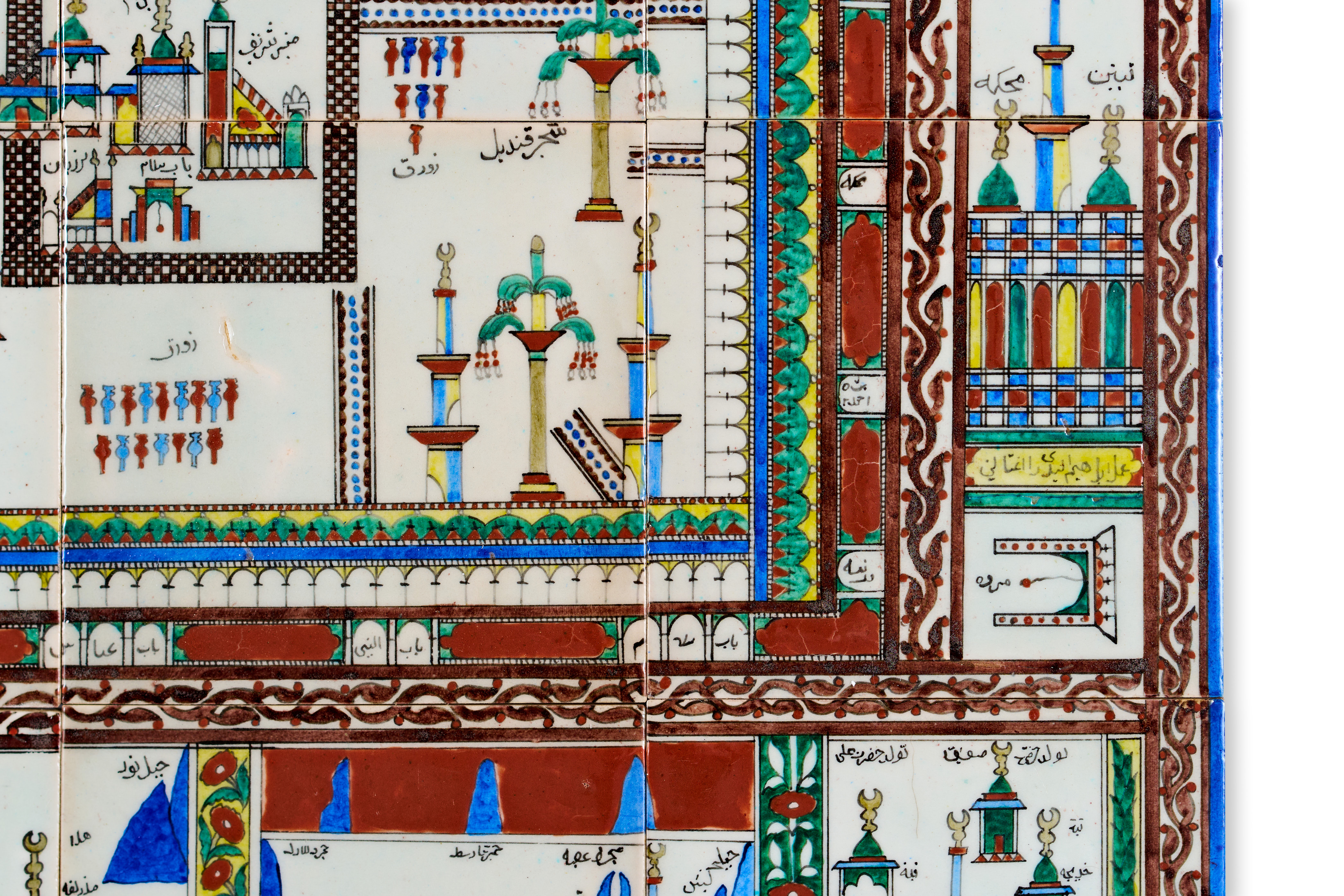 An impressive and highly decorative Kutahya pottery tile panel, composed of 24 individually painted tiles, vividly illustrating the holy cities of Mecca and Medina. The panel features a detailed schematic view of the Masjid al-Haram with the Ka‘bah at its centre, and the Prophet’s Mosque in Medina topped by the iconic green dome. Surrounding the central scenes are finely rendered architectural elements, minarets, mountains, trees, and Qur’anic inscriptions, all executed in vibrant glazes of cobalt, turquoise, green, and sienna over a white ground.