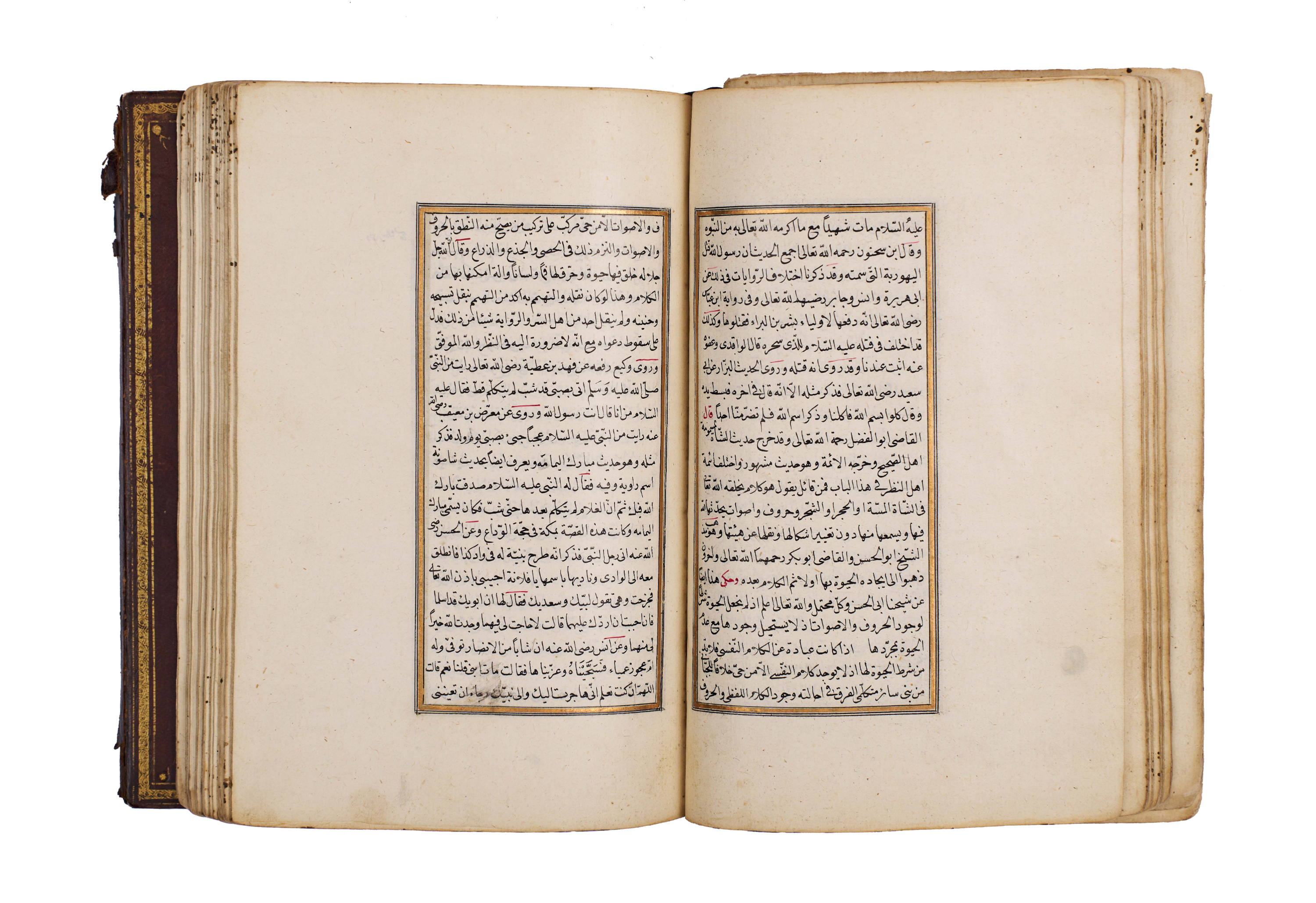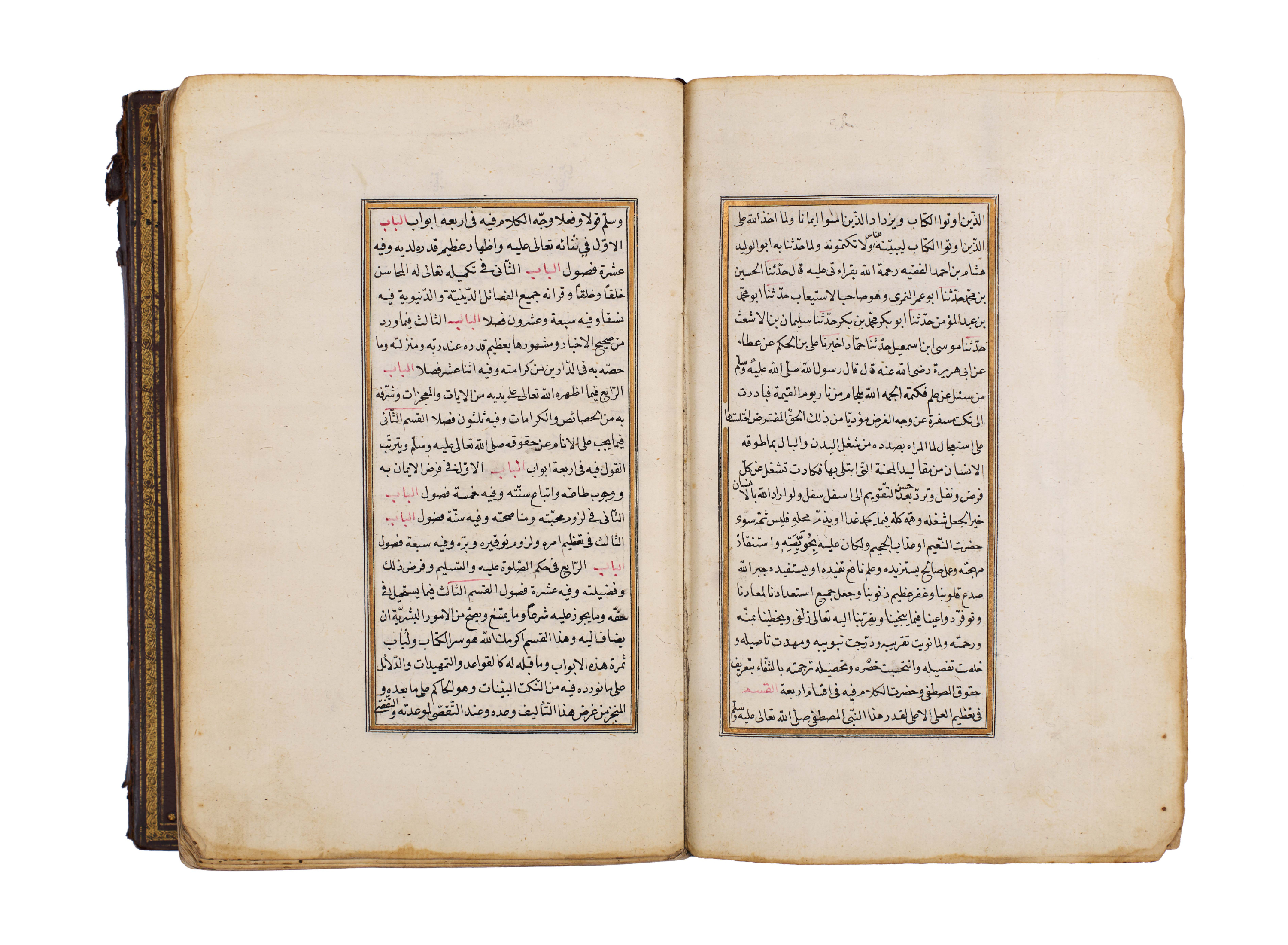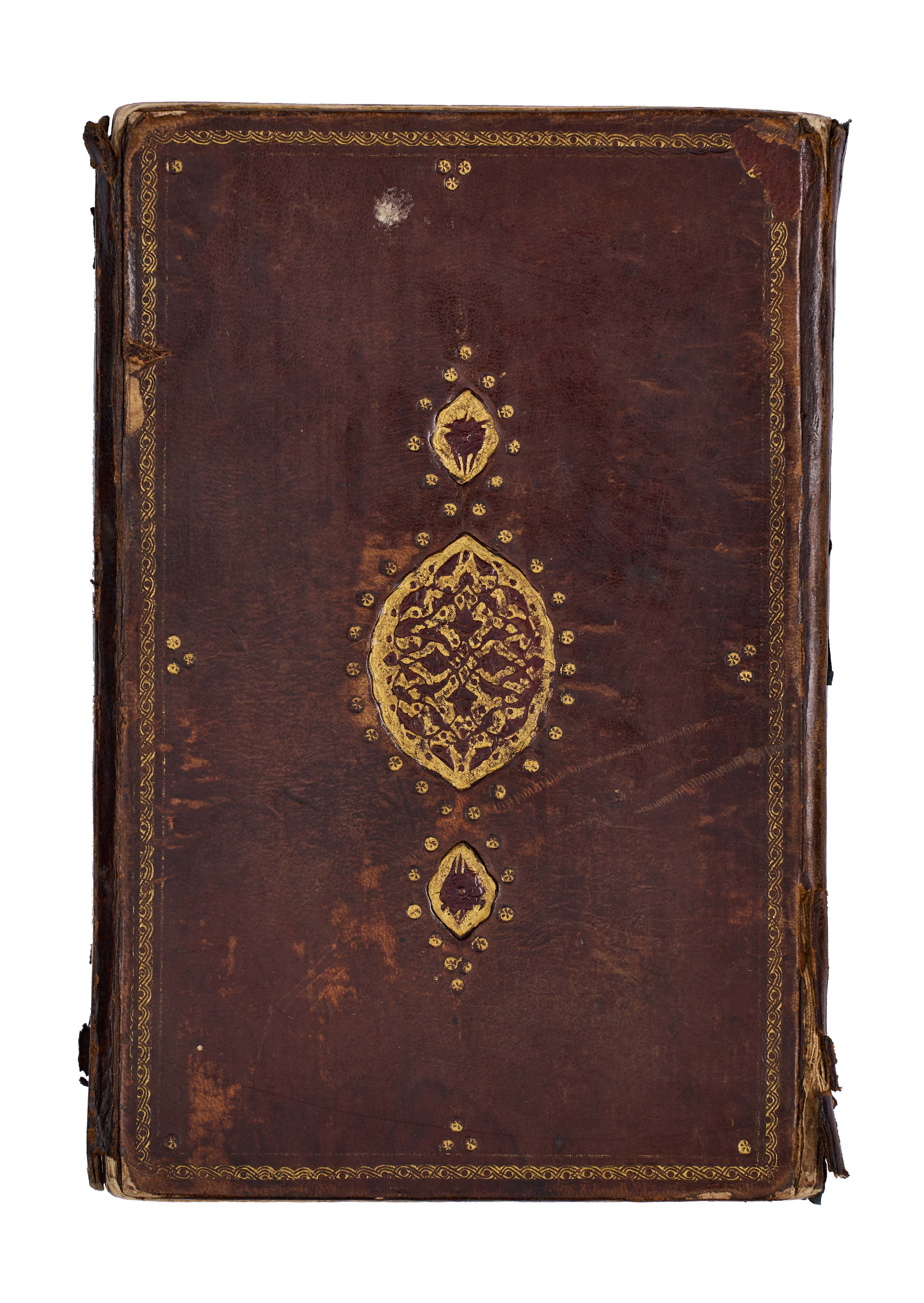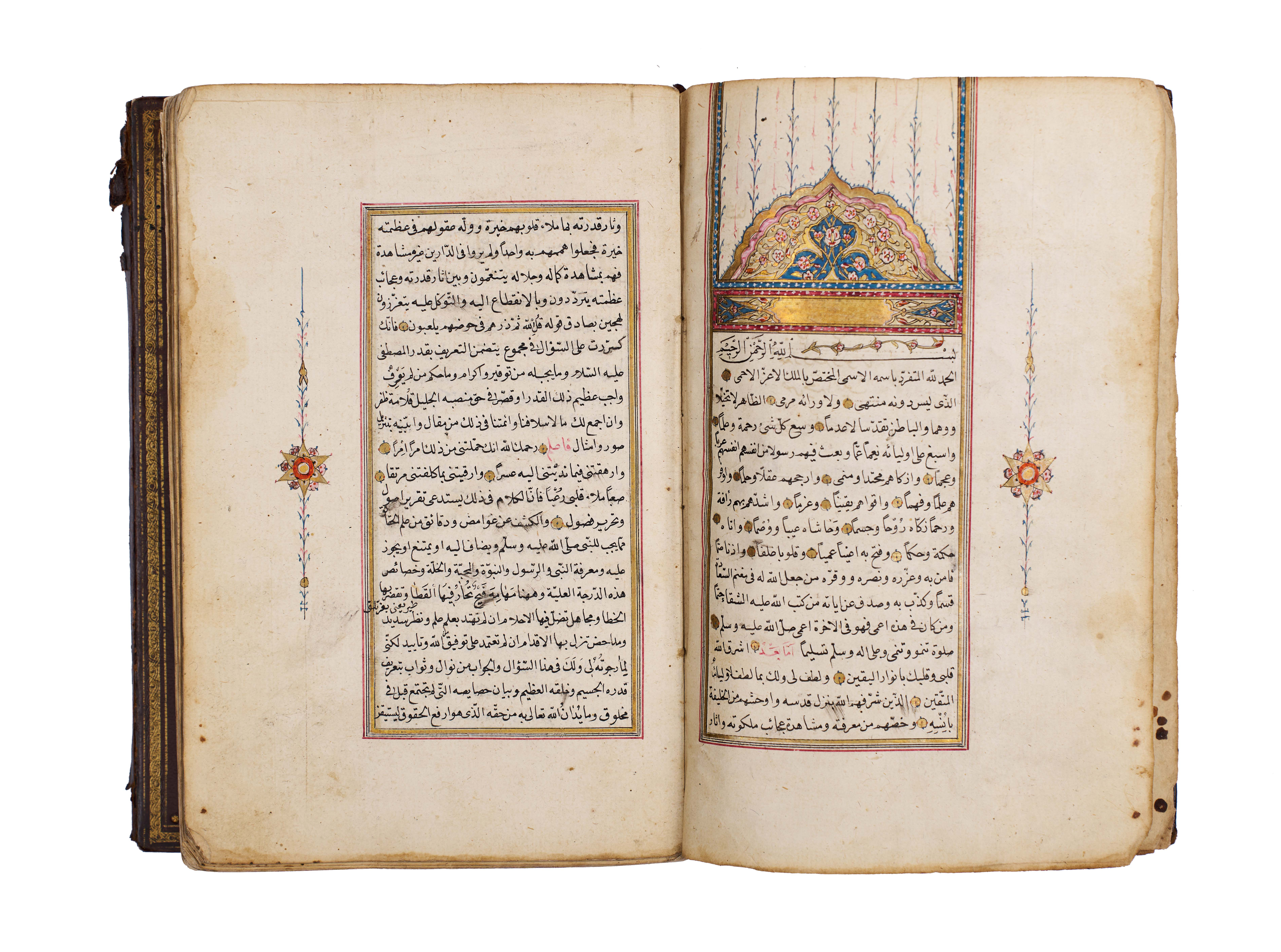 The manuscript is elegantly written in clear naskh script, with rubricated headings in red, gold illumination at the opening, and floral marginal ornaments, bound in a traditional leather cover with central medallion and gilt tooling.