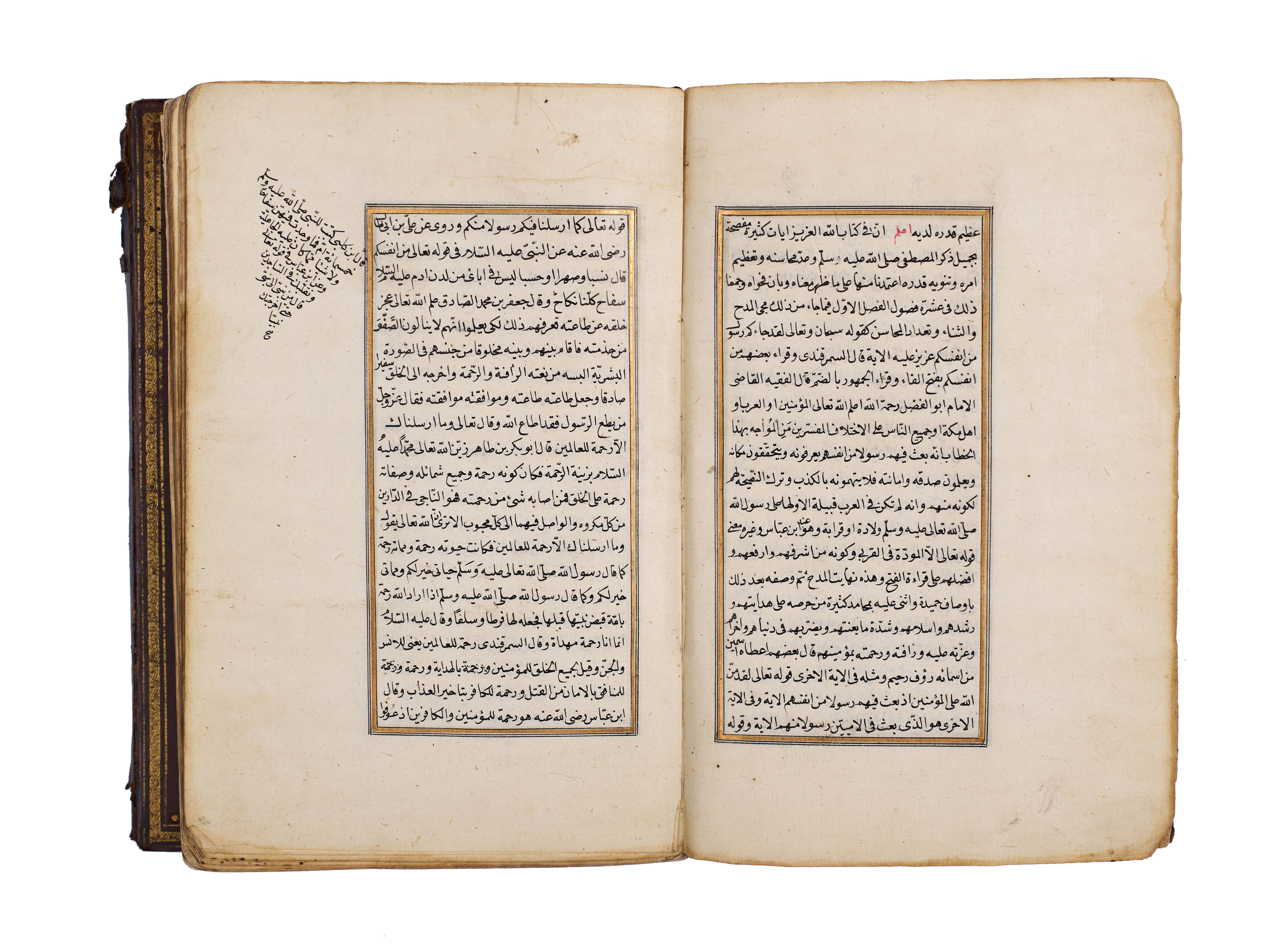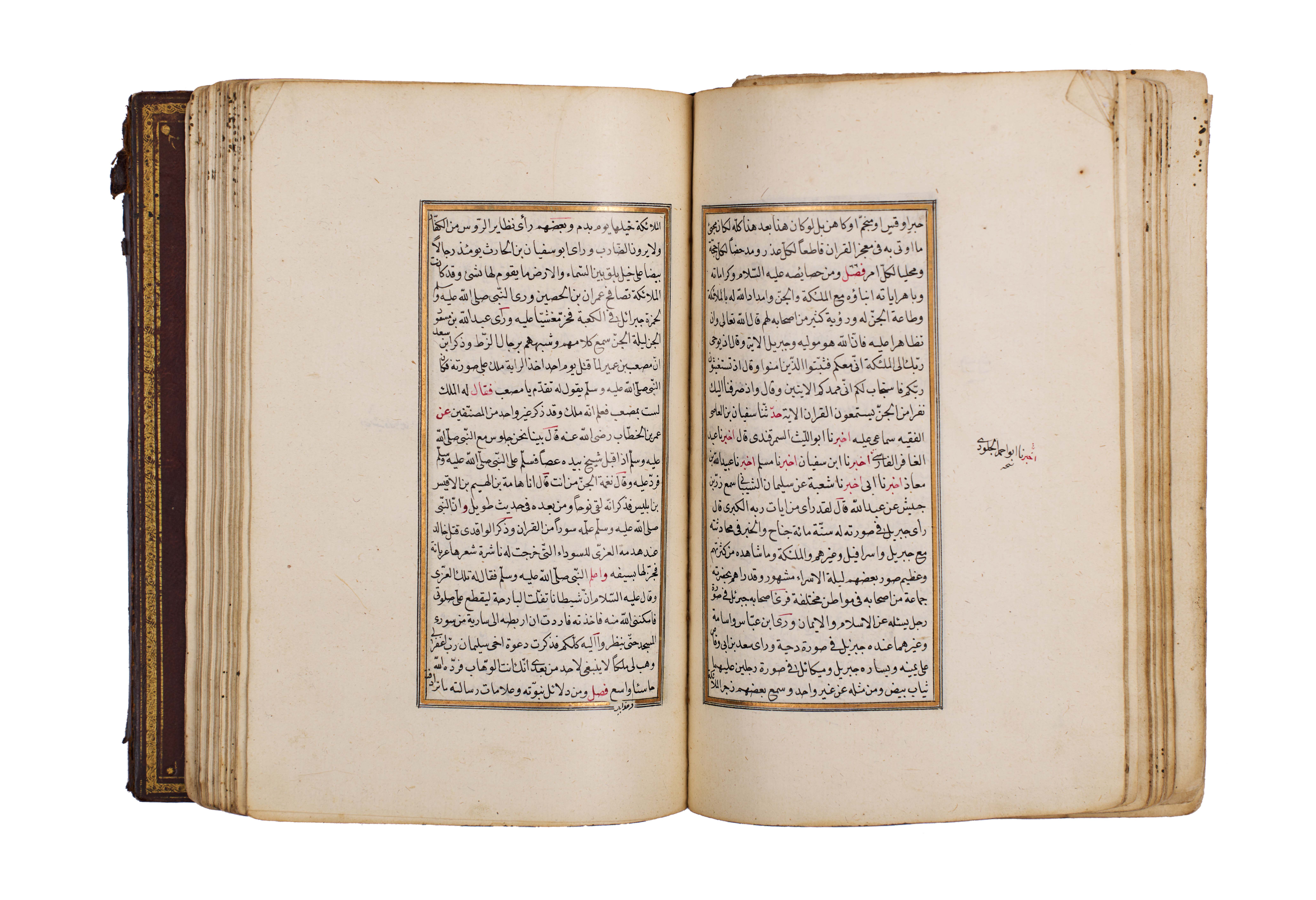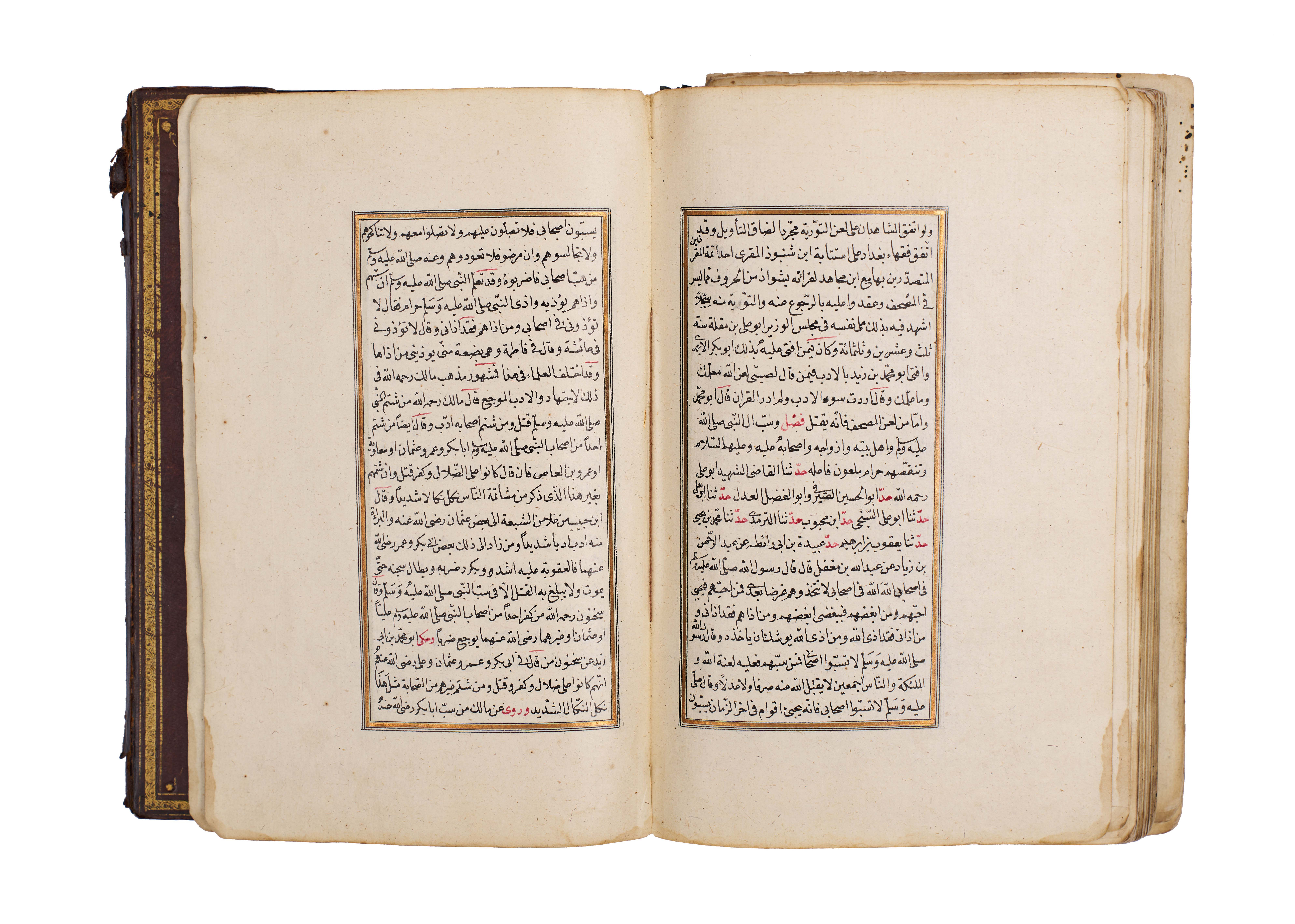 The manuscript is elegantly written in clear naskh script, with rubricated headings in red, gold illumination at the opening, and floral marginal ornaments, bound in a traditional leather cover with central medallion and gilt tooling.