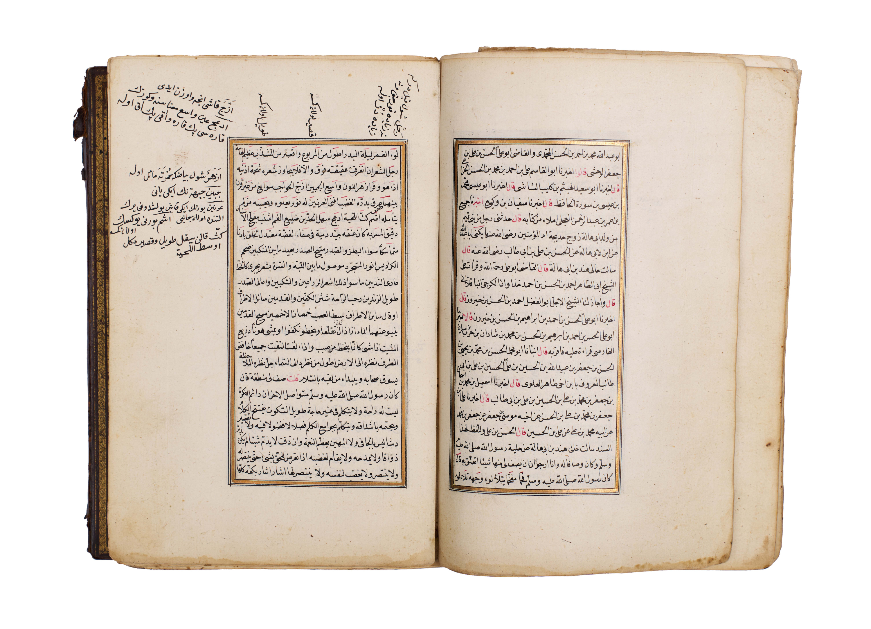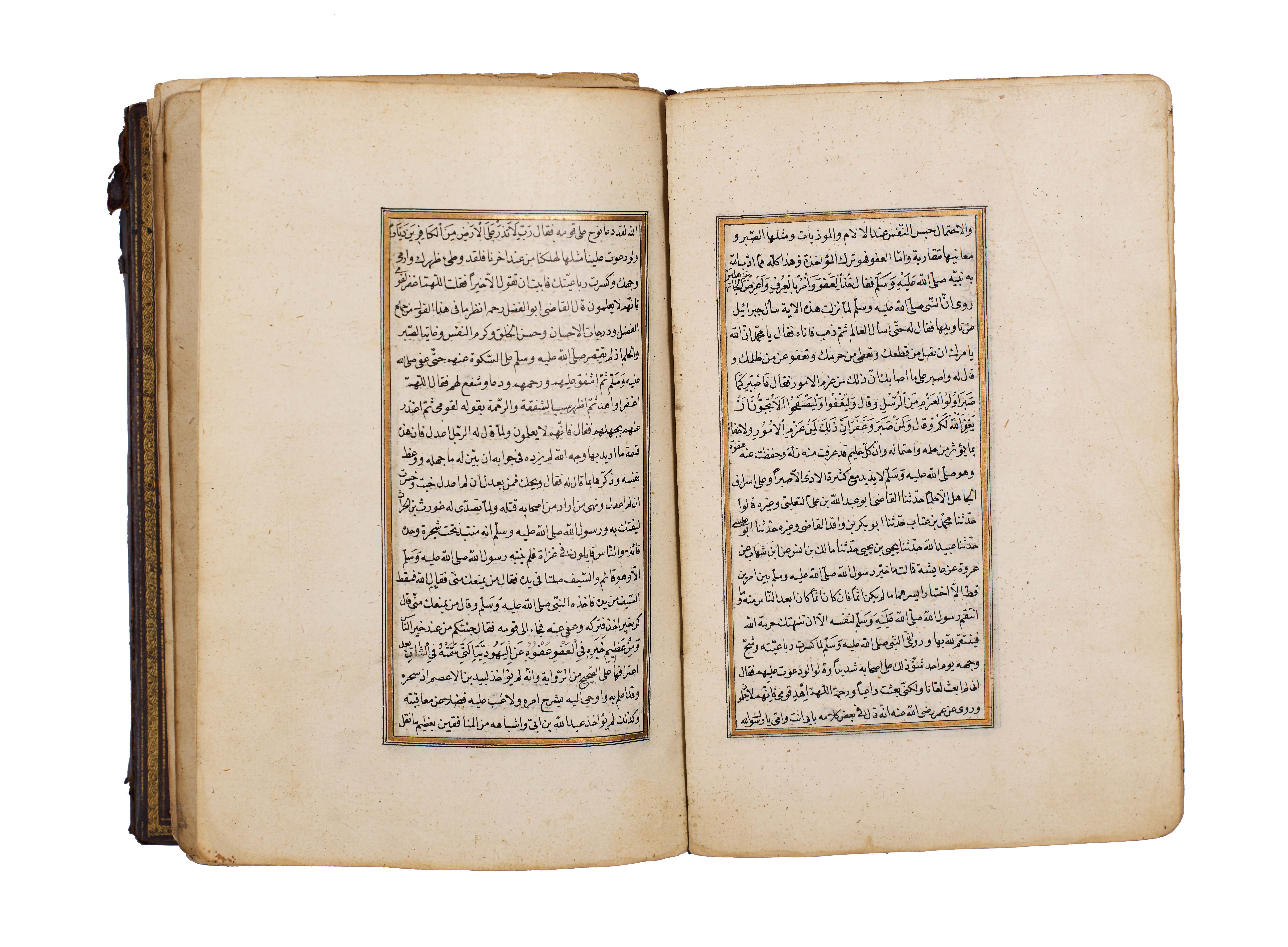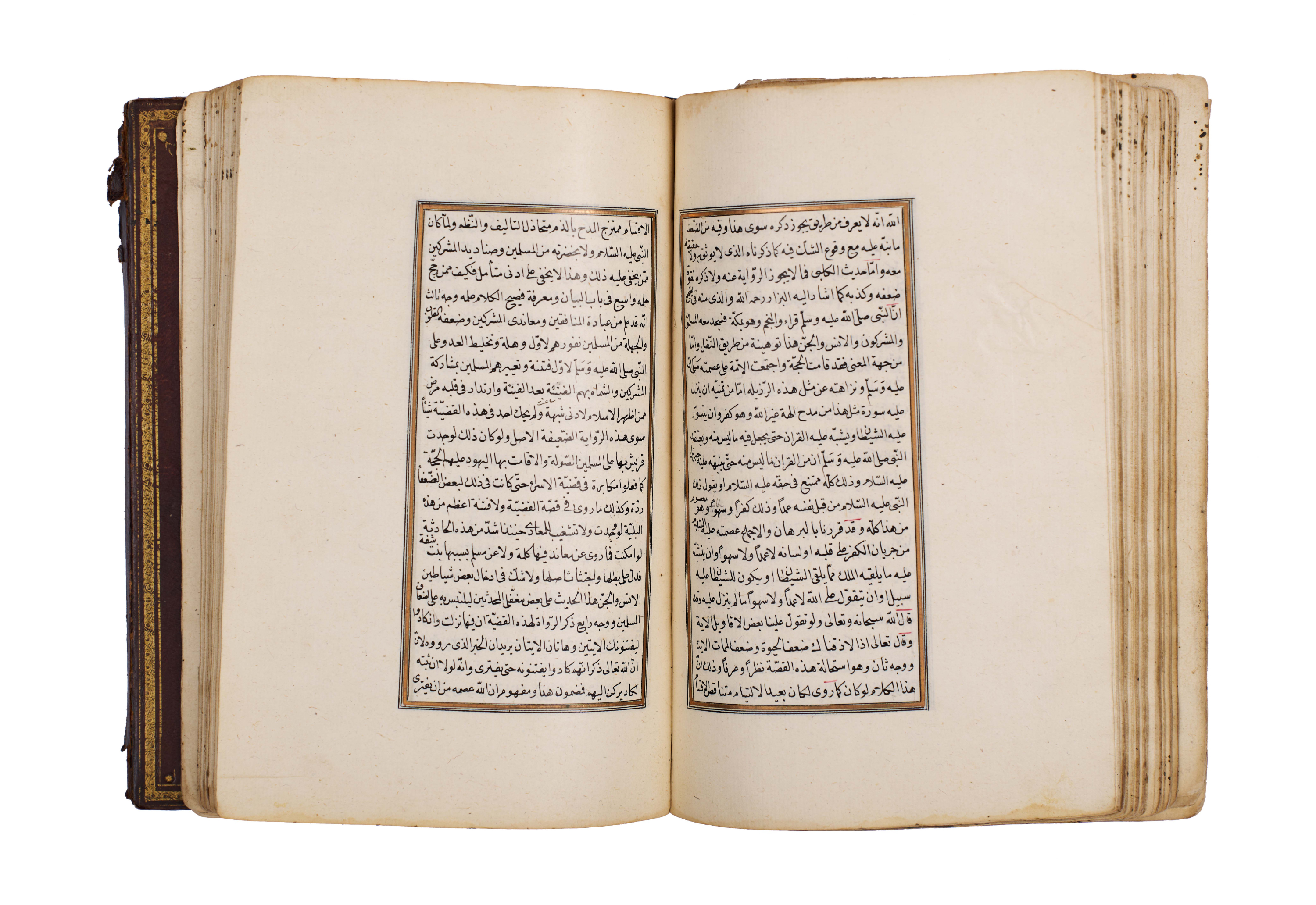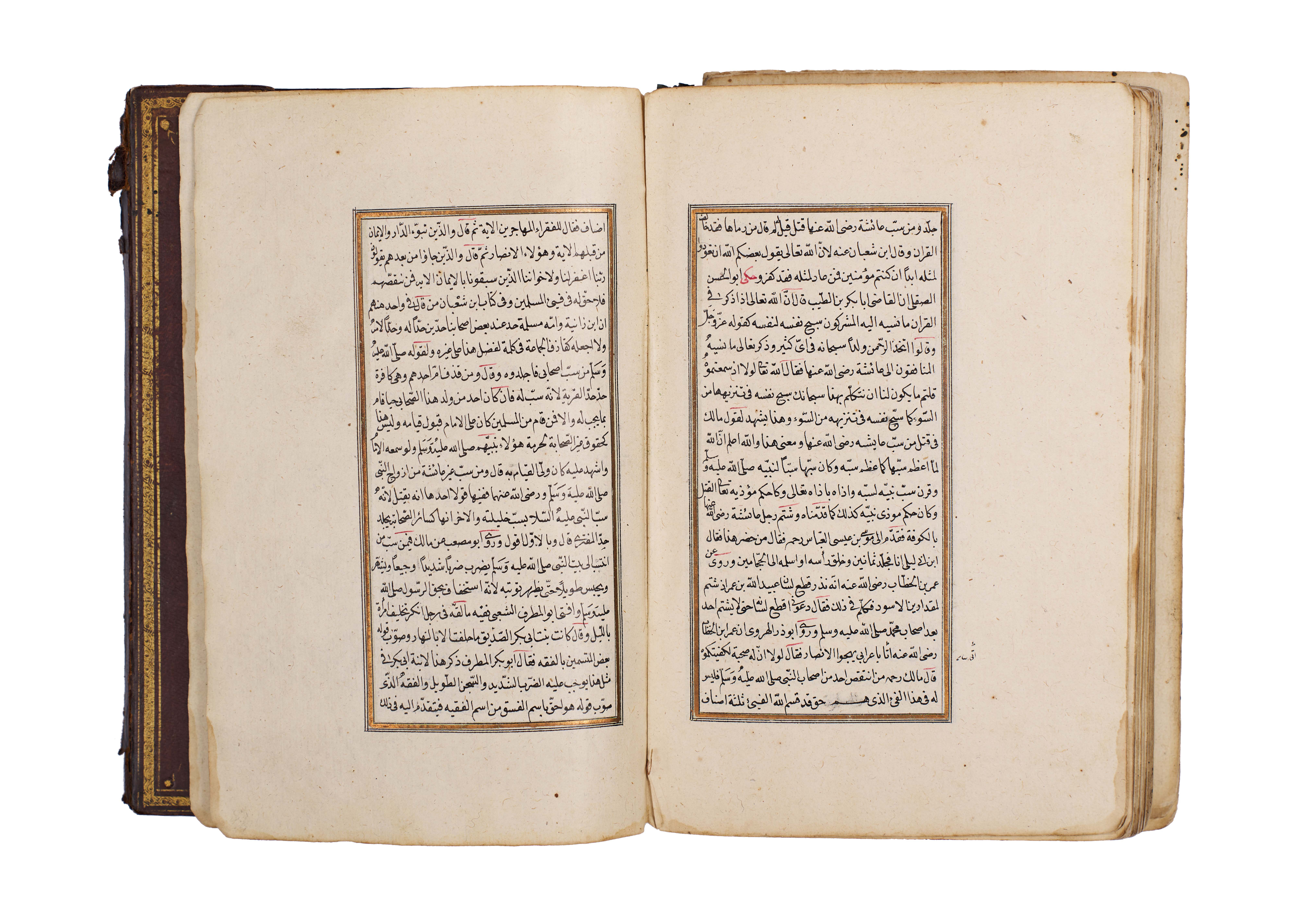 The manuscript is elegantly written in clear naskh script, with rubricated headings in red, gold illumination at the opening, and floral marginal ornaments, bound in a traditional leather cover with central medallion and gilt tooling.