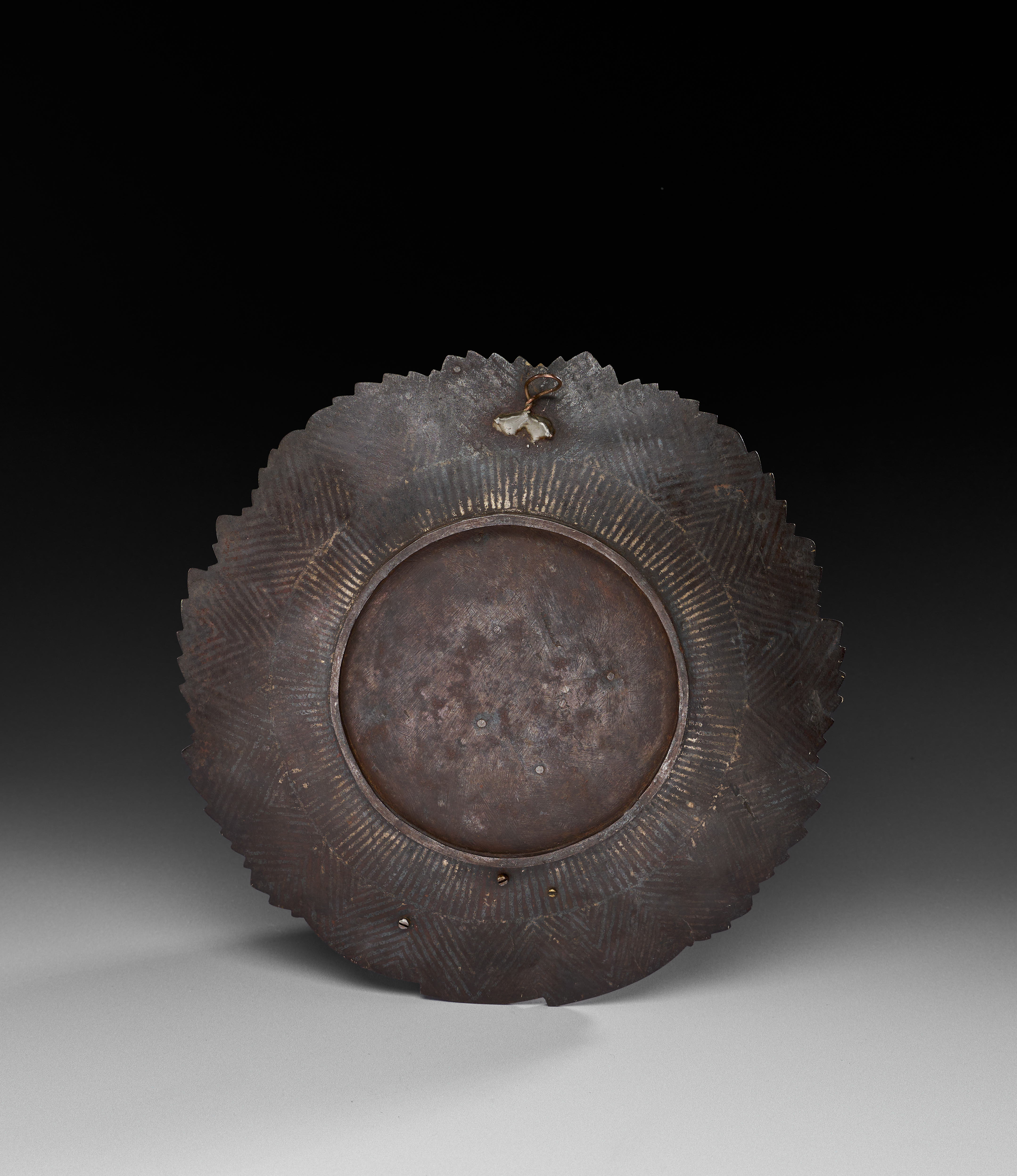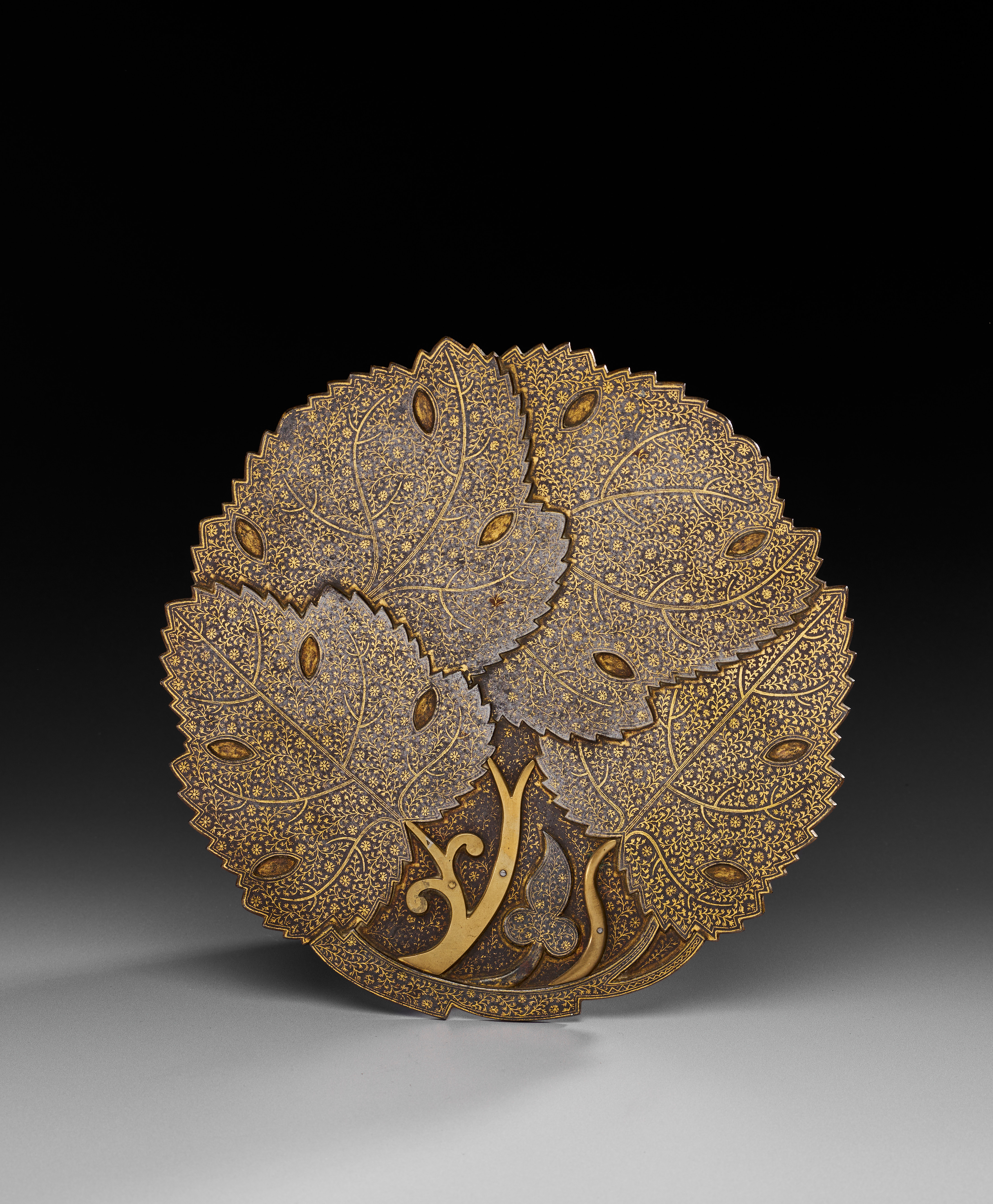 Of lobed form, the plate is meticulously worked in steel and lavishly overlaid with gold koftgari, the surface designed as overlapping leaves radiating from the centre. Each leaf is delineated with serrated edges and prominent veins, the fields densely filled with delicate scrolling floral sprays, interspersed with almond-shaped medallions. The shimmering gilded decoration contrasts with the darkened steel ground, enhancing the intricacy of the foliate arabesques.
