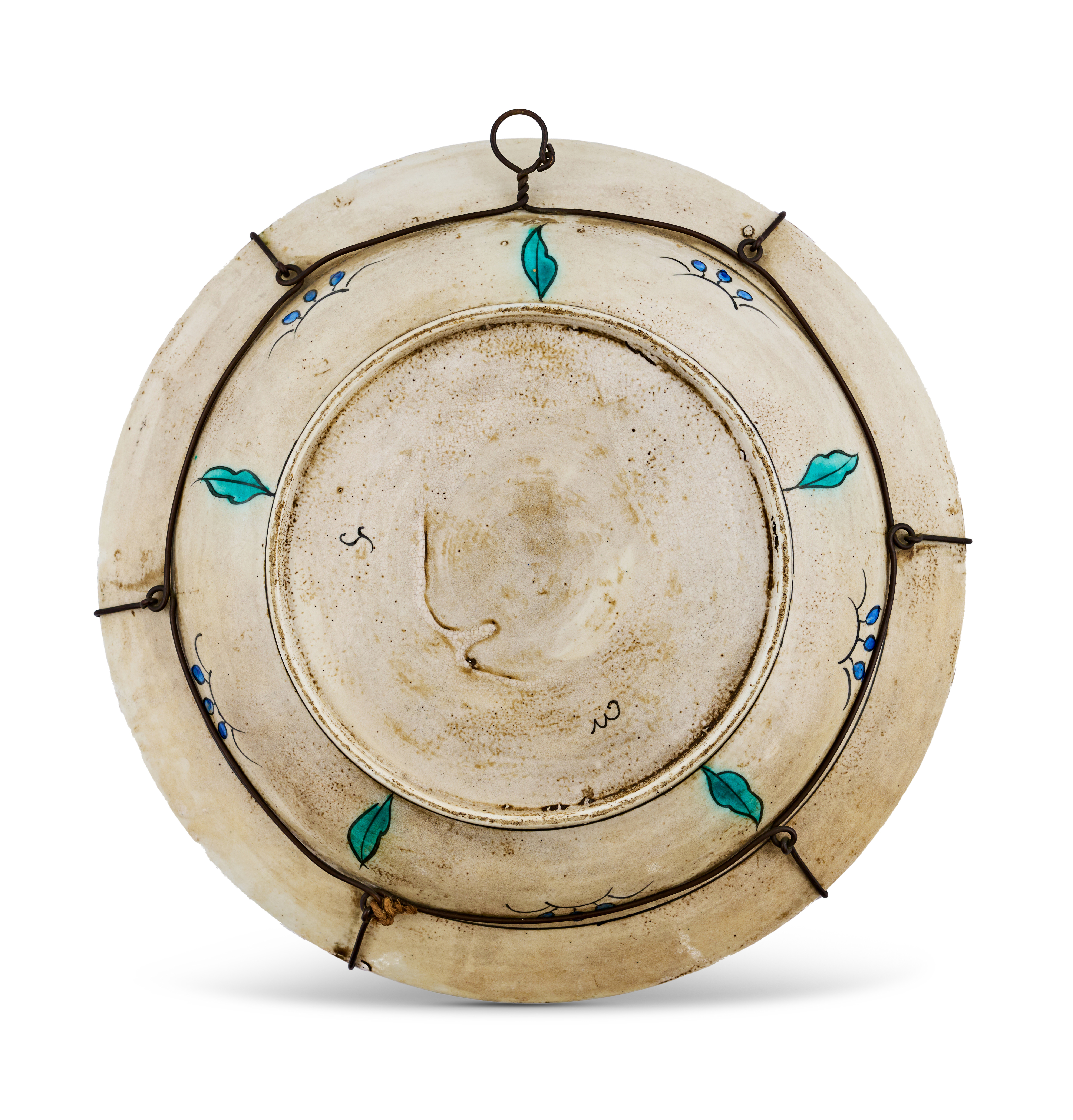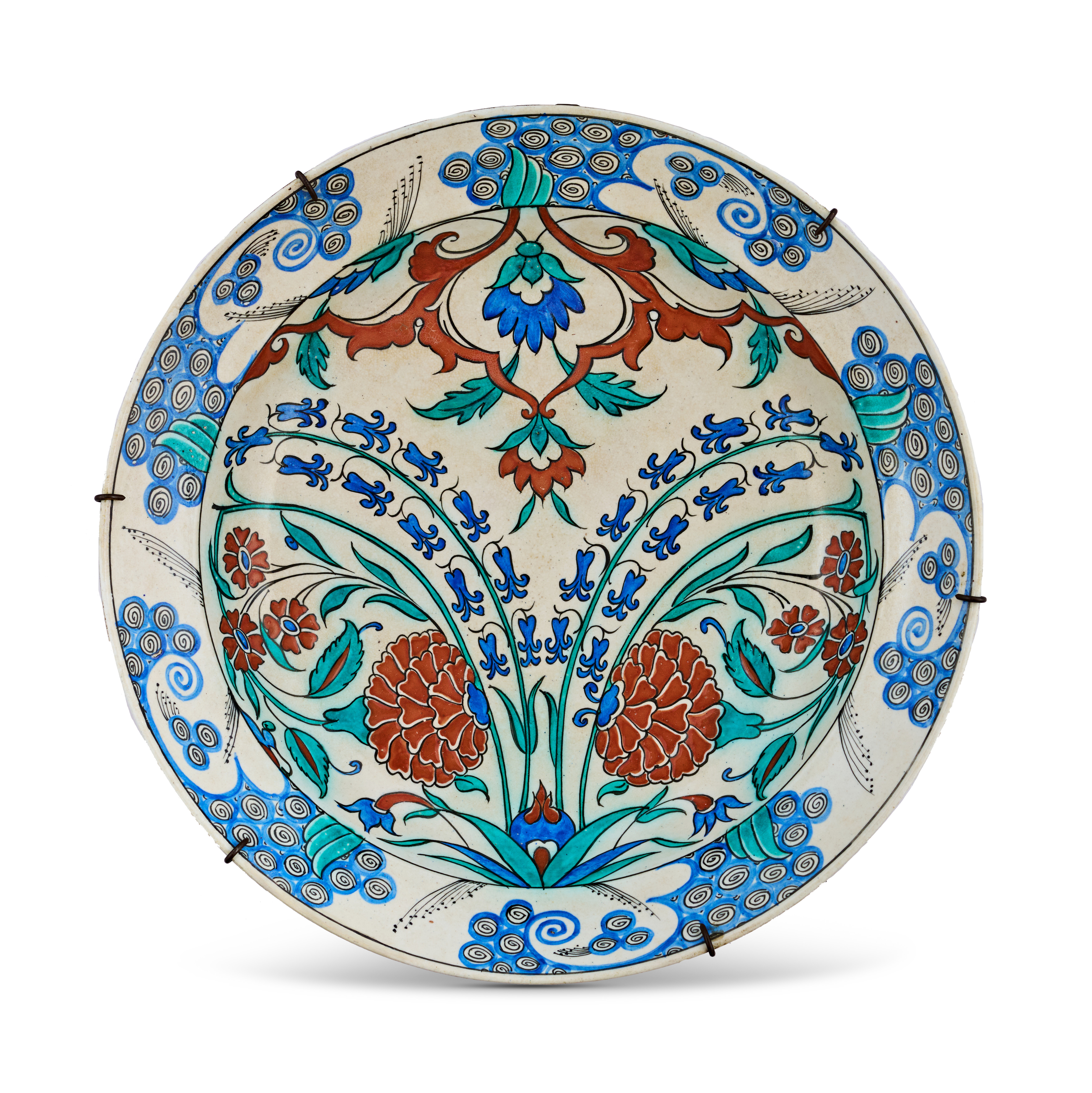 Emulating Ottoman ceramic tradition with vibrant floral sprays of carnations, tulips, and saz leaves in turquoise, cobalt, and bole red, framed by a bold spiral border and mounted for display.