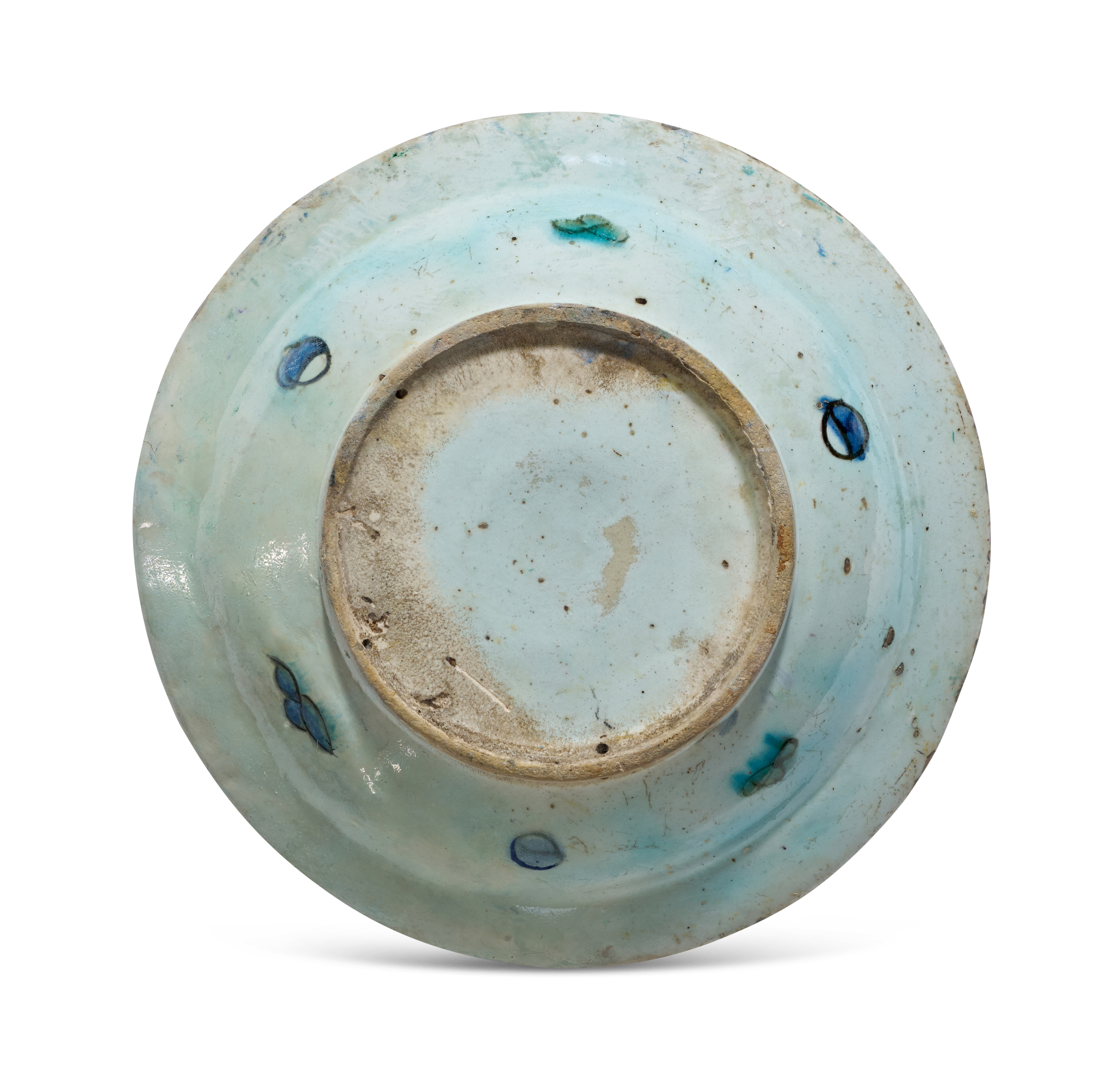 A finely painted Iznik pottery dish decorated in underglaze cobalt blue, turquoise, and bole red on a white ground. The central medallion displays a symmetrical floral composition of stylized blossoms and saz leaves radiating from a rosette, framed by a scrolling vine border around the rim.
