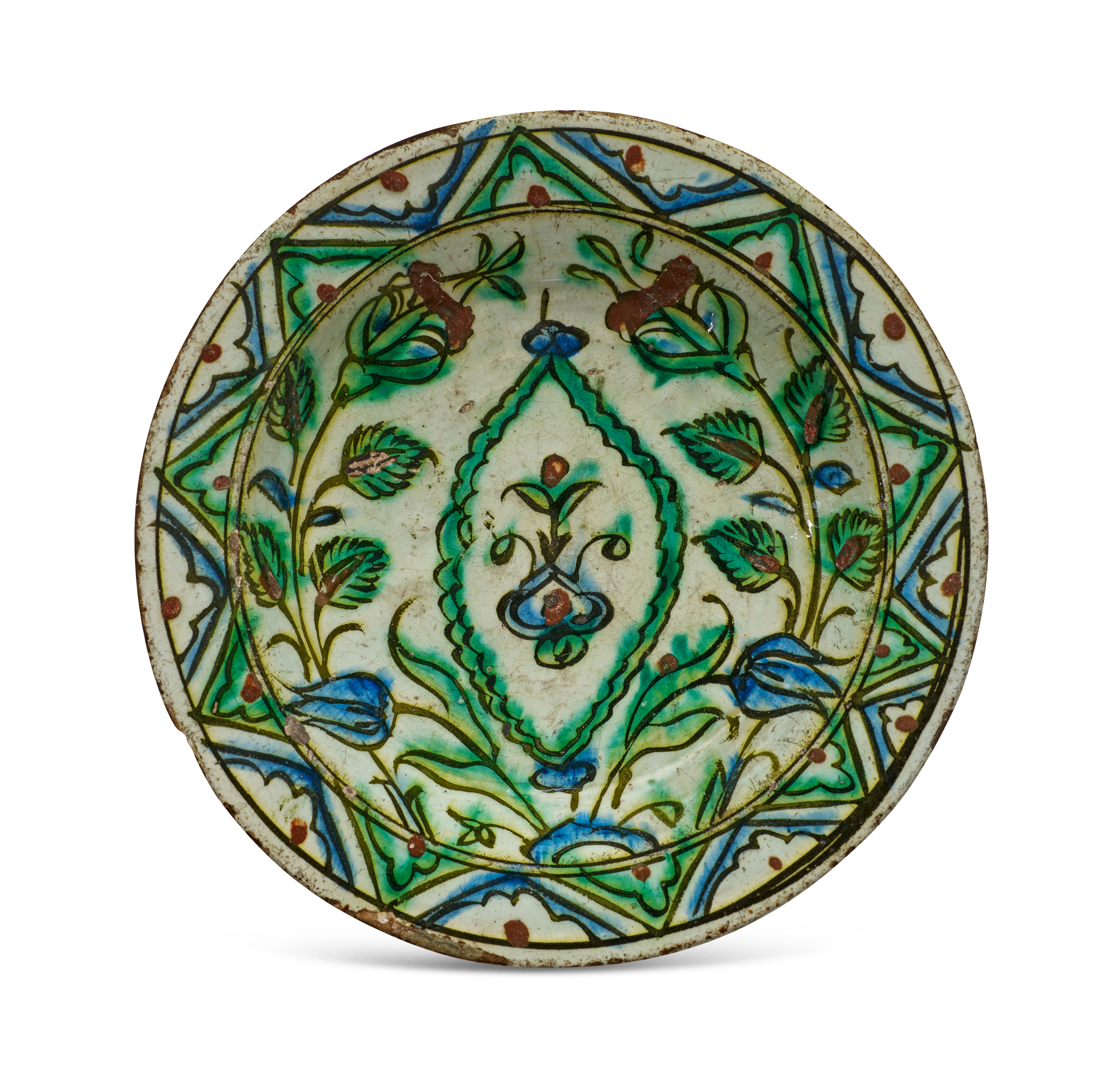 A finely painted Iznik pottery dish featuring a central medallion enclosing a stylised floral spray, surrounded by scrolling saz leaves, tulips, and other blossoms in vivid shades of cobalt blue, green, and manganese red, all outlined in black under a transparent glaze. The cavetto is framed by a border of alternating cartouches and geometric motifs, showcasing the refined aesthetic of late Ottoman ceramic artistry.