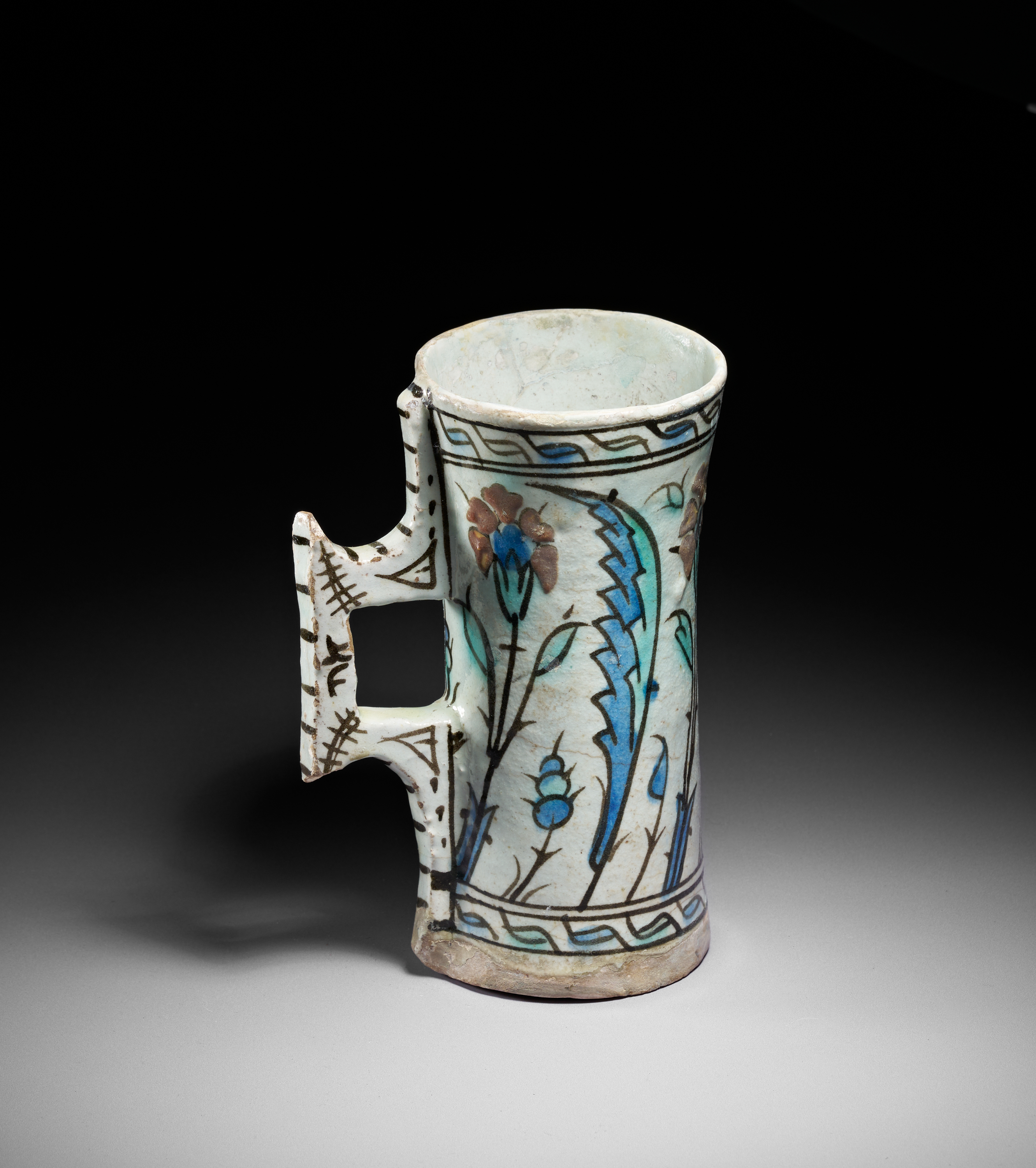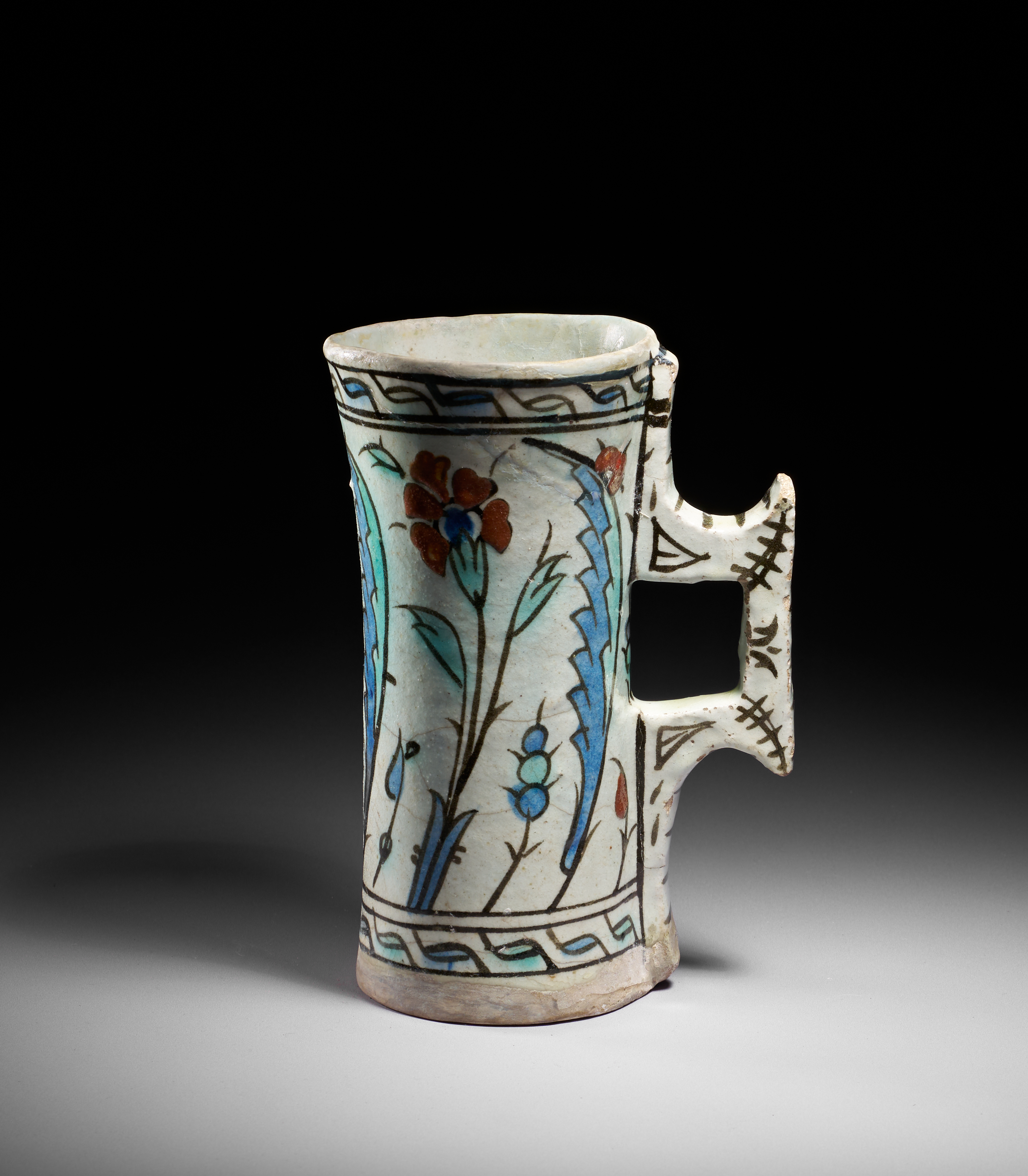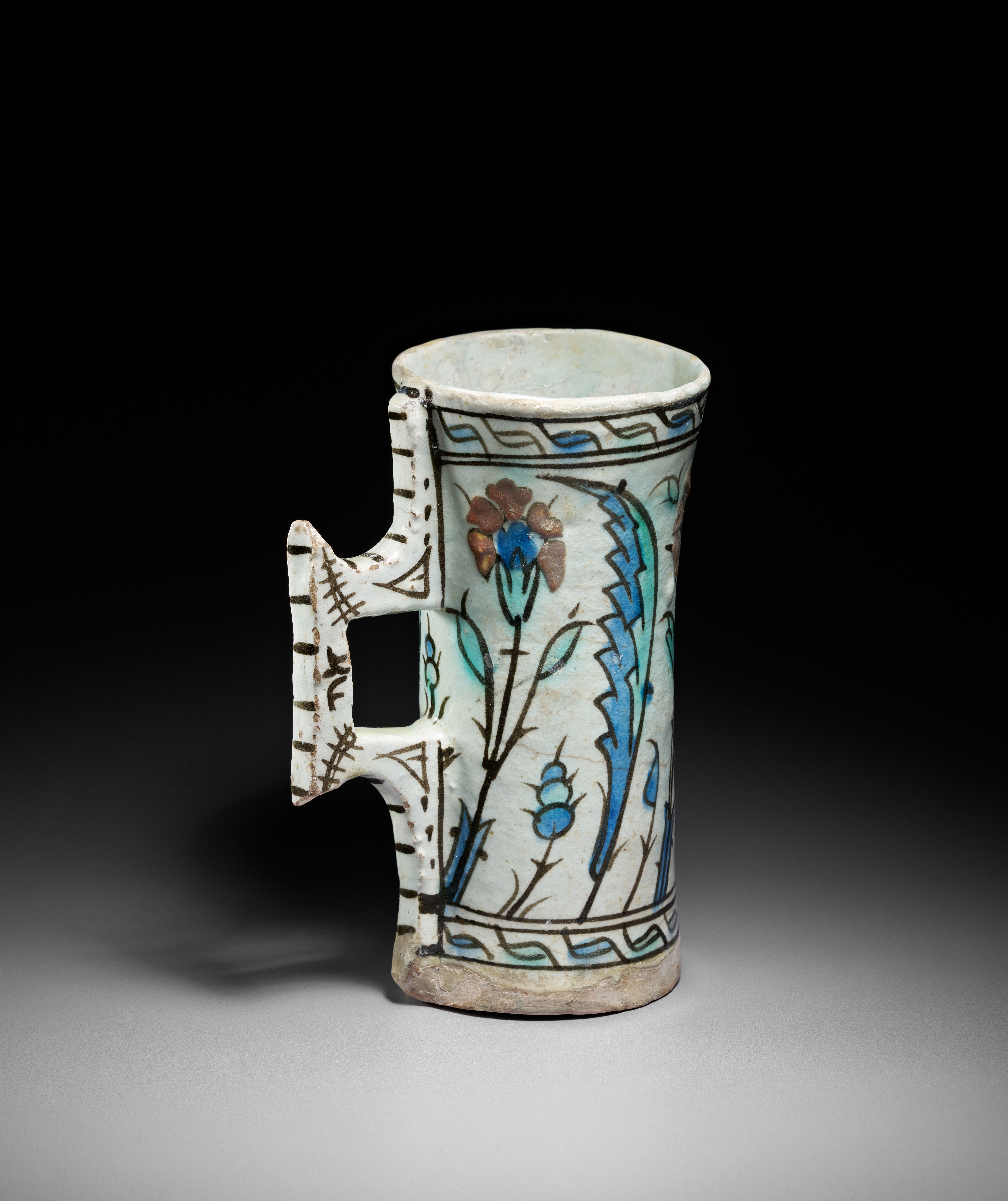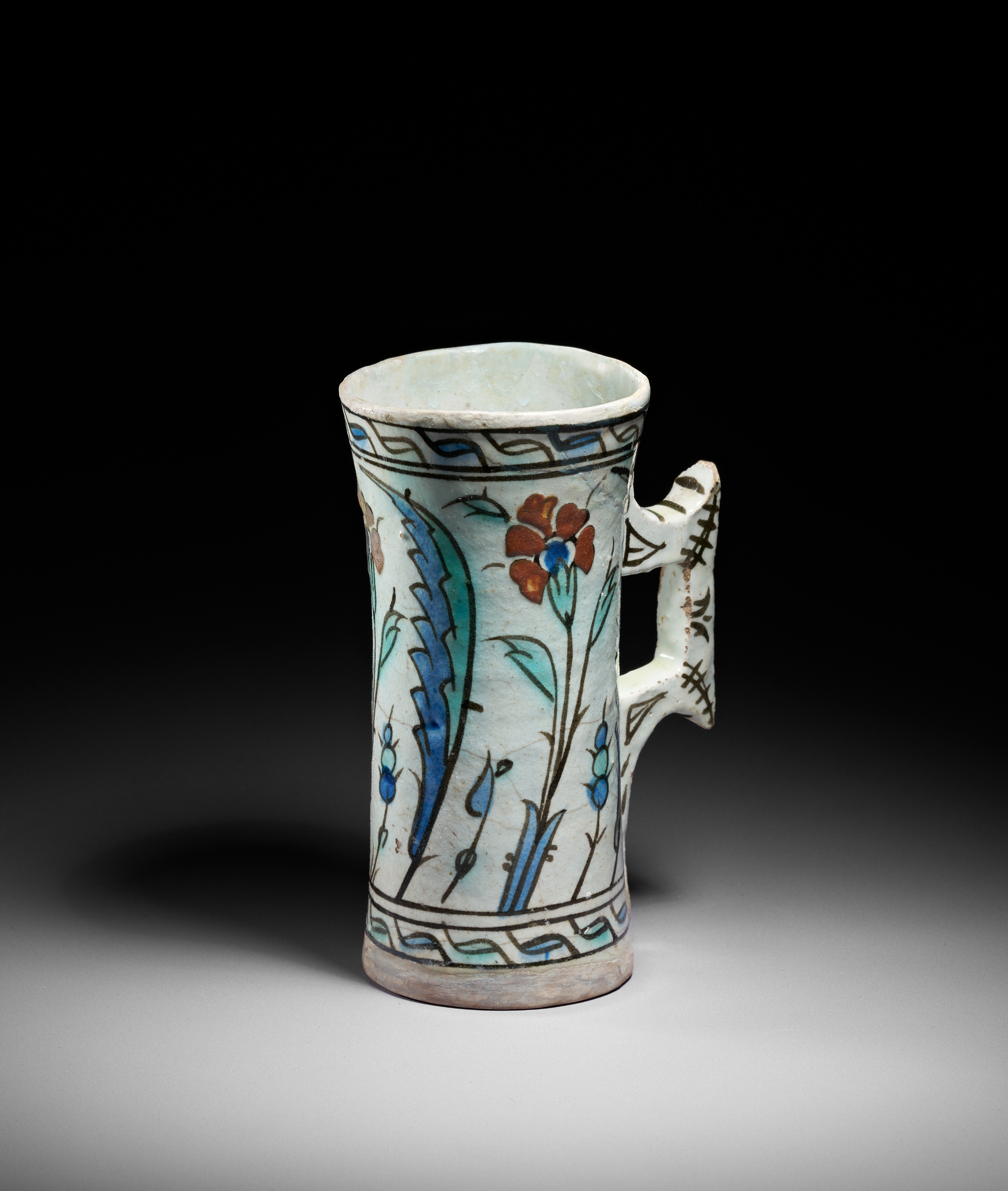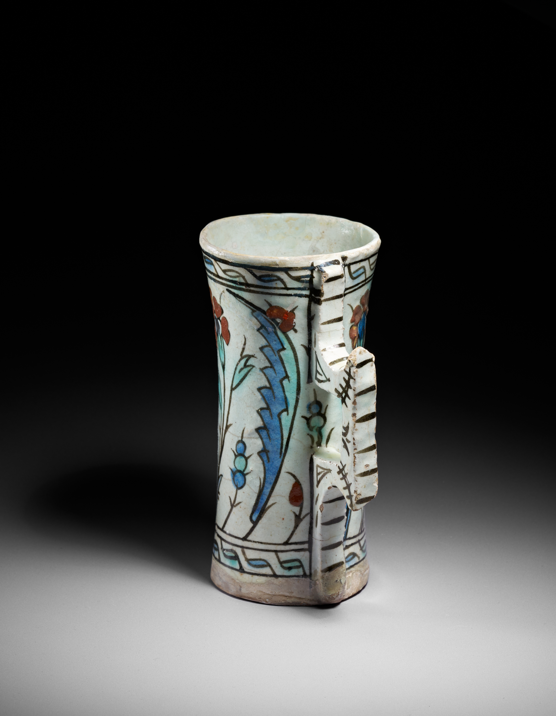 This finely painted Iznik pottery tankard is a rare surviving example of Ottoman ceramic drinking vessels produced around 1600. Cylindrical in form with a slightly flaring rim, the tankard features its characteristic angular double-tiered handle, decorated with bold black strokes that echo early Iznik calligraphic flourishes.