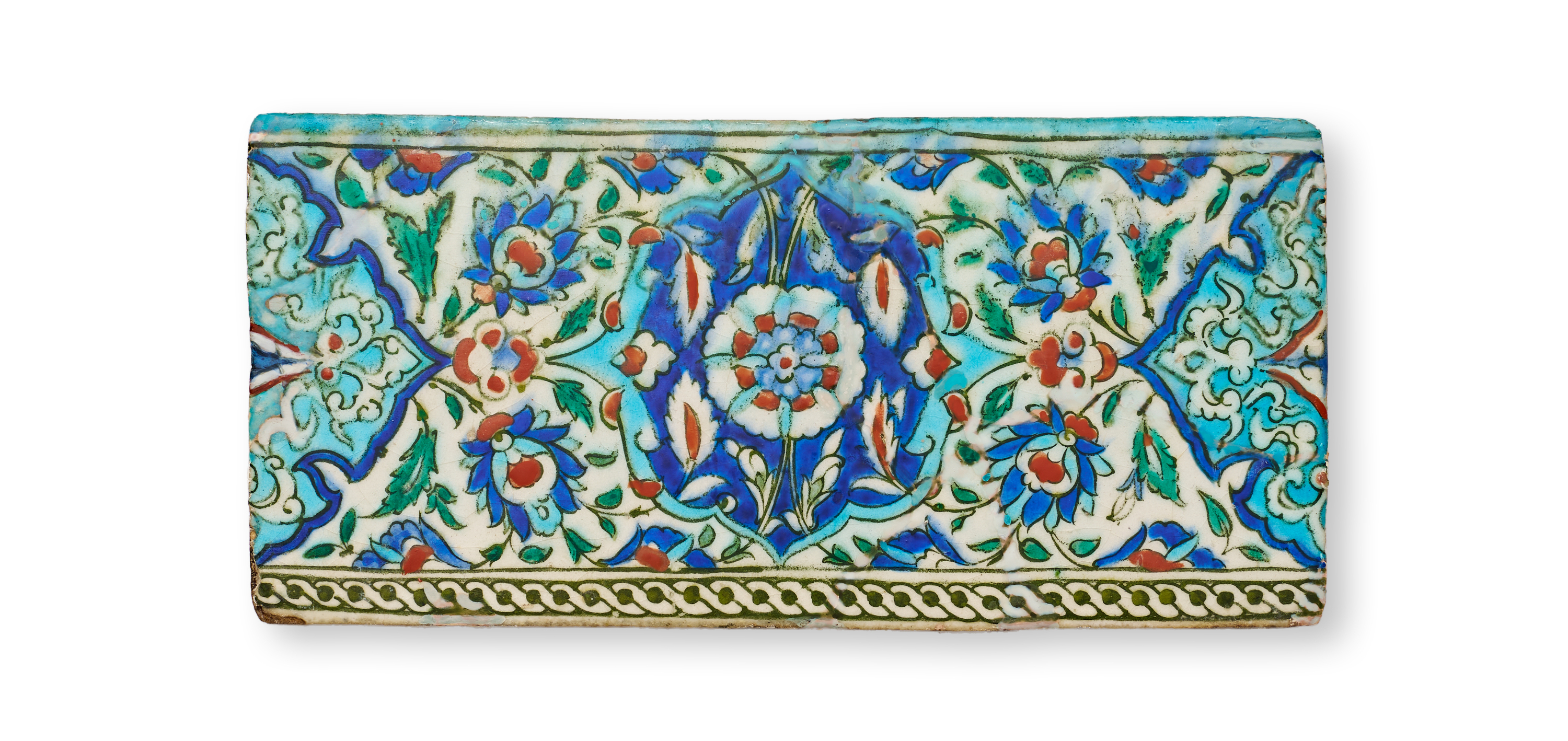 A finely painted Iznik pottery border tile from 17th-century Ottoman Turkey, decorated in a vibrant palette of cobalt blue, turquoise, emerald green, and bole red. The design features a central rosette flanked by symmetrical floral sprays of saz leaves, carnations, and stylised blossoms, all set against a crisp white ground. A braided green border runs along the lower edge, completing the composition.