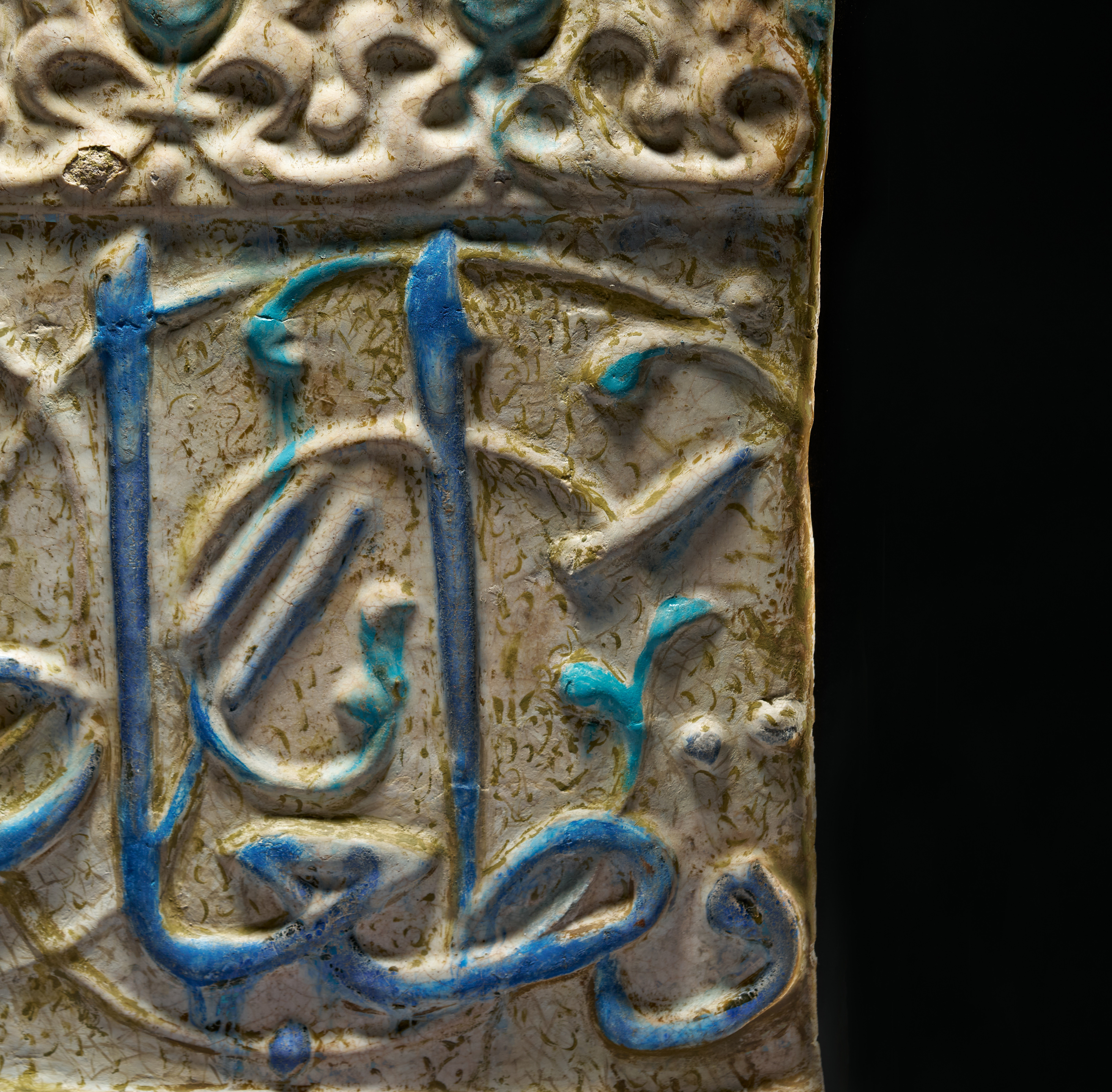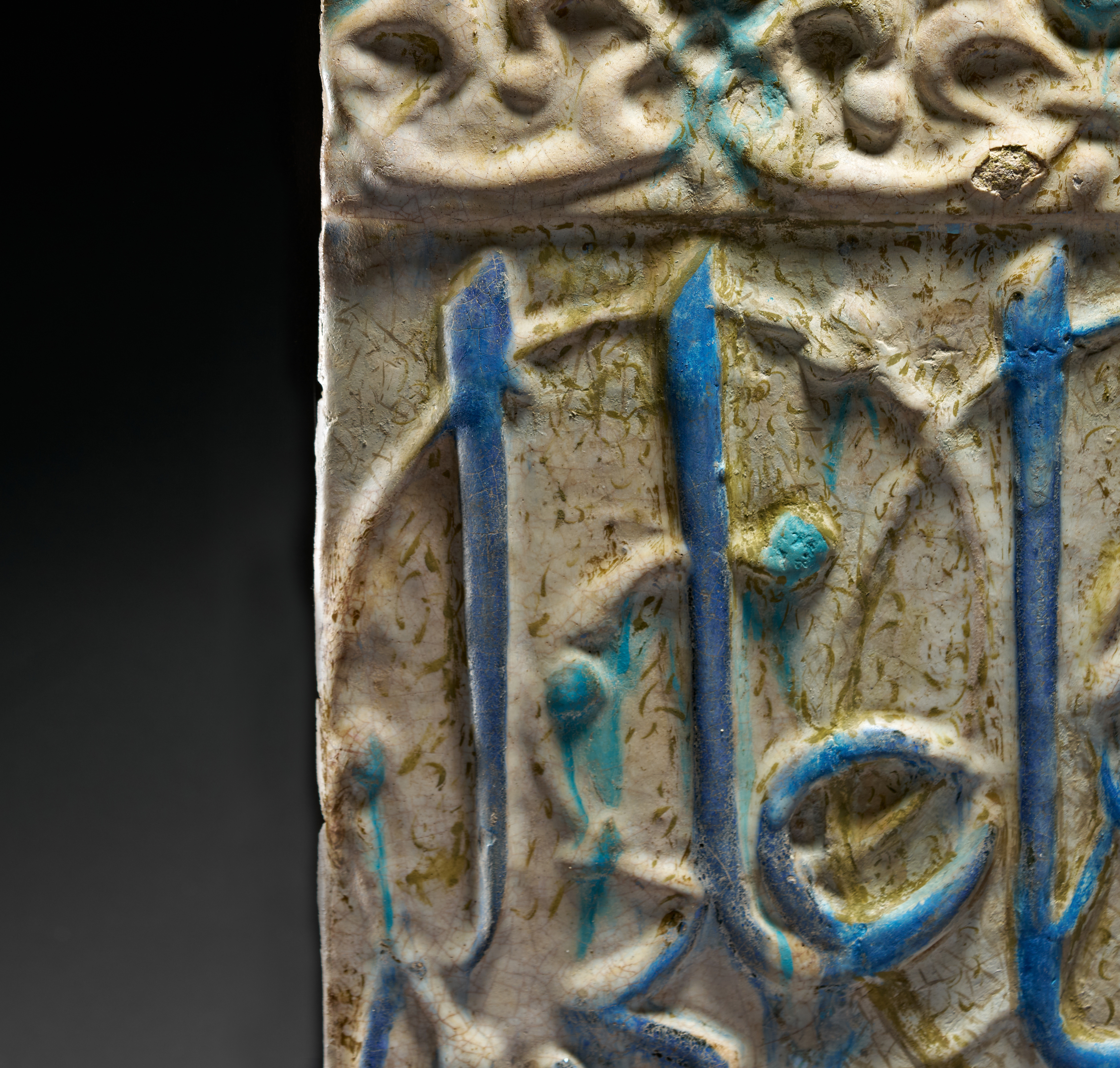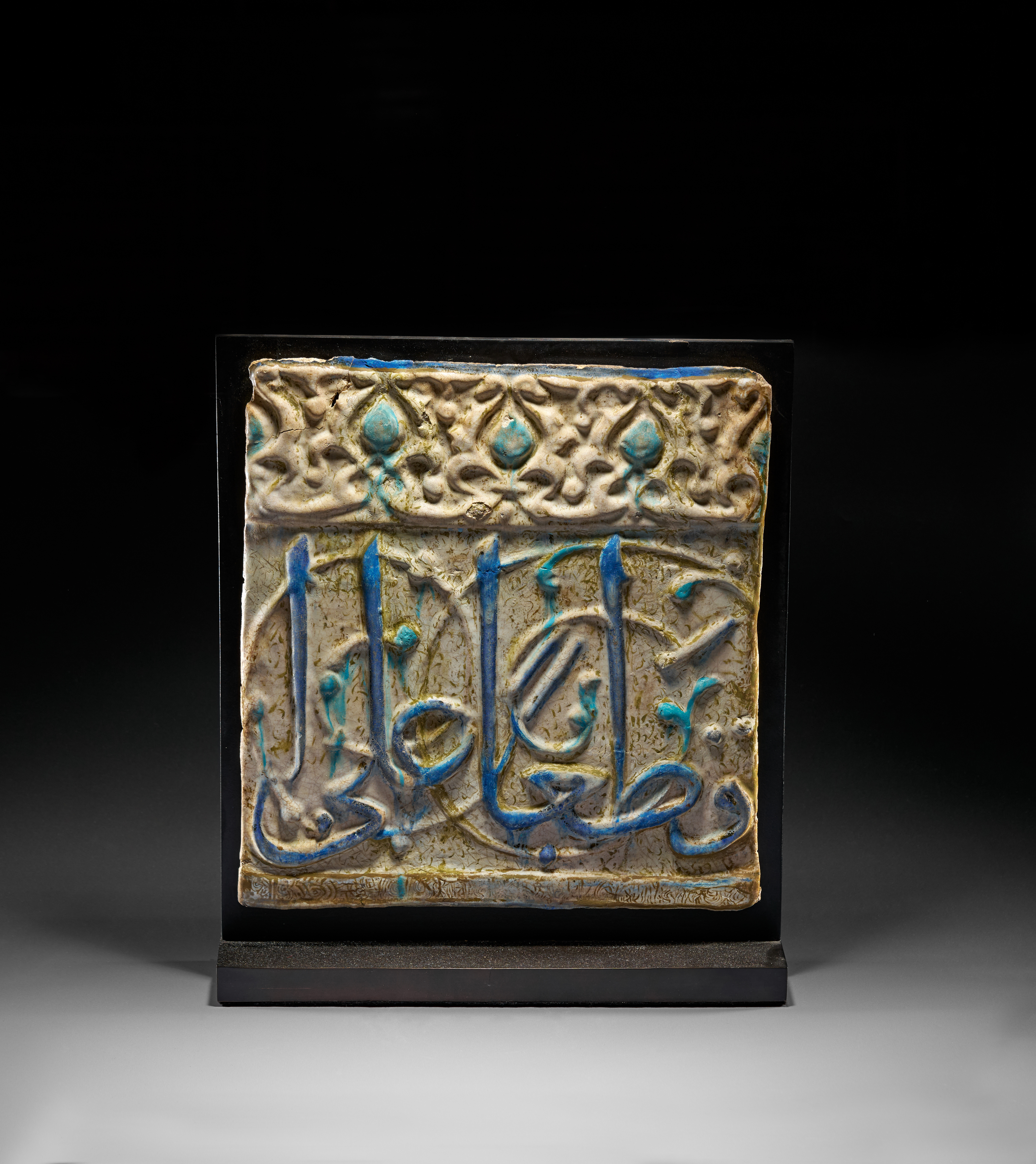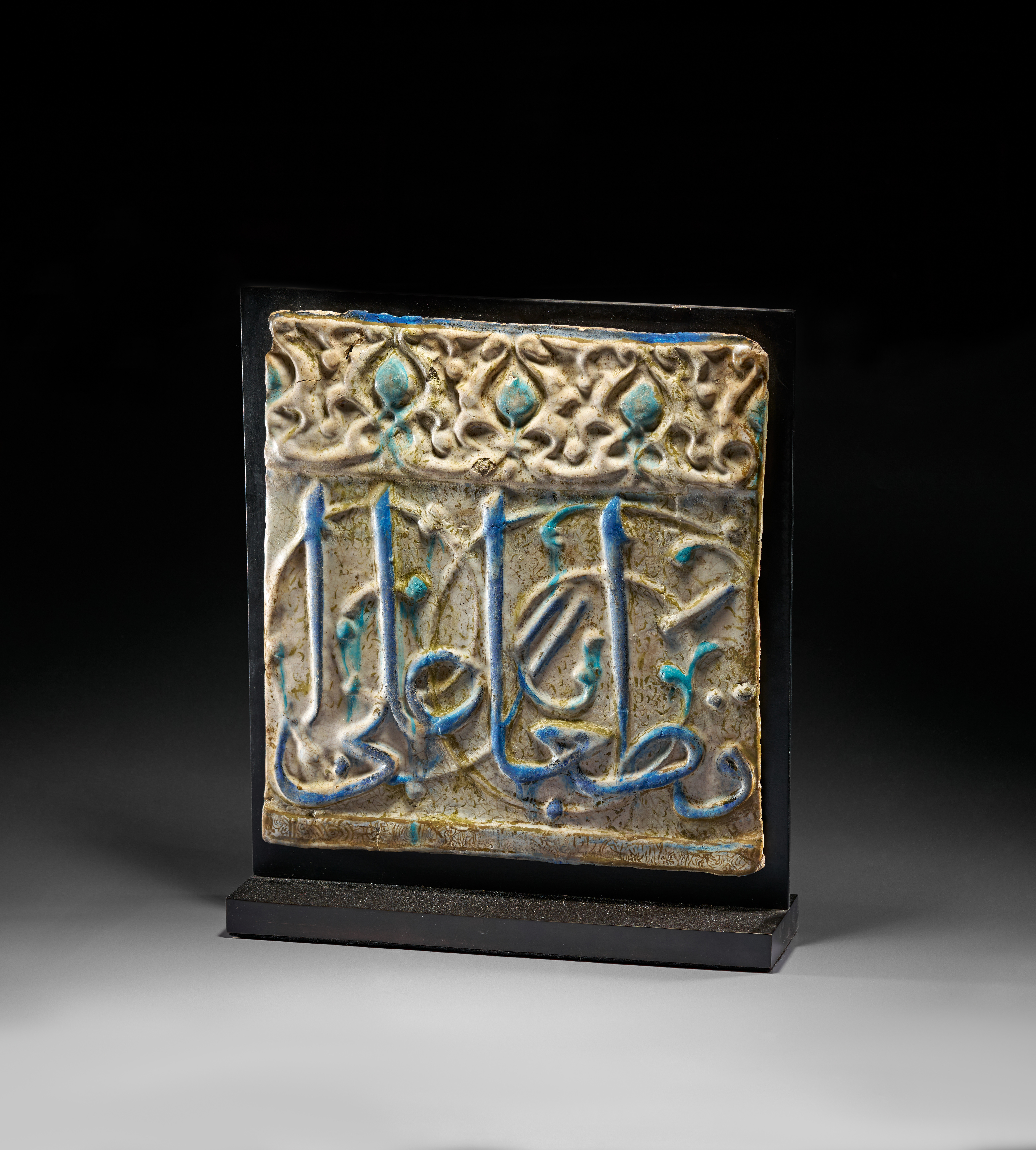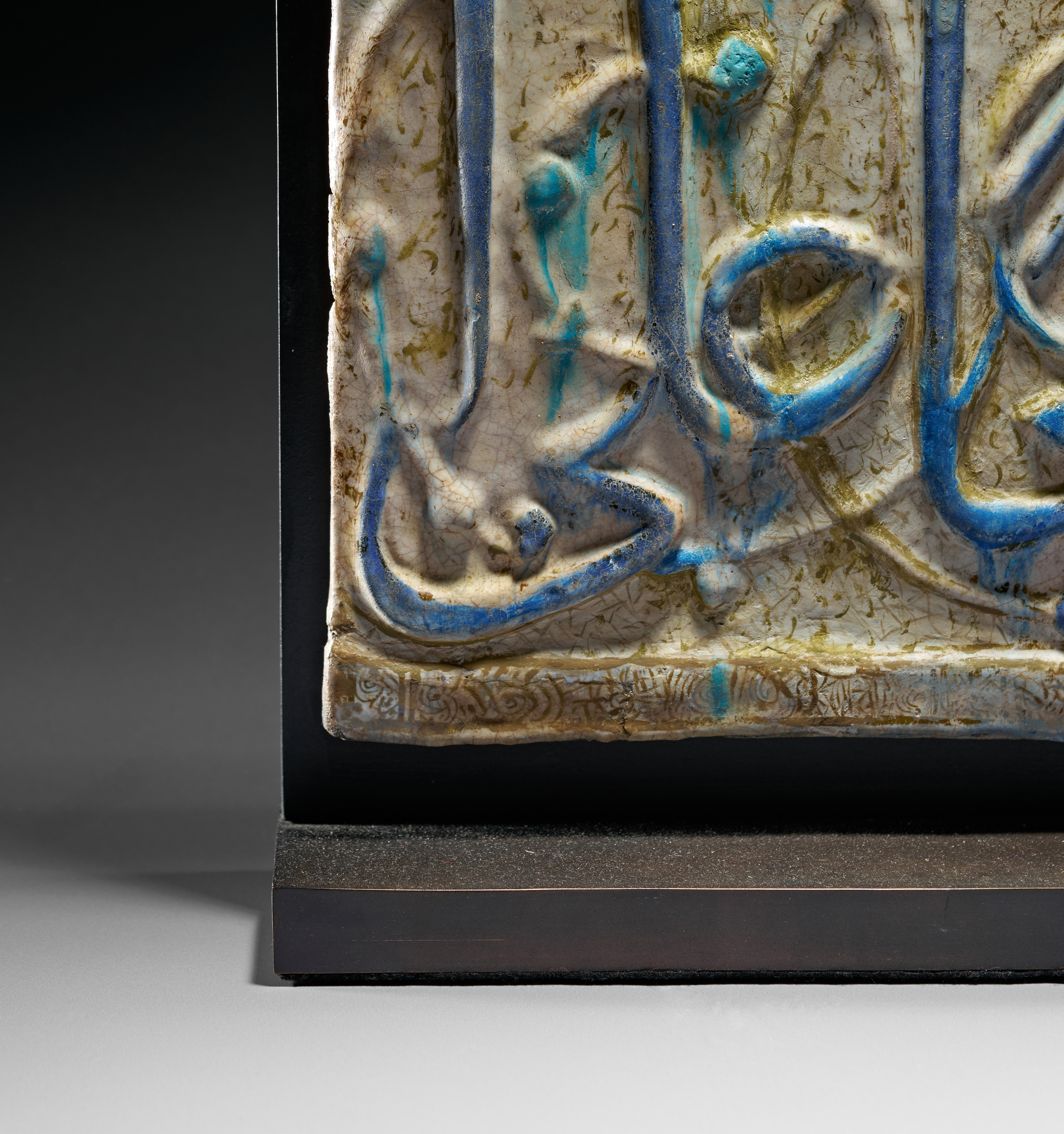 A finely moulded architectural frieze tile from Kashan, Central Persia, dating to the 13th century, decorated in a characteristic combination of lustre, cobalt blue, and turquoise glazes. The tile features a bold band of raised cursive inscription set against a lightly textured ground, the sweeping calligraphic strokes highlighted in vivid cobalt and turquoise. Above the inscription runs a narrow frieze of repeating floral and palmette motifs in low relief, also touched with turquoise accents.