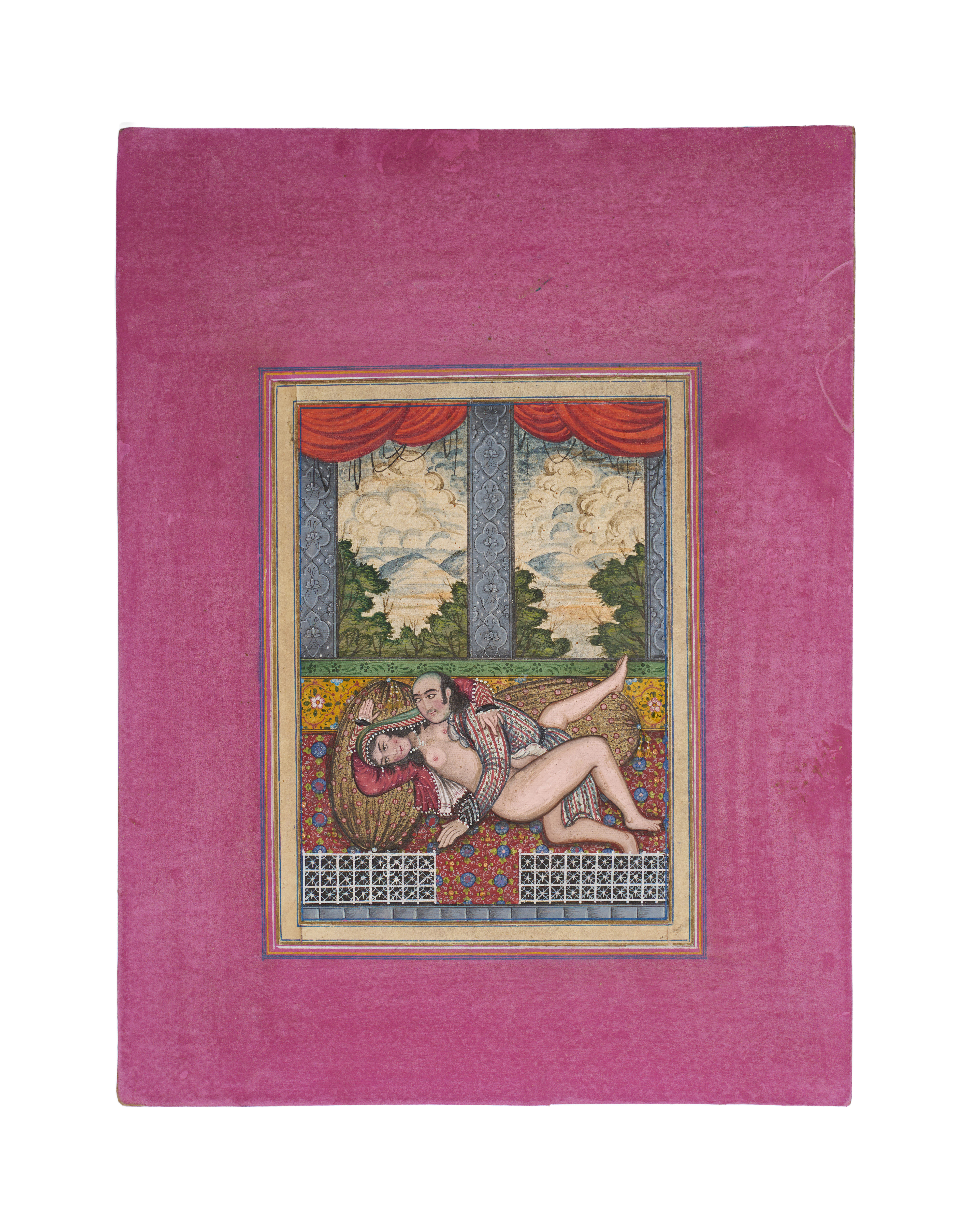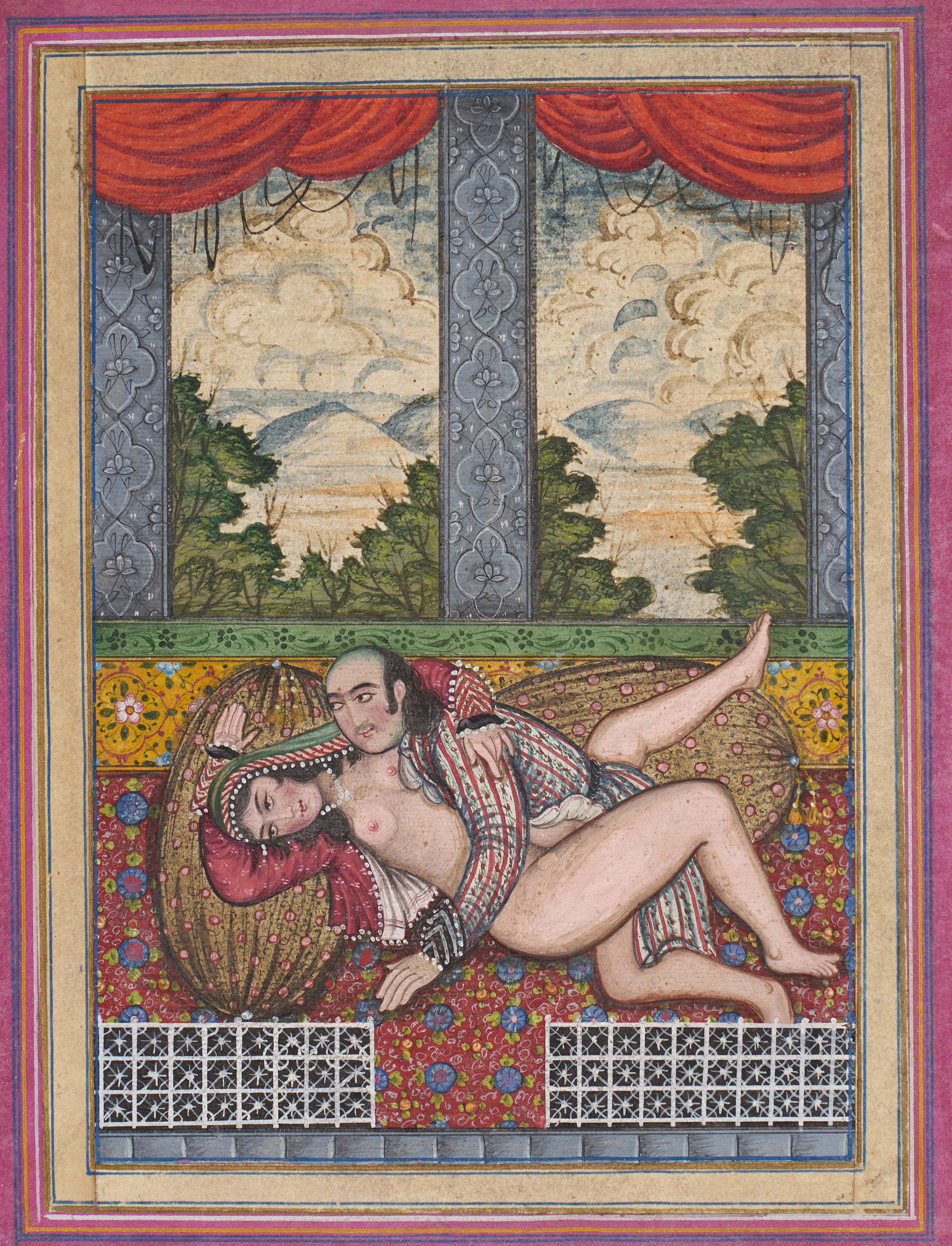 An elegant Persian miniature depicting an intimate scene of a reclining couple within a richly adorned interior. The lovers are rendered with refined expressions and delicate modeling, characteristic of the late Qajar artistic style. The figures recline on a patterned textile beneath an arched window opening onto a lush landscape, framed by draped crimson curtains.
