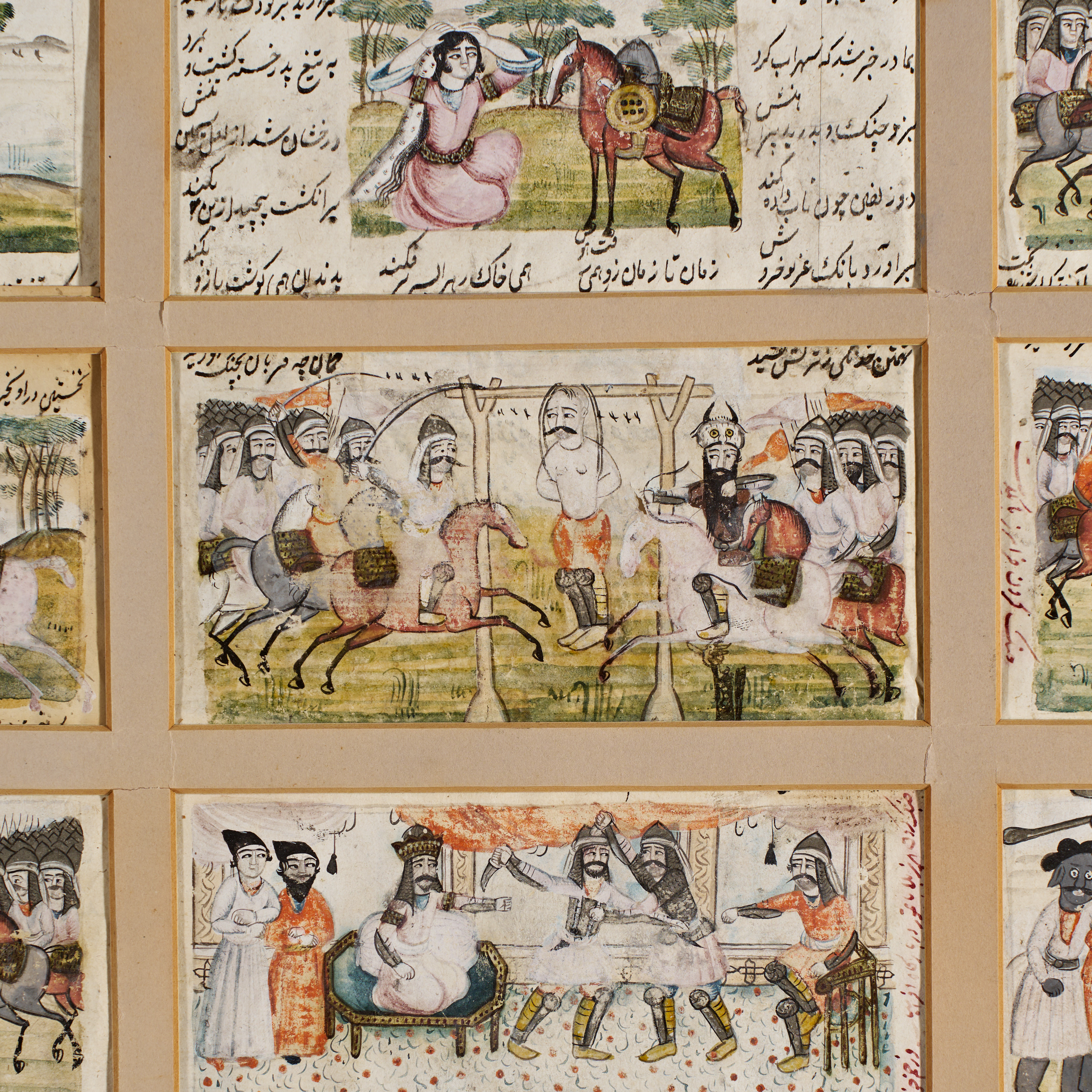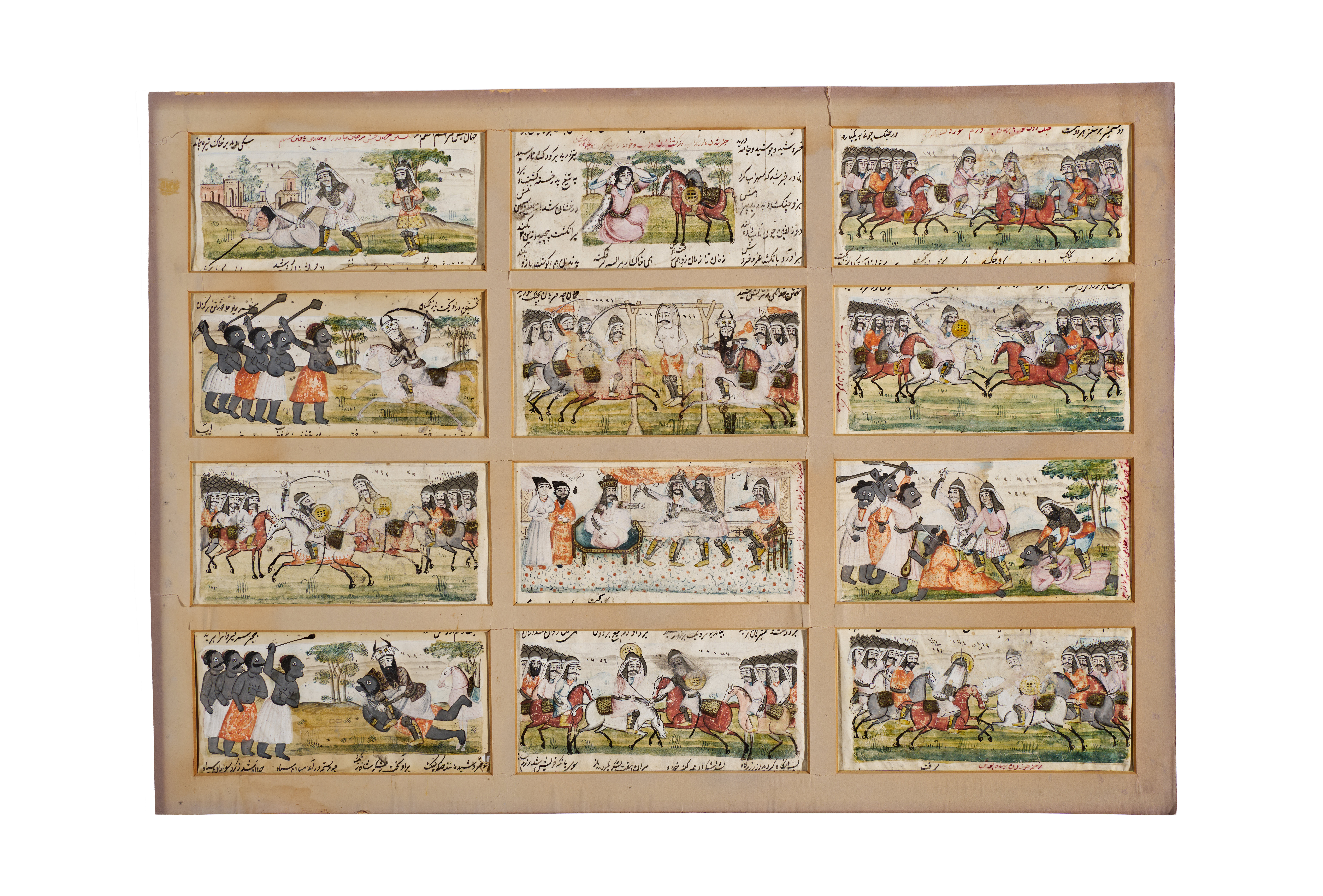 A rare set of twelve Persian miniature paintings depicting a continuous narrative scene, possibly illustrating an episode from the Shahnameh or another Persian epic. Each miniature is finely rendered with vivid pigments and delicate black outlining, set within a ruled border and accompanied by Persian inscriptions identifying characters and dialogue.