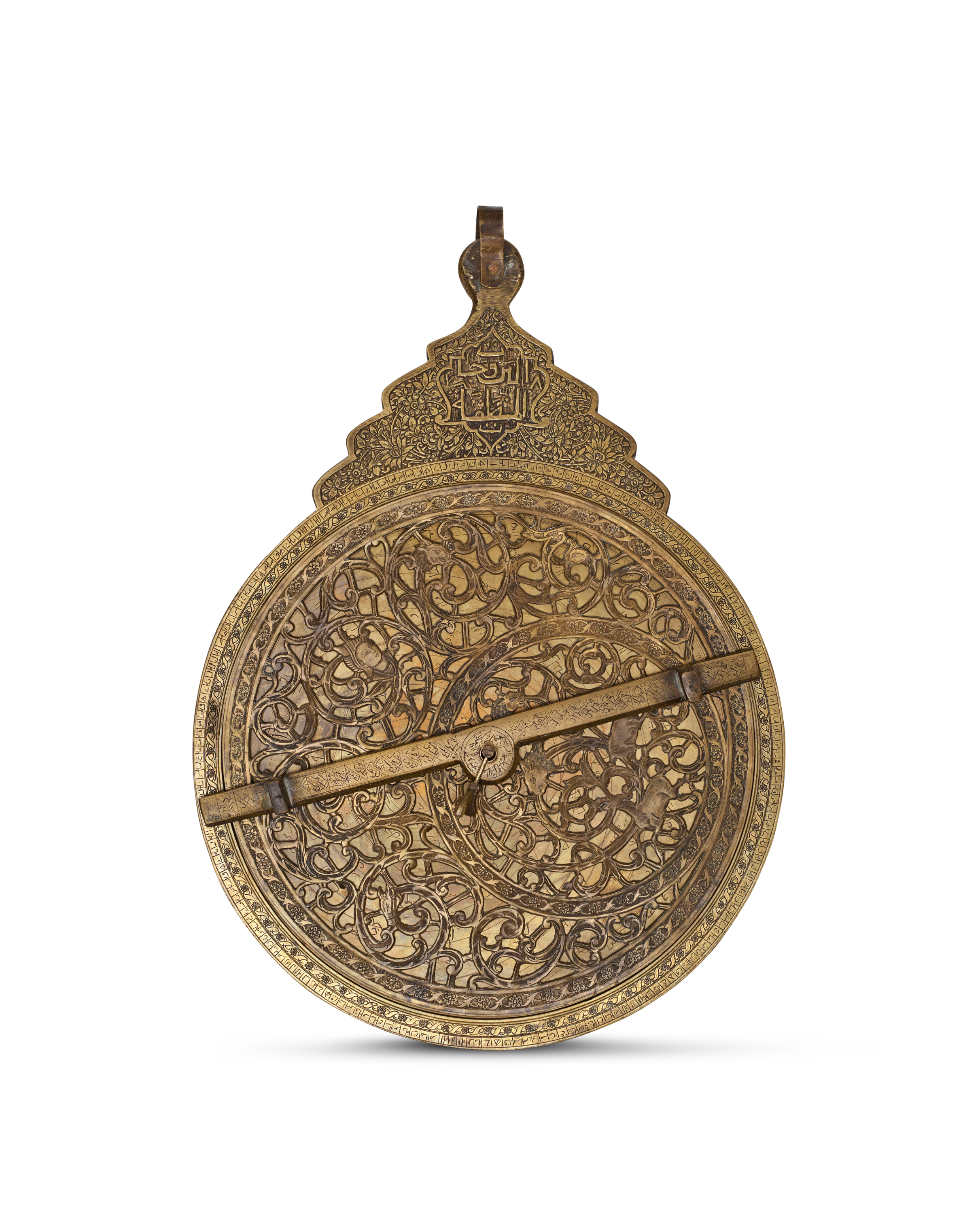 A substantial and finely engraved brass astrolabe from Qajar Persia, dating to the 19th century. The instrument comprises a large mater fitted with multiple interchangeable plates (ṭabaqāt), each meticulously inscribed with astronomical scales, stereographic projections, and geographic coordinates. The rete is beautifully pierced with interlacing scrollwork, its star pointers delicately shaped and arranged around a central throne. The alidade is engraved with precise sighting lines and geometric motifs, and the original suspension ring and related fittings accompany the piece.