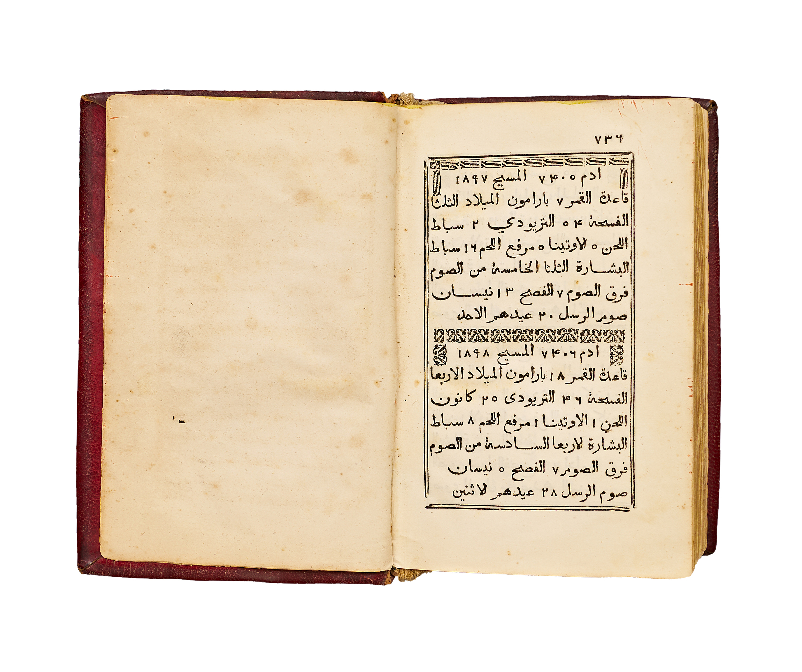 An exceptional and early example of Arabic Christian printing in Lebanon, this book illustrates the literary and spiritual vitality of Maronite and Catholic communities during the Ottoman period.