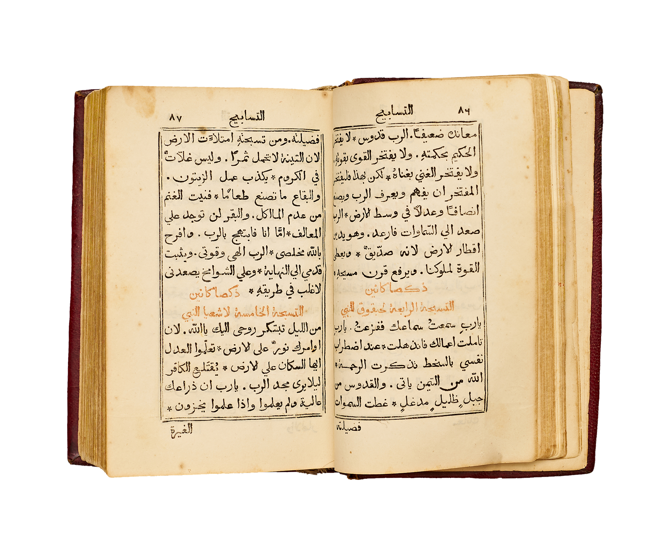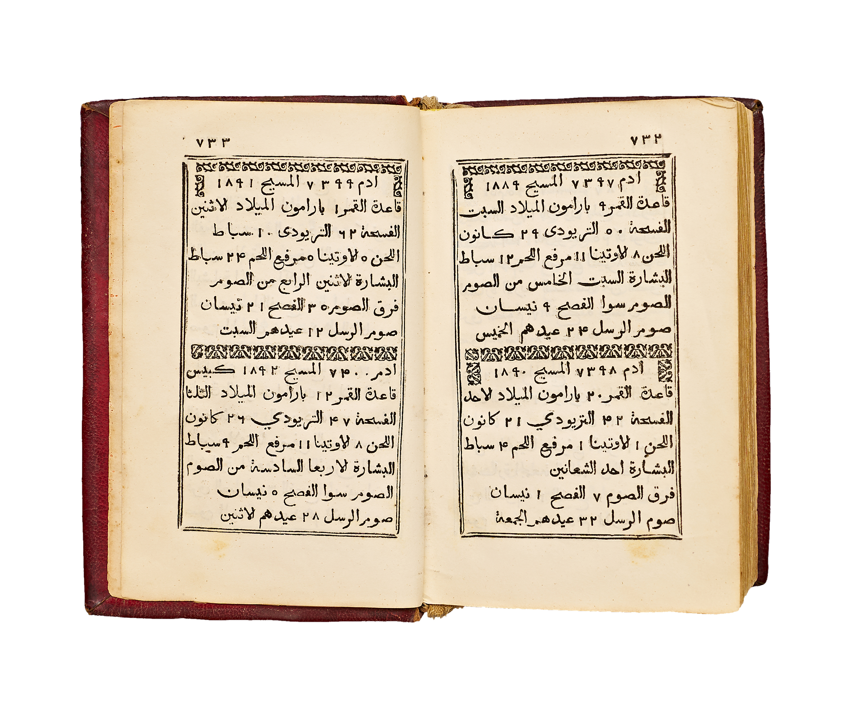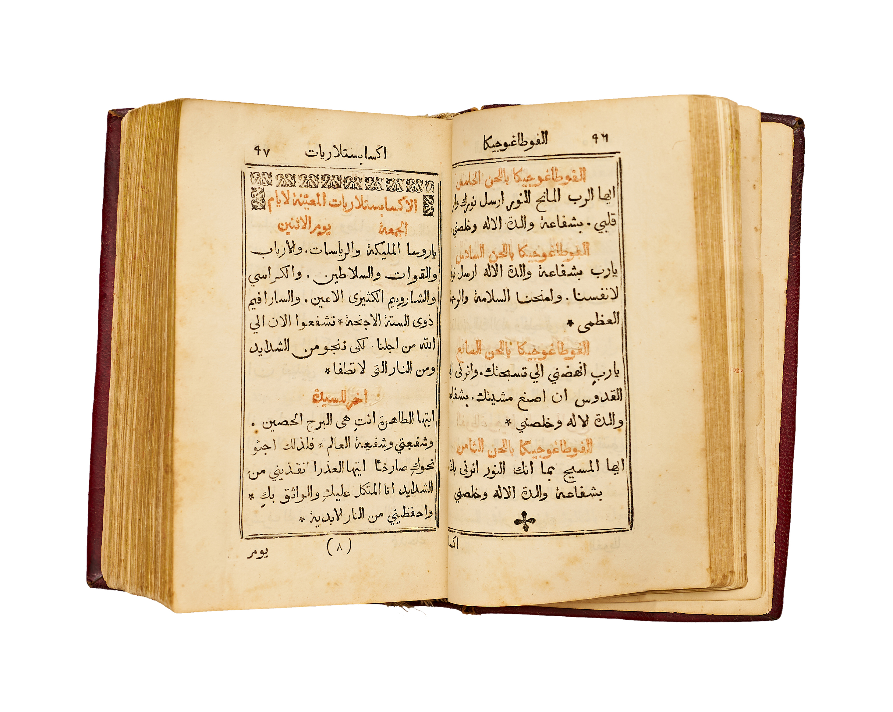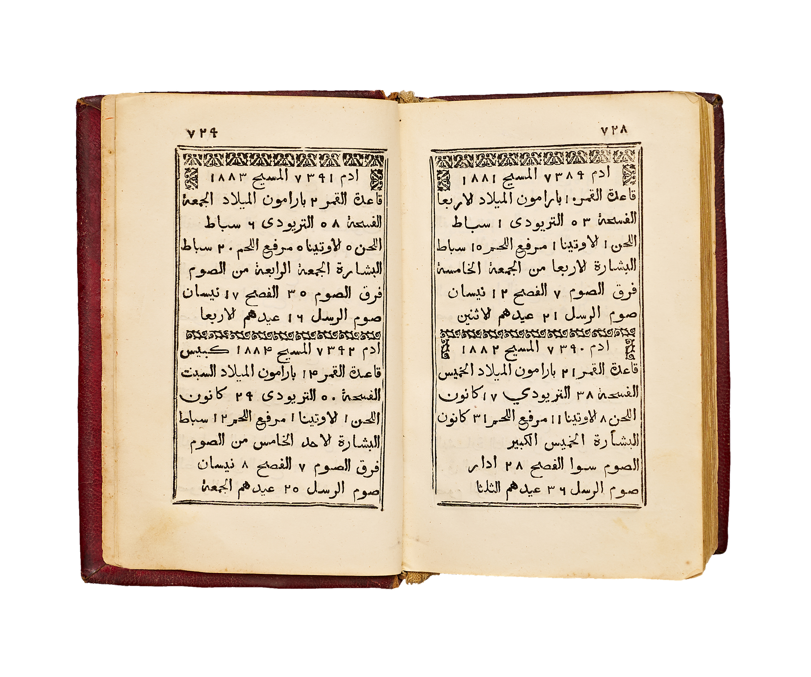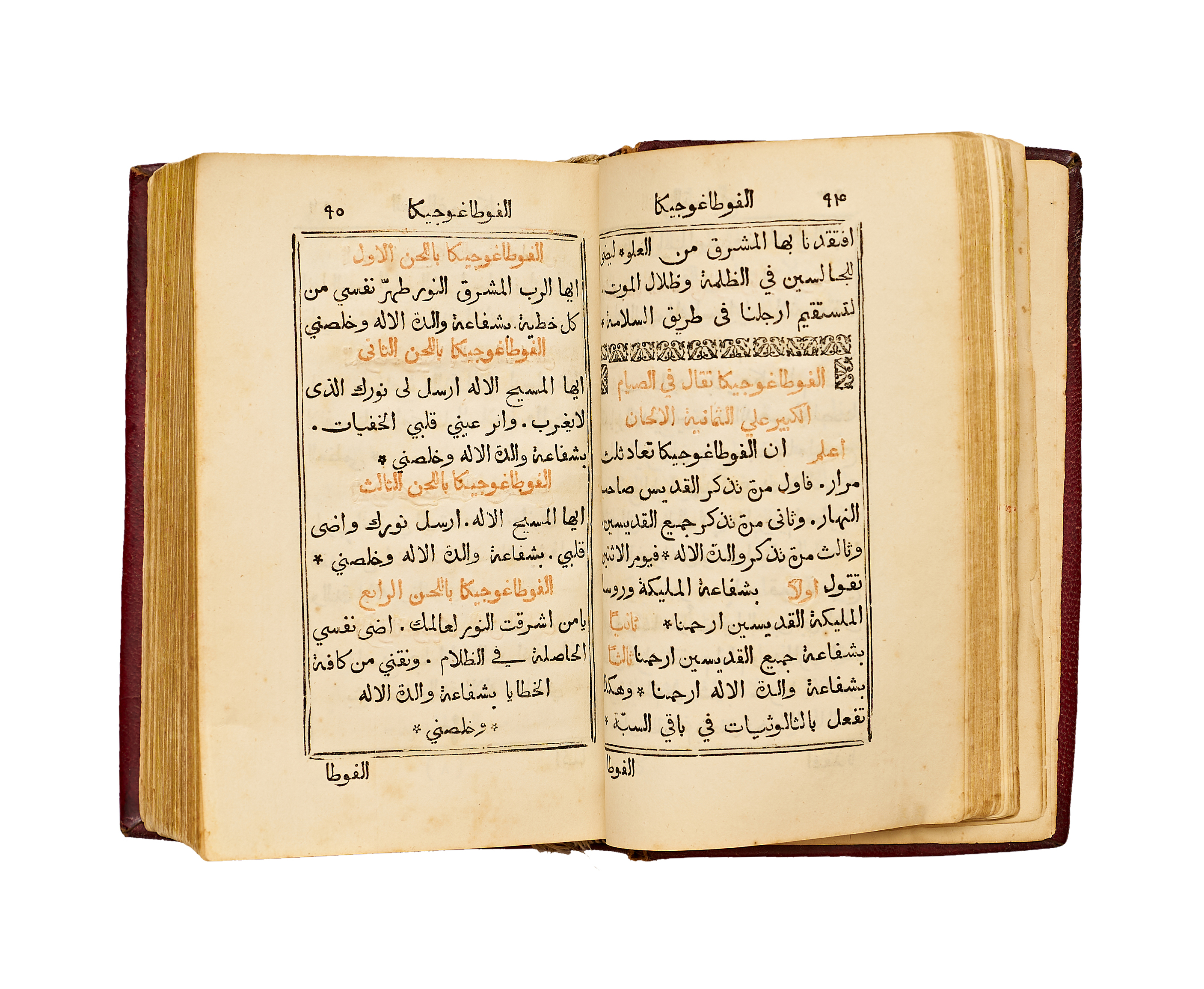 Bound in an attractive contemporary red tooled leather binding with a central gilt medallion and decorative corner motifs, this copy reflects the refinement of early Lebanese Christian bookbinding. Light age toning and minor marginal wear consistent with devotional use.