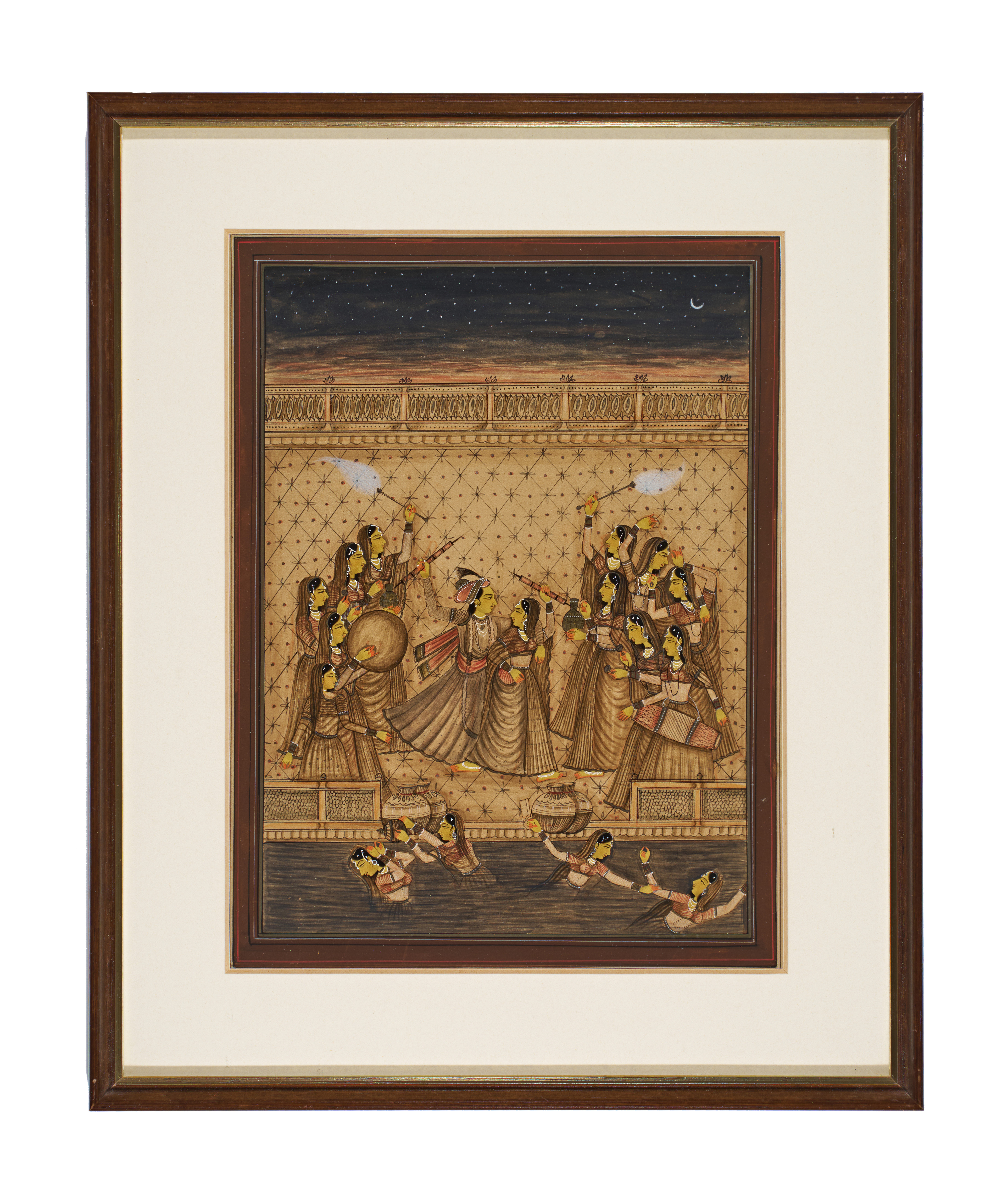 A MINIATURE INDIAN PAINTING DEPICTS A ROMANTIC GATHERING, 19TH – 20TH CENTURY