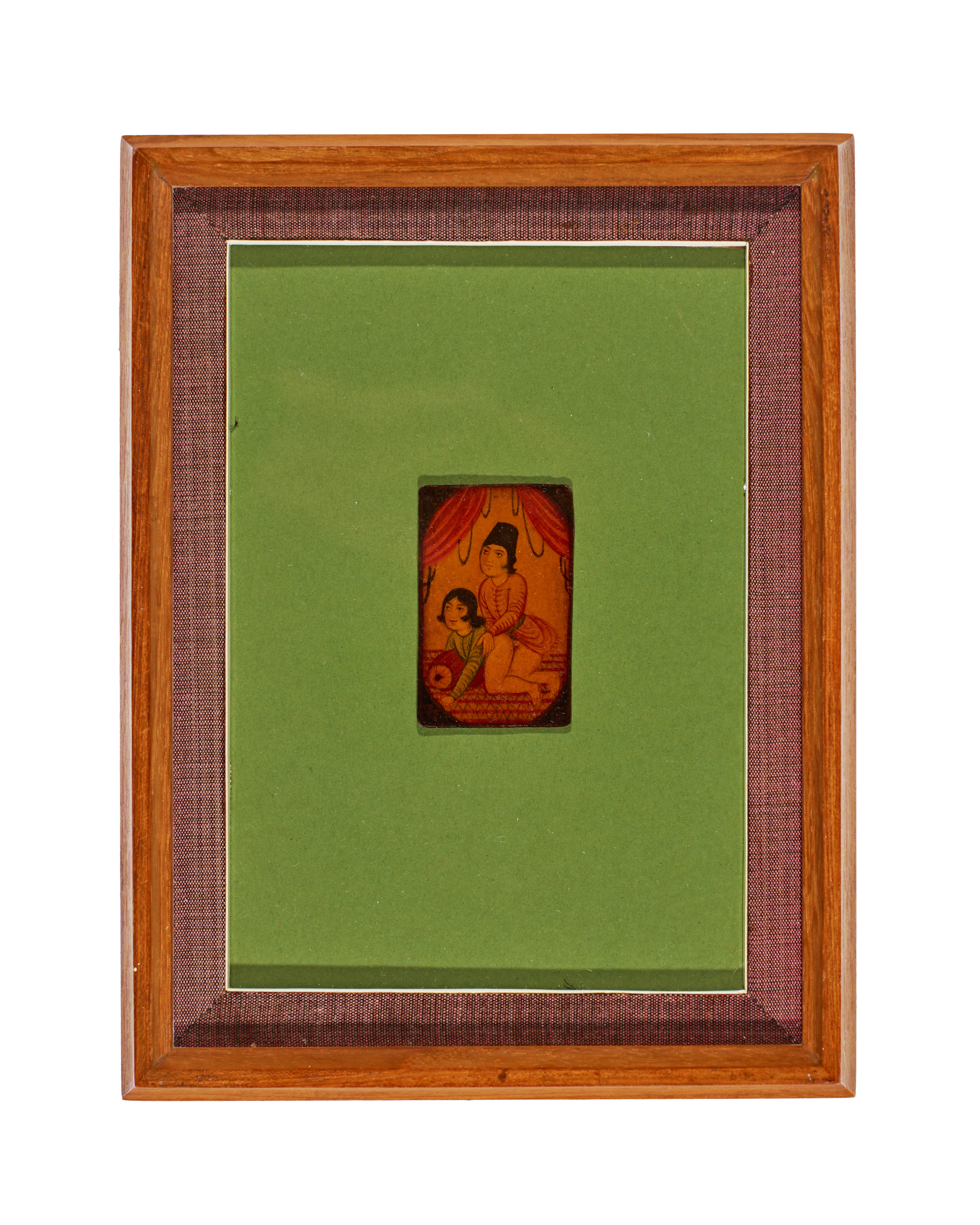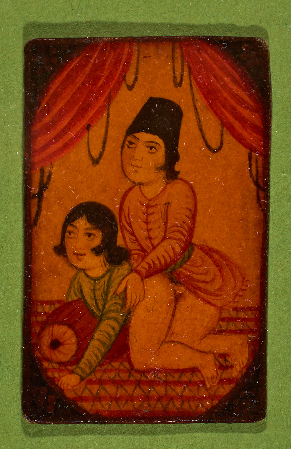 A QAJAR LACQUERED PAPIER MACHE PLAYING CARD DEPICTS A ROMANTIC SCENE, PERSIA, 19TH CENTURY