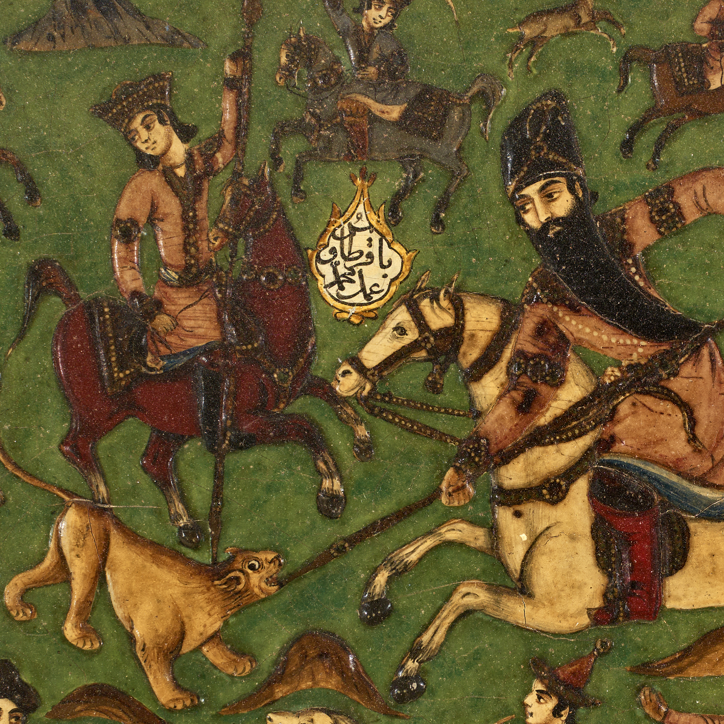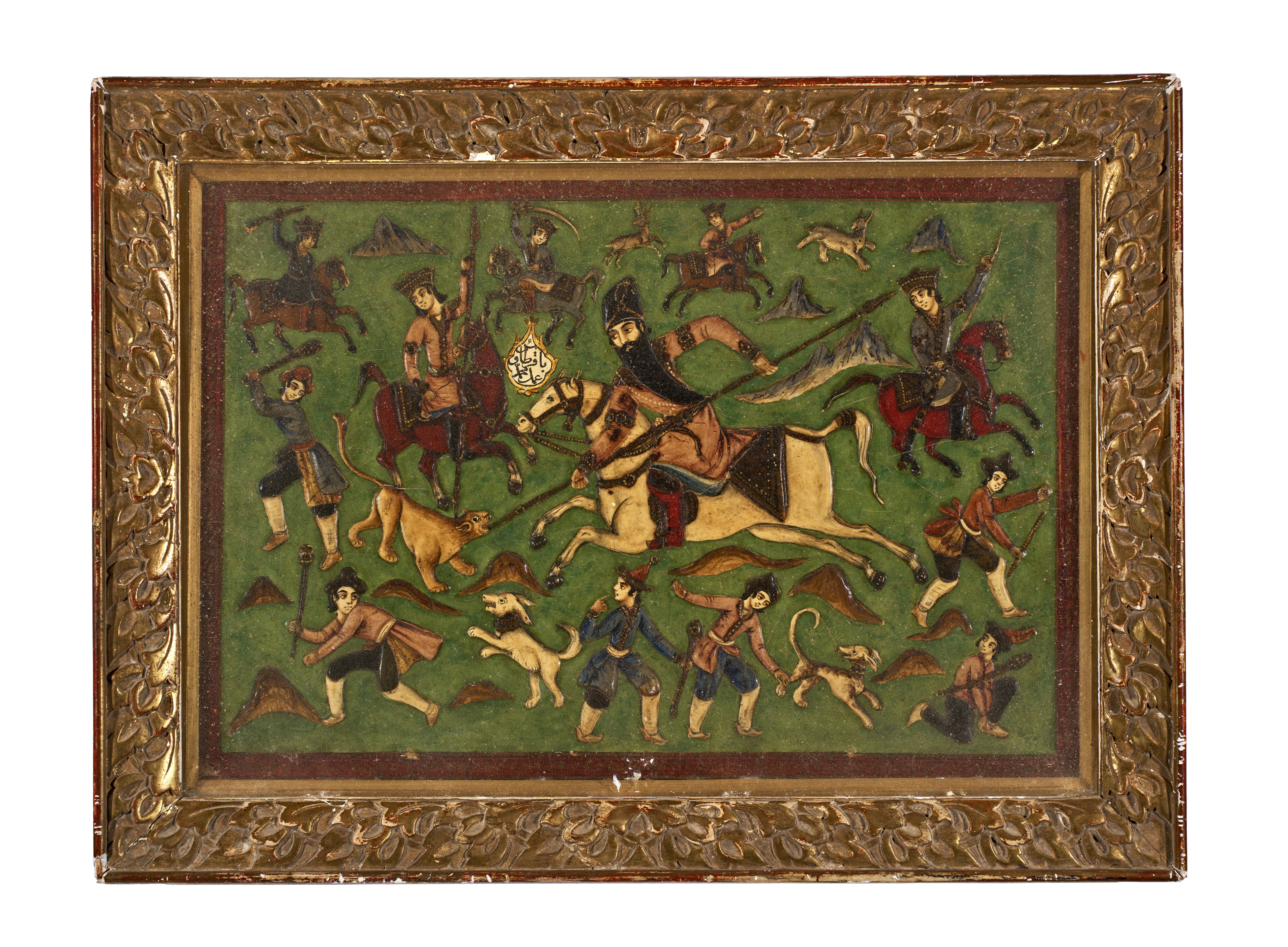 Of rectangular form, moulded and decorated in polychrome and gilt with Fath ‘Ali Shah Qajar hunting in a landscape surrounded by his retinue, an inscription-filled cartouche to his left, all within a foliate border, framed