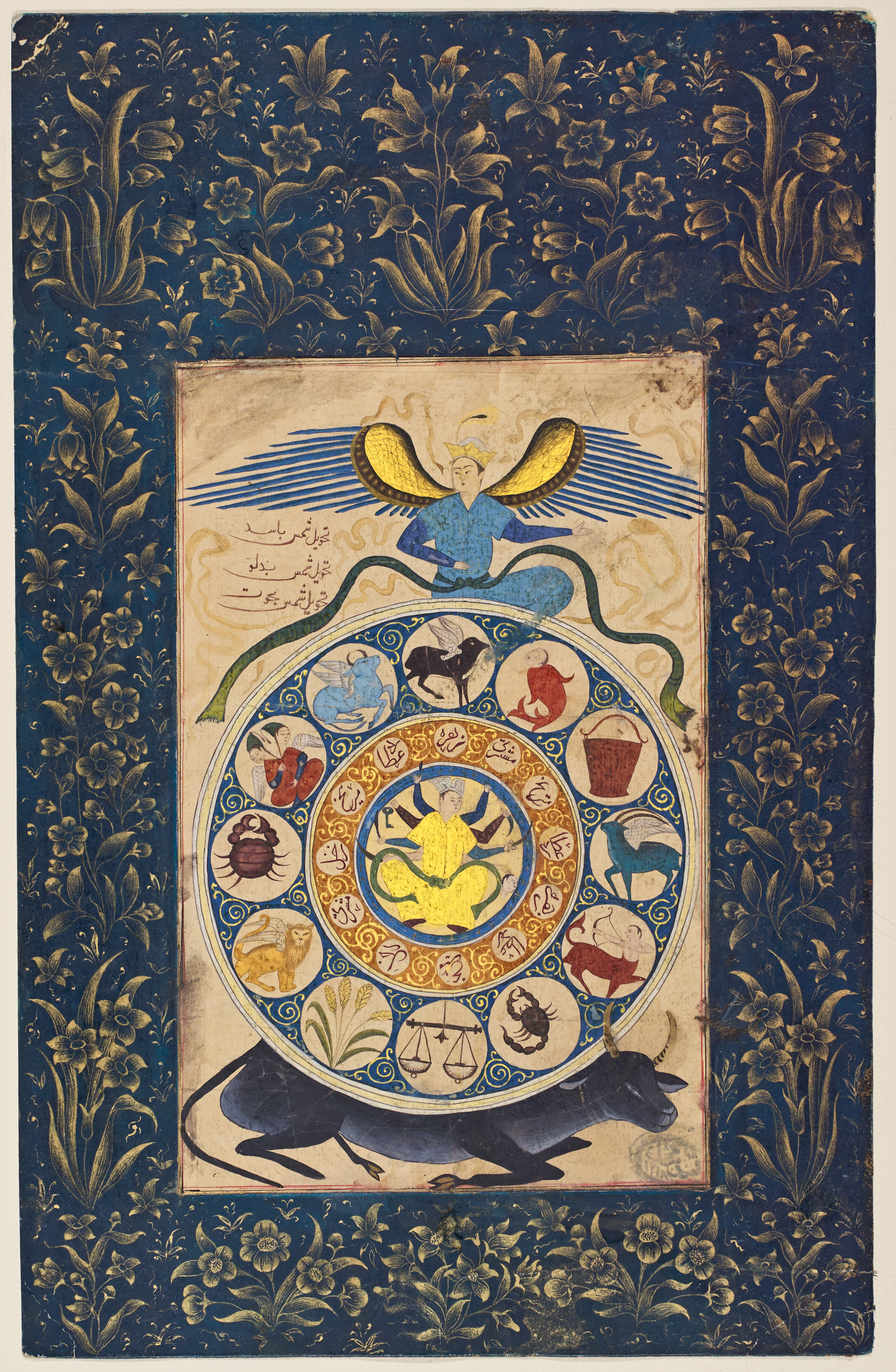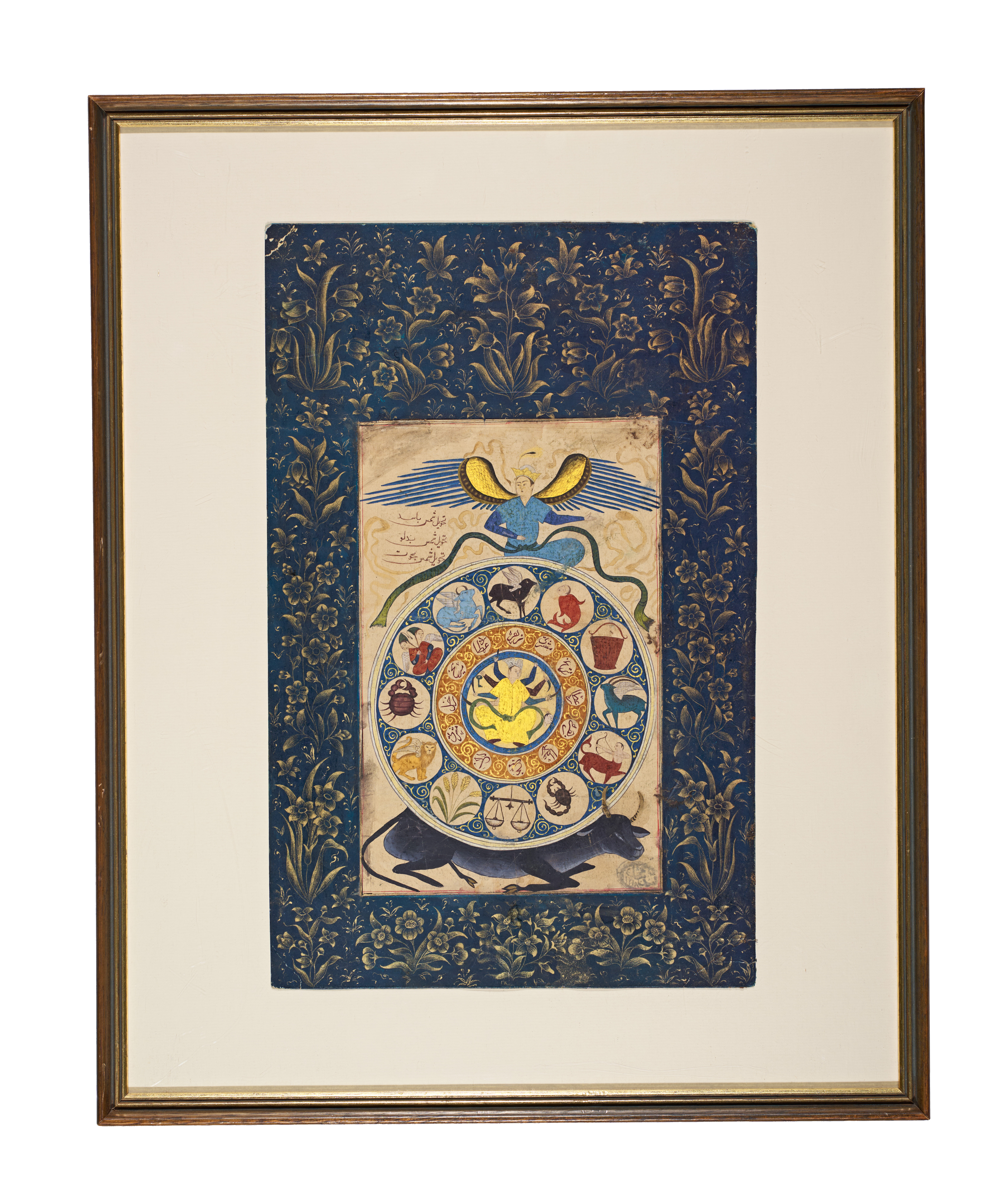 Presented in a later frame, the painting retains strong colours with areas of age-related wear consistent with its period. A striking and sophisticated example of Safavid astrological imagery, it would make a compelling addition to any collection of Persian manuscripts or Islamic art.