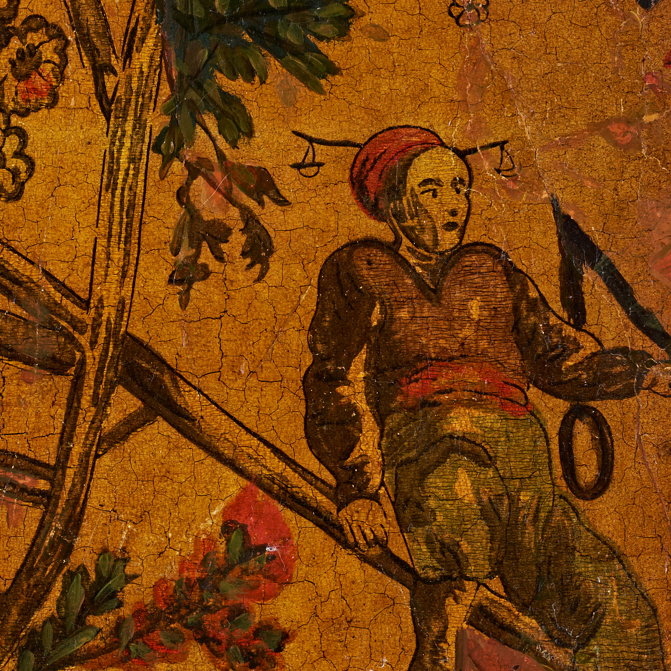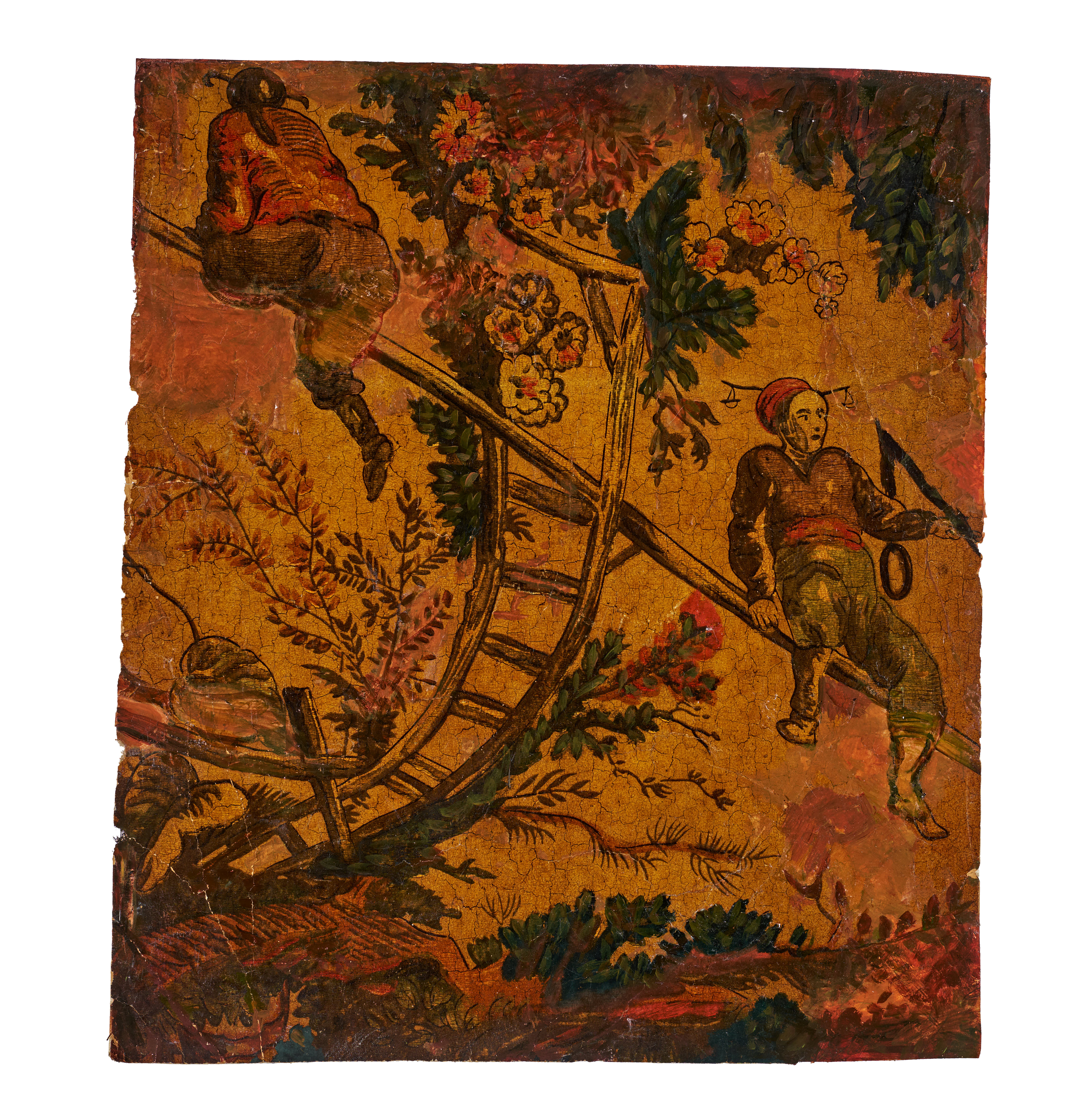 This finely executed oil on canvas depicts an intricate scene featuring two figures positioned on a large, curved wooden structure resembling a ladder or agricultural apparatus, surrounded by richly painted foliage and blossoms. The warm ochre ground enhances the vibrancy of the floral details, while the expressive poses of the figures add a sense of movement and narrative. The work displays characteristic craquelure consistent with its age, along with areas of wear that attest to its historical authenticity. Likely produced for the export market during the late Qing period, this rare example of early Chinese oil painting reflects both traditional Chinese decorative motifs and Western-influenced techniques. A distinctive and unusual artwork, it offers collectors a compelling glimpse into the cross-cultural artistic exchanges of the late 18th to early 19th century.