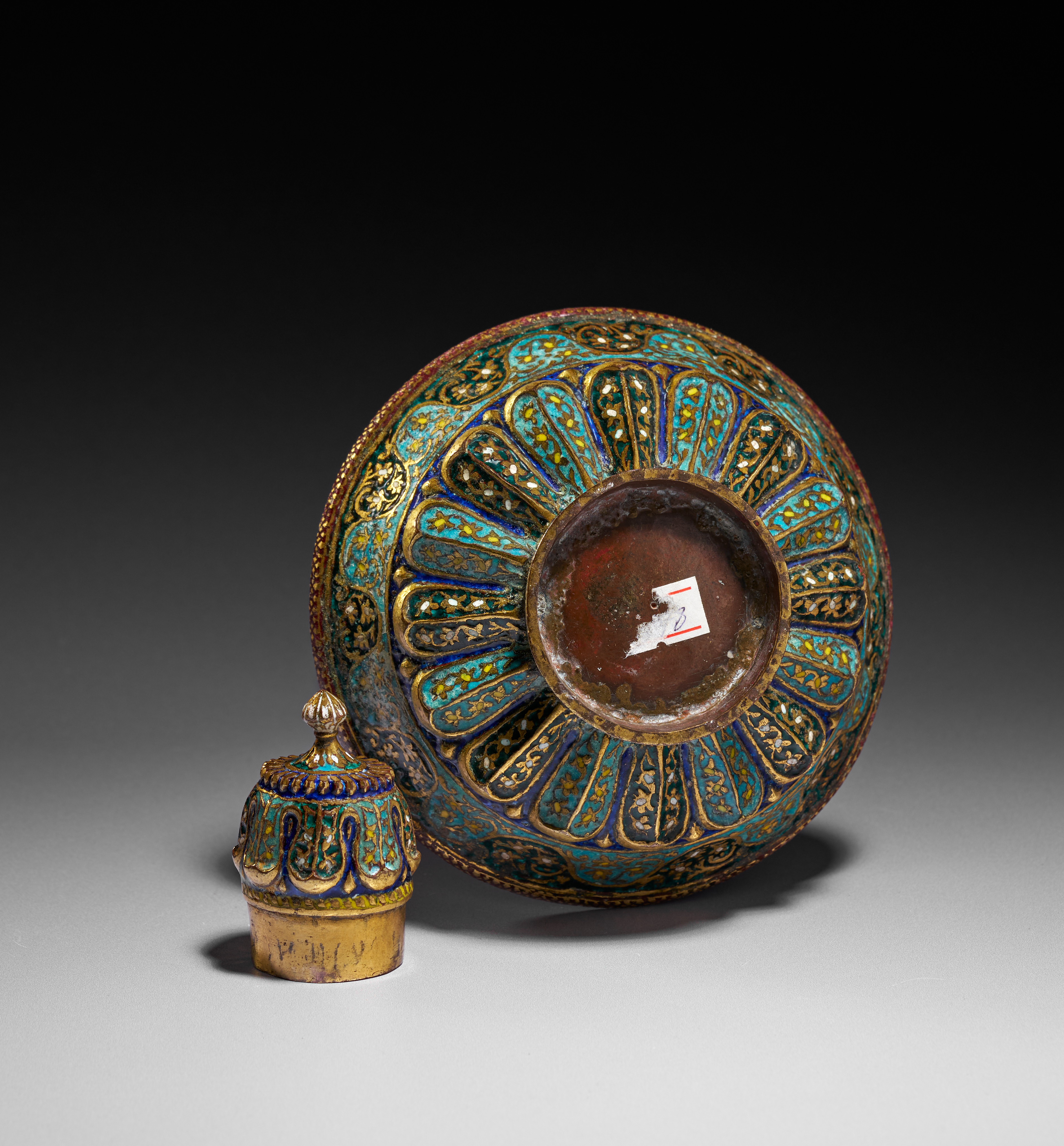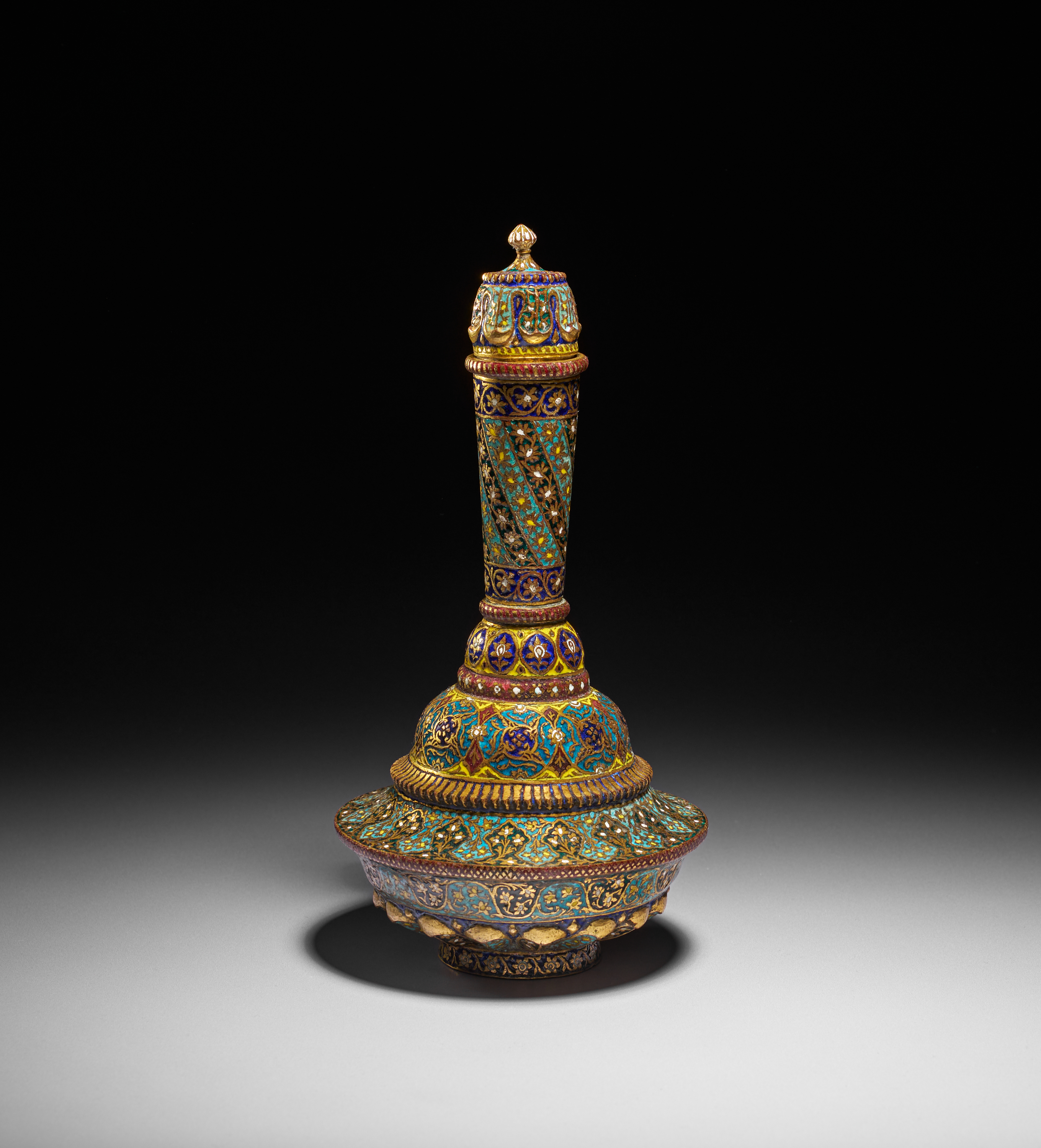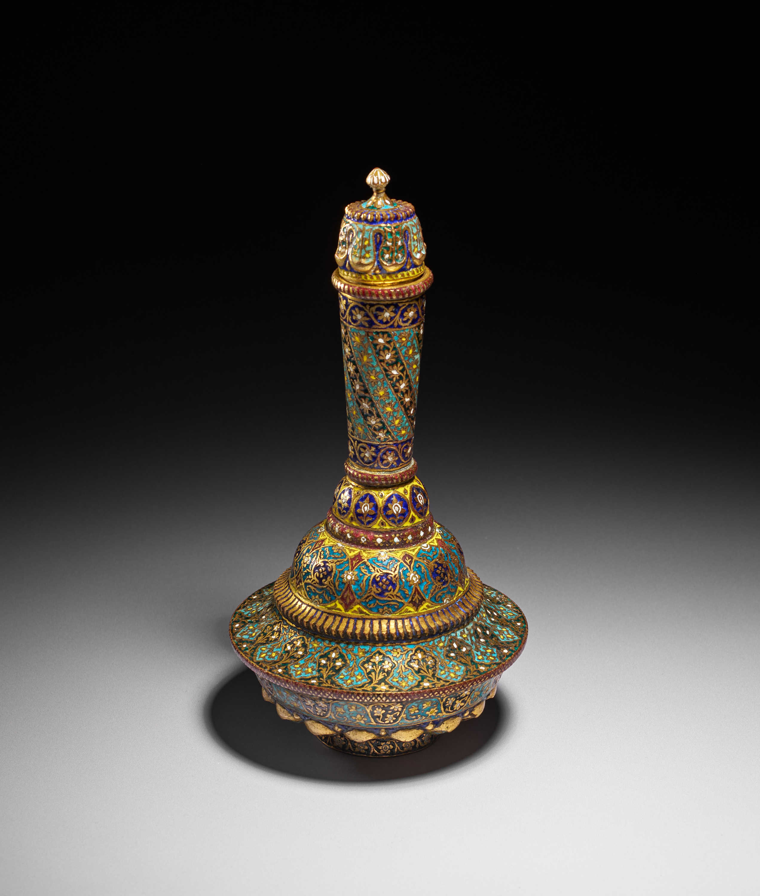 The body features alternating panels of scrolling foliate motifs, delicate floral sprays, and repeating petal-like lobes that radiate harmoniously from the foot. The neck is embellished with diagonal bands of intricate floral patterns, framed by narrow gilt borders, while the cover echoes the same lavish palette and ornamental vocabulary. The underside is similarly worked with dense enamelled decoration, demonstrating the remarkable craftsmanship typical of Kashmiri metalworkers of the period.