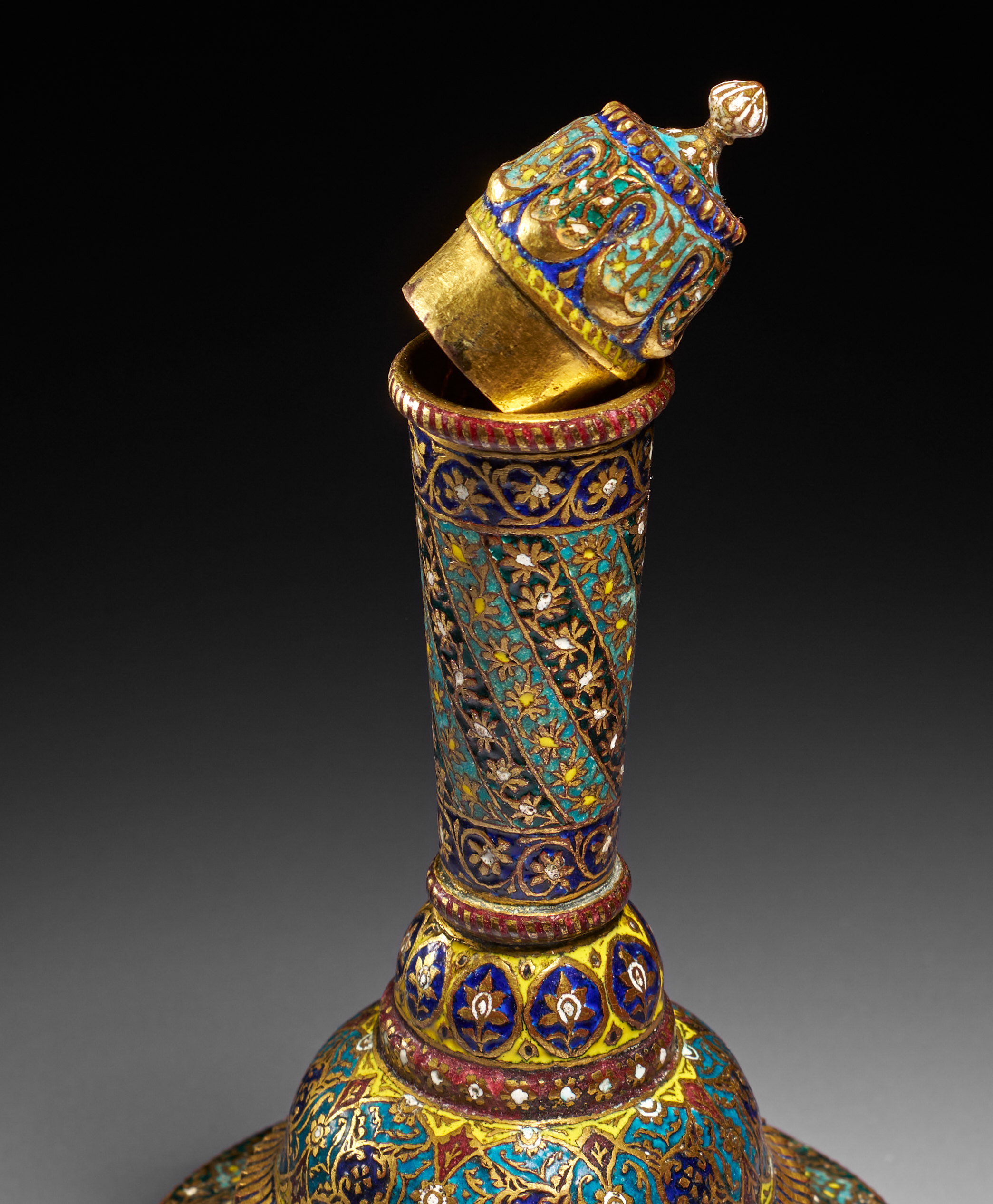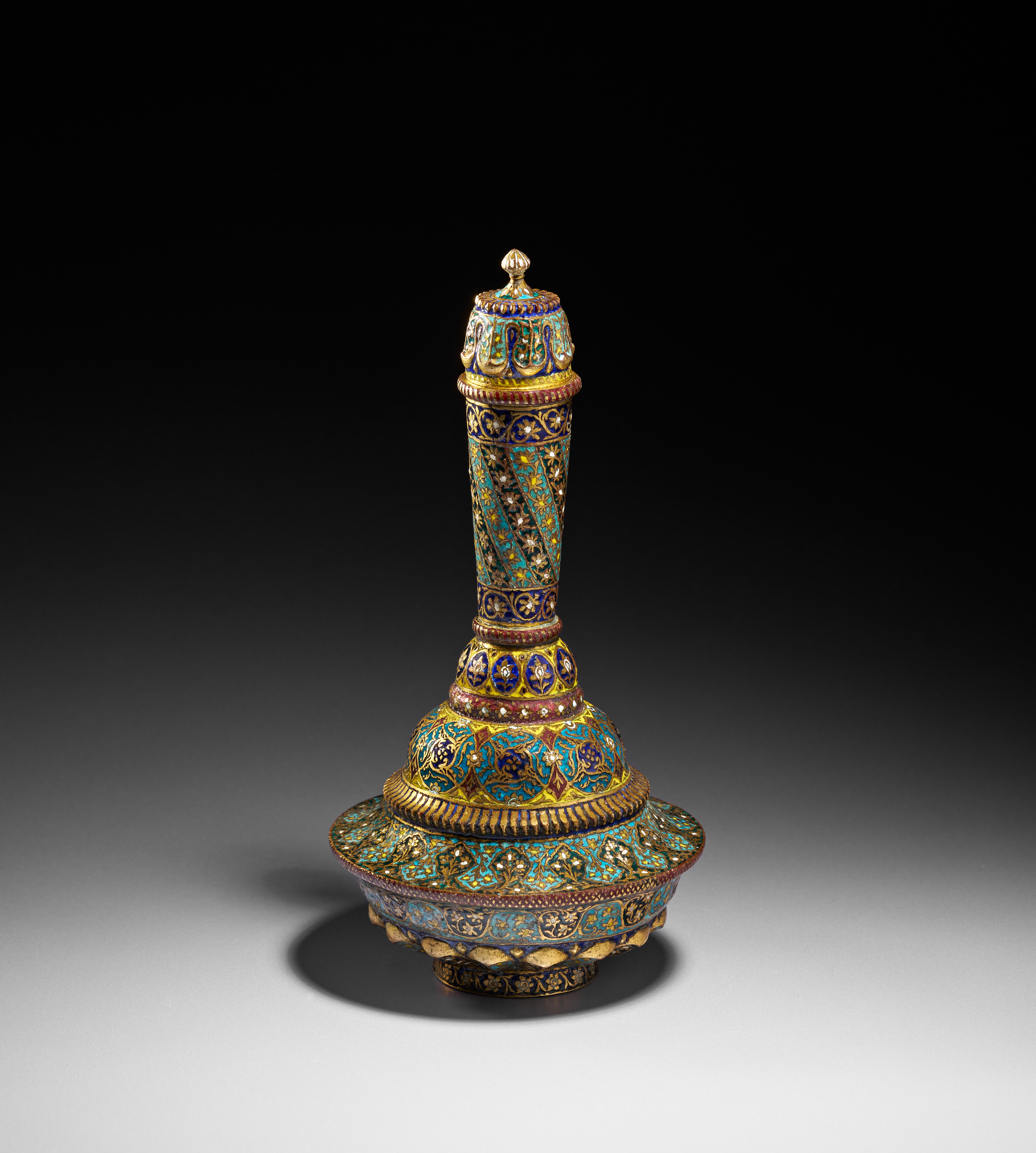 This richly decorated surahi exemplifies the luxurious gilt-copper enamelware for which 19th-century Kashmir was celebrated. The vessel is composed of a flaring, domed base rising to an elongated neck, and is fitted with a finely matched domed cover surmounted by a gilt finial. Every surface is adorned with vibrant polychrome enamels in shades of turquoise, cobalt blue, emerald, and crimson, all set against glistening gilt grounds.