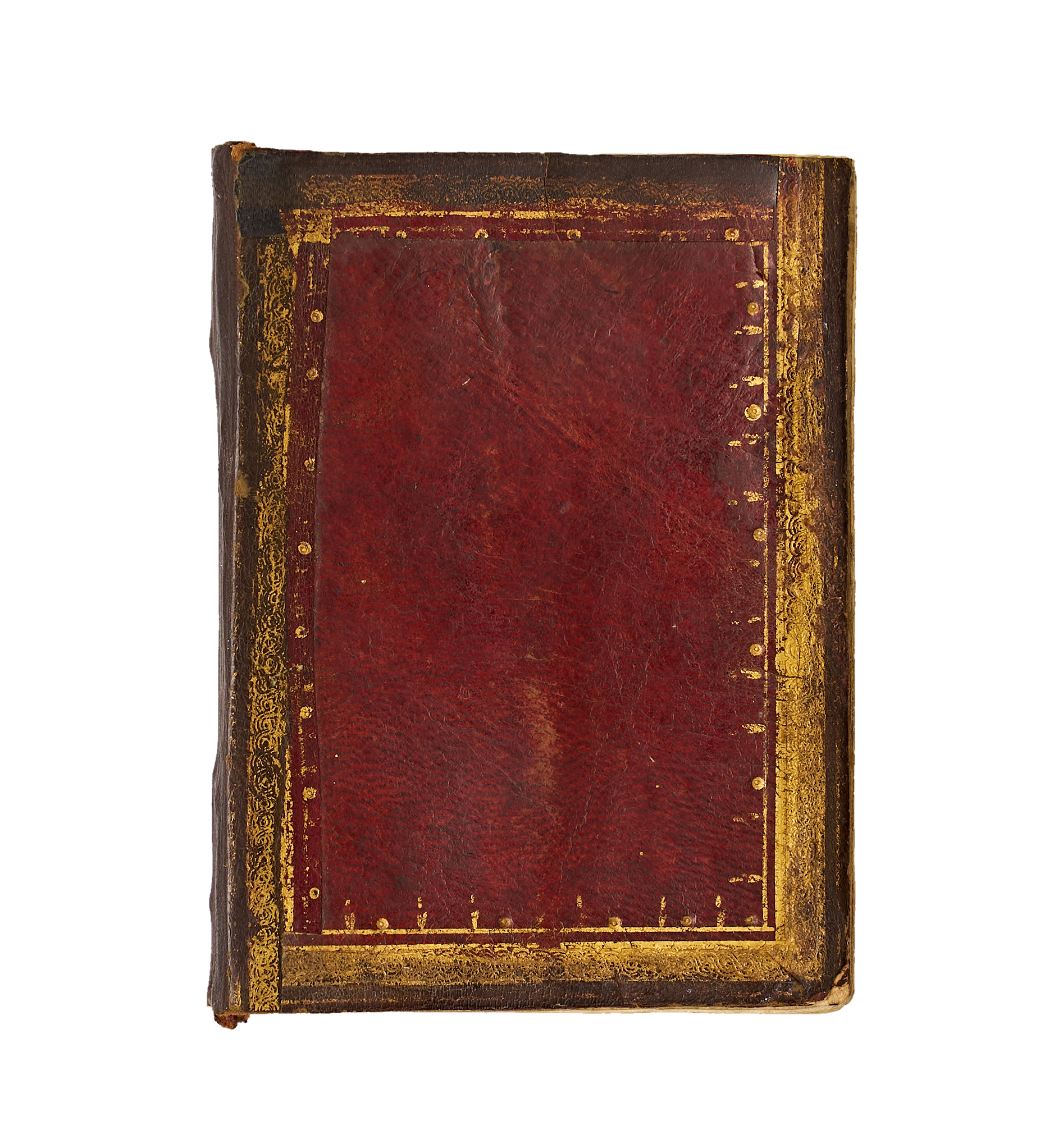 The volume retains its original Ottoman binding of deep red tooled leather, with a central medallion and gilt border decorations, and marbled and block-printed endpapers.