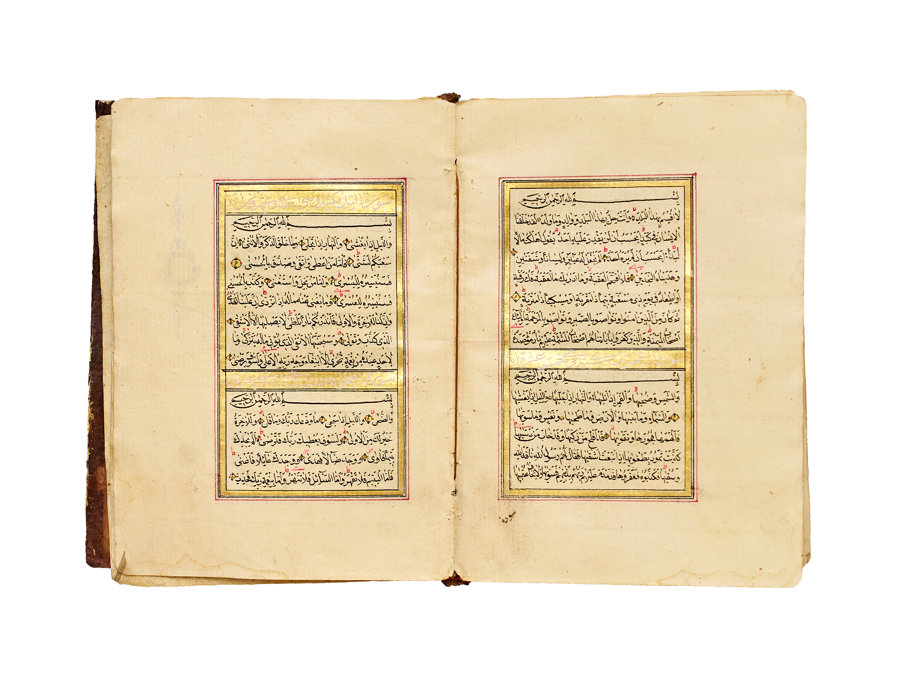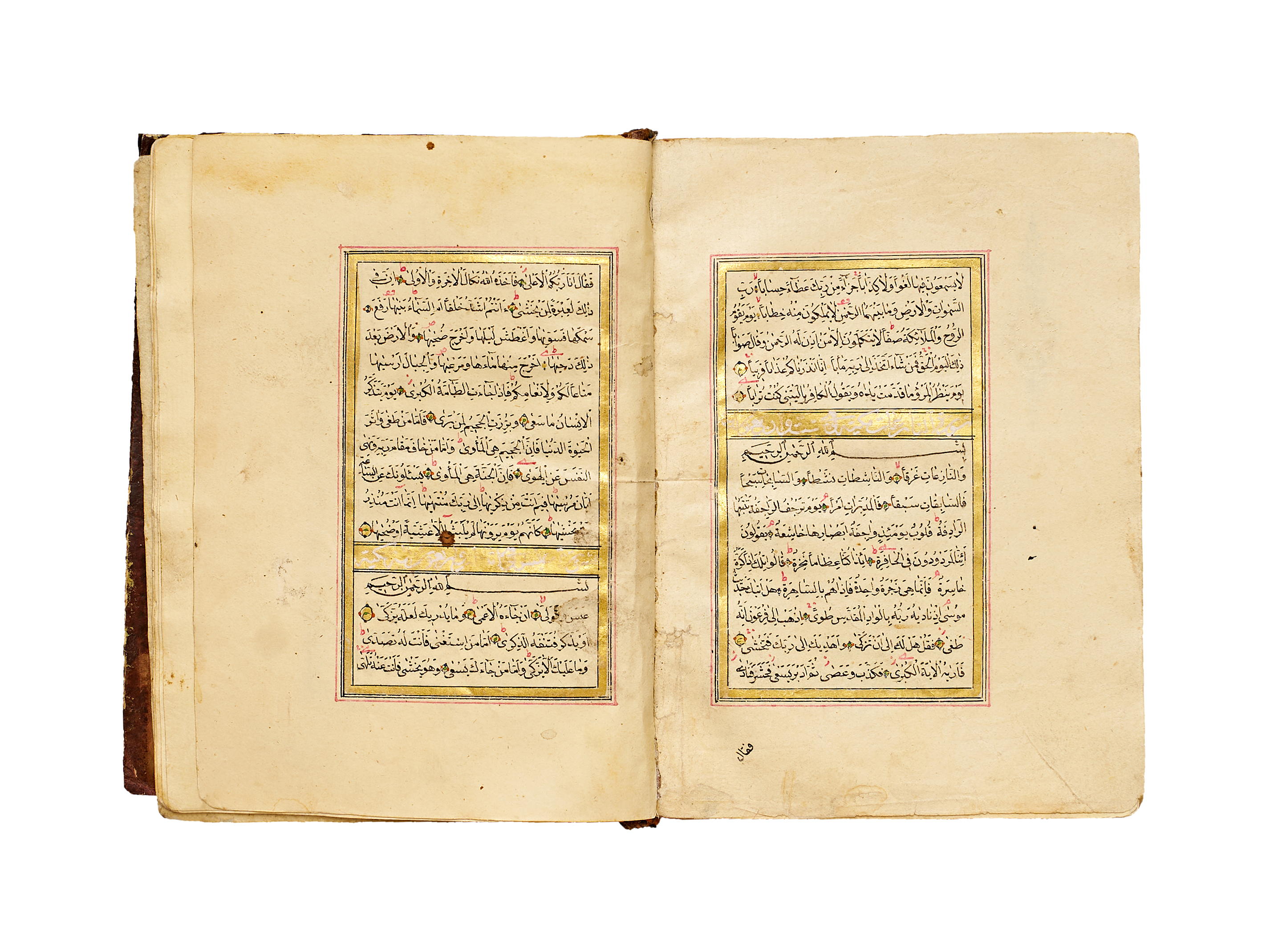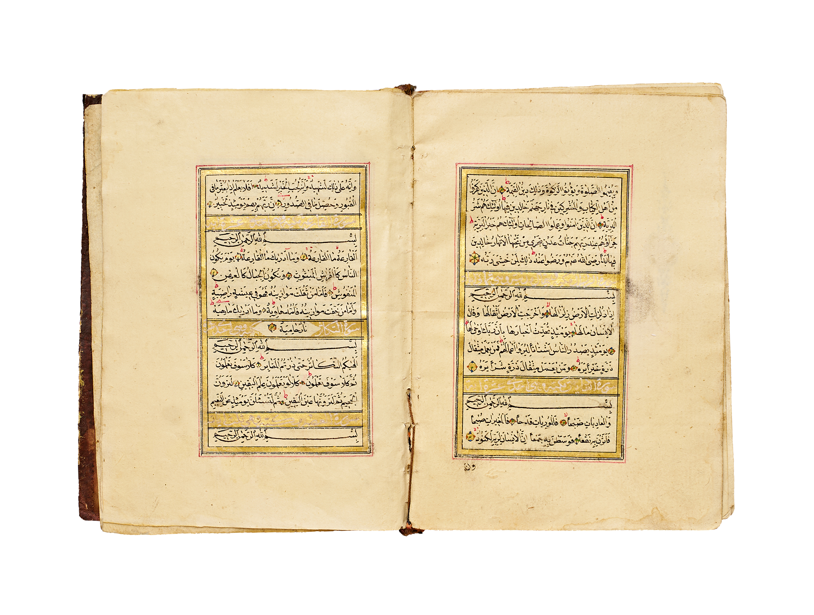 The text is written in a fine naskh script in black ink, with verse markers in gold and red, and surah headings highlighted within gilded panels. Each page is elegantly framed in red and gold rulings. The manuscript exhibits the balanced calligraphic style and delicate ornamentation typical of Qur’ans produced under Ottoman patronage in the mid-19th century.