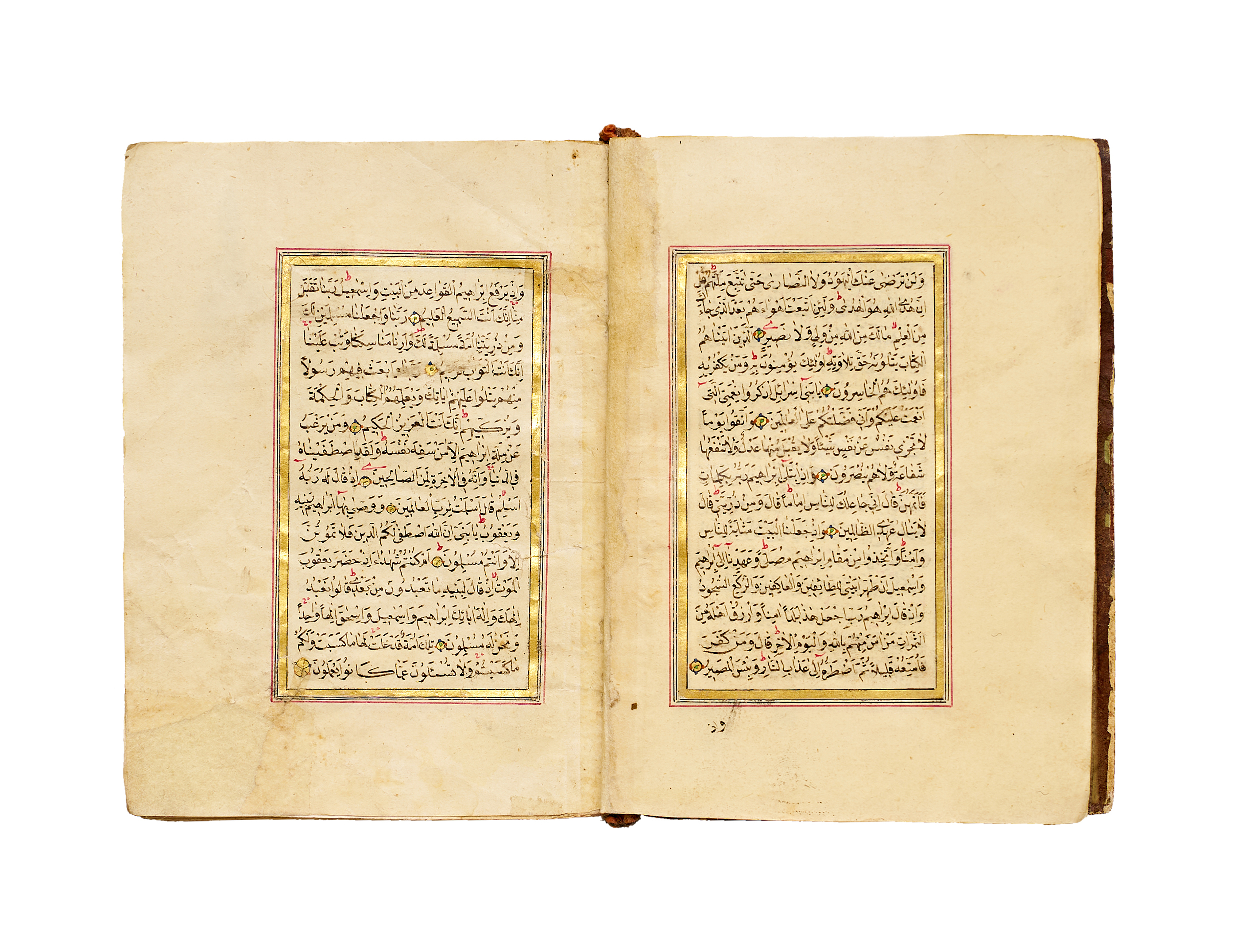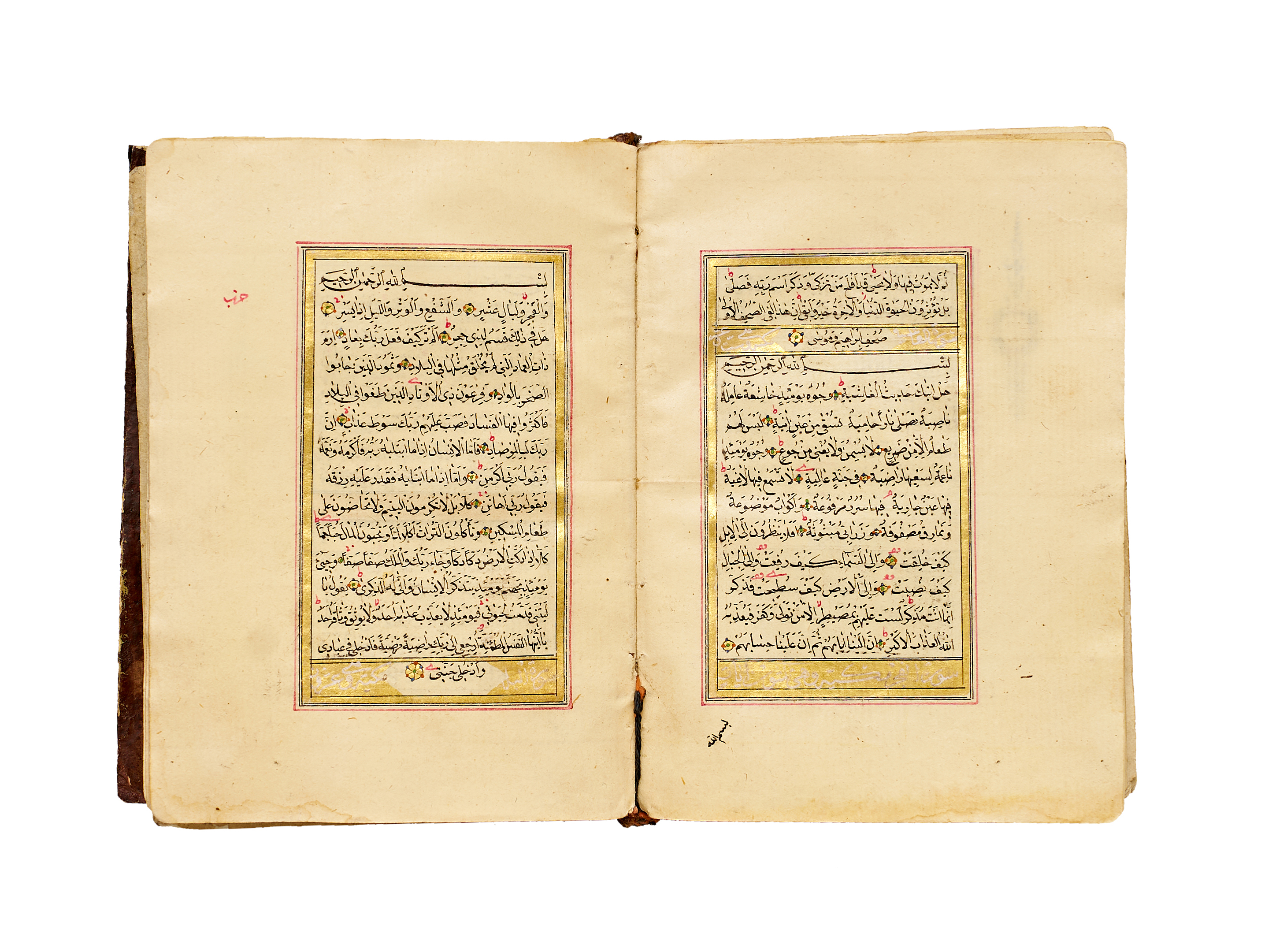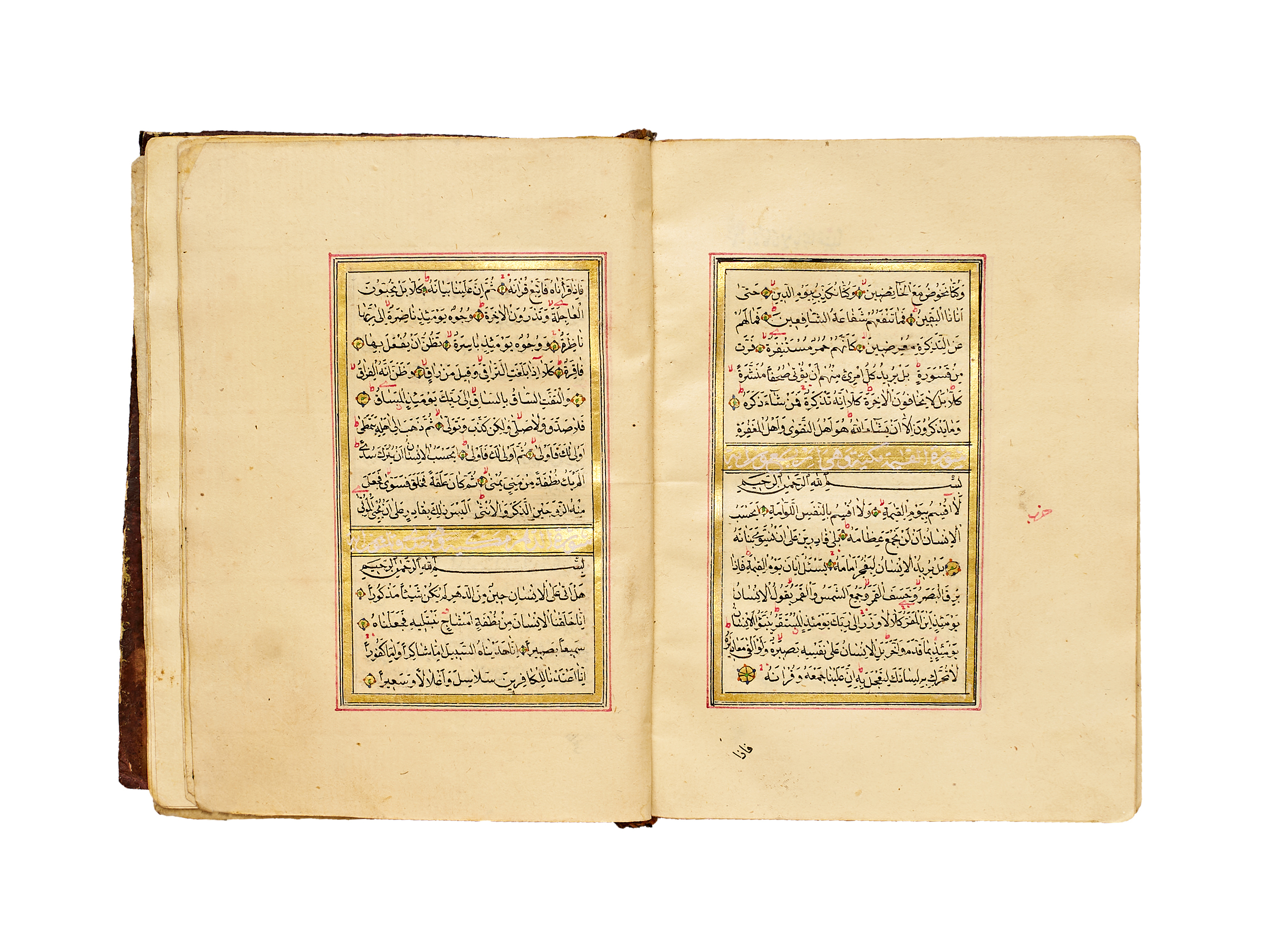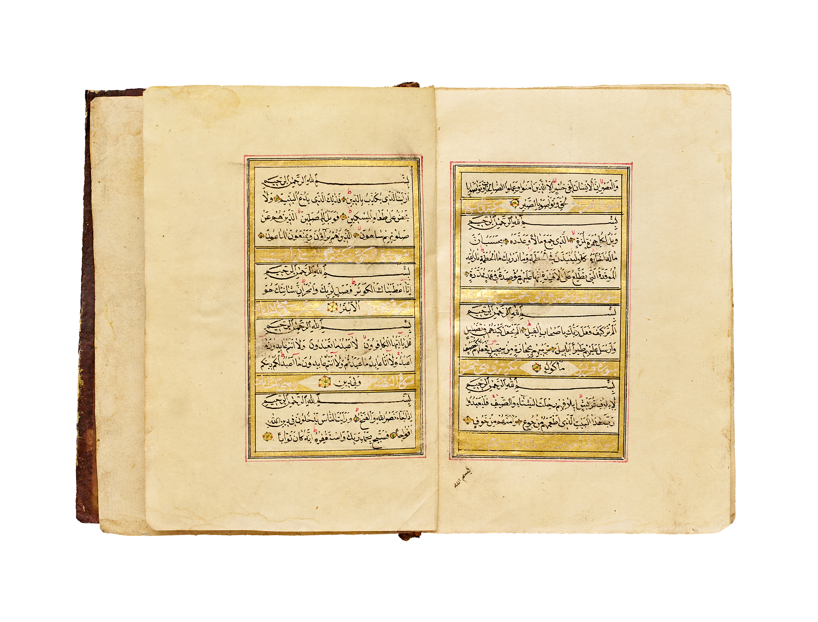 The text is written in a fine naskh script in black ink, with verse markers in gold and red, and surah headings highlighted within gilded panels. Each page is elegantly framed in red and gold rulings. The manuscript exhibits the balanced calligraphic style and delicate ornamentation typical of Qur’ans produced under Ottoman patronage in the mid-19th century.