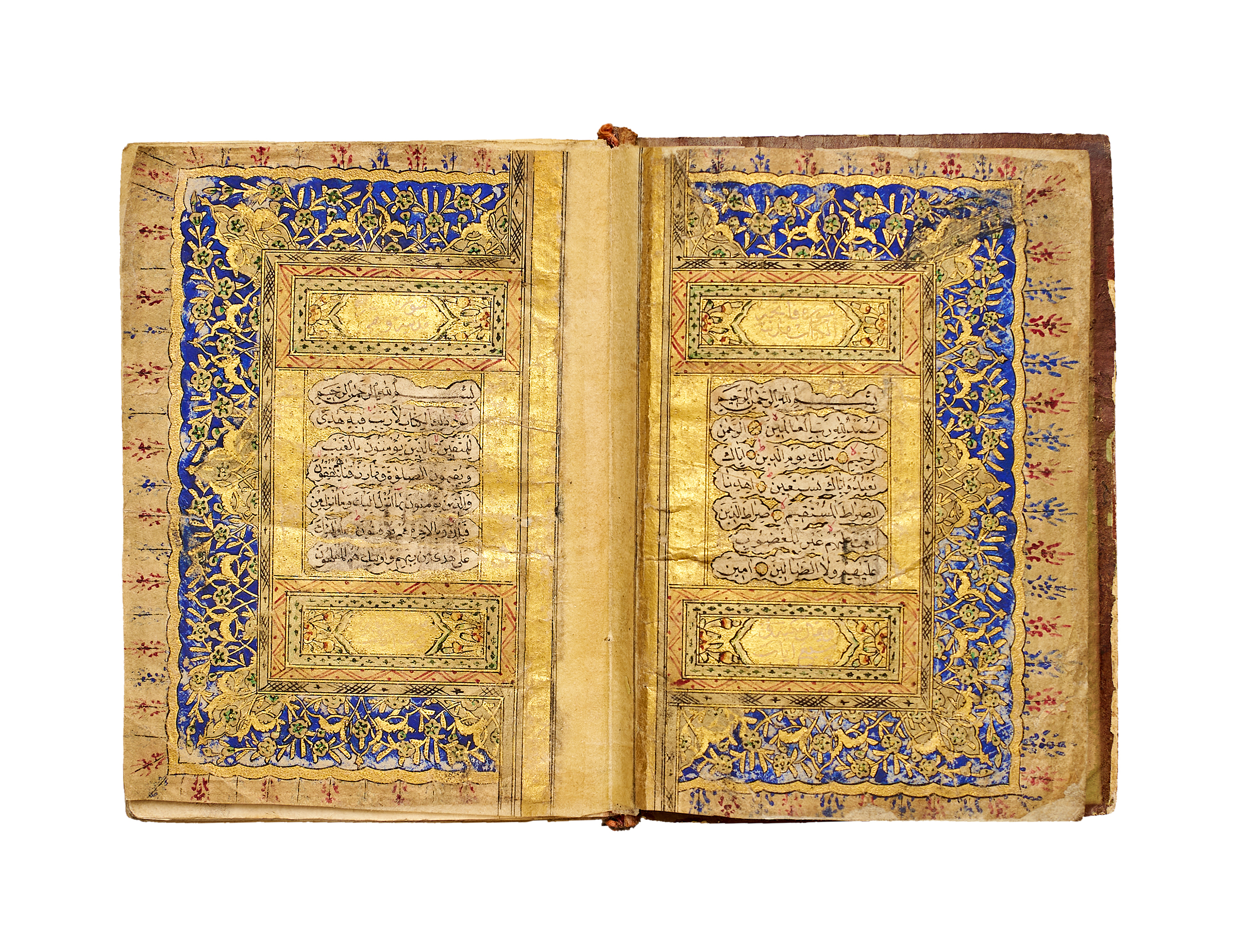 The manuscript opens with a magnificent double-page frontispiece lavishly decorated in gold and deep cobalt blue, featuring dense floral arabesques and intricate geometric panels surrounding the sacred text. The illumination is enhanced with delicate red and green detailing, exemplifying the refined aesthetic of 19th-century Ottoman Qur’anic manuscripts.