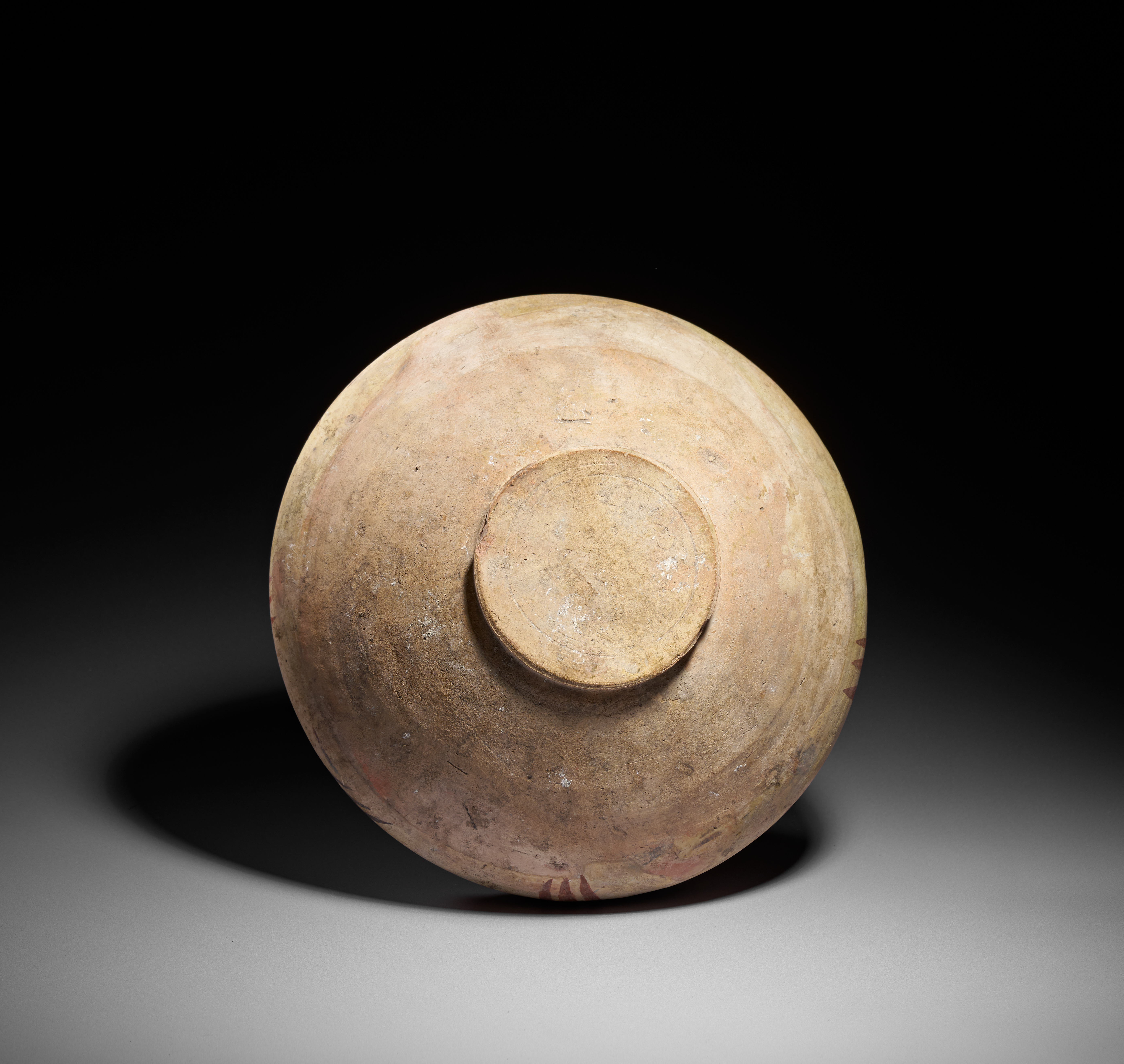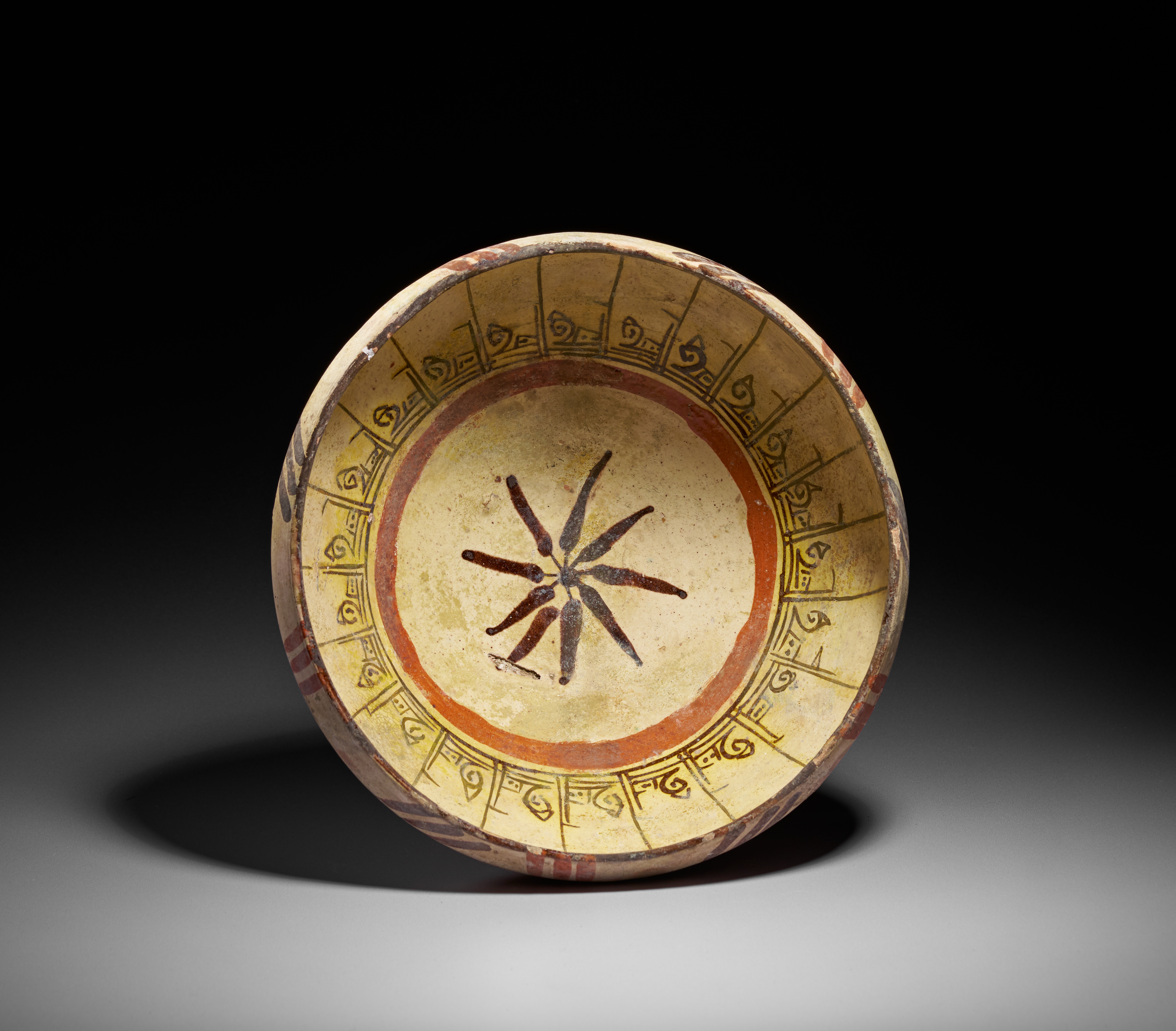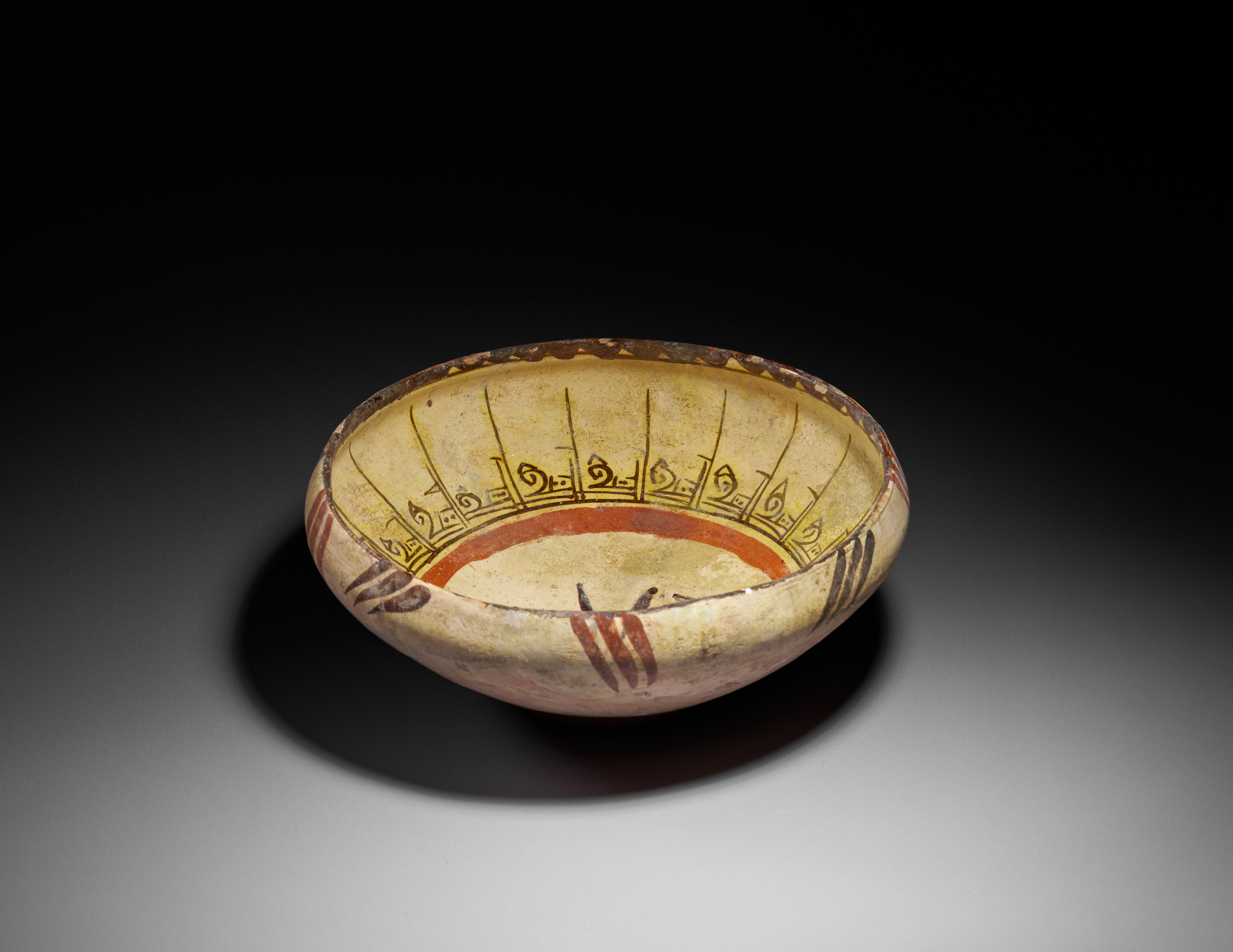 This finely painted earthenware bowl from Nishapur features a cream-toned interior decorated with a central eight-pointed star motif rendered in deep brown slip. The design is framed by a bold red band and an elegant register of stylized geometric scrolls in black, radiating upward toward the rim. The exterior shows subtle brush-painted accents, while the underside retains its original, unglazed surface typical of early Islamic pottery from northeastern Iran. Exhibiting the characteristic aesthetic of Samanid-period ceramics—balance, clarity, and rhythmic ornamentation—this bowl is a distinguished example of Nishapur’s celebrated craftsmanship. Its well-preserved decoration and harmonious proportions make it a highly desirable piece for collectors of early Islamic art and pottery.
