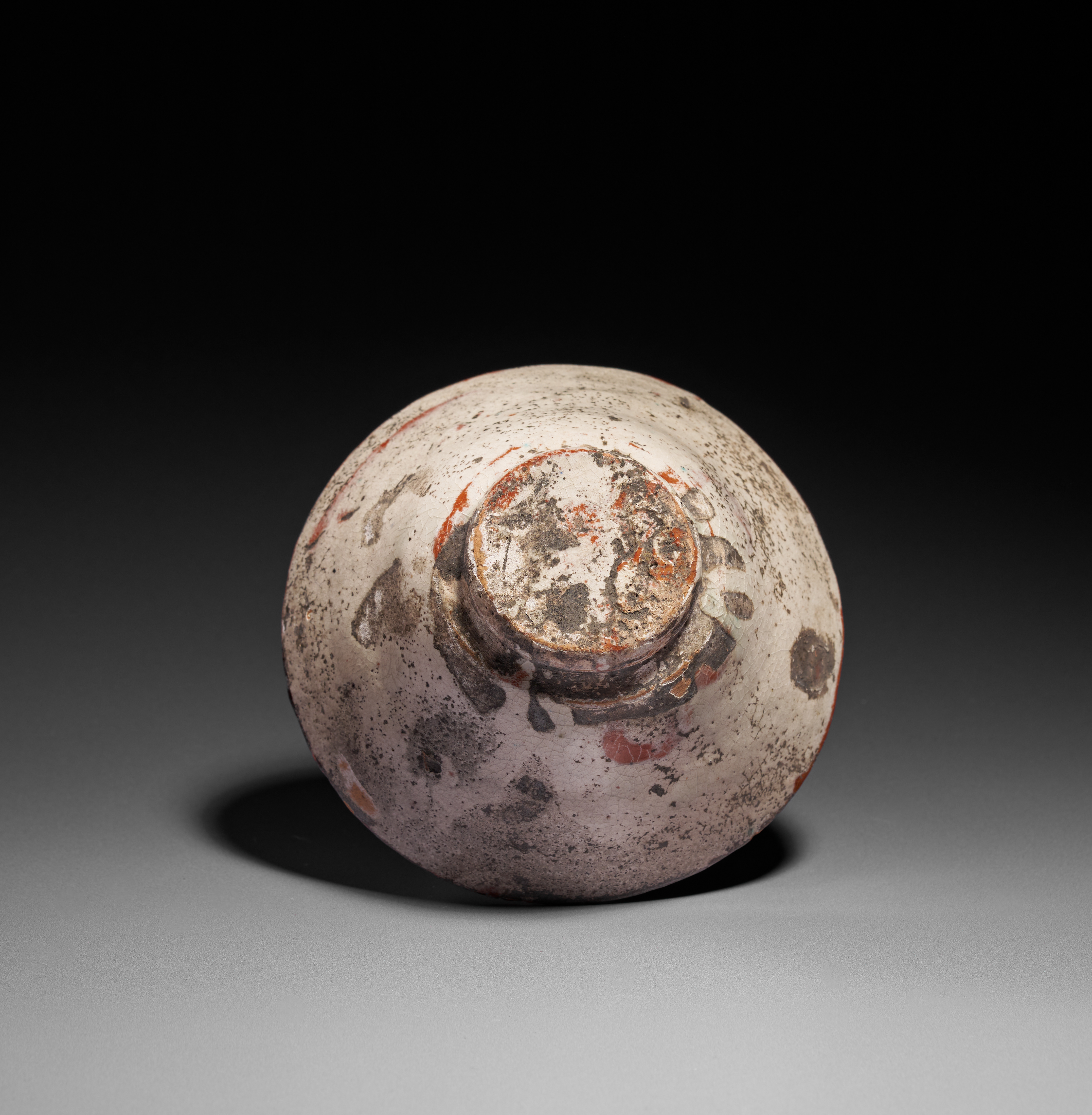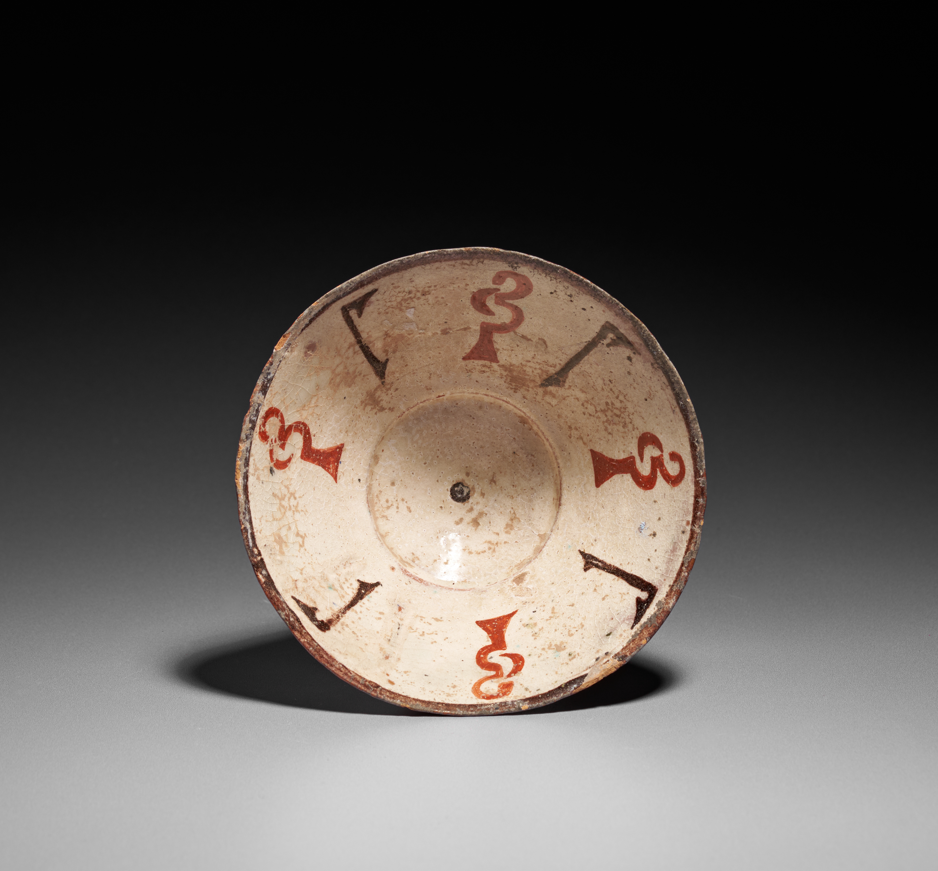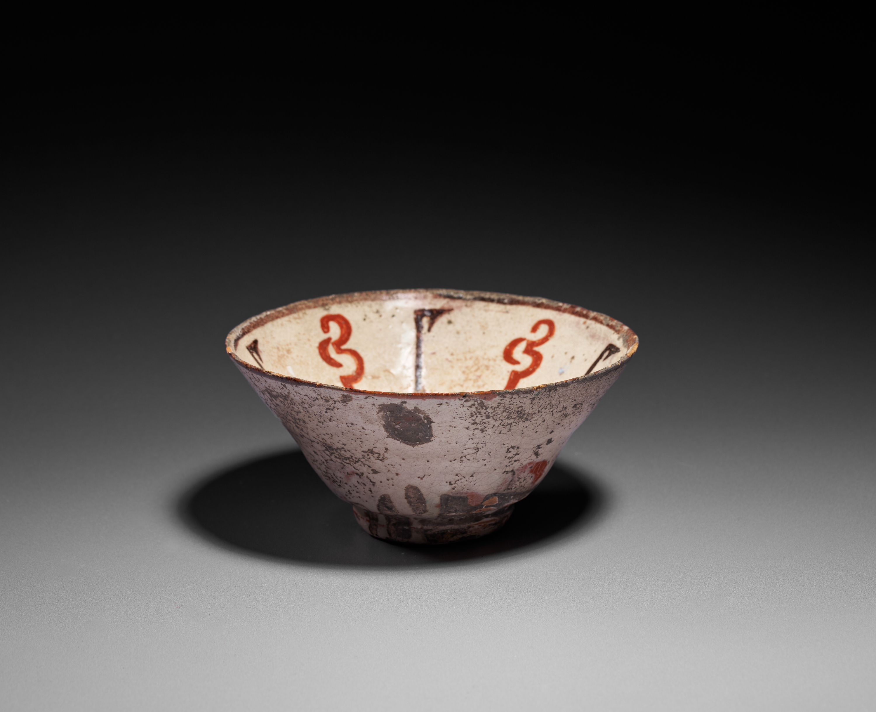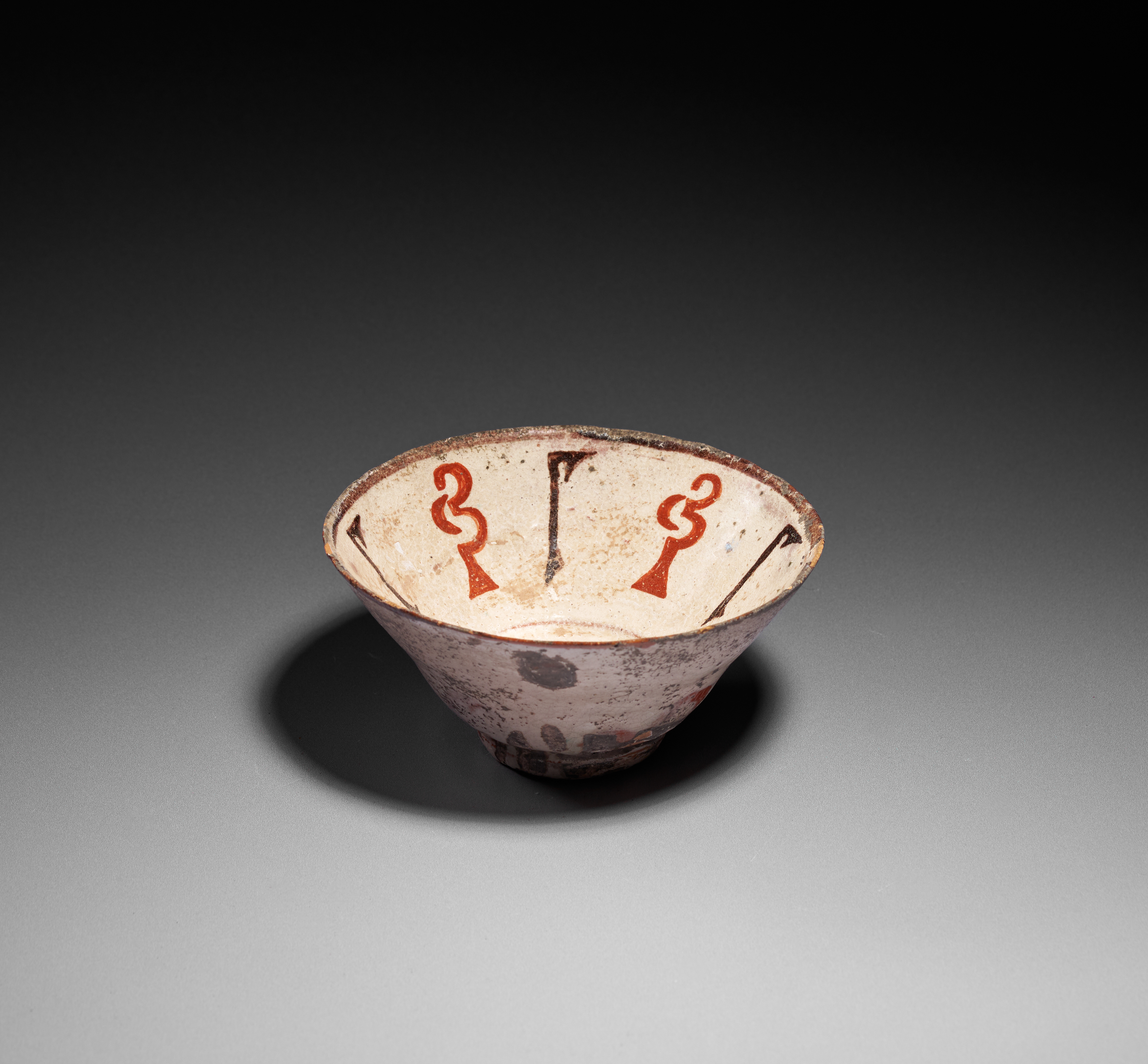 This elegant slip-painted bowl exemplifies the refined aesthetics of Samanid-period ceramics. The interior is decorated with a series of bold, stylized red and black abstract motifs arranged in a rhythmic pattern around the walls, set against a pale cream slip ground. The design radiates outward from the gently rounded central well, creating a balanced and harmonious composition typical of early Islamic pottery. The exterior shows traces of original pigment and surface burial accretions, consistent with its age and archaeological origin. With its restrained palette, strong graphic elements, and well-preserved form, this bowl represents an excellent example of the artistic innovation found in 10th-century Central Asian ceramic workshops. A desirable piece for collectors of early Islamic art and Samanid pottery.