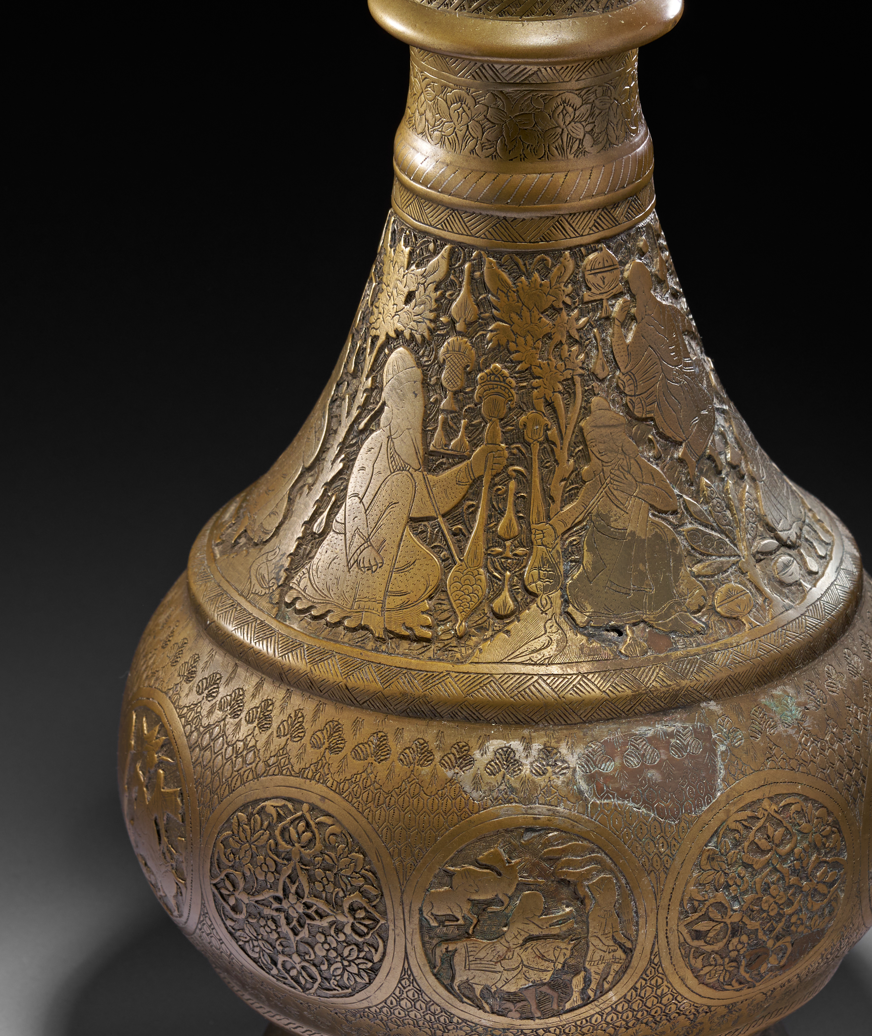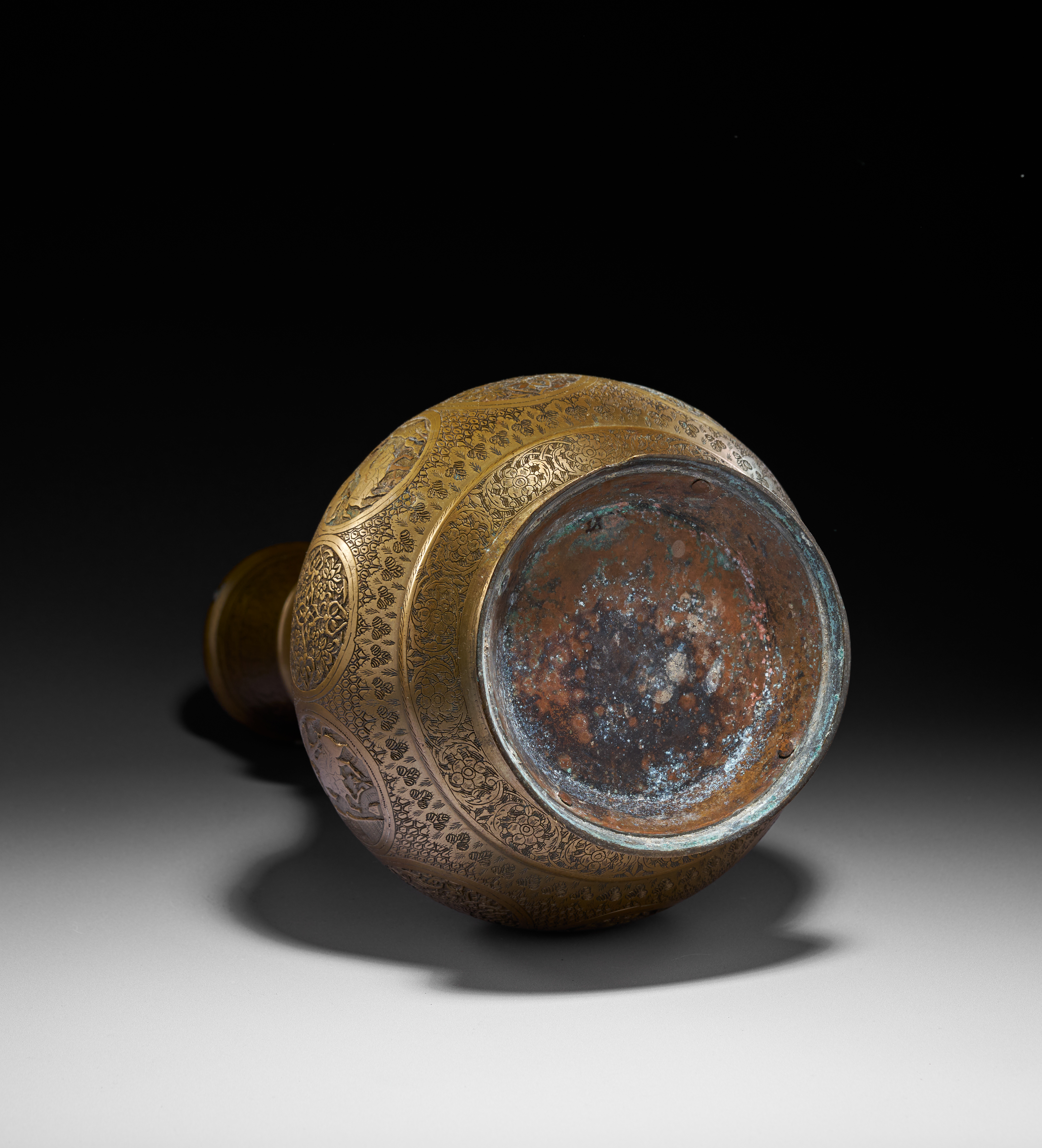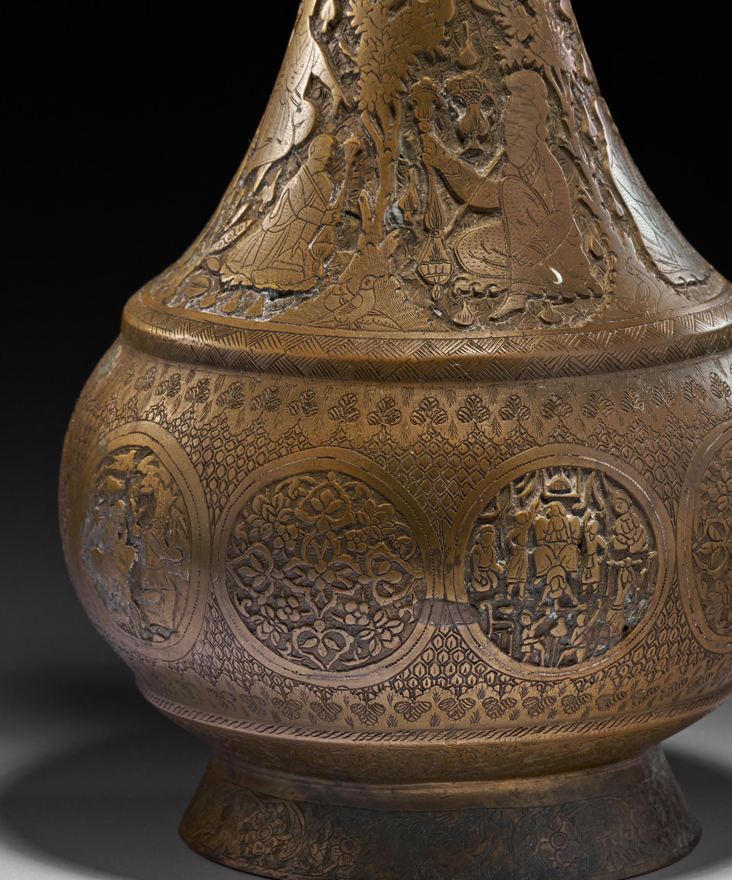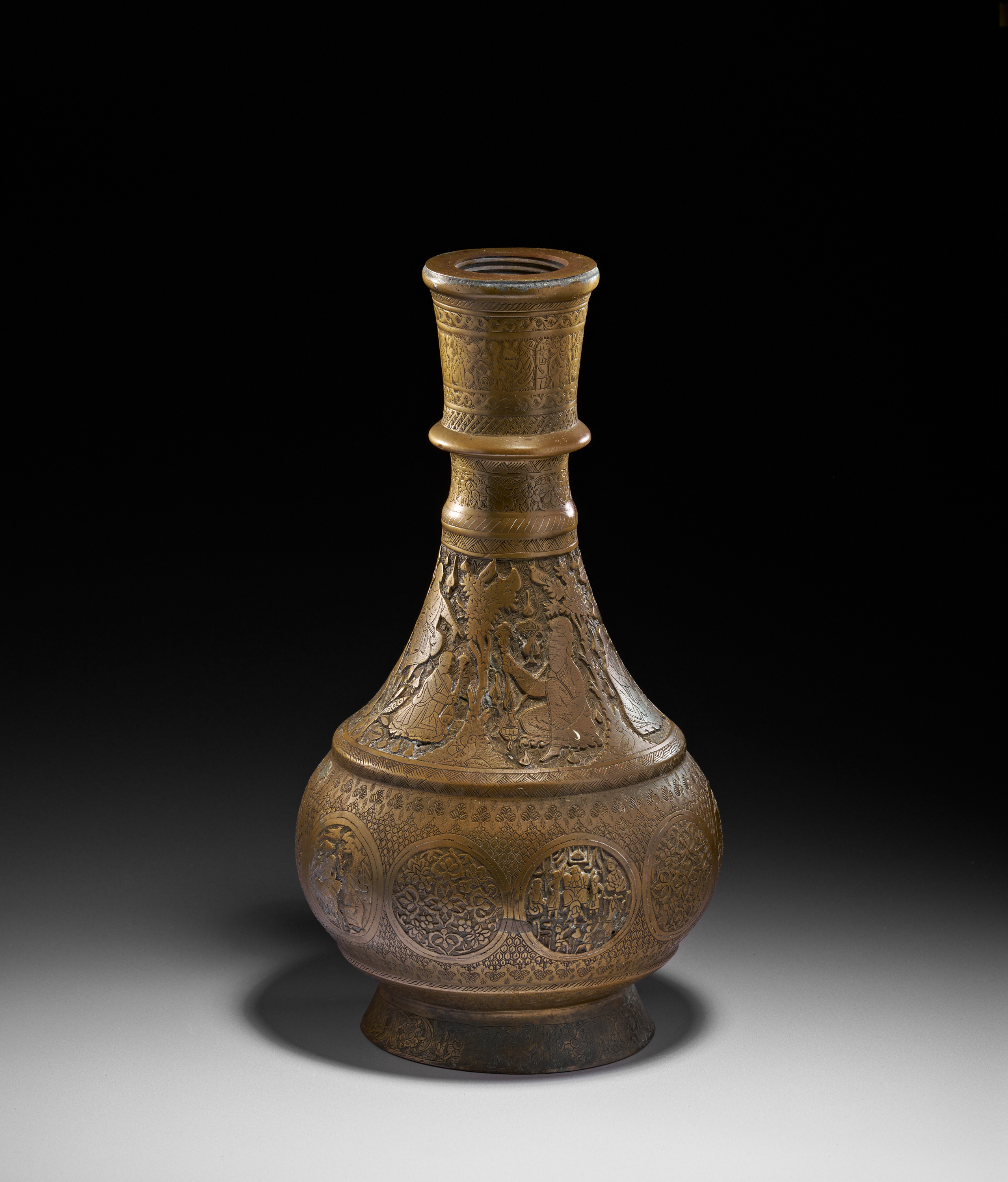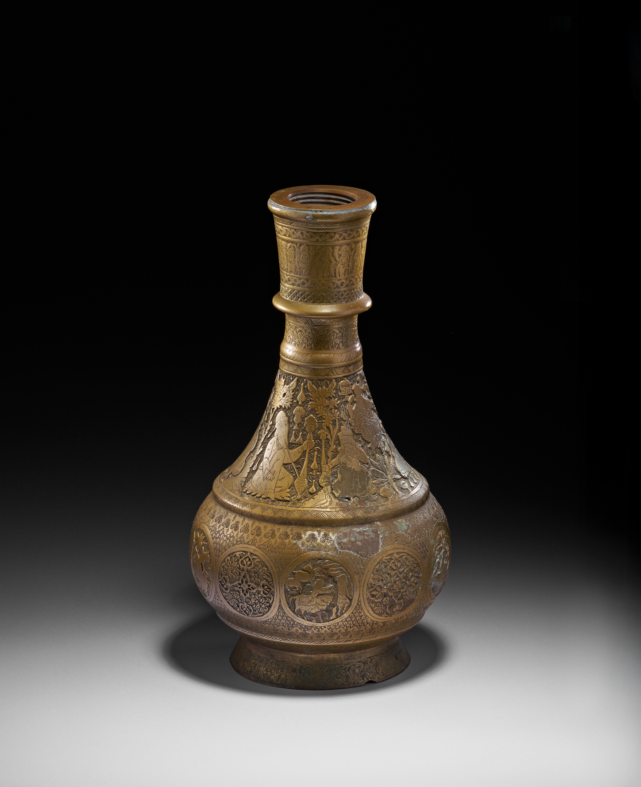A HEAVILY ENGRAVED BRASS PERSIAN HOOKAH BASE/VASE, QAJAR, 19TH CENTURY