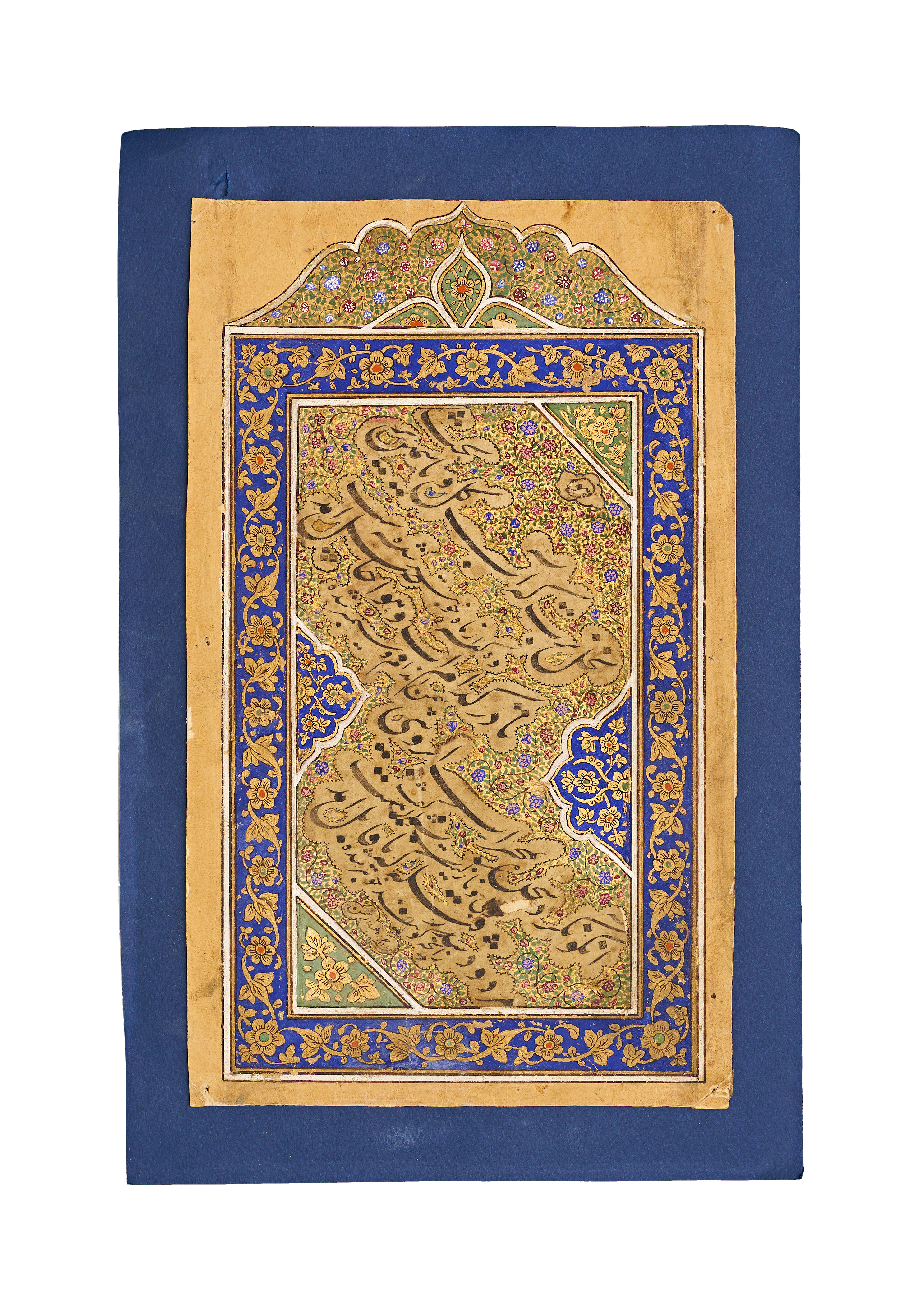 Executed in fluid black nasta‘liq script, the text is beautifully arranged in diagonal lines across a gilded and floral background densely ornamented with fine polychrome details in pink, blue, and green. The composition is framed by an exquisite border of deep blue adorned with gold floral motifs, enclosed within multiple gilt and colored rules. The upper portion of the frame features a delicately arched headpiece (sarloh) filled with intricate arabesque and floral decoration.