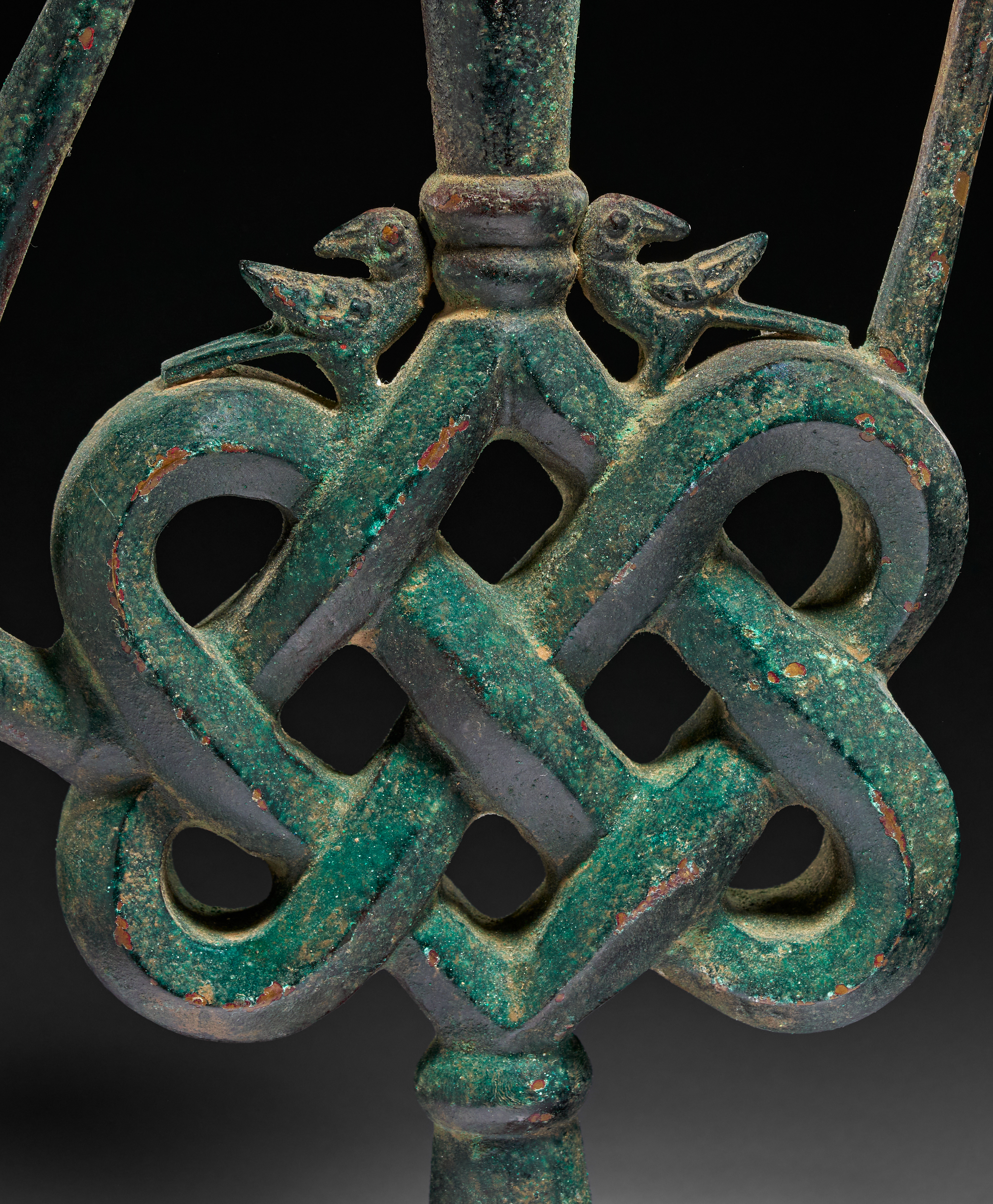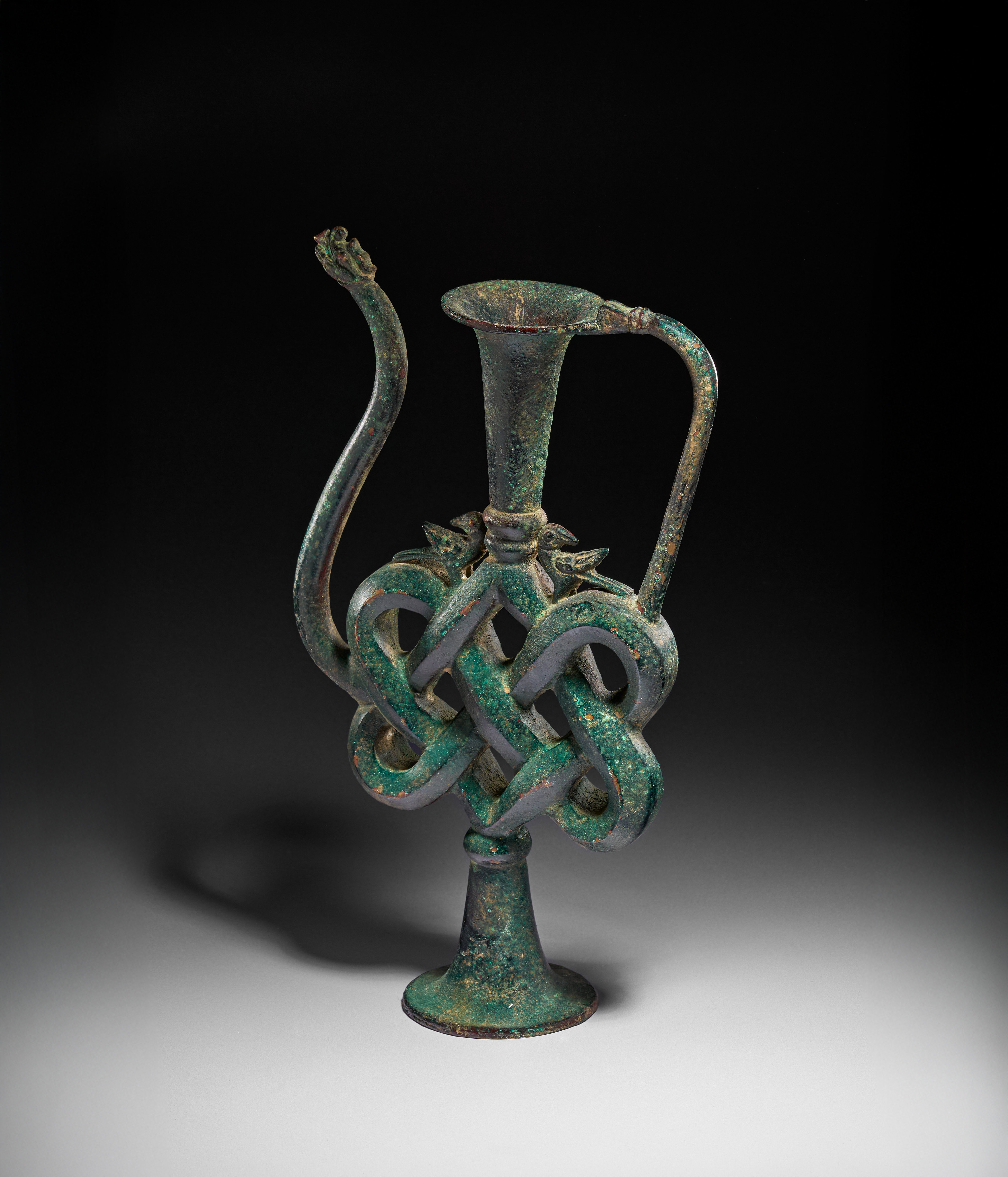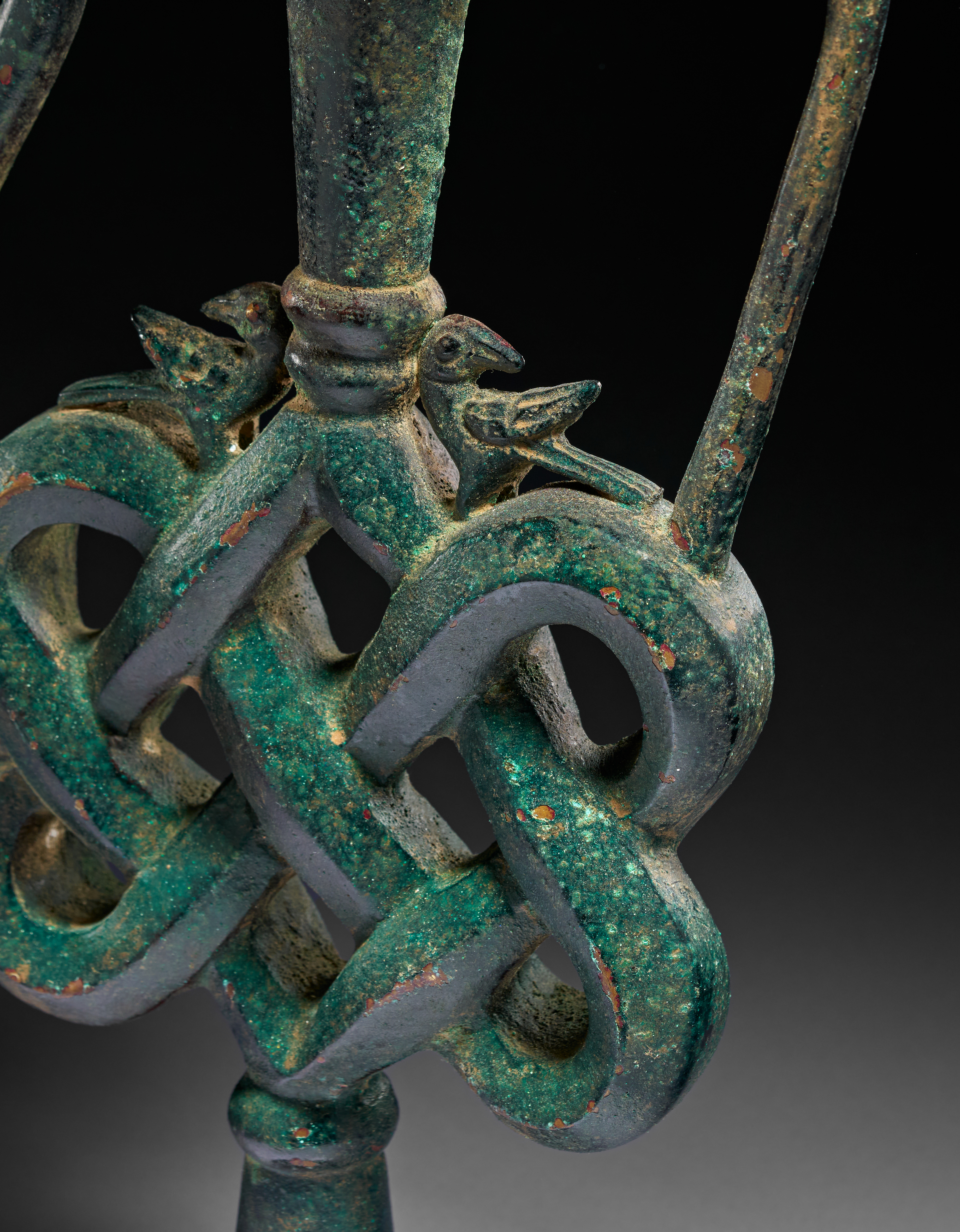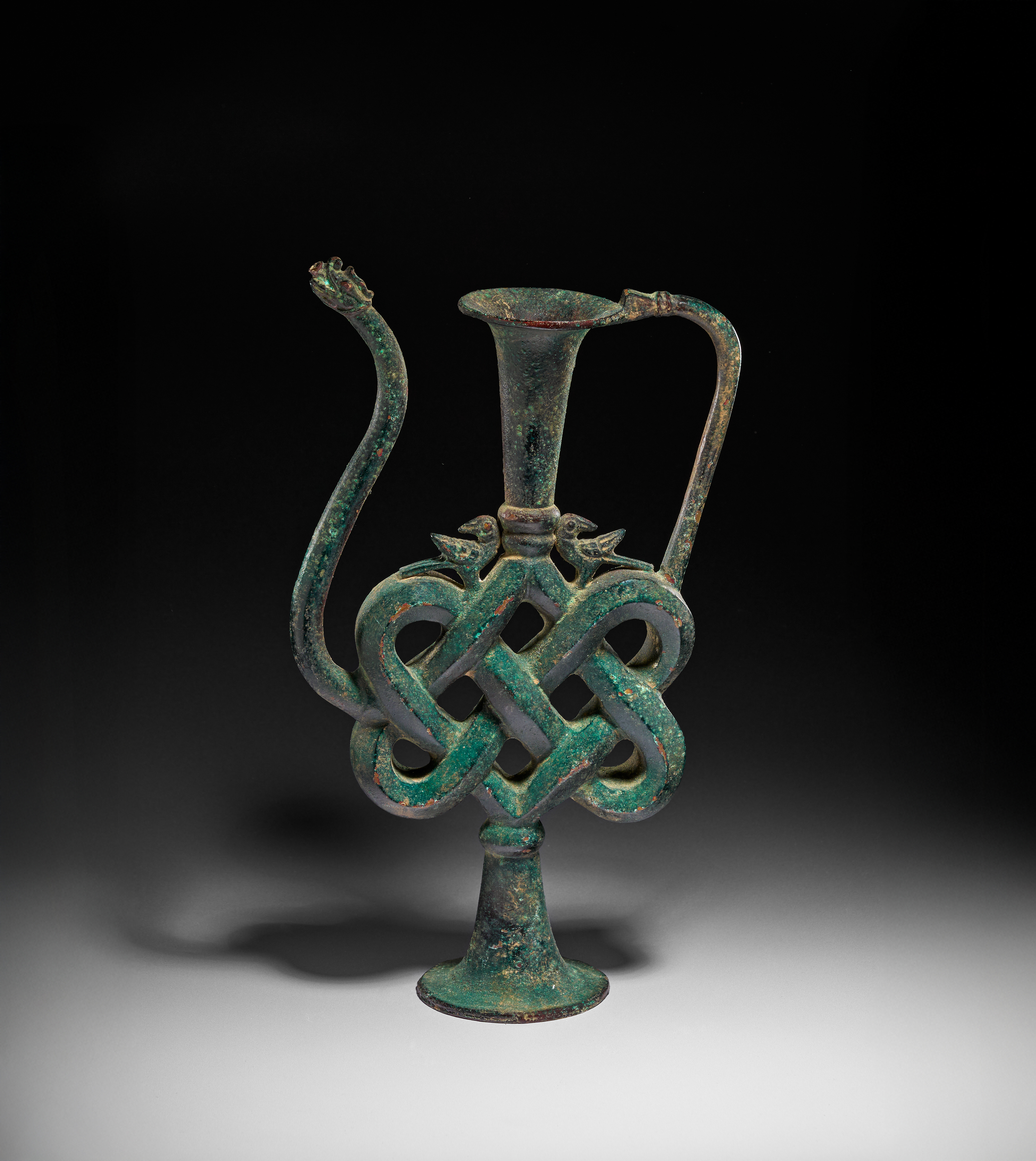 Two elegant, sinuous elements extend from the central body—one forming the curved spout with a stylised creature’s head, the other an arched handle that meets the rim of the neck. At the top of the interlace are a pair of finely modelled birds, perched symmetrically on either side, adding refinement and symbolic charm to the design.