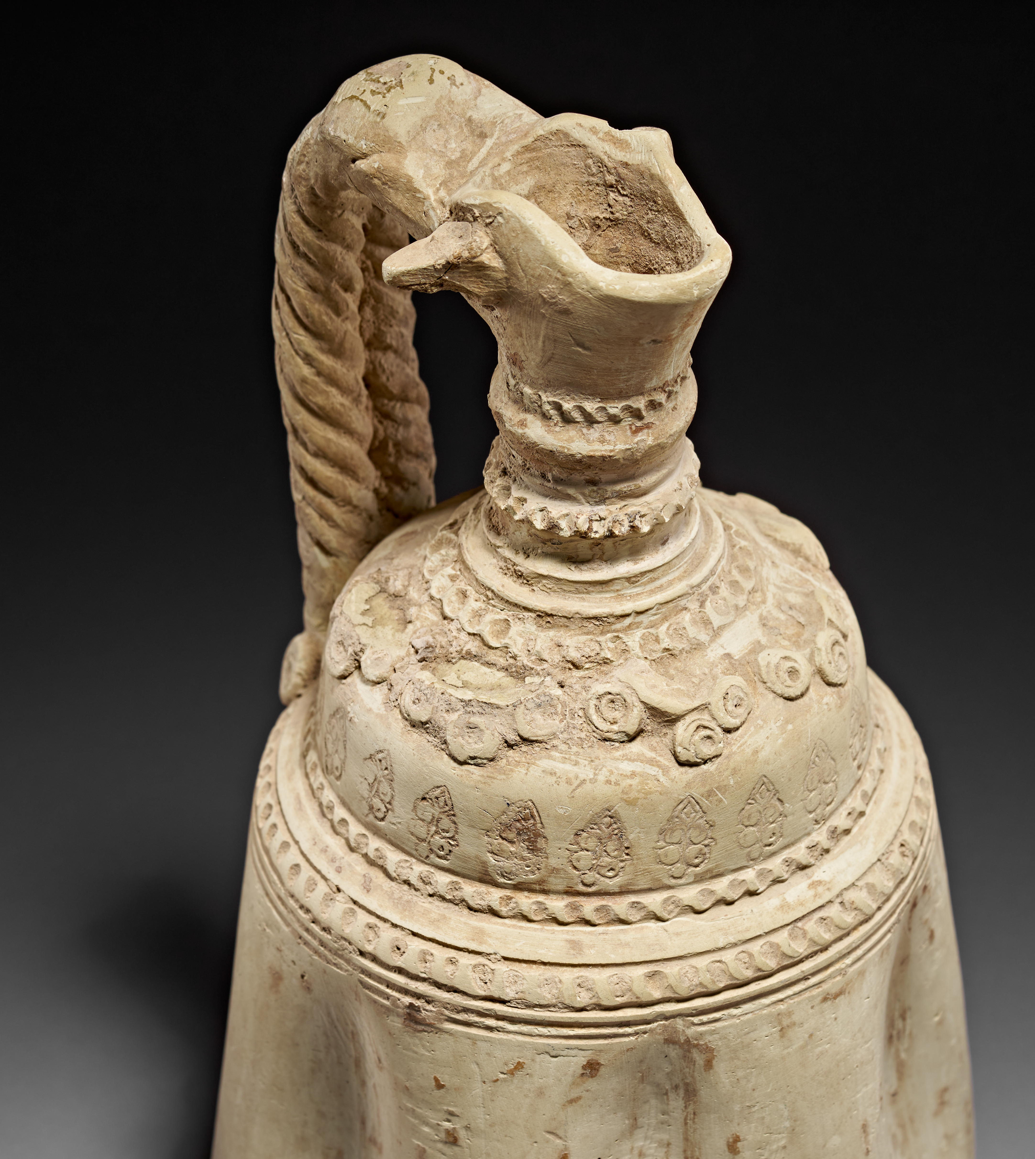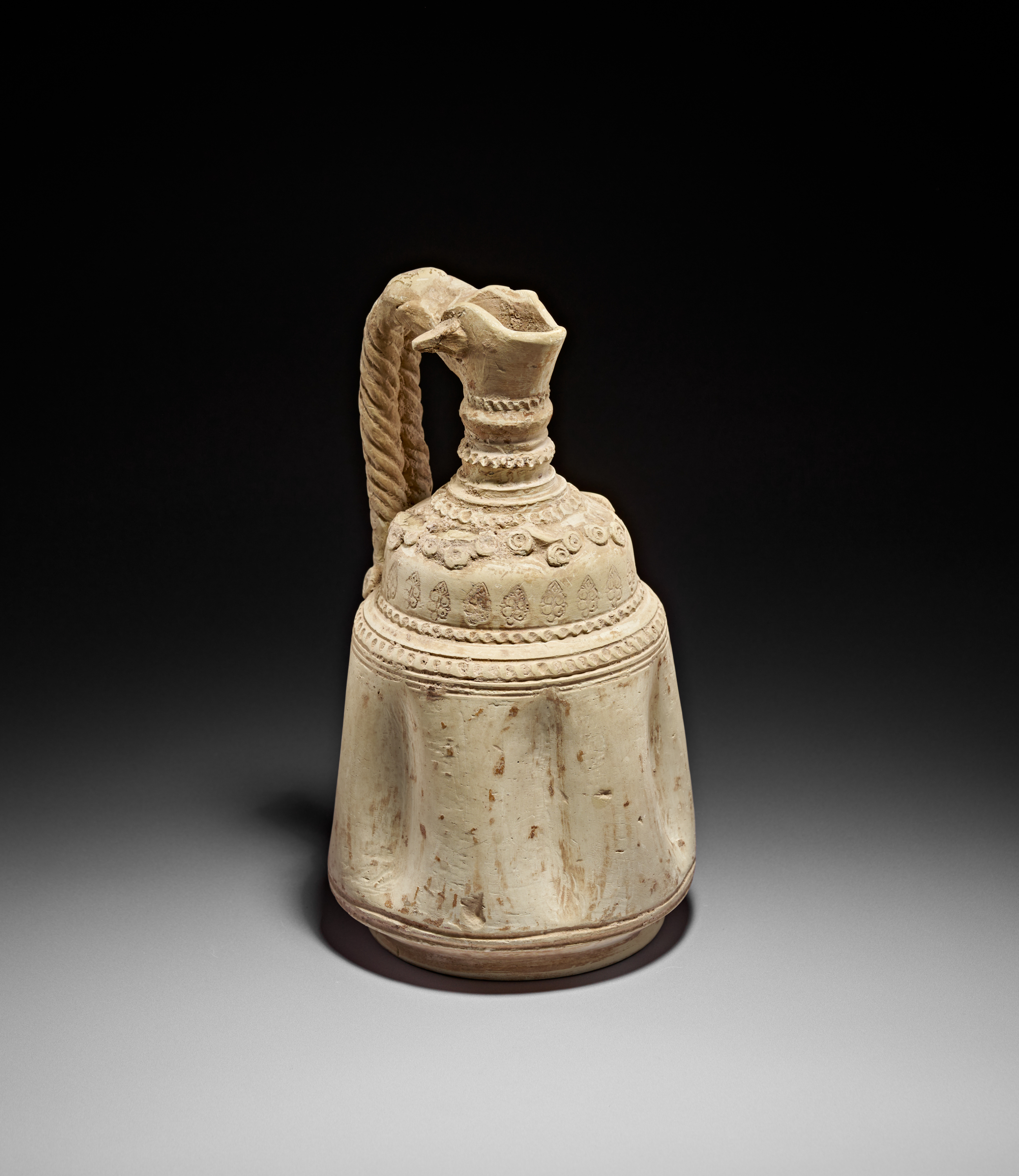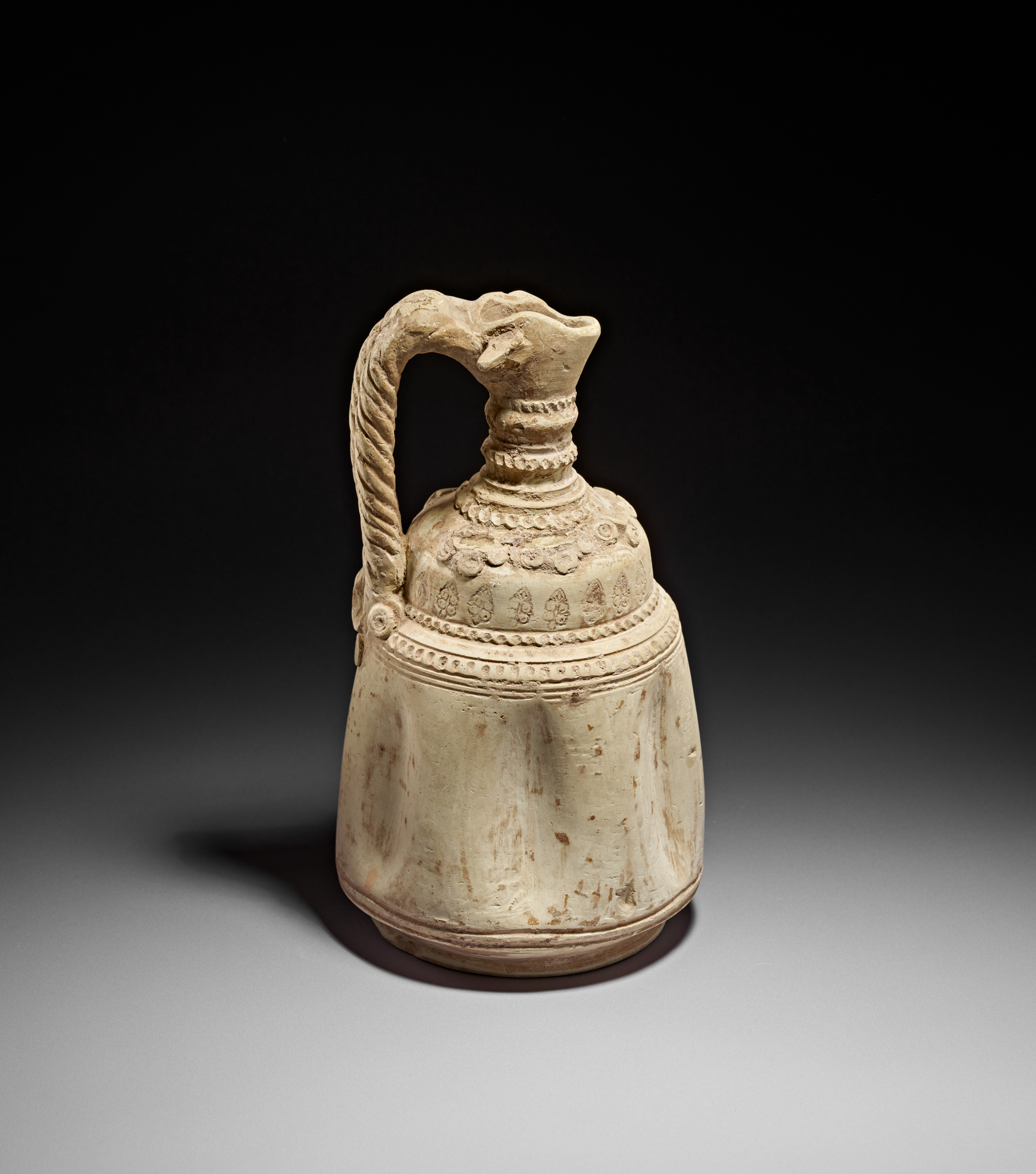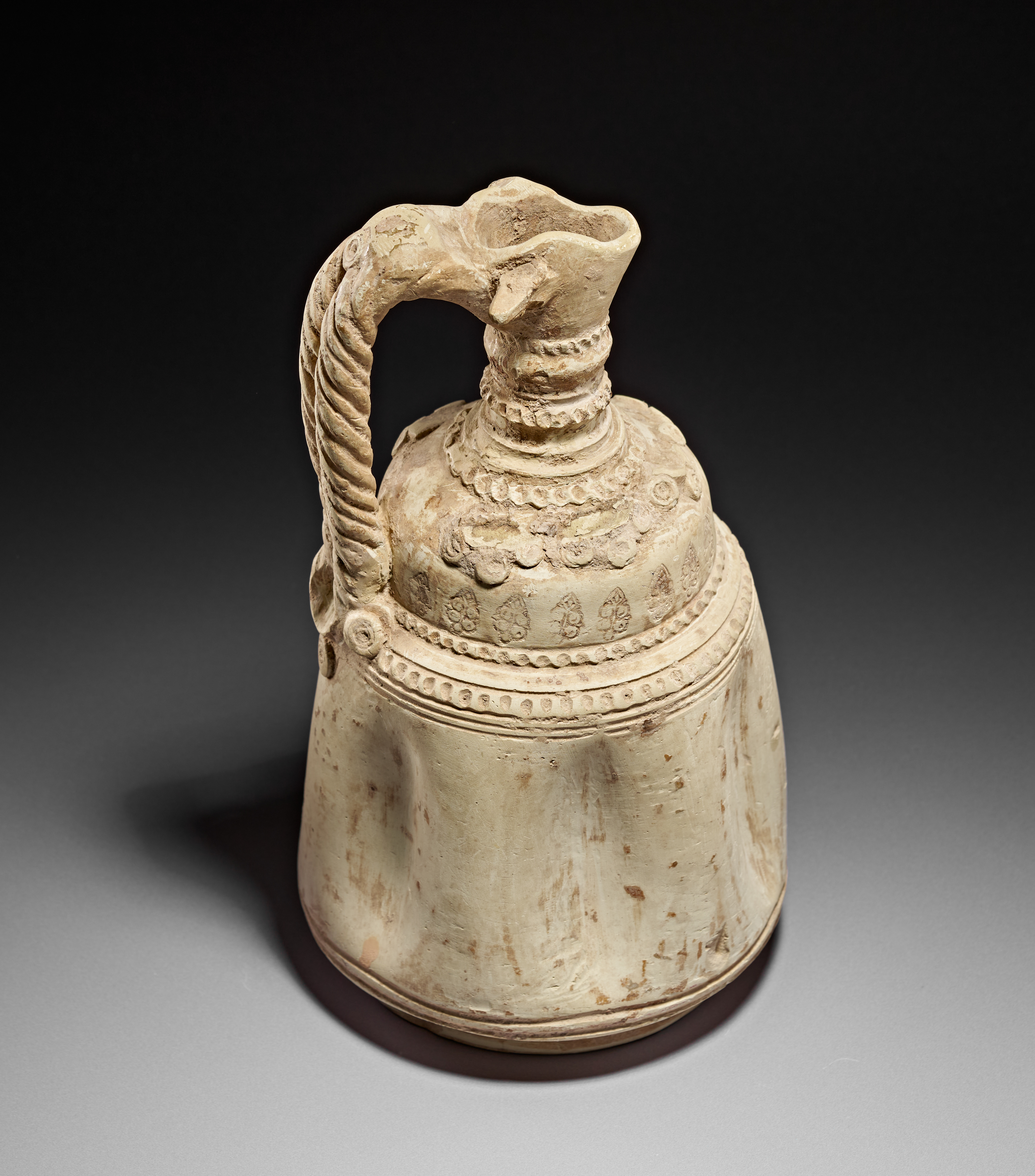 A particularly striking feature is the twisted rope-form handle, which attaches neatly at the shoulder and adds sculptural presence to the piece. Further moulded embellishments—such as scrolling floral elements and beaded borders—emphasize the refined aesthetic typical of Abbasid luxury ceramics.