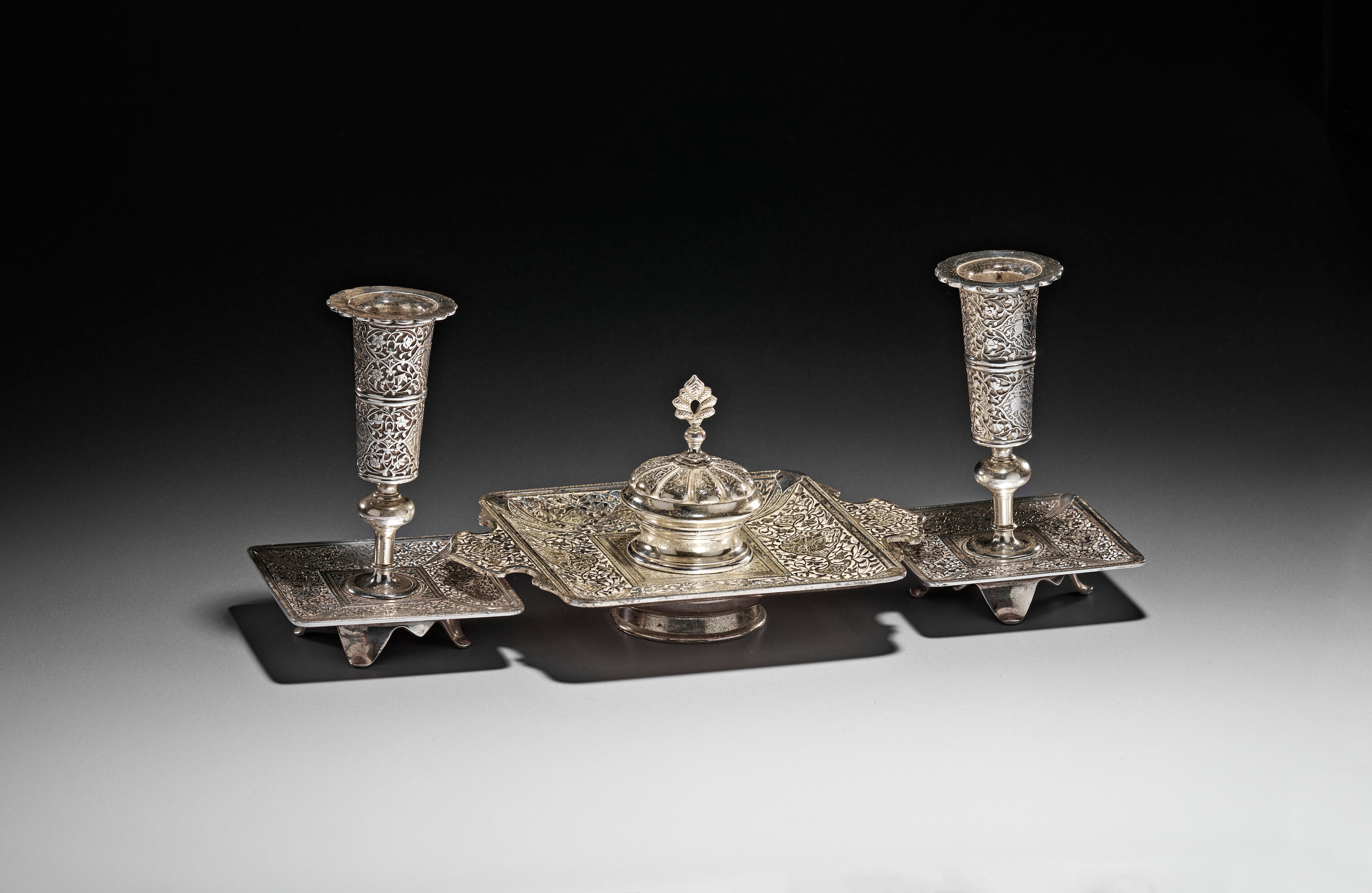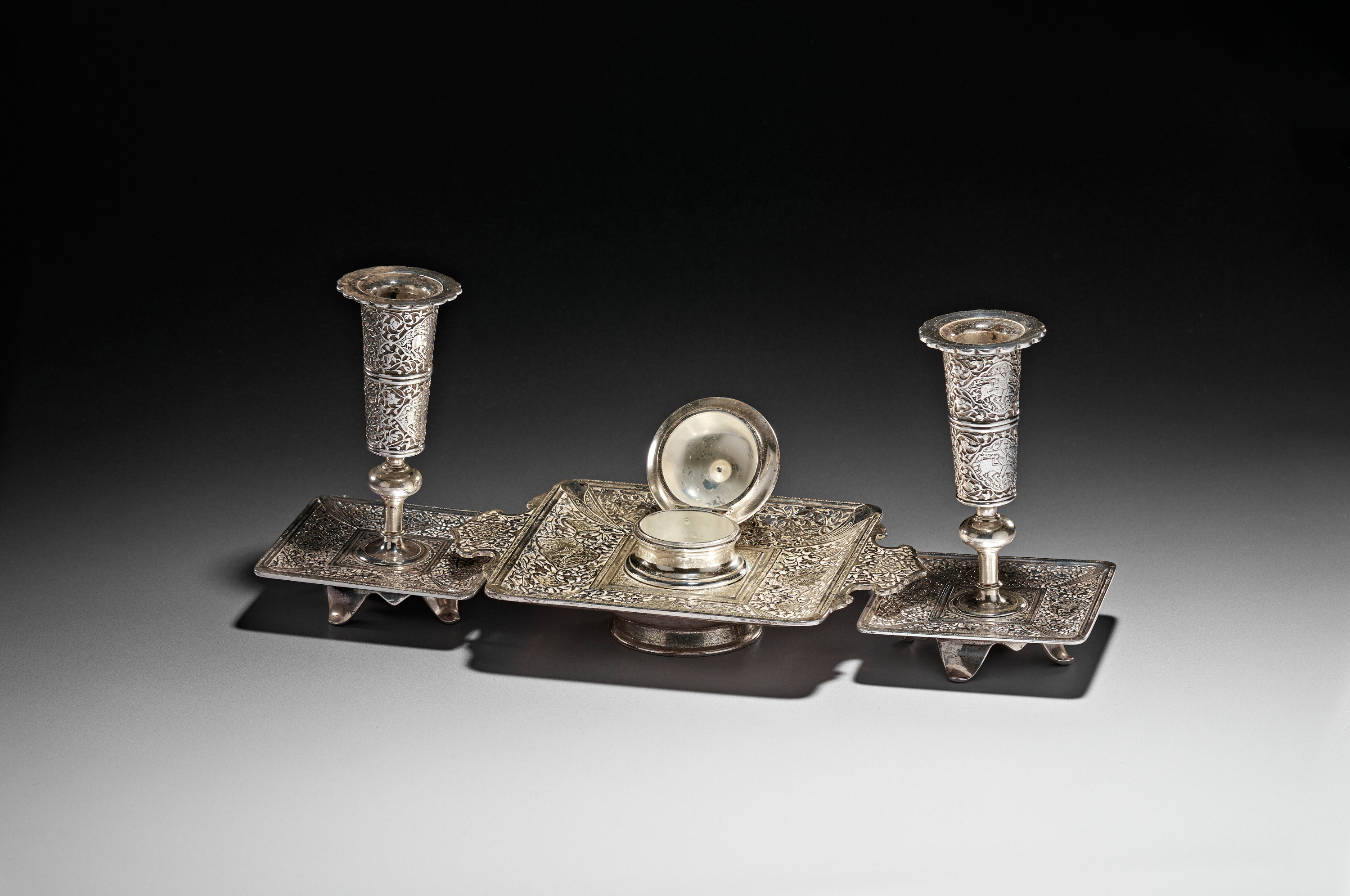 A FRENCH WHITE METAL DESK SET MADE FOR THE ISLAMIC MARKET, 19TH CENTURY