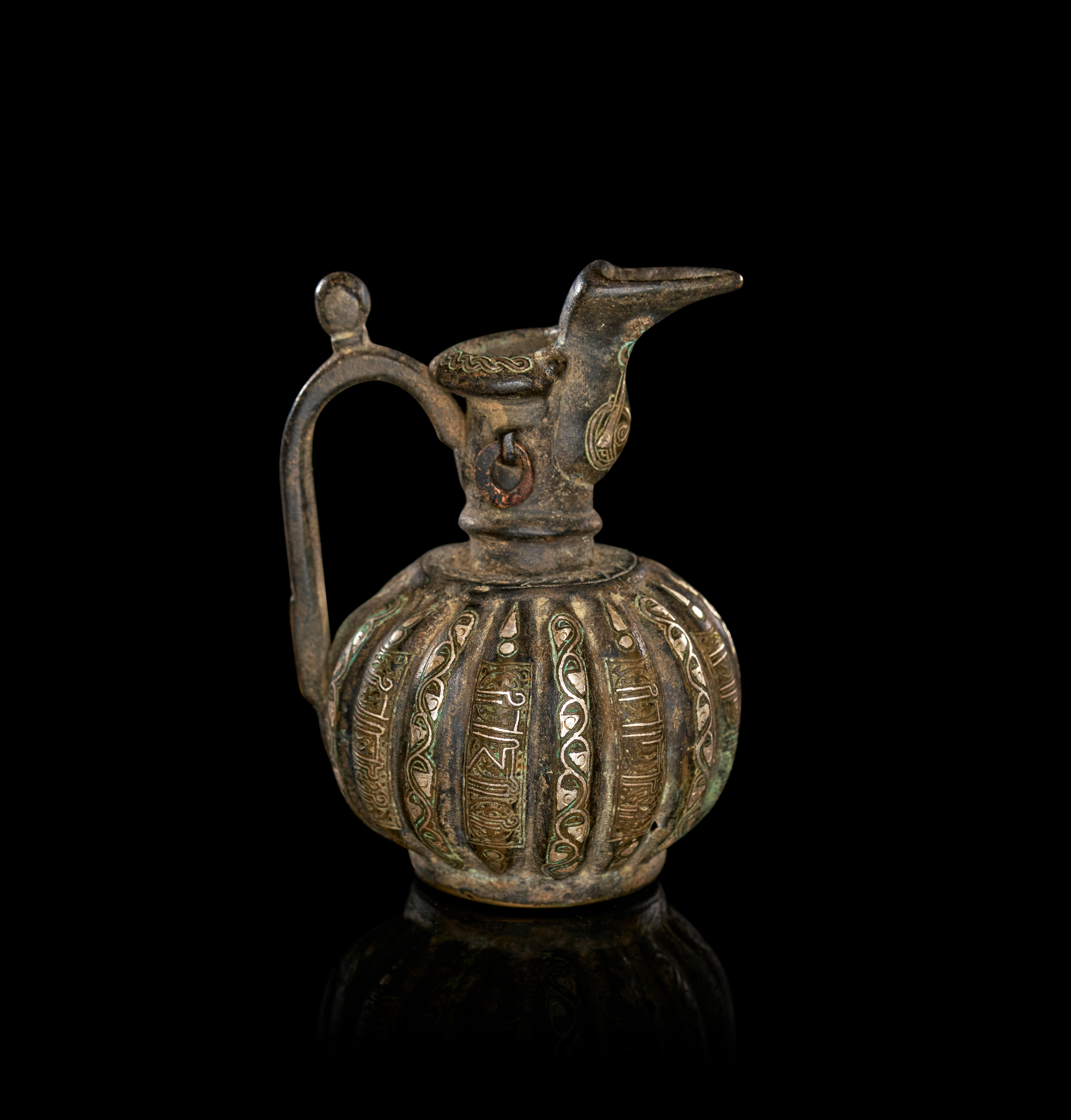 This exquisite miniature bronze ewer from Khurasan is finely cast and richly inlaid with silver, showcasing the exceptional metalworking skills of the Seljuk period. The rounded, ribbed body is decorated with alternating vertical bands of refined geometric and pseudo-inscription motifs, each carefully delineated with silver inlay that remains attractively preserved. The elegant spout, gently flaring mouth, and upright handle create a harmonious silhouette, while additional silver-inlaid medallions accent the neck and spout area, adding visual sophistication. The surface bears a deep, naturally patinated finish with traces of verdigris, enhancing its historic character. Miniature vessels of this type were prized luxury objects, often used for perfumes or ritual purposes, and this example is notable for both its intricate workmanship and excellent state of preservation. A fine and collectible piece of medieval Islamic metalwork.