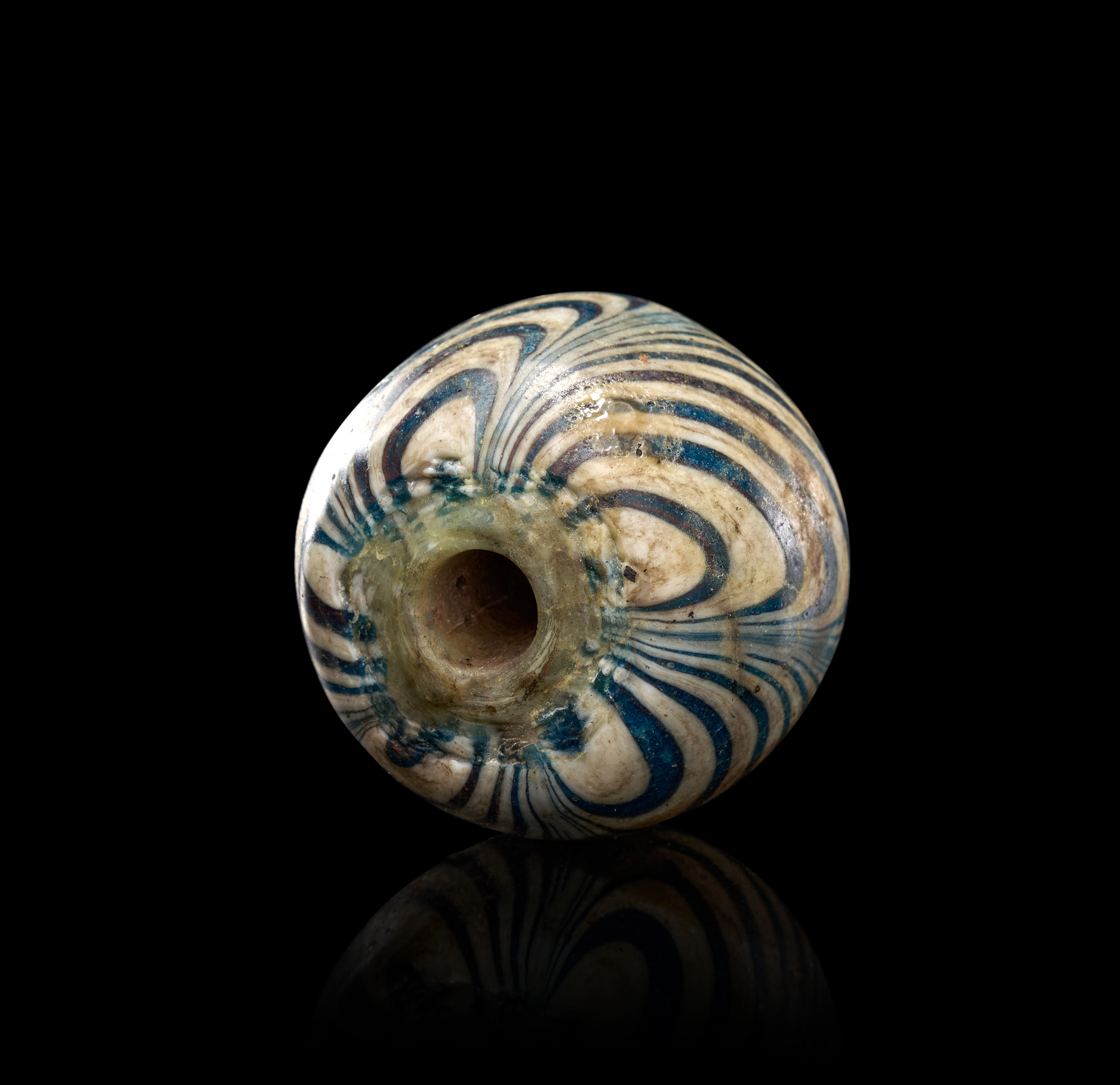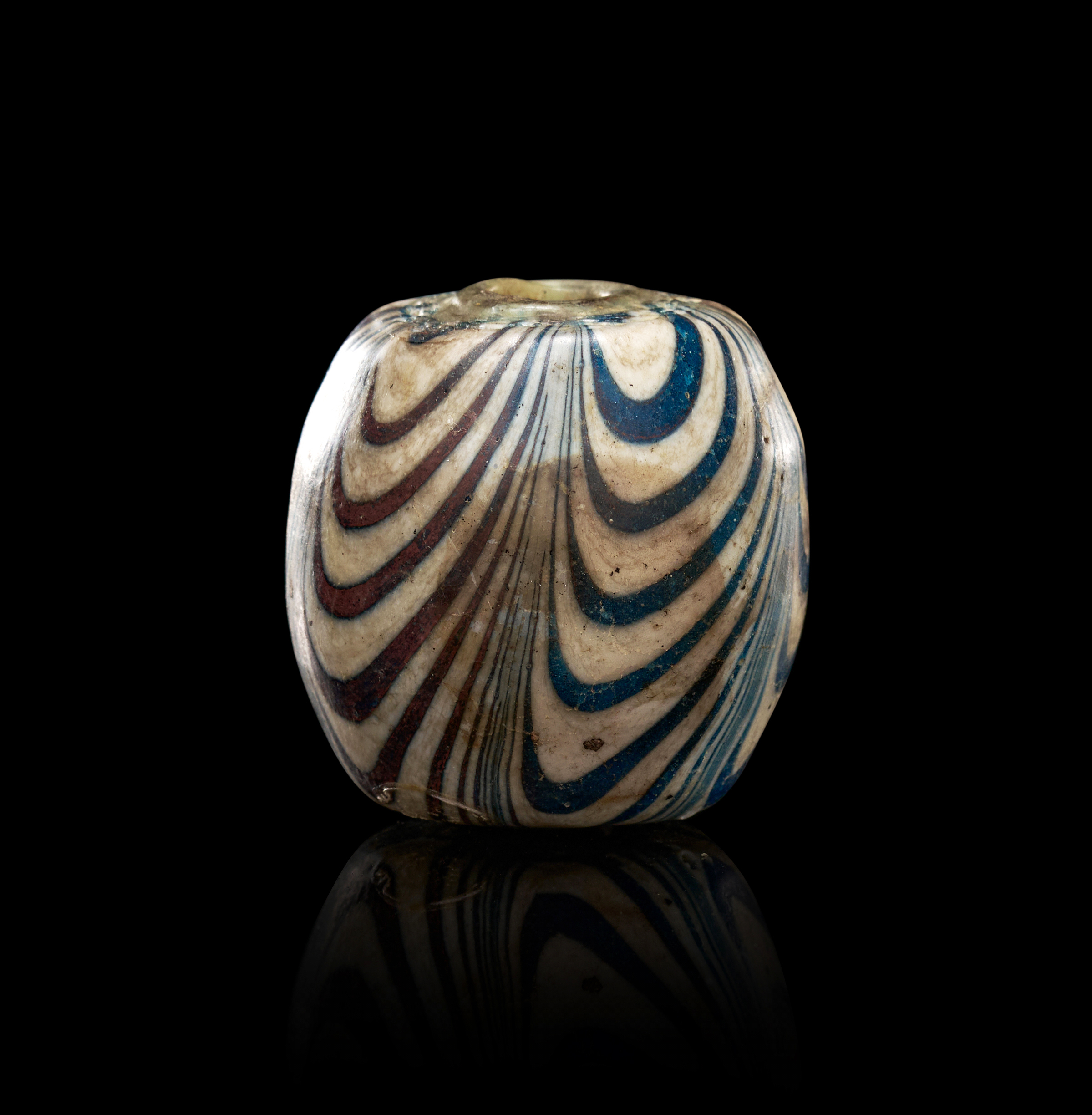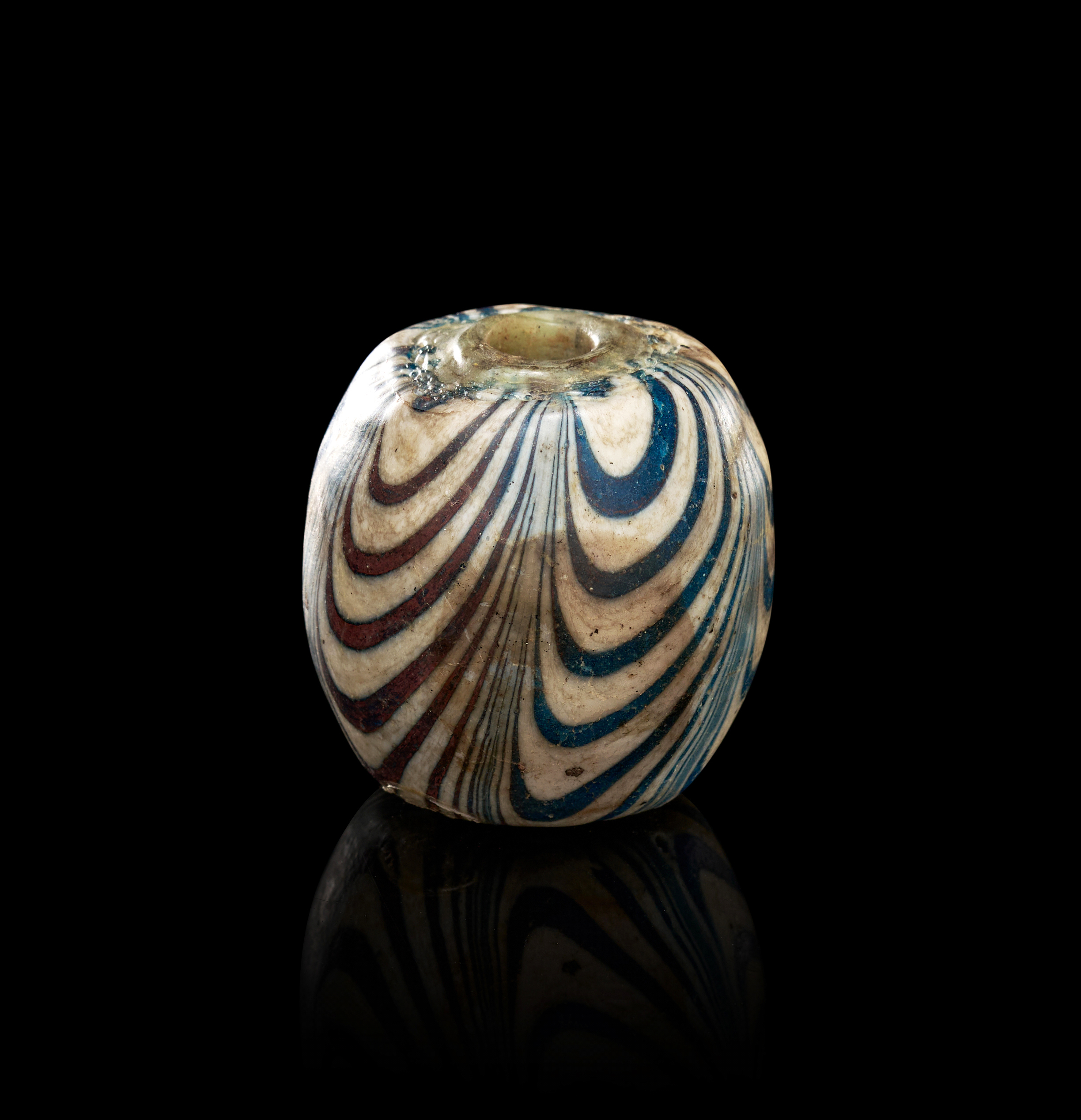 This impressive early glass bead from Java is crafted using the marvering technique, producing striking swirling patterns in deep cobalt blue, warm brown, and ivory-toned glass. The bead’s substantial ovoid form is decorated with meticulously applied trails that have been fused and smoothed into the surface, creating a dynamic, flowing design characteristic of Southeast Asian glass production during this period. The central perforation is wide and well-defined, showing wear consistent with ancient use. Areas of iridescence and mineral accretion add to its archaeological charm. Large beads of this type were valued both as adornments and as prestige trade items across the Indonesian archipelago. This example stands out for its bold coloration, excellent preservation, and impressive visual presence.